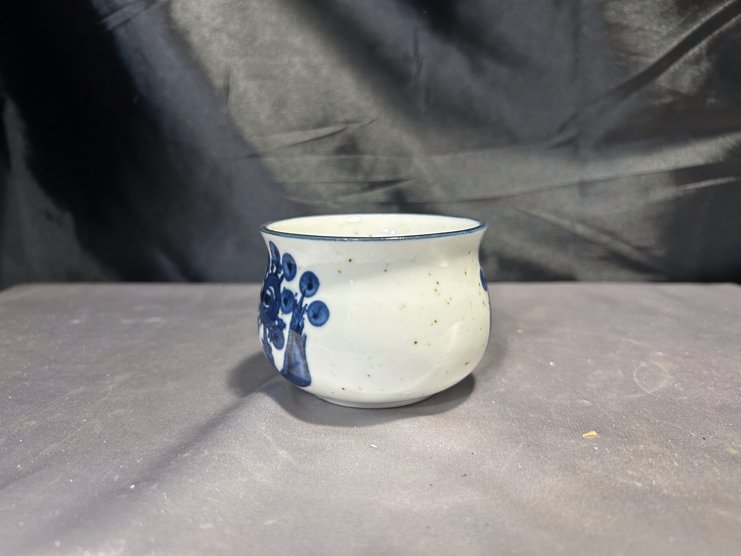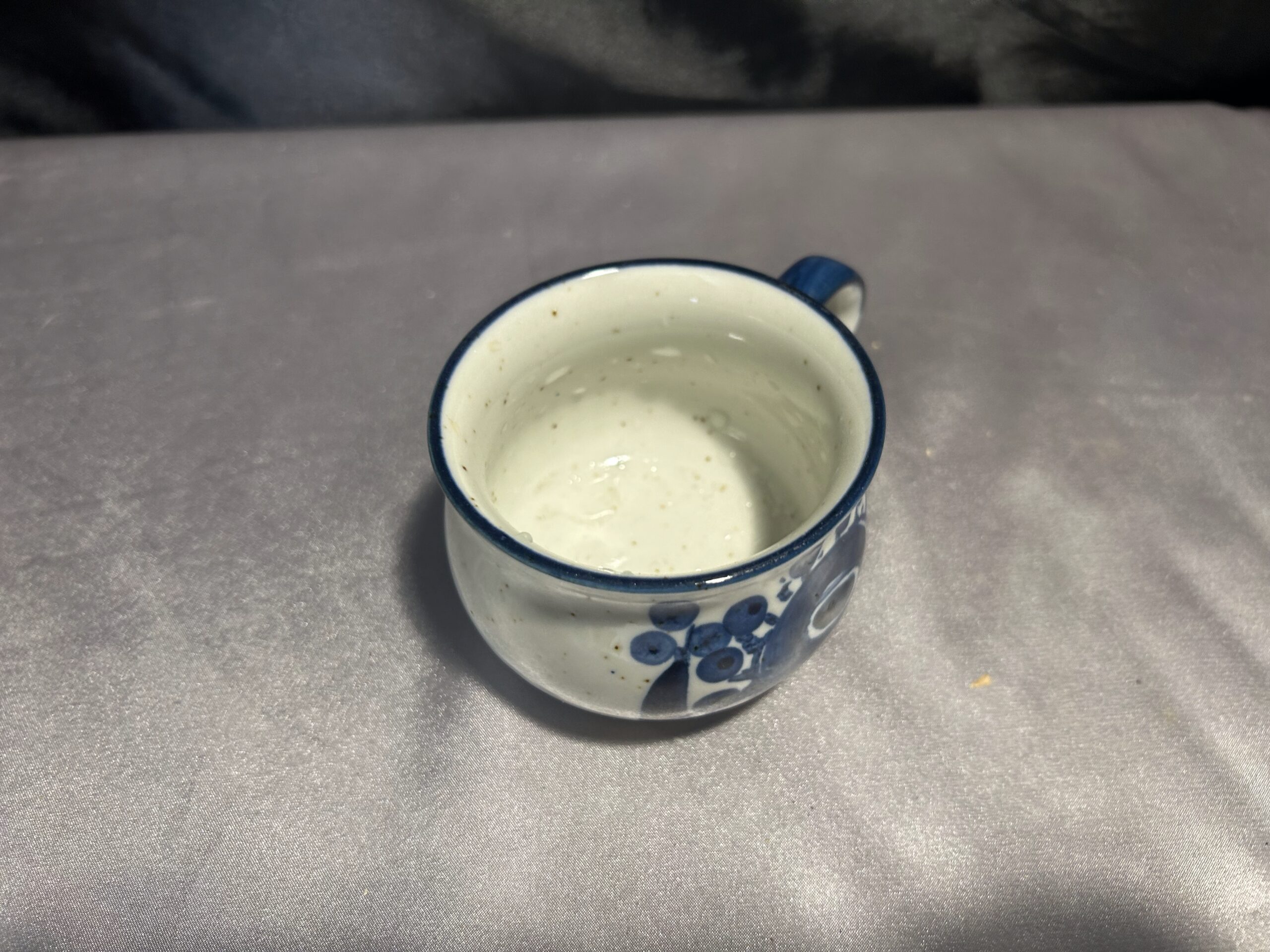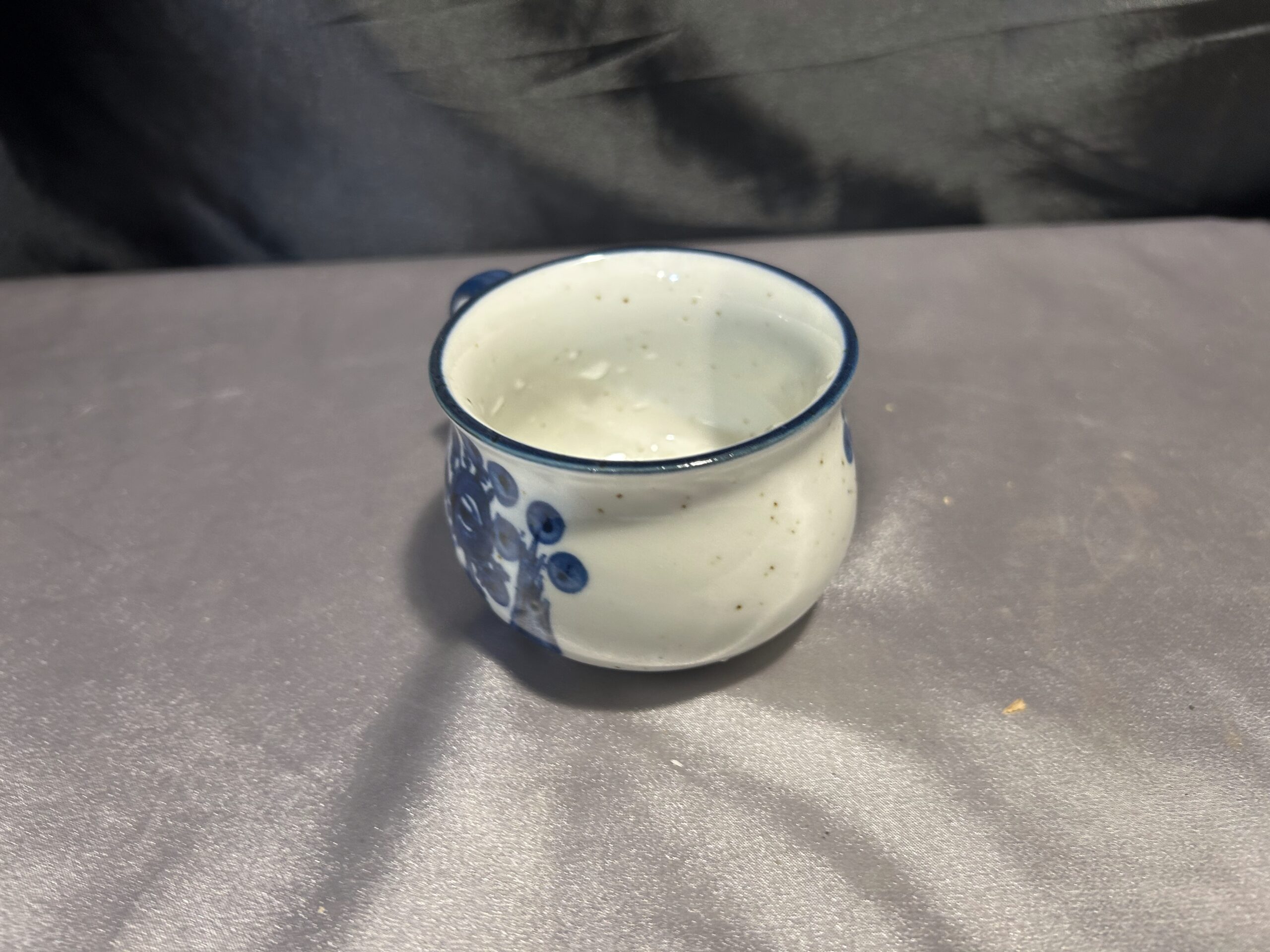 Uroczy ceramiczny kubek w niebiesko-białej kolorystyce, zdobiony subtelnymi wzorami. Idealny do porannej kawy, herbaty lub jako stylowy element dekoracyjny w kuchni. Kompaktowa pojemność 150 ml czyni go świetnym wyborem na każdą okazję.