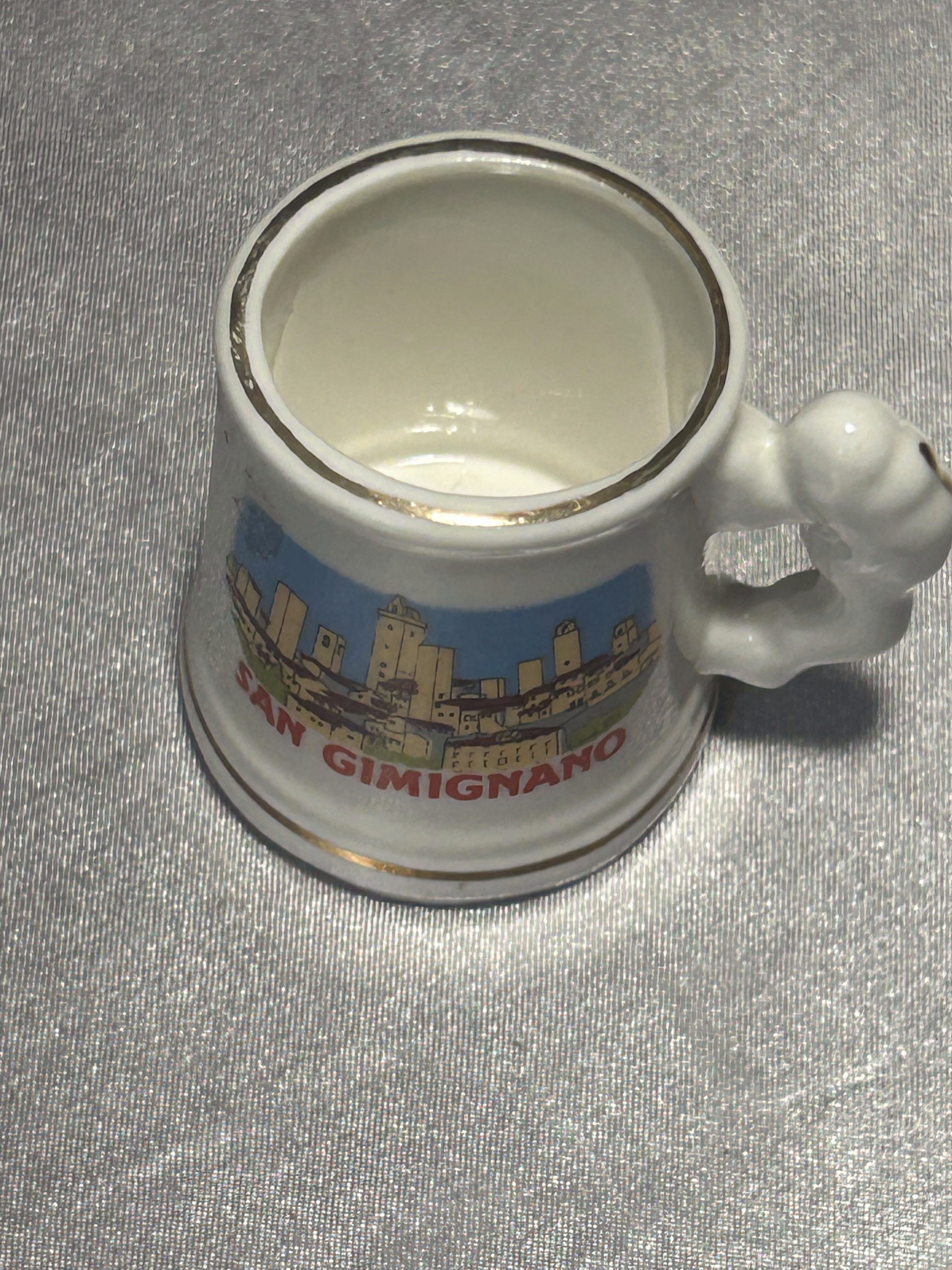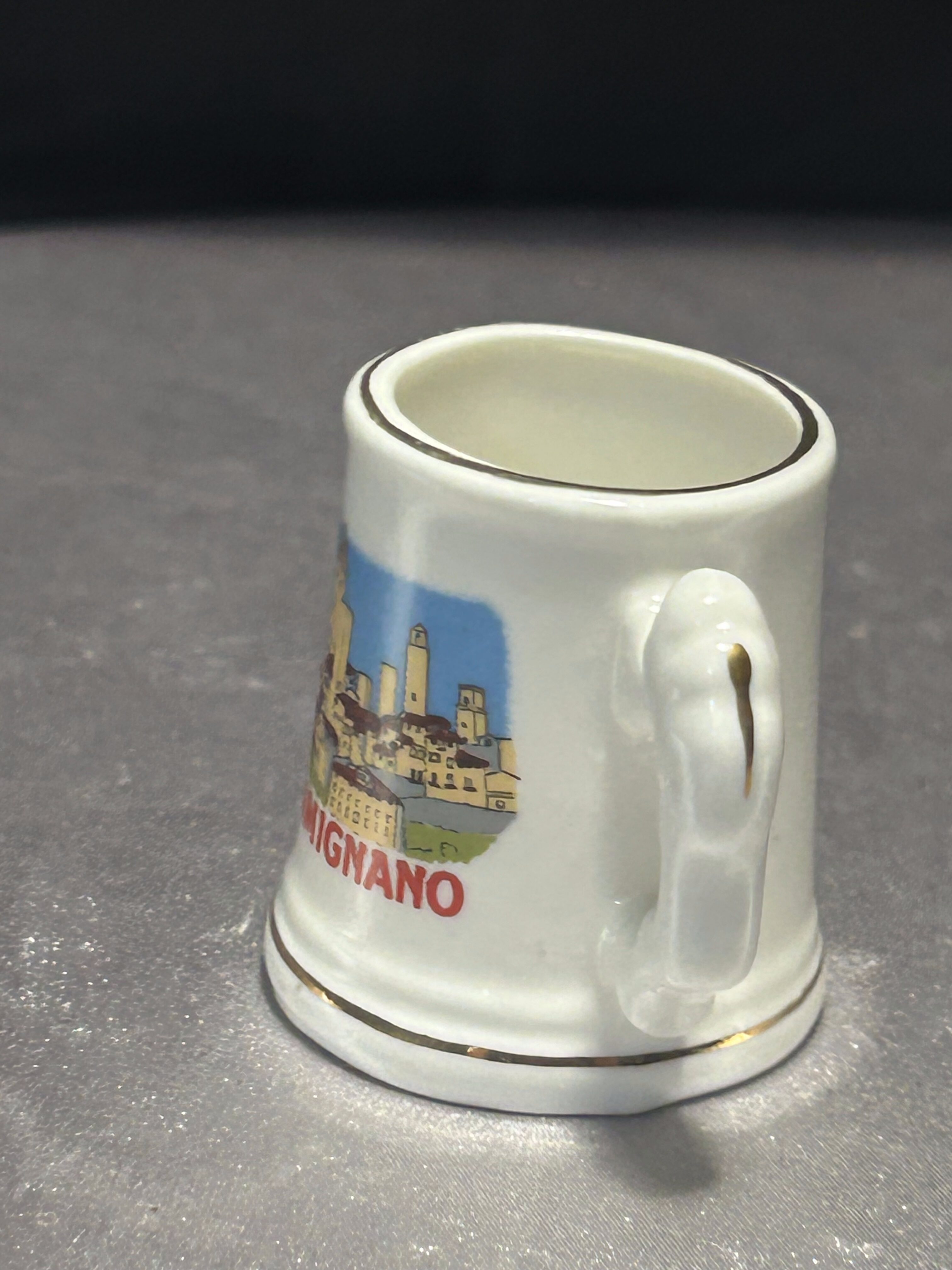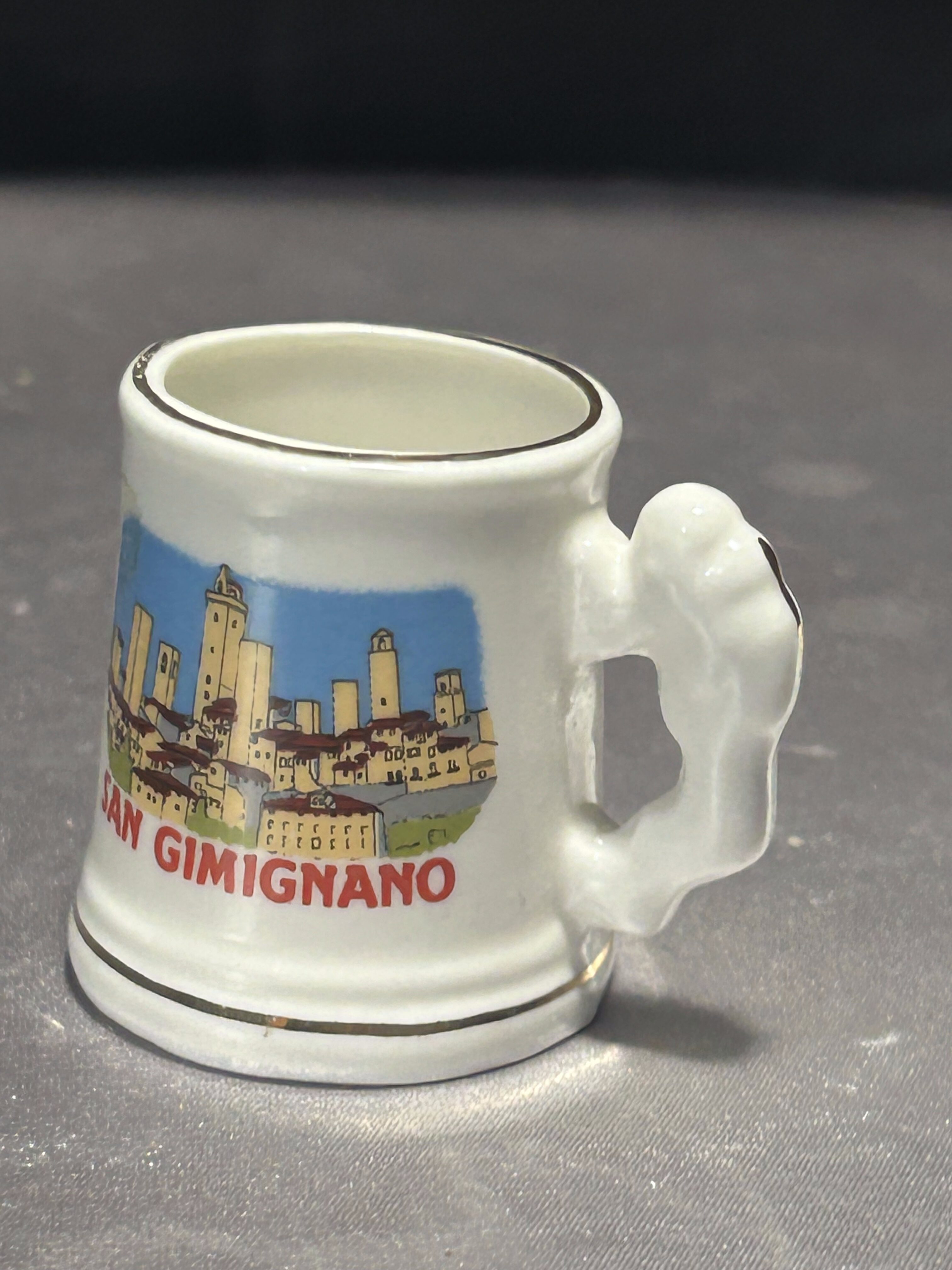 Niewielki, dekoracyjny kufelek ceramiczny z kolorową ilustracją przedstawiającą panoramę San Gimignano – malowniczego toskańskiego miasteczka znanego z charakterystycznych średniowiecznych wież. Na froncie widnieje wyraźny napis „SAN GIMIGNANO”. Uchwyt w niestandardowym, ozdobnym kształcie dodaje przedmiotowi wyjątkowego uroku. Idealny jako pamiątka, element kolekcji lub dekoracyjny dodatek do wnętrza.