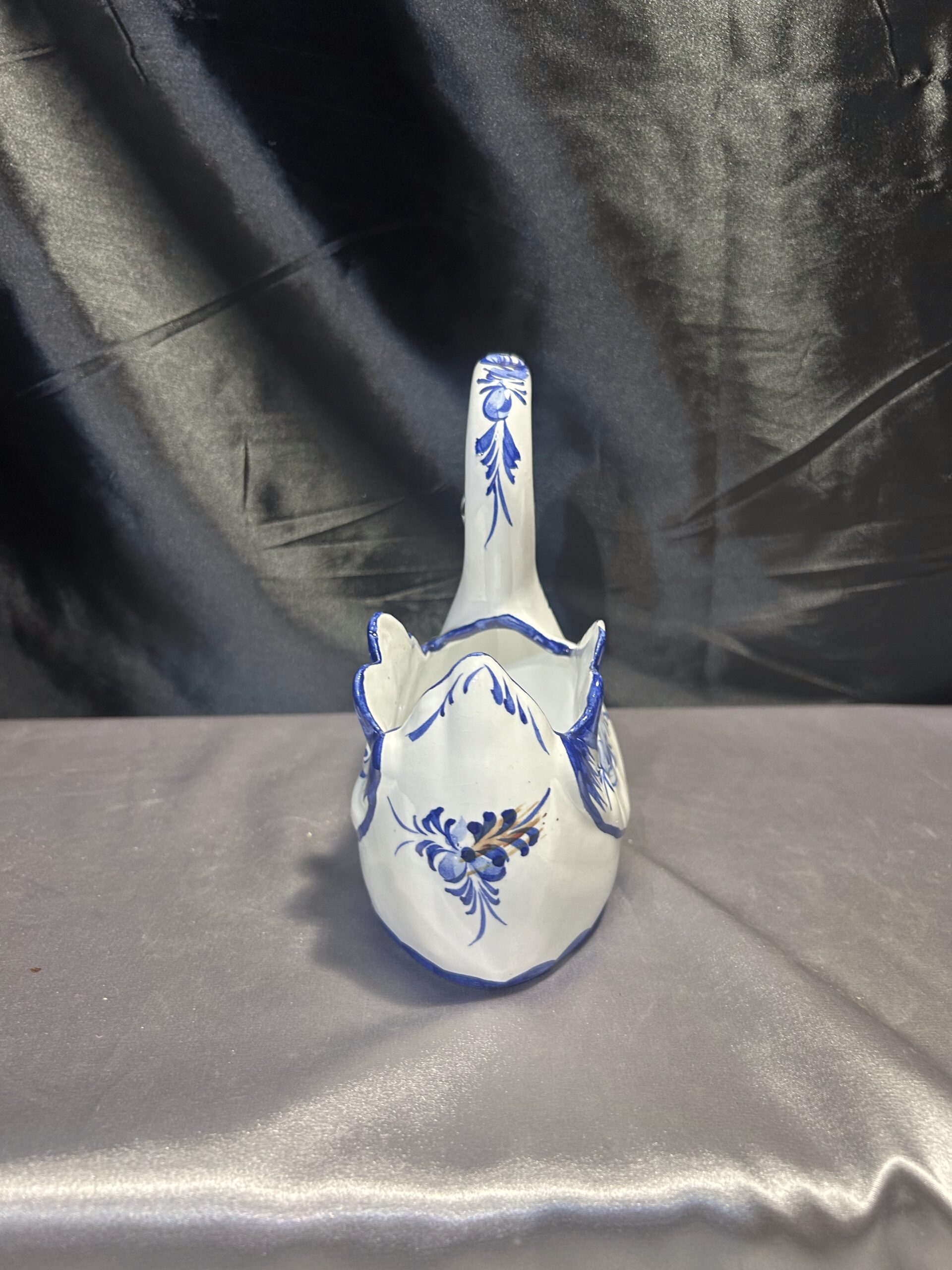 Wyjątkowy biało-niebieski łabędź ceramiczny, ręcznie malowany na niebiesko, stanowiący elegancką i funkcjonalną ozdobę. Doskonale nadaje się jako misa, kwietnik lub patera. Figurka jest sygnowana R.C. & CAL JUNCAL-POSTO DE Hand Paintso, Made in Portugal, co podkreśla jej unikatowy charakter i wysoką jakość wykonania. Ze względu na uszczerbek, widoczny na zdjęciach, produkt oferowany jest w cenie promocyjnej.