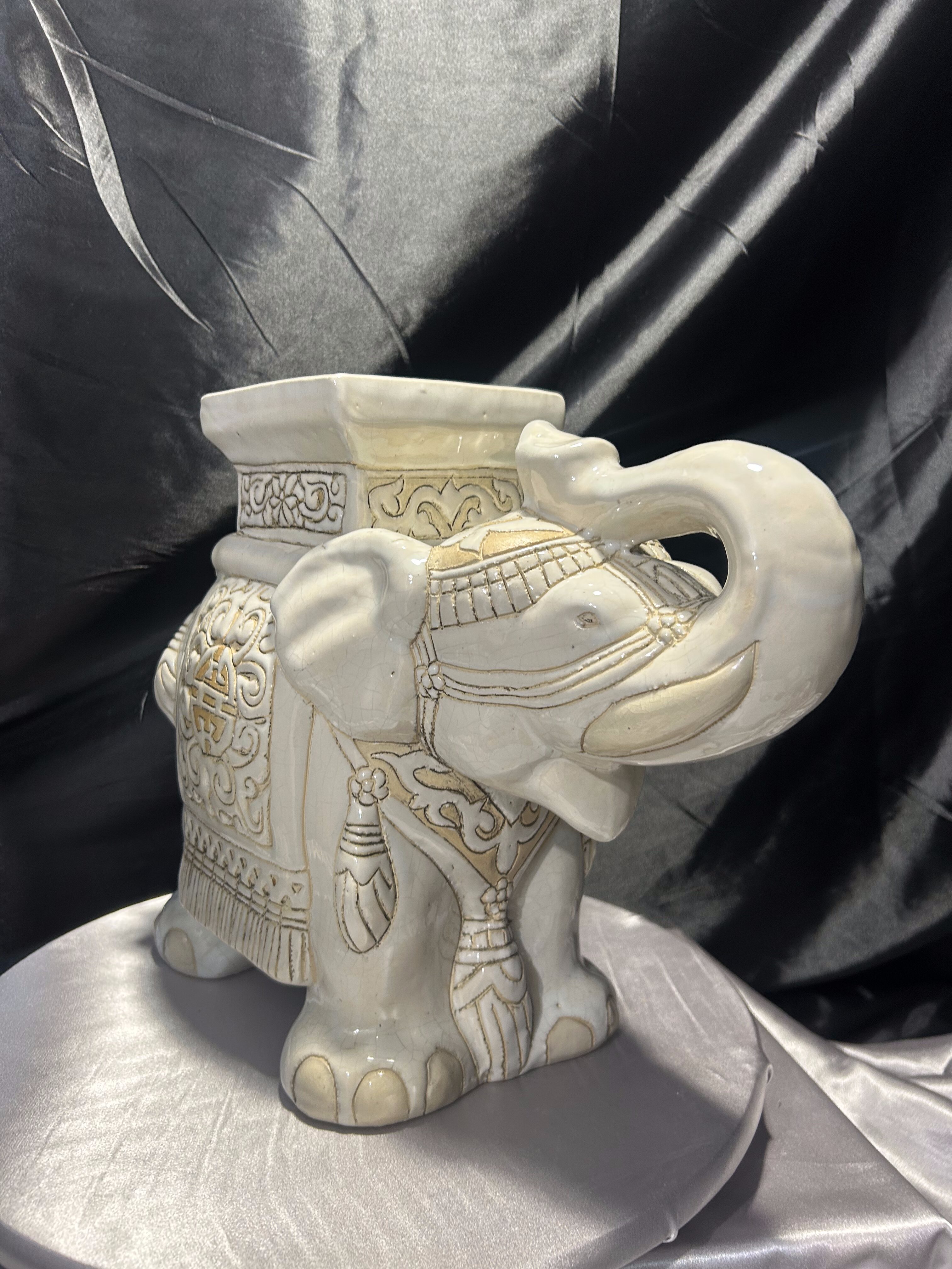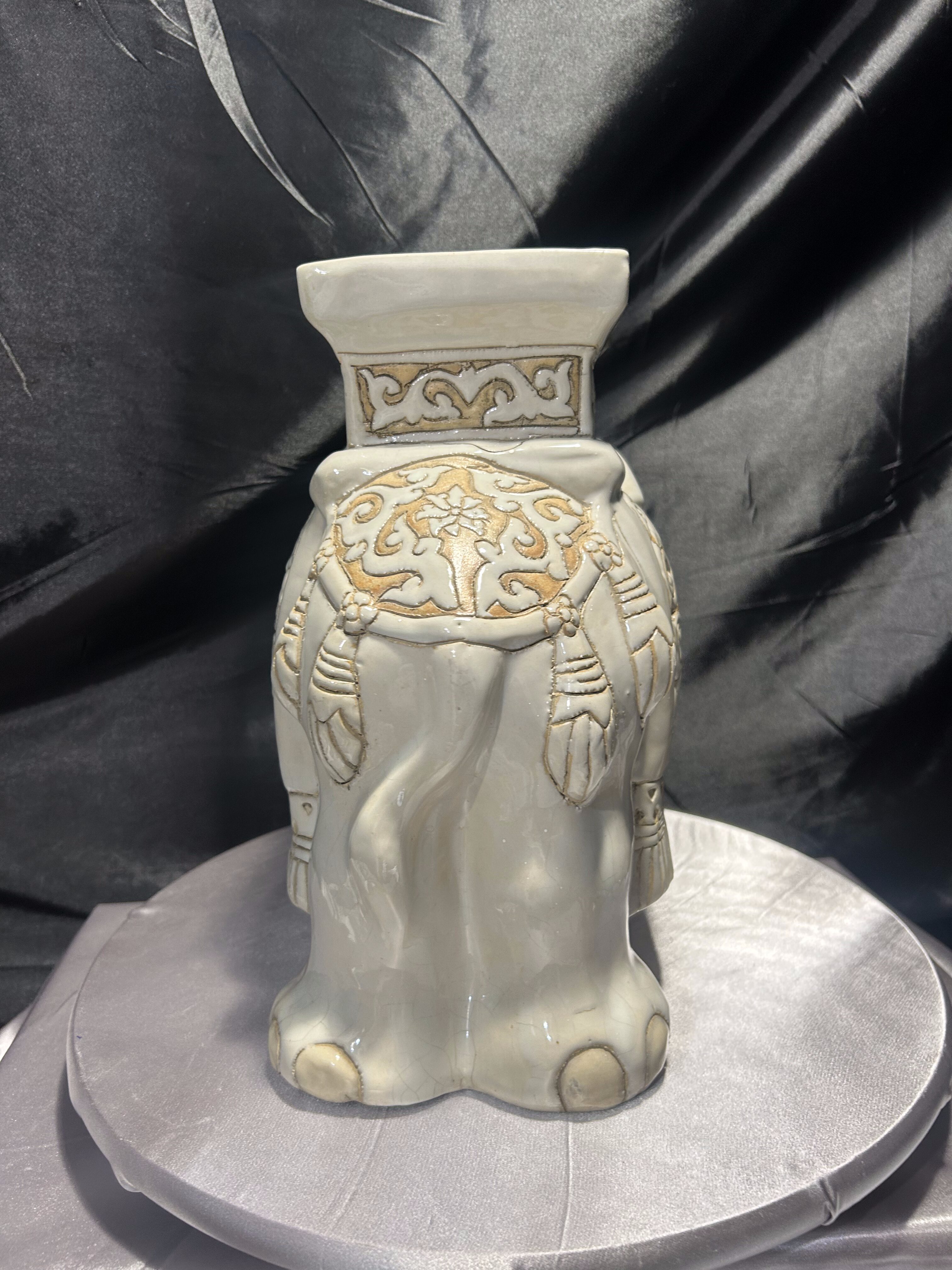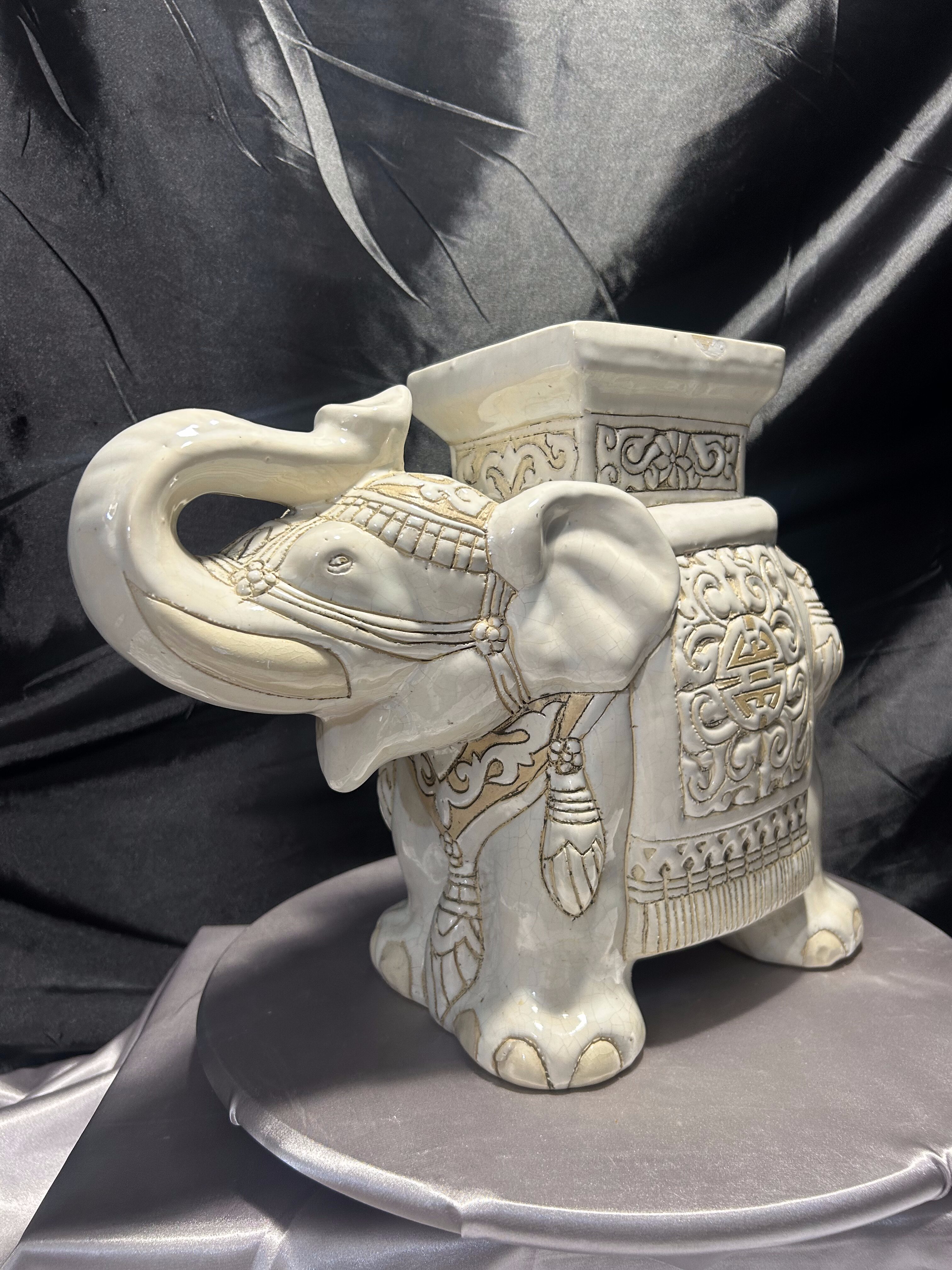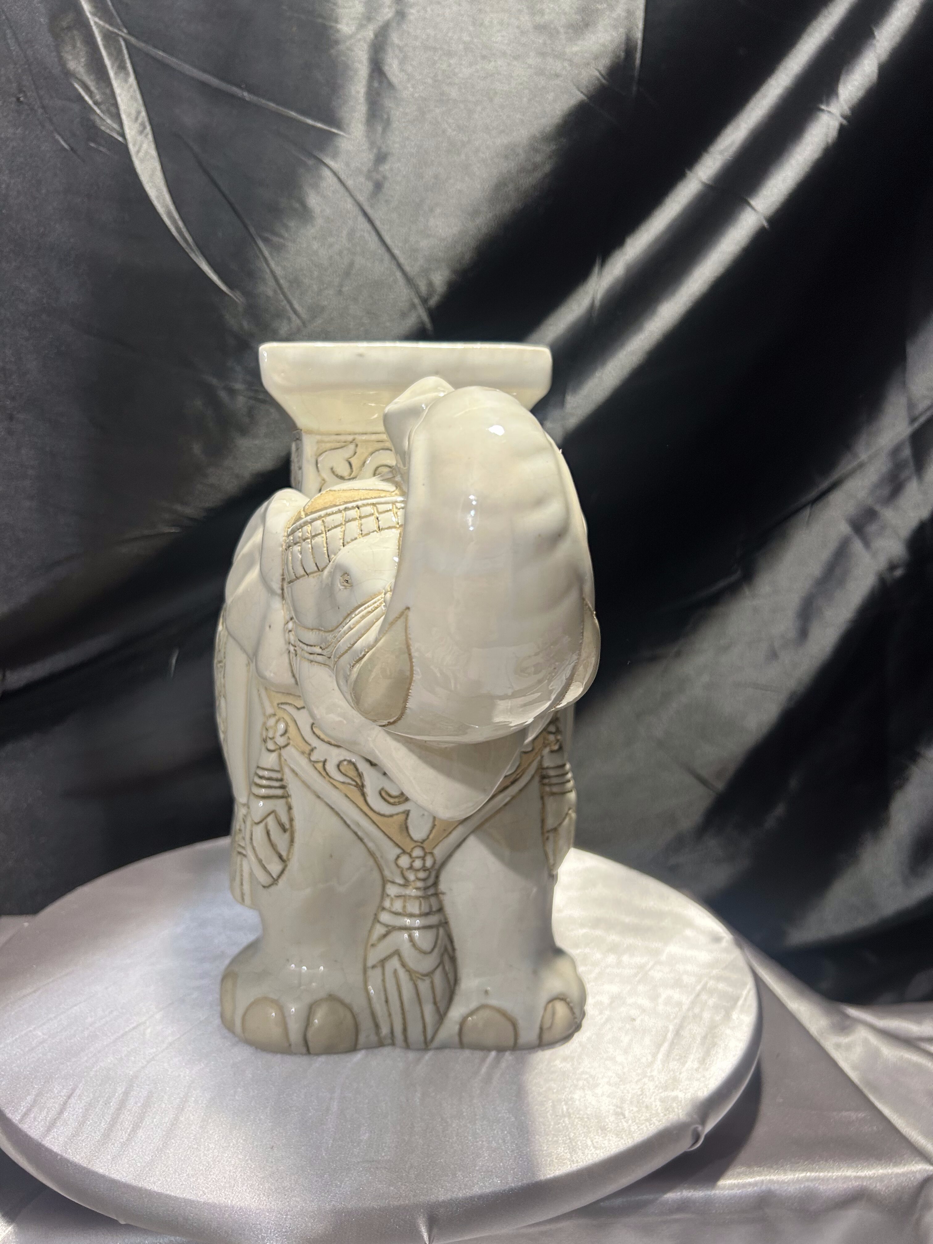 Imponująca figurka przedstawiająca indyjskiego słonia z trąbą uniesioną ku górze – symbolem pomyślności, ochrony i dobrobytu. Wykonana z ceramiki szkliwionej w odcieniu złamanej bieli, zdobiona reliefami z orientalnymi motywami i symbolami. Bogactwo detalu, misternie wykonane zdobienia i monumentalna forma sprawiają, że słoń przykuwa uwagę i doskonale odnajduje się w roli dekoracyjnego akcentu w salonie, sypialni lub przestrzeni medytacyjnej. Może pełnić także funkcję niskiego stolika lub podstawy pod roślinę.