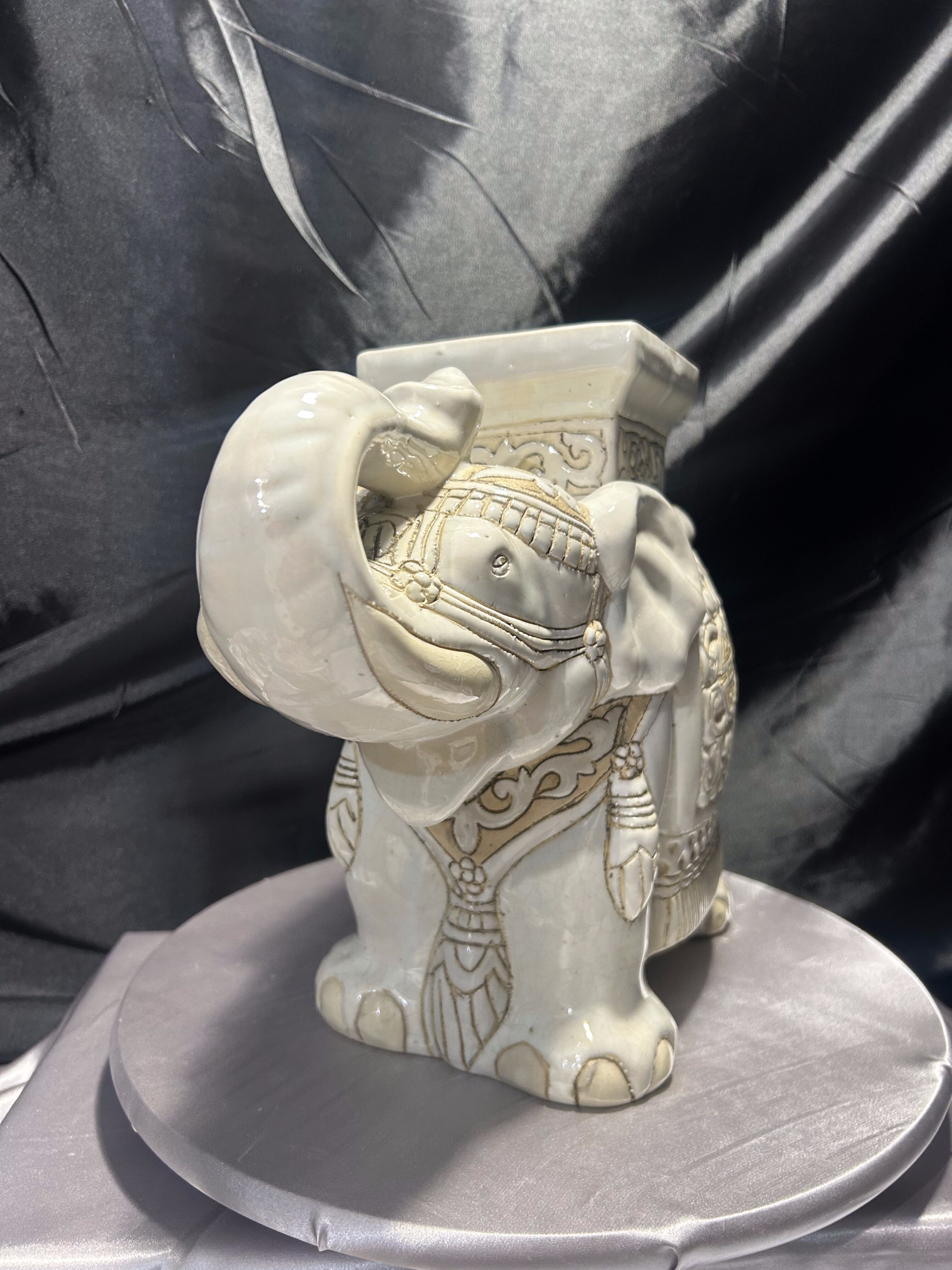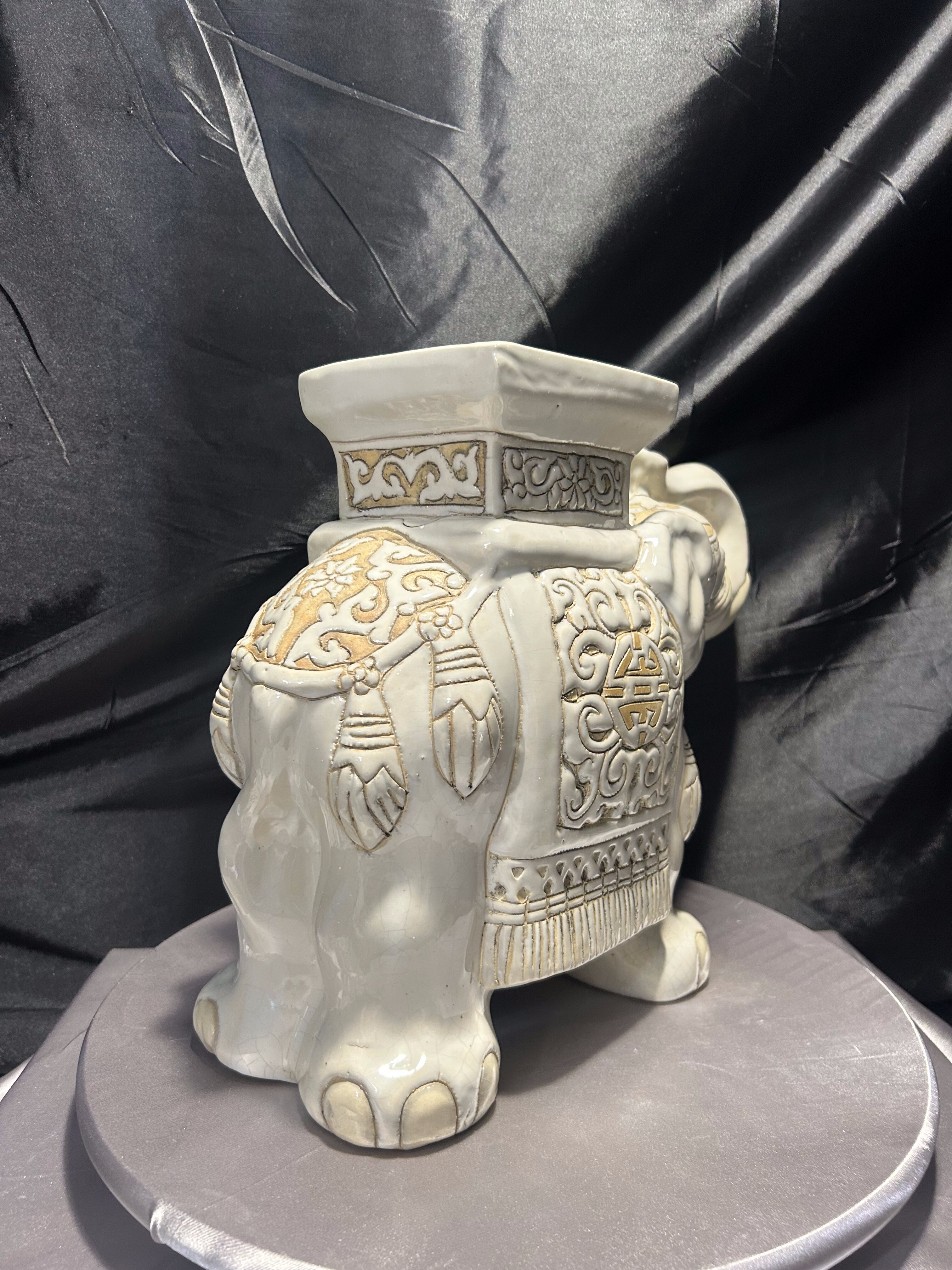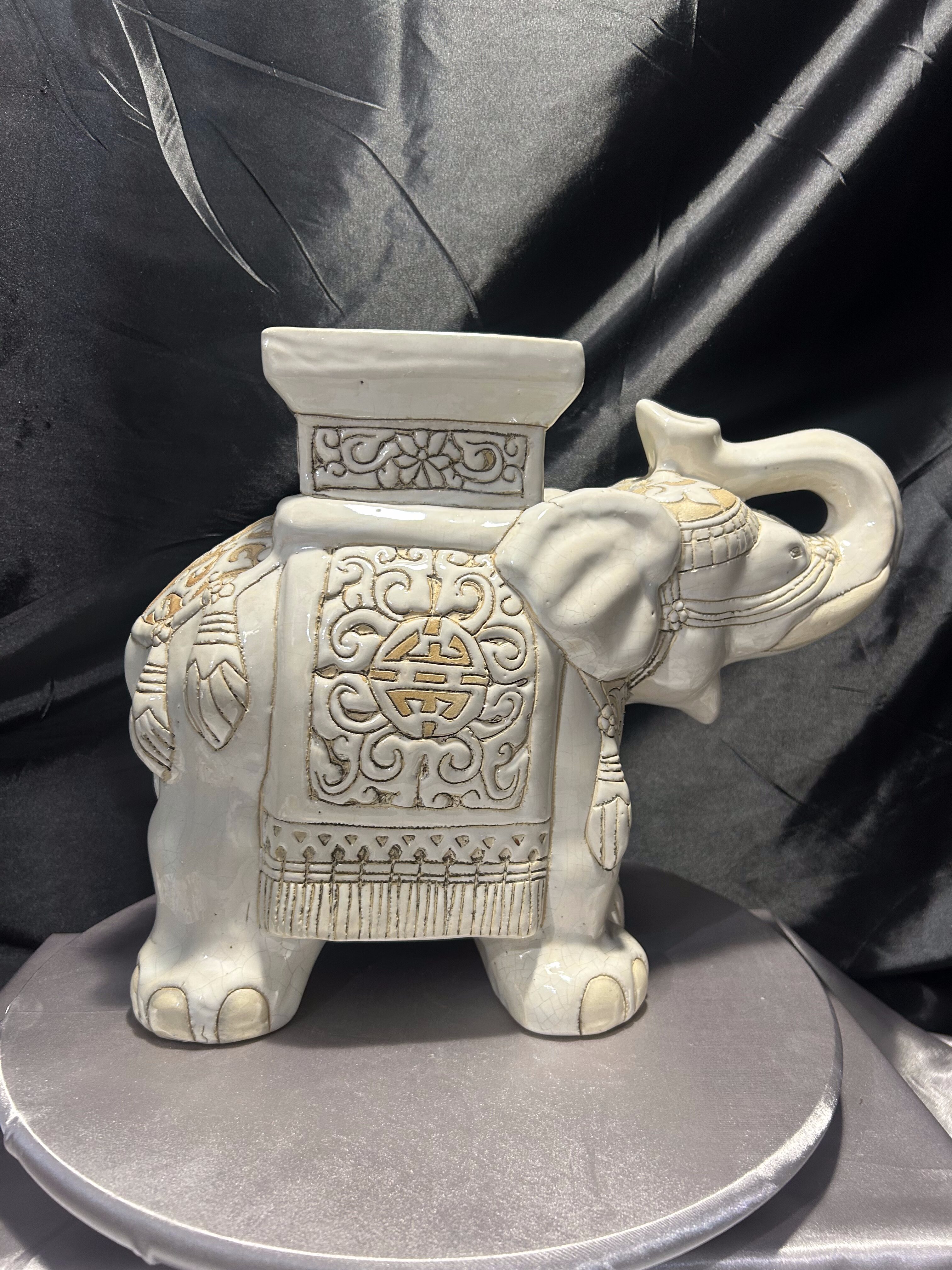 Imponująca figurka przedstawiająca indyjskiego słonia z trąbą uniesioną ku górze – symbolem pomyślności, ochrony i dobrobytu. Wykonana z ceramiki szkliwionej w odcieniu złamanej bieli, zdobiona reliefami z orientalnymi motywami i symbolami. Bogactwo detalu, misternie wykonane zdobienia i monumentalna forma sprawiają, że słoń przykuwa uwagę i doskonale odnajduje się w roli dekoracyjnego akcentu w salonie, sypialni lub przestrzeni medytacyjnej. Może pełnić także funkcję niskiego stolika lub podstawy pod roślinę.