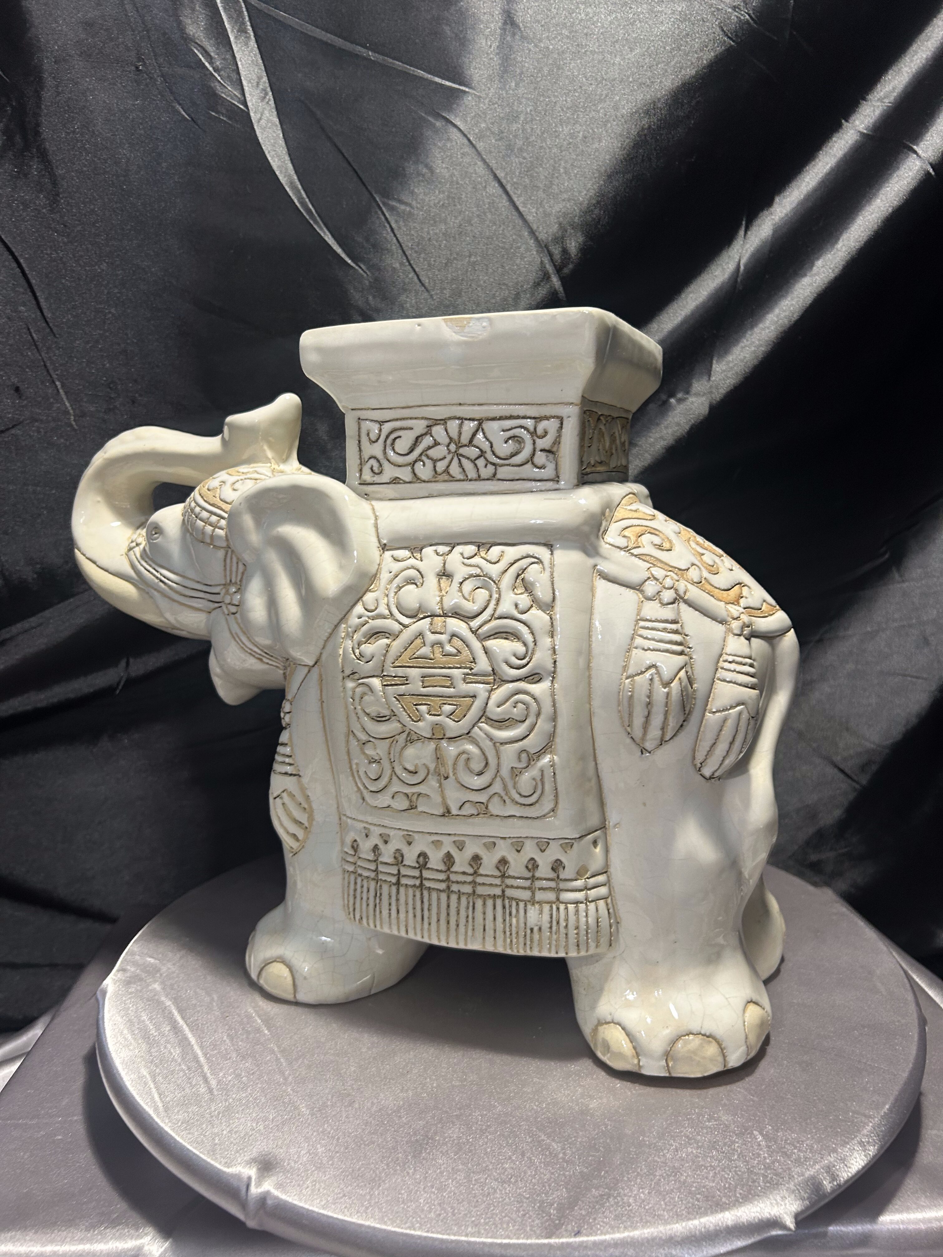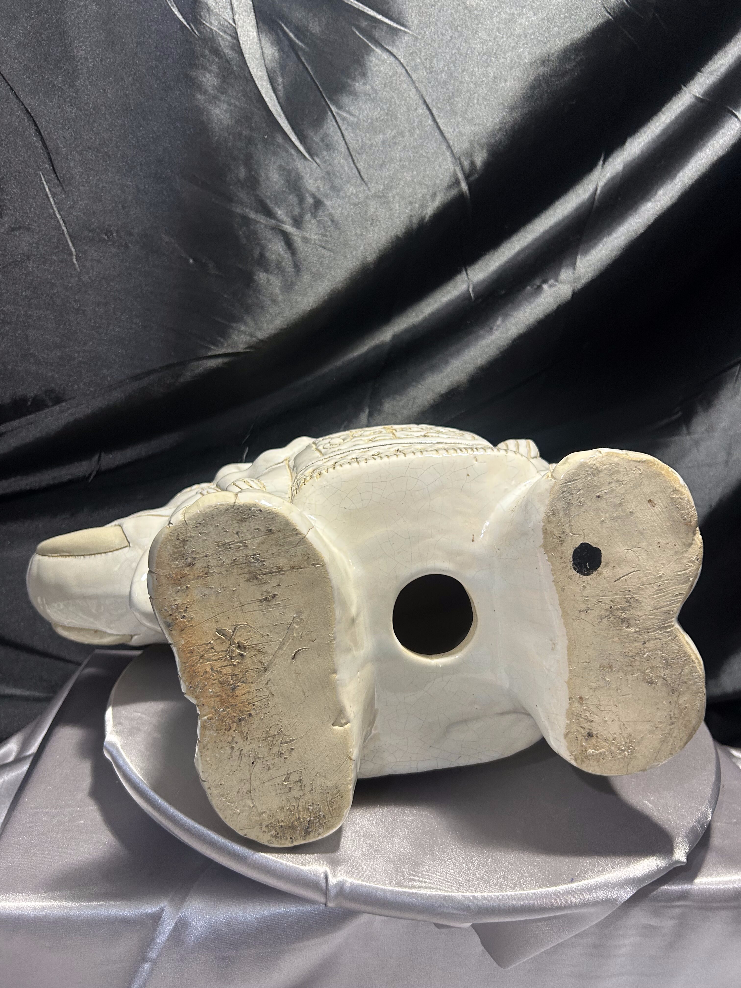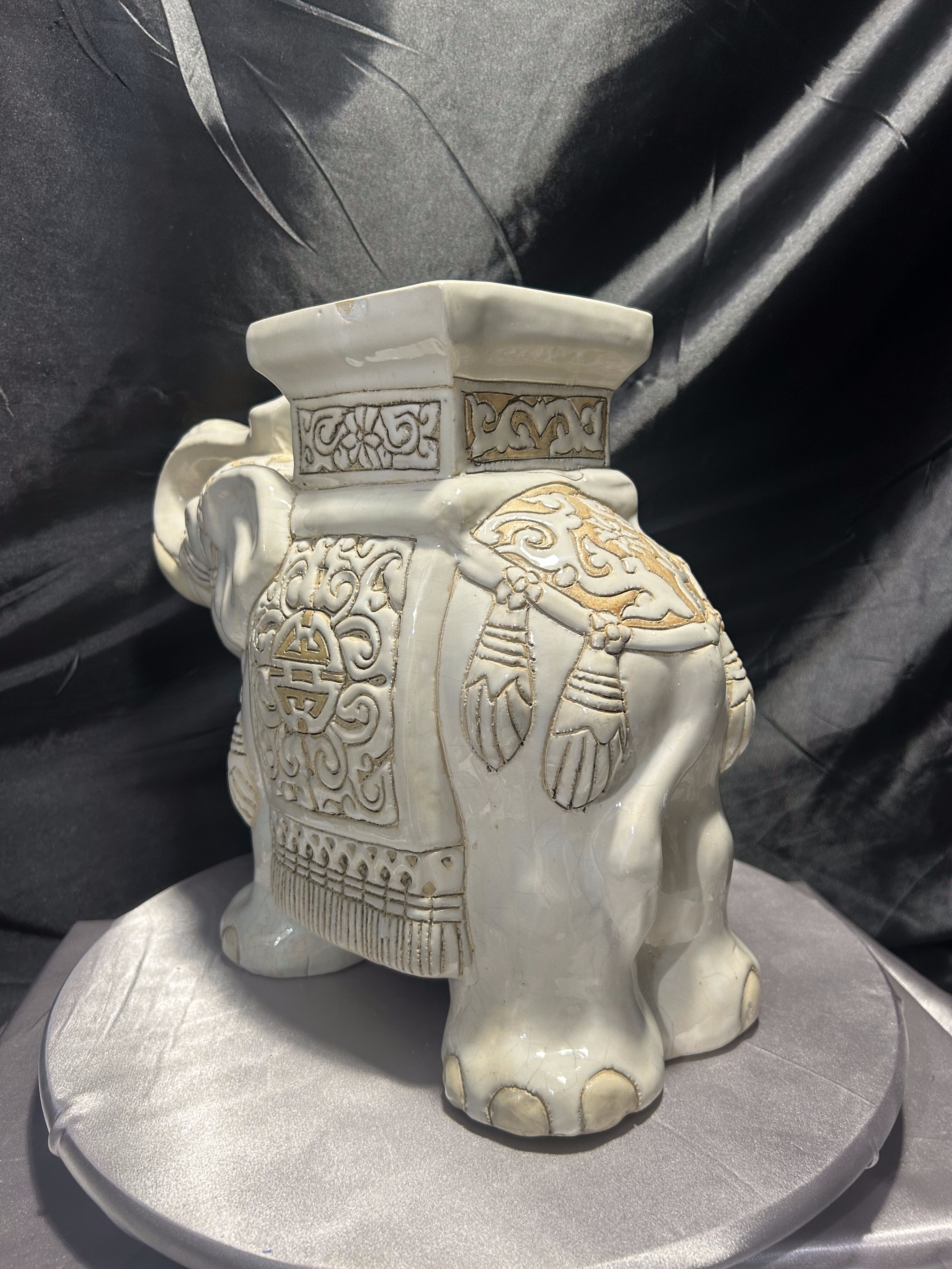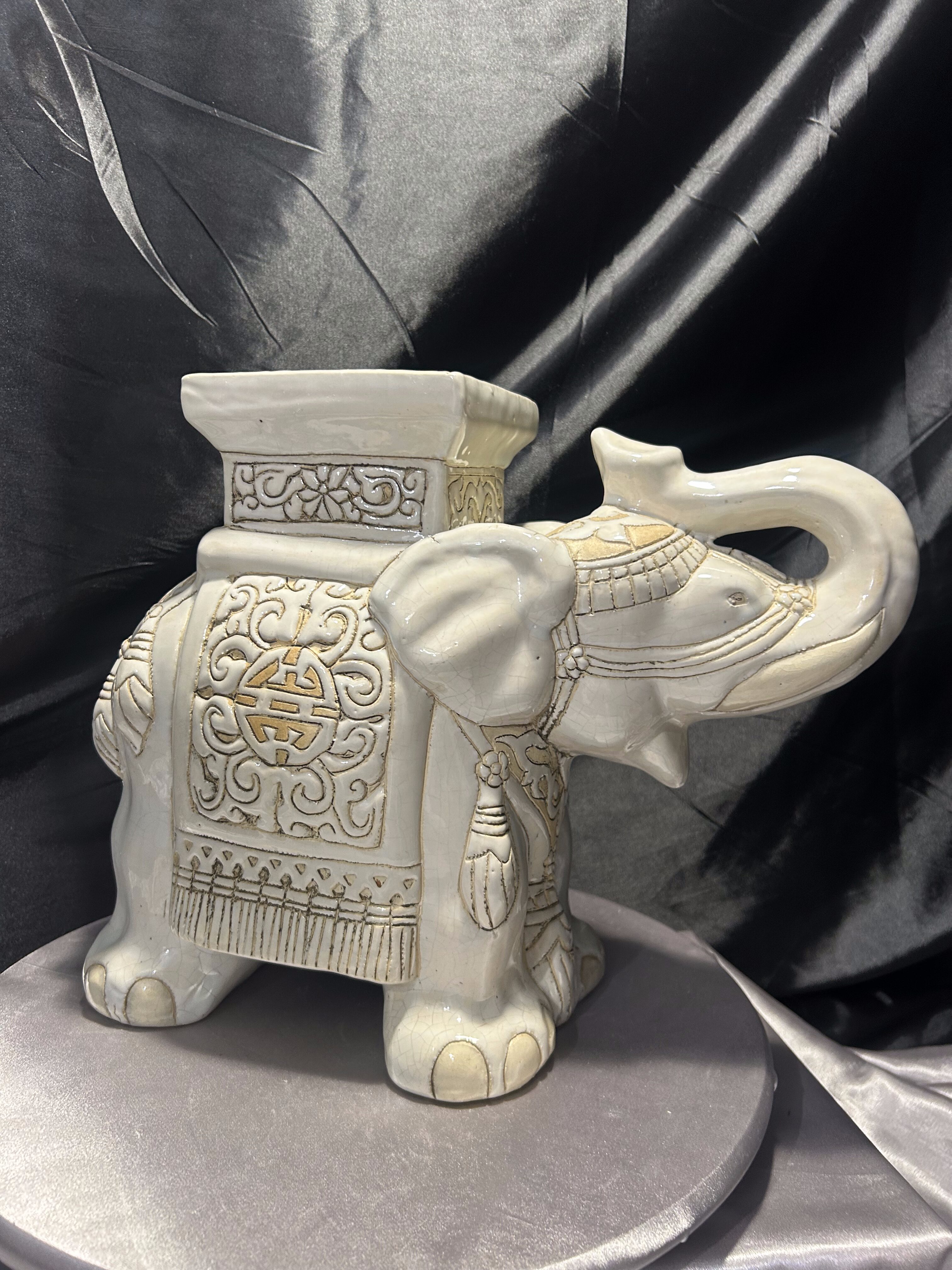 Imponująca figurka przedstawiająca indyjskiego słonia z trąbą uniesioną ku górze – symbolem pomyślności, ochrony i dobrobytu. Wykonana z ceramiki szkliwionej w odcieniu złamanej bieli, zdobiona reliefami z orientalnymi motywami i symbolami. Bogactwo detalu, misternie wykonane zdobienia i monumentalna forma sprawiają, że słoń przykuwa uwagę i doskonale odnajduje się w roli dekoracyjnego akcentu w salonie, sypialni lub przestrzeni medytacyjnej. Może pełnić także funkcję niskiego stolika lub podstawy pod roślinę.