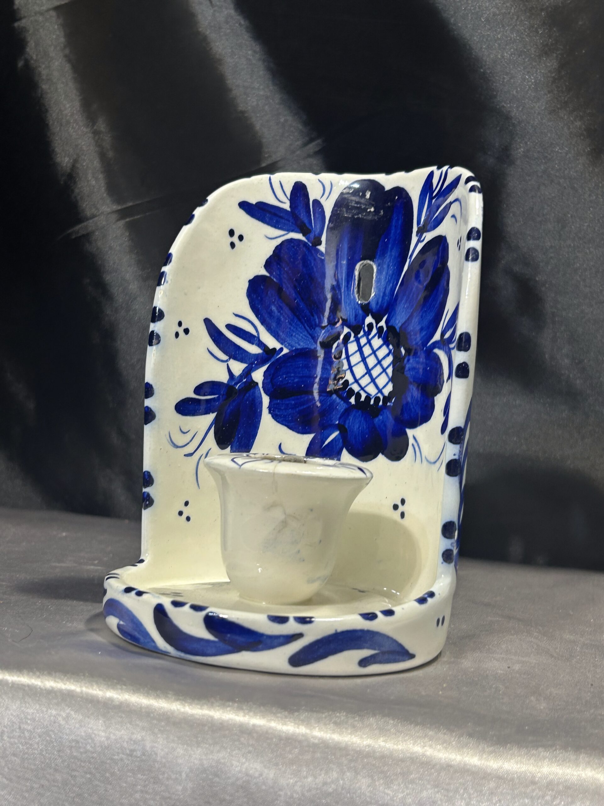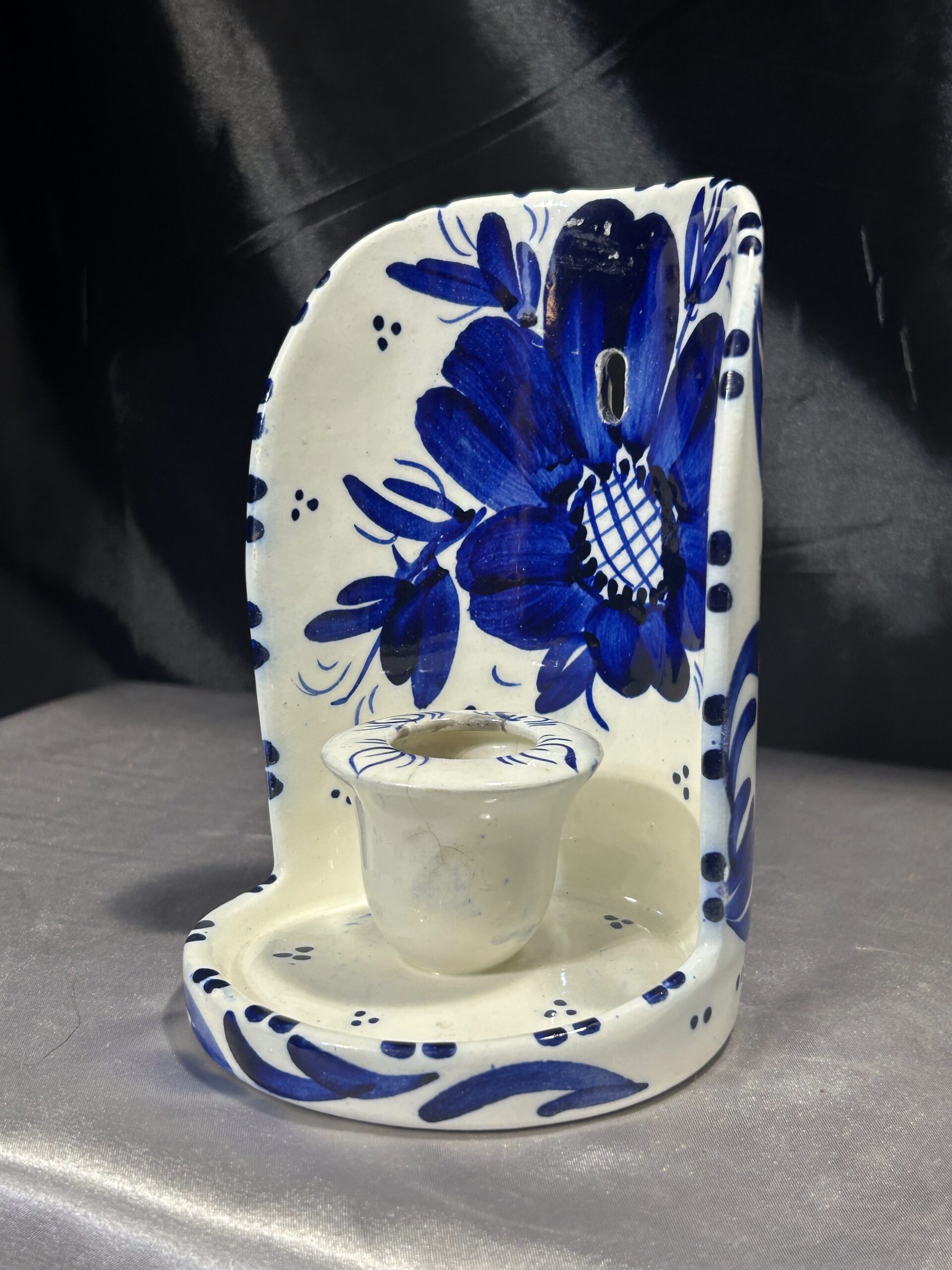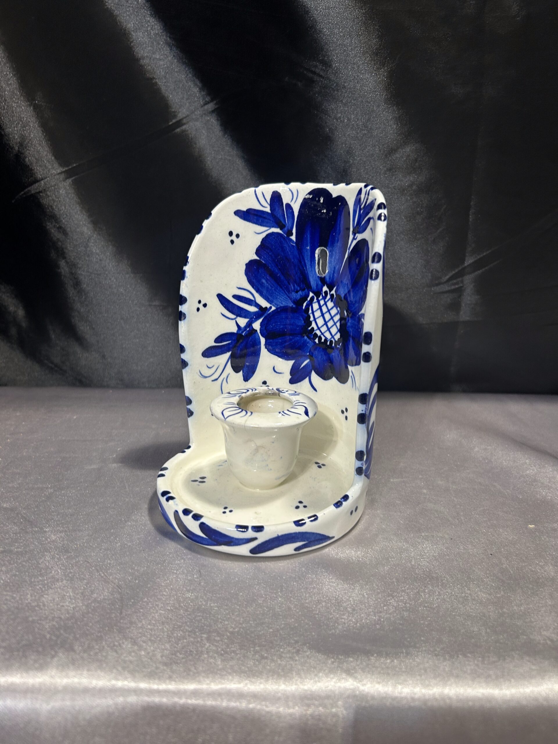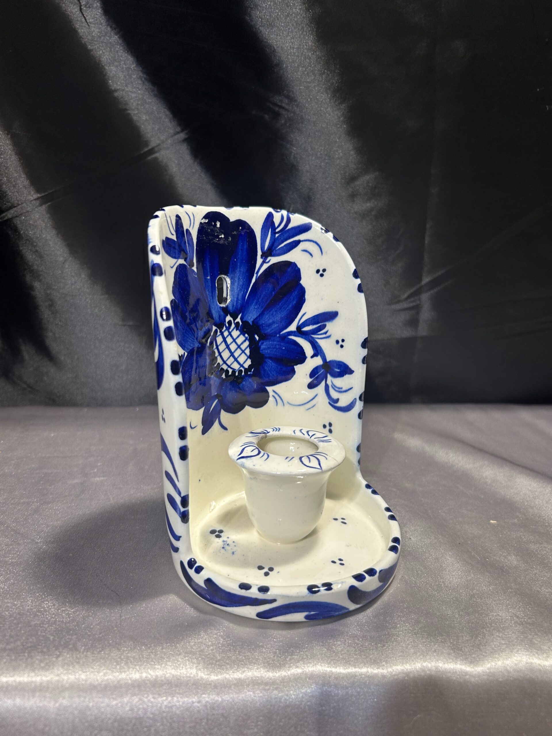 Przedstawiam elegancki ceramiczny świecznik, ozdobiony niebieskimi kwiatami i wstawkami, przeznaczony na jedną świecę do powieszenia na ścianie. To klasyczna i stylowa dekoracja, która nada wnętrzu ciepłego, rustykalnego klimatu.