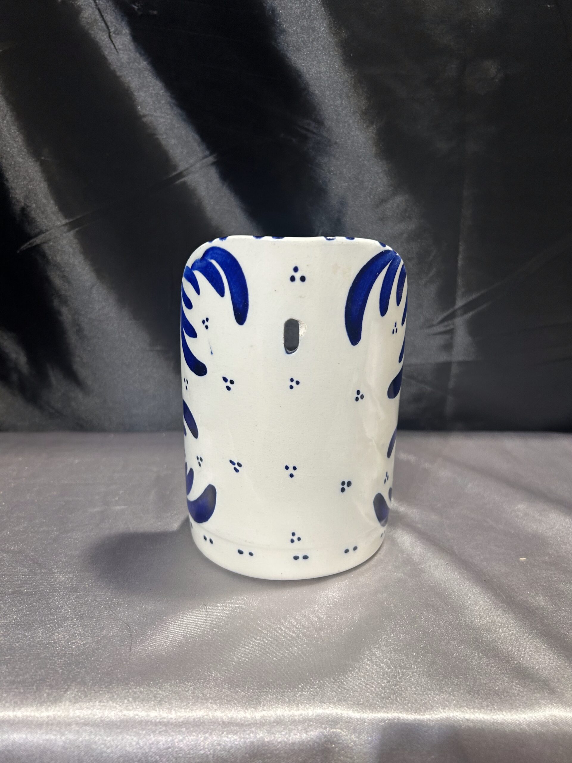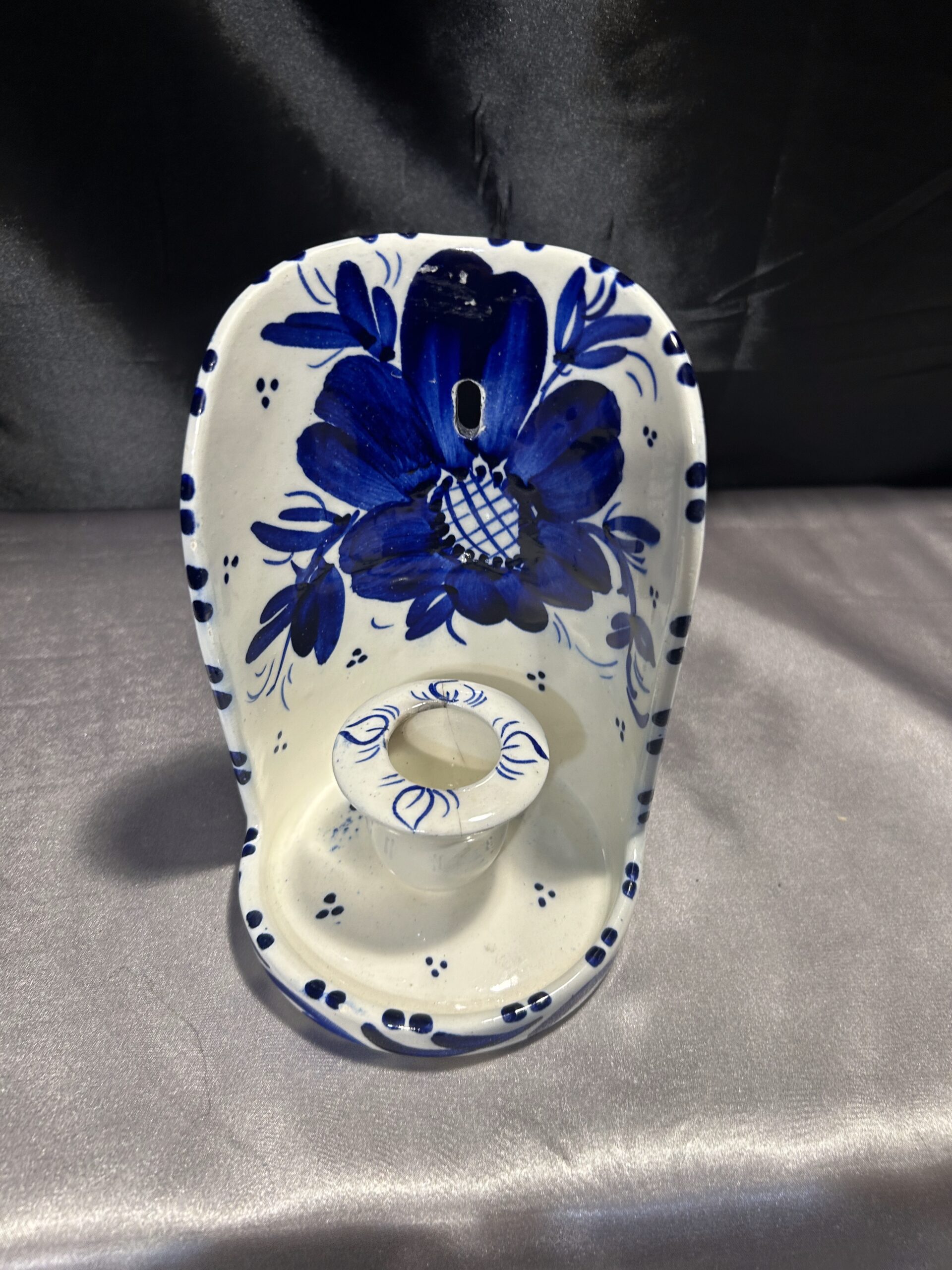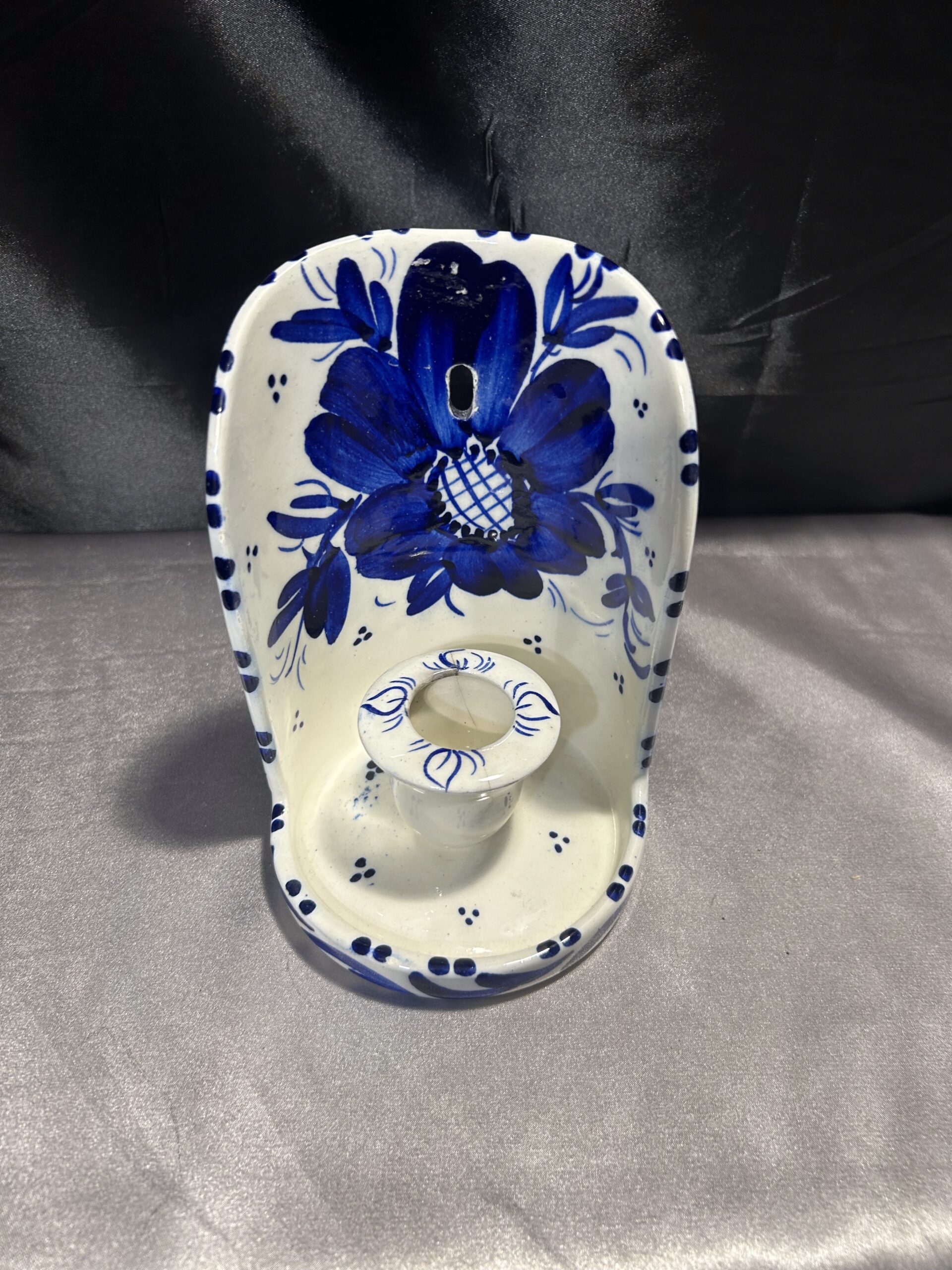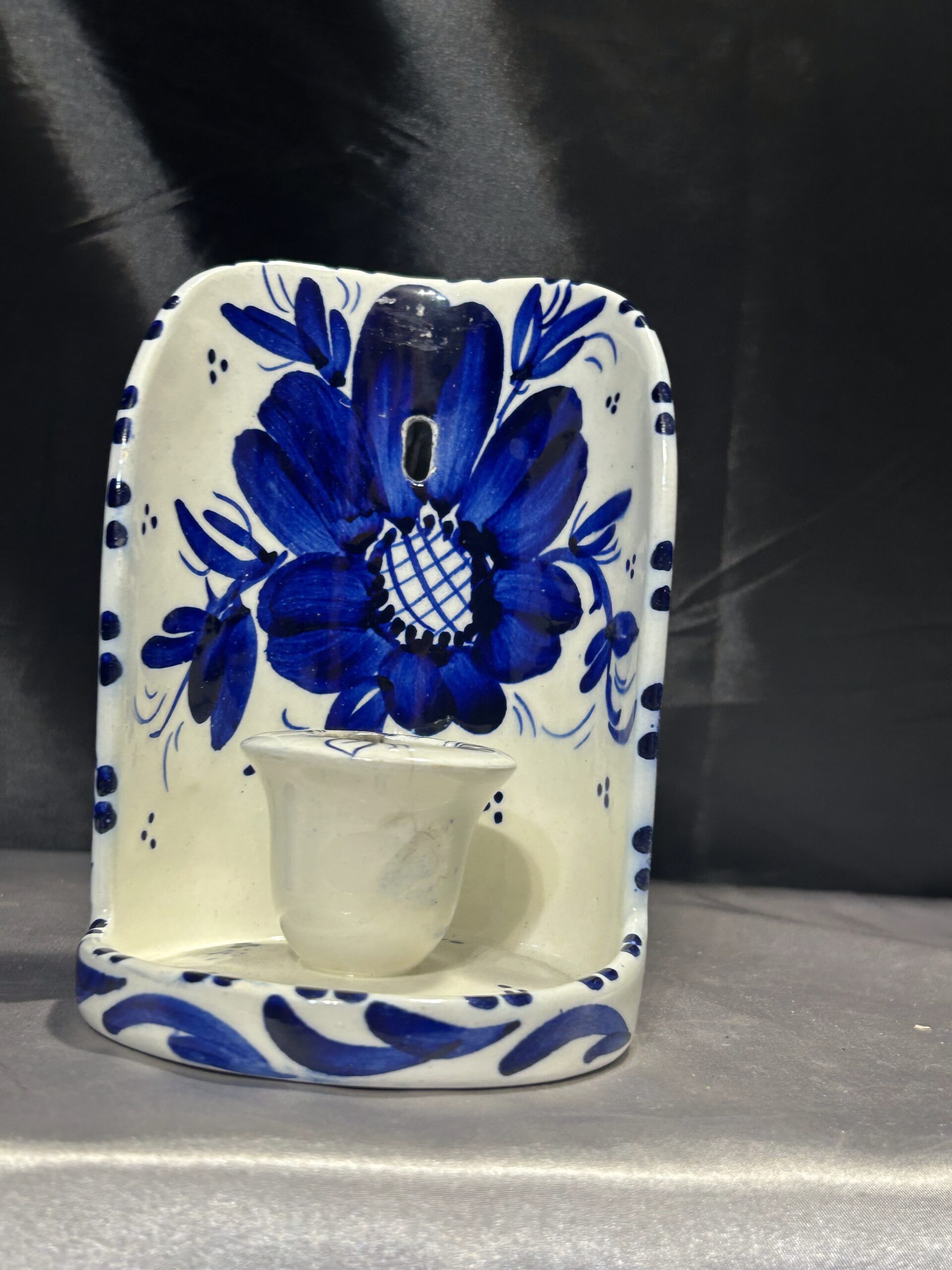 Przedstawiam elegancki ceramiczny świecznik, ozdobiony niebieskimi kwiatami i wstawkami, przeznaczony na jedną świecę do powieszenia na ścianie. To klasyczna i stylowa dekoracja, która nada wnętrzu ciepłego, rustykalnego klimatu.