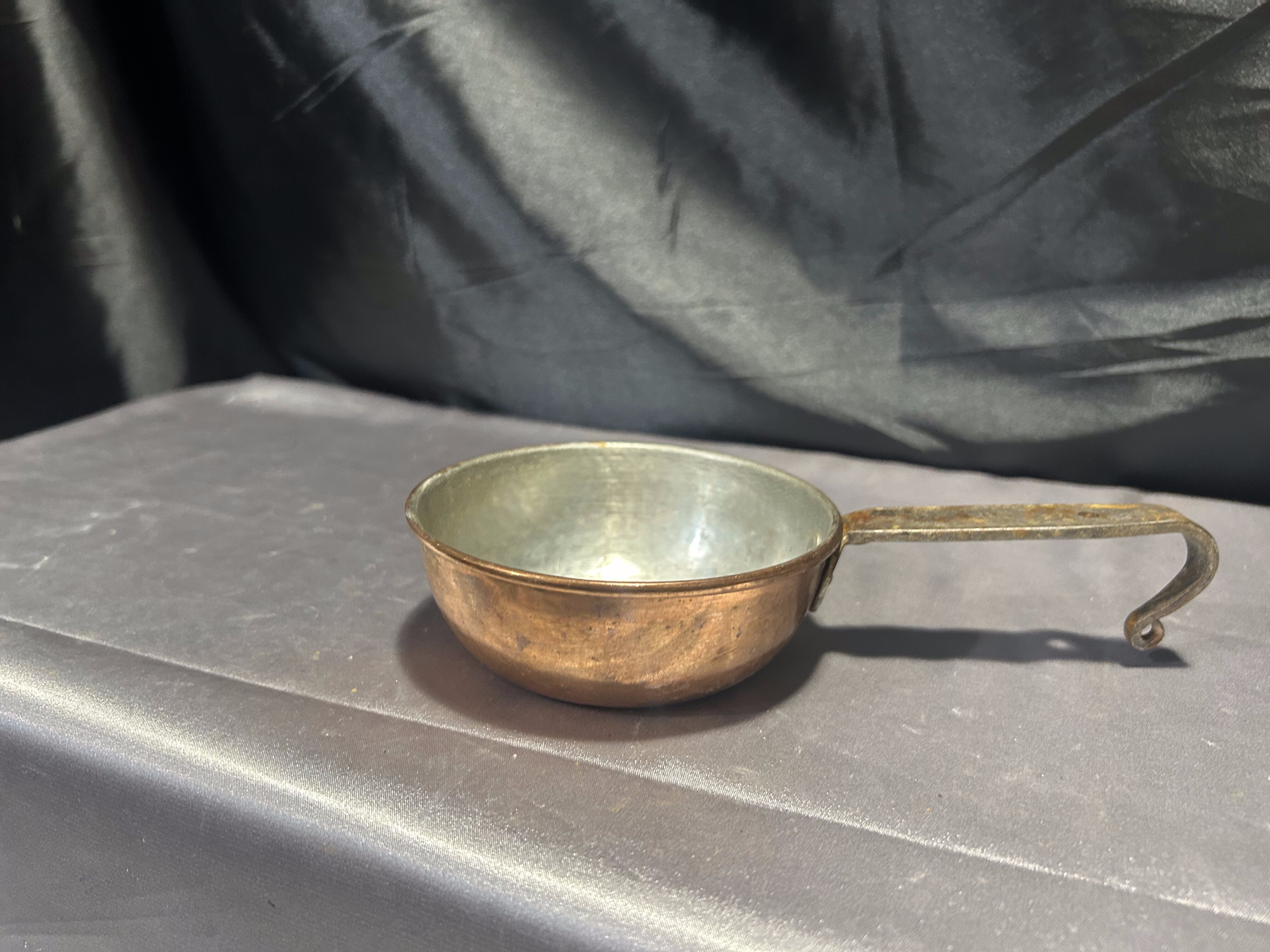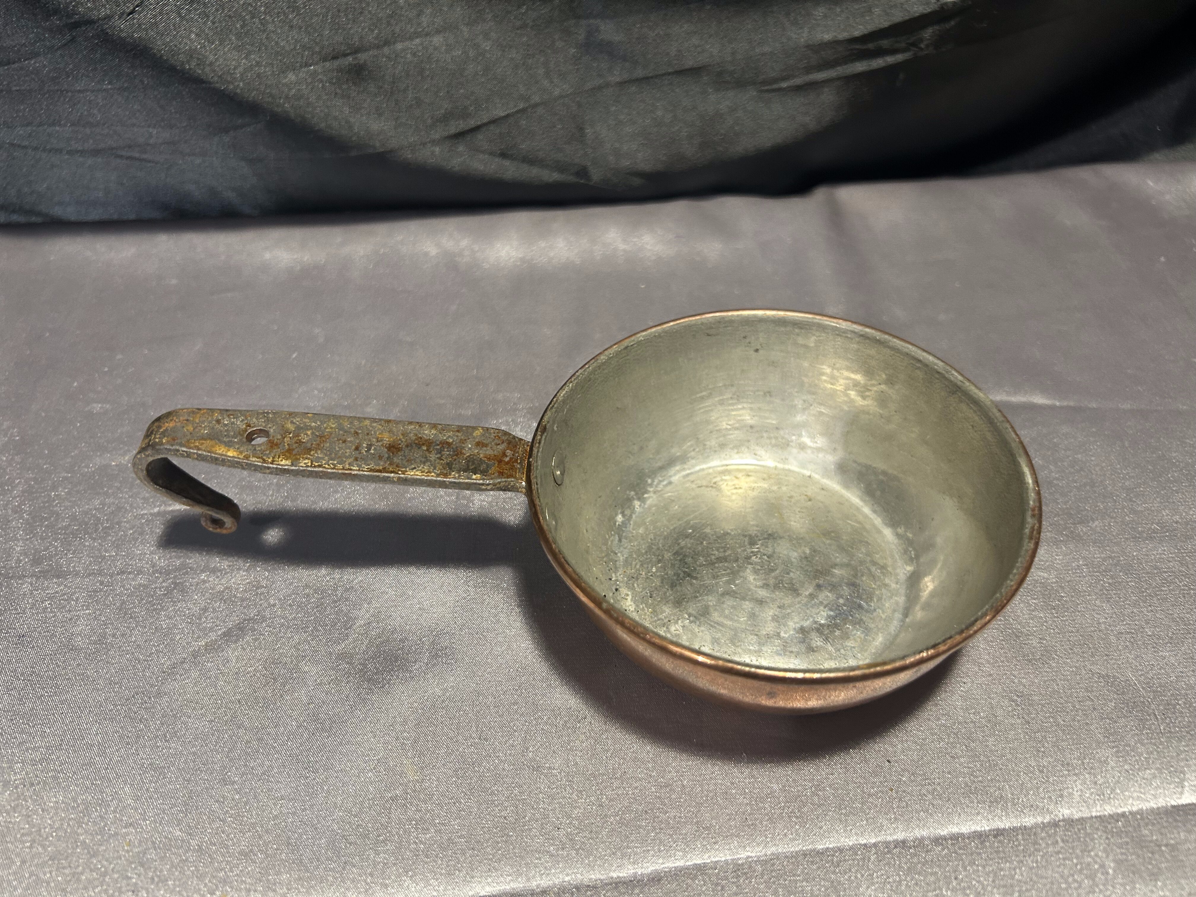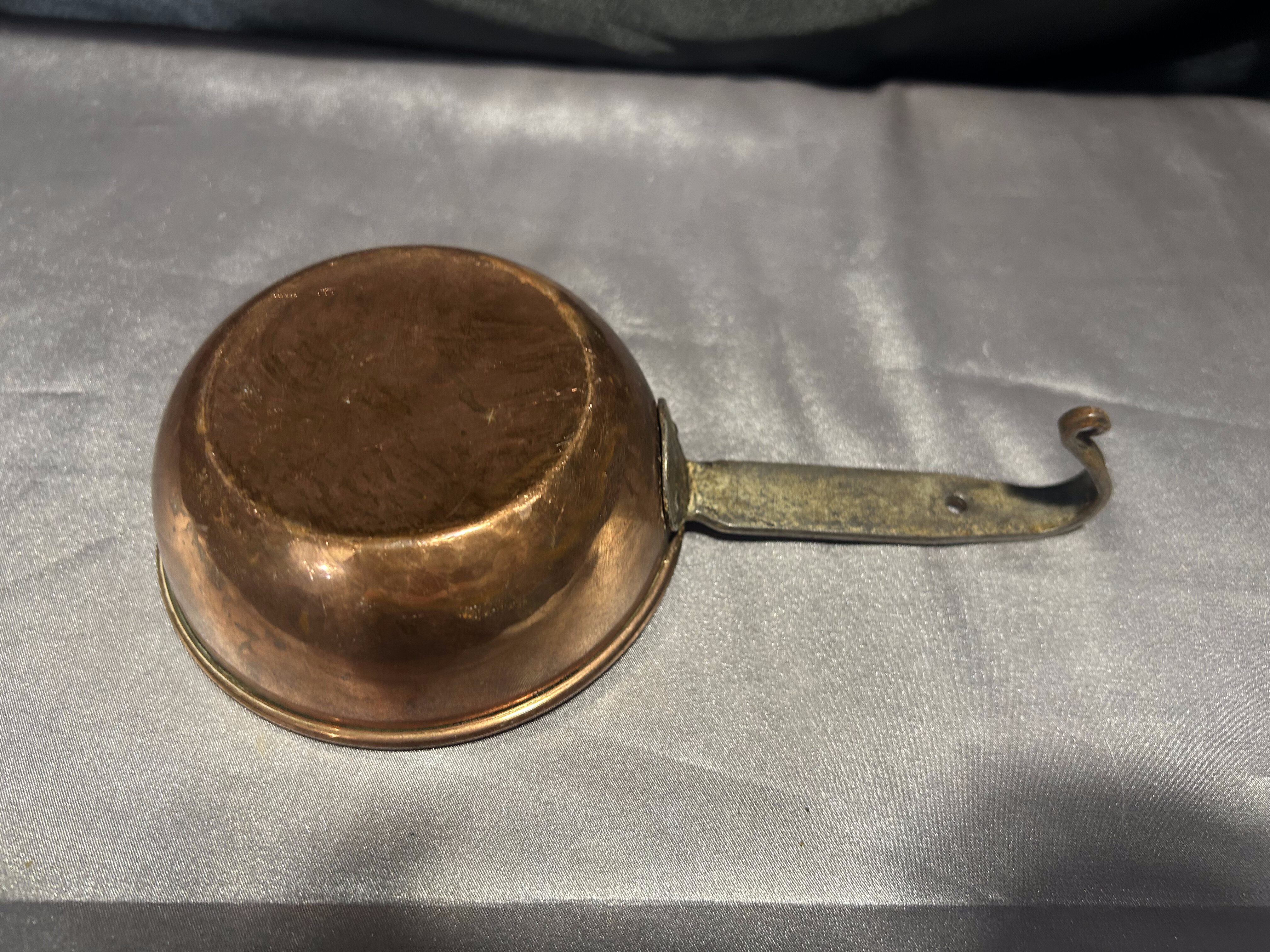 - Chochla miedziana z kutą rączką – vintage rondel do zawieszenia