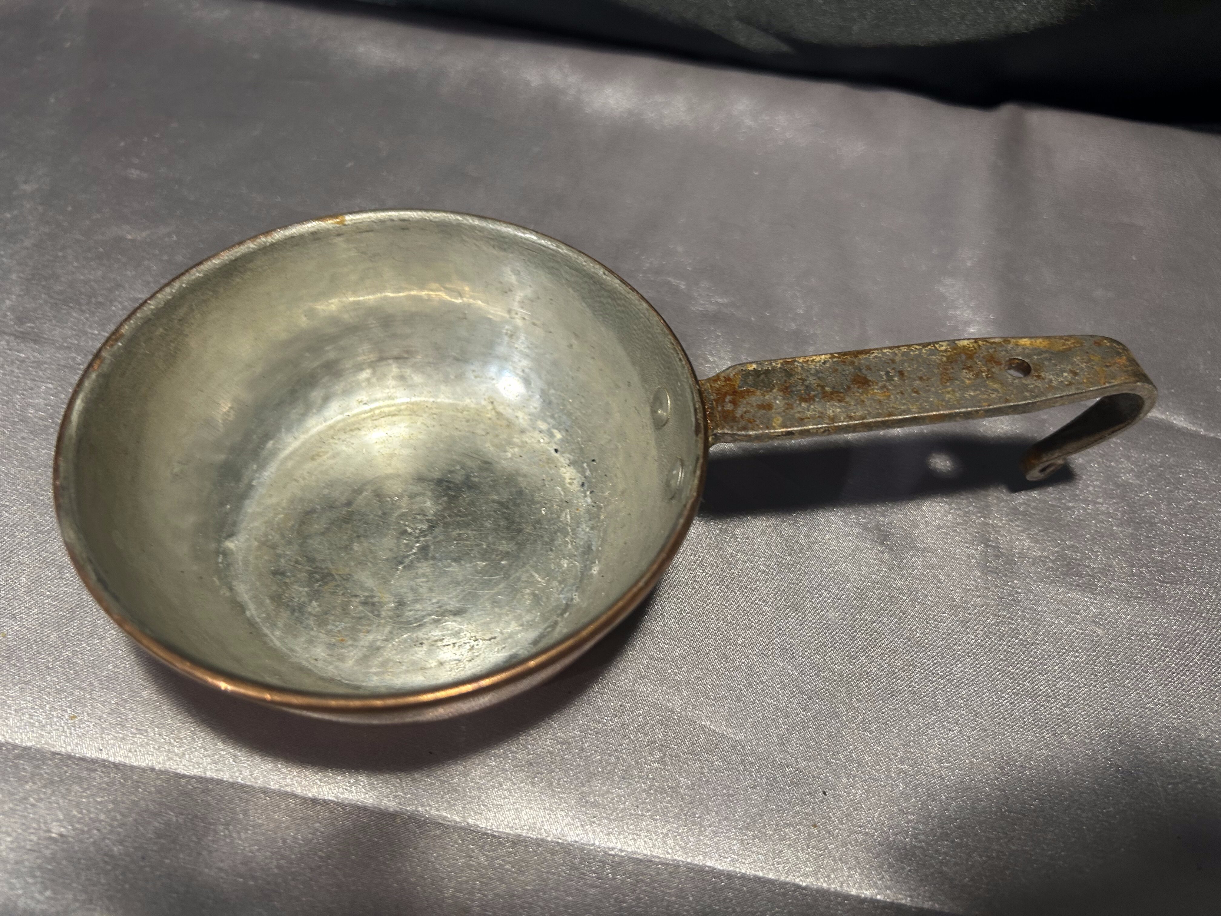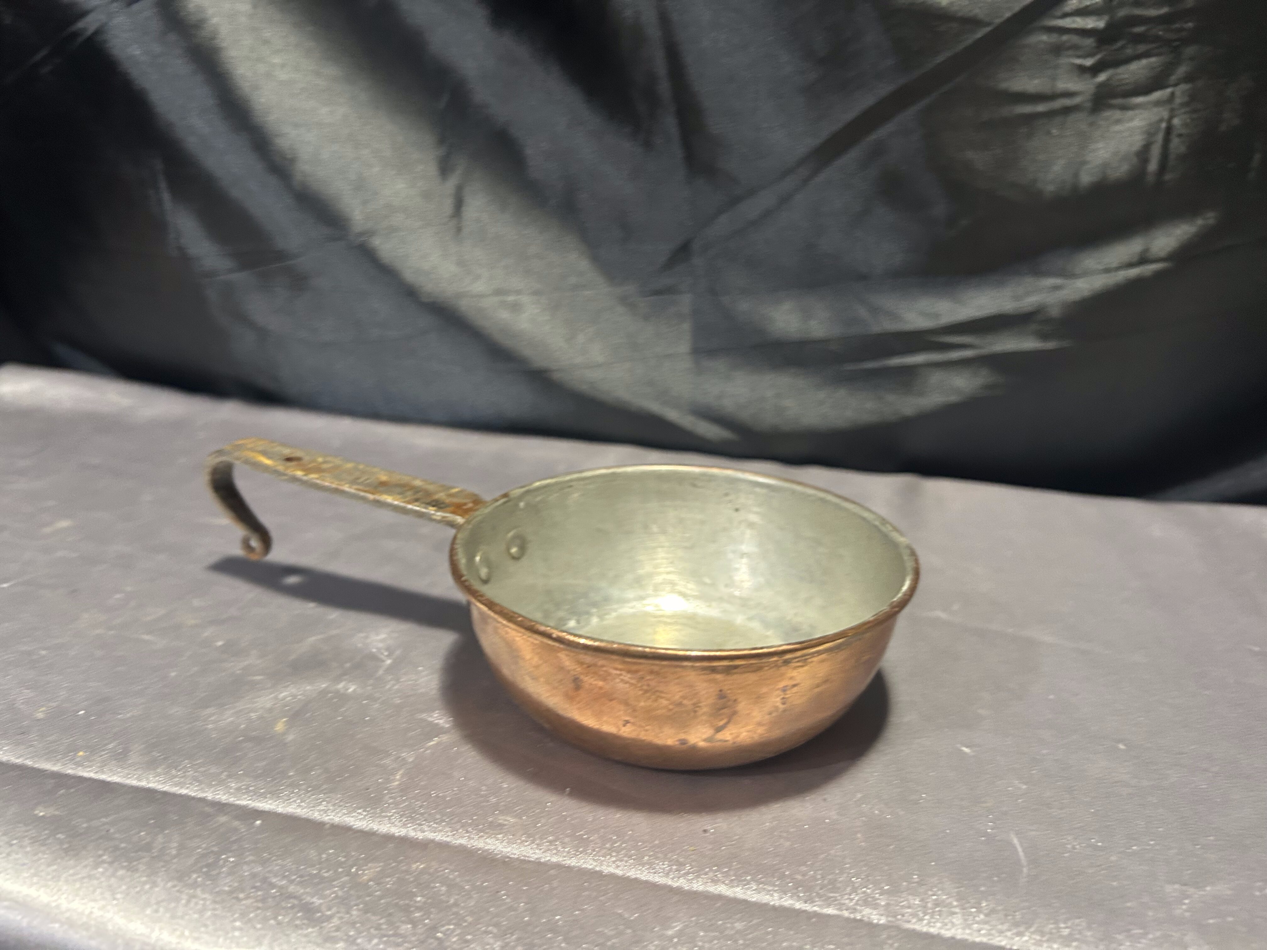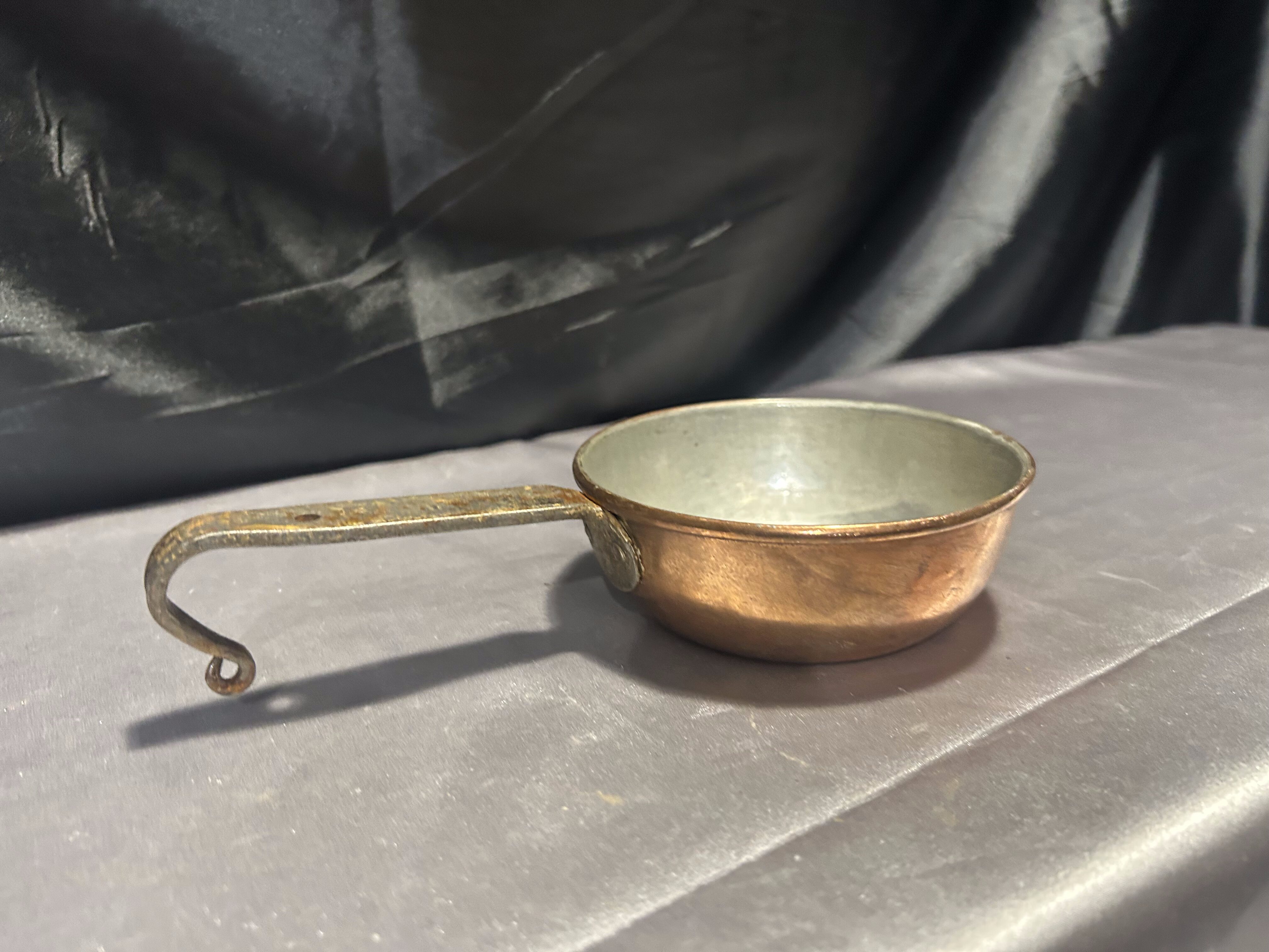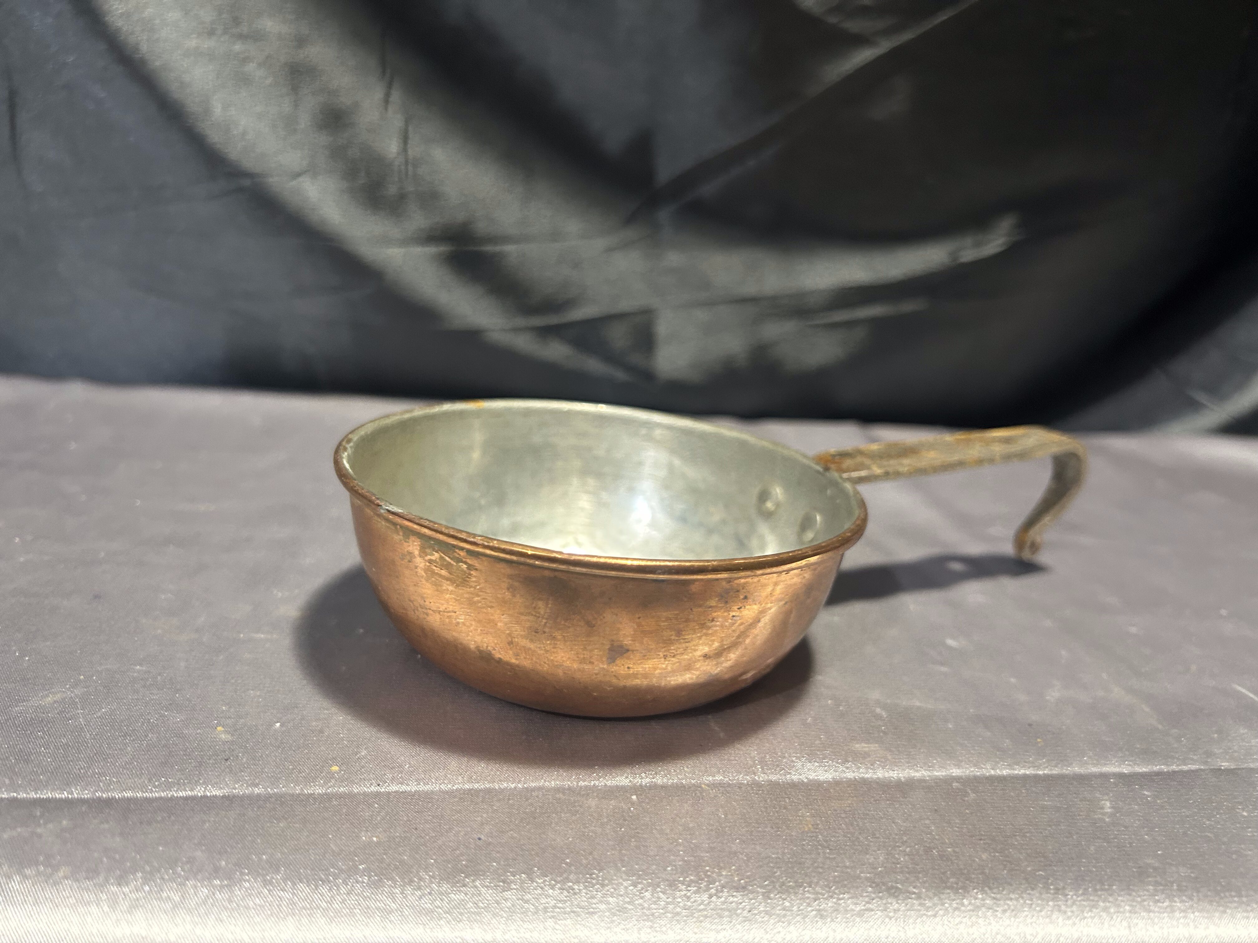 - Chochla miedziana z kutą rączką – vintage rondel do zawieszenia