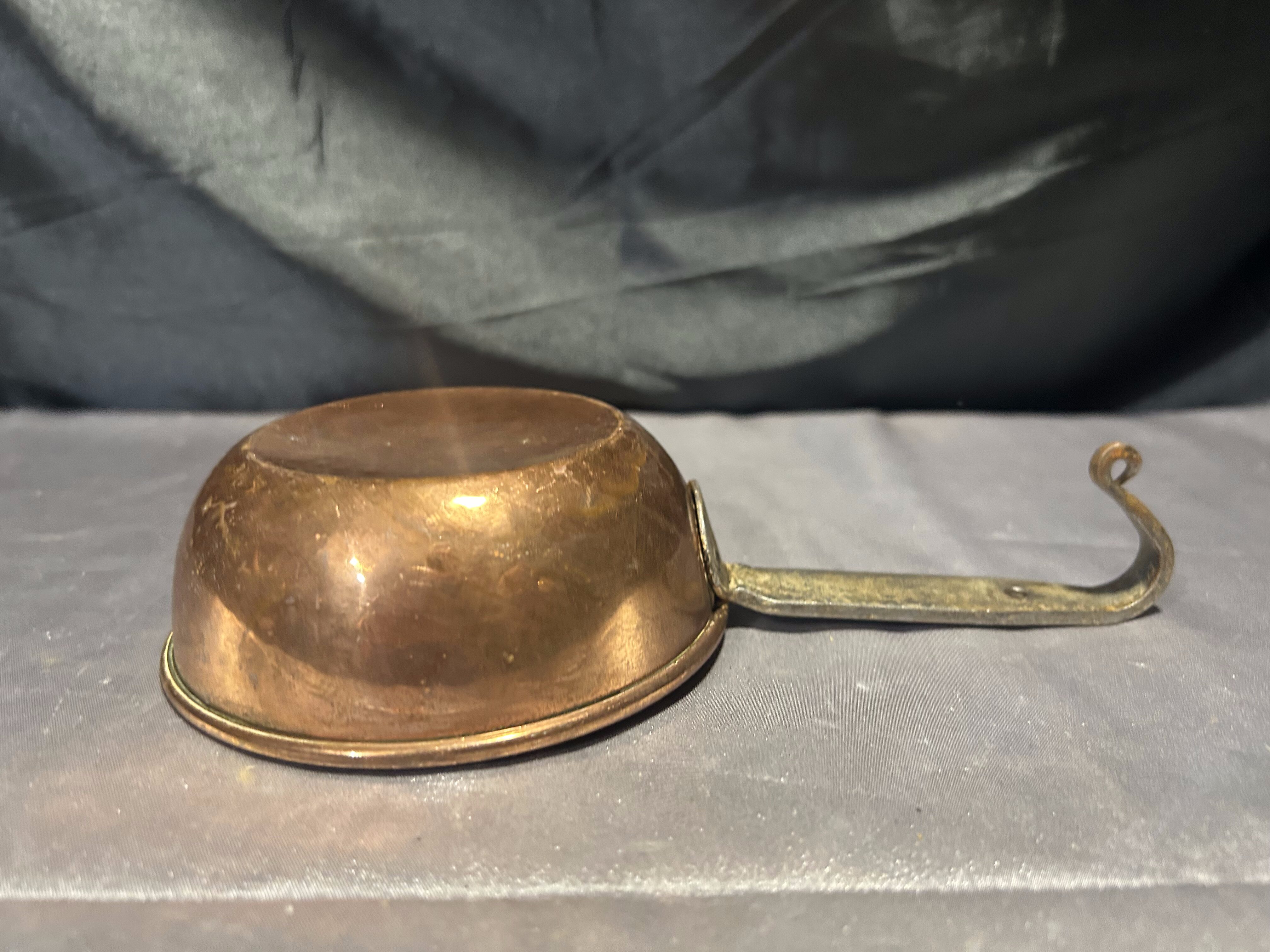Chochla miedziana z kutą rączką – vintage rondel do zawieszenia