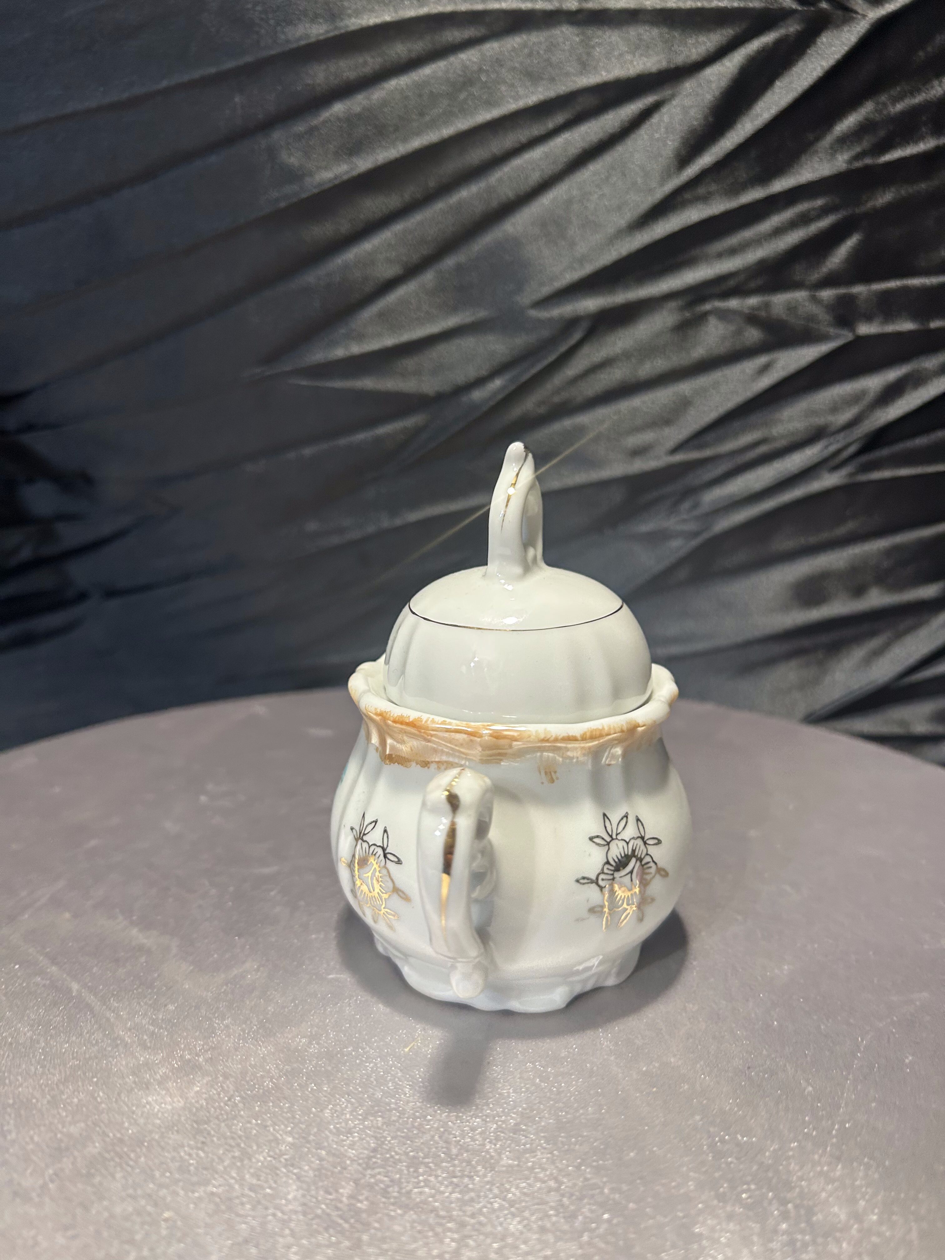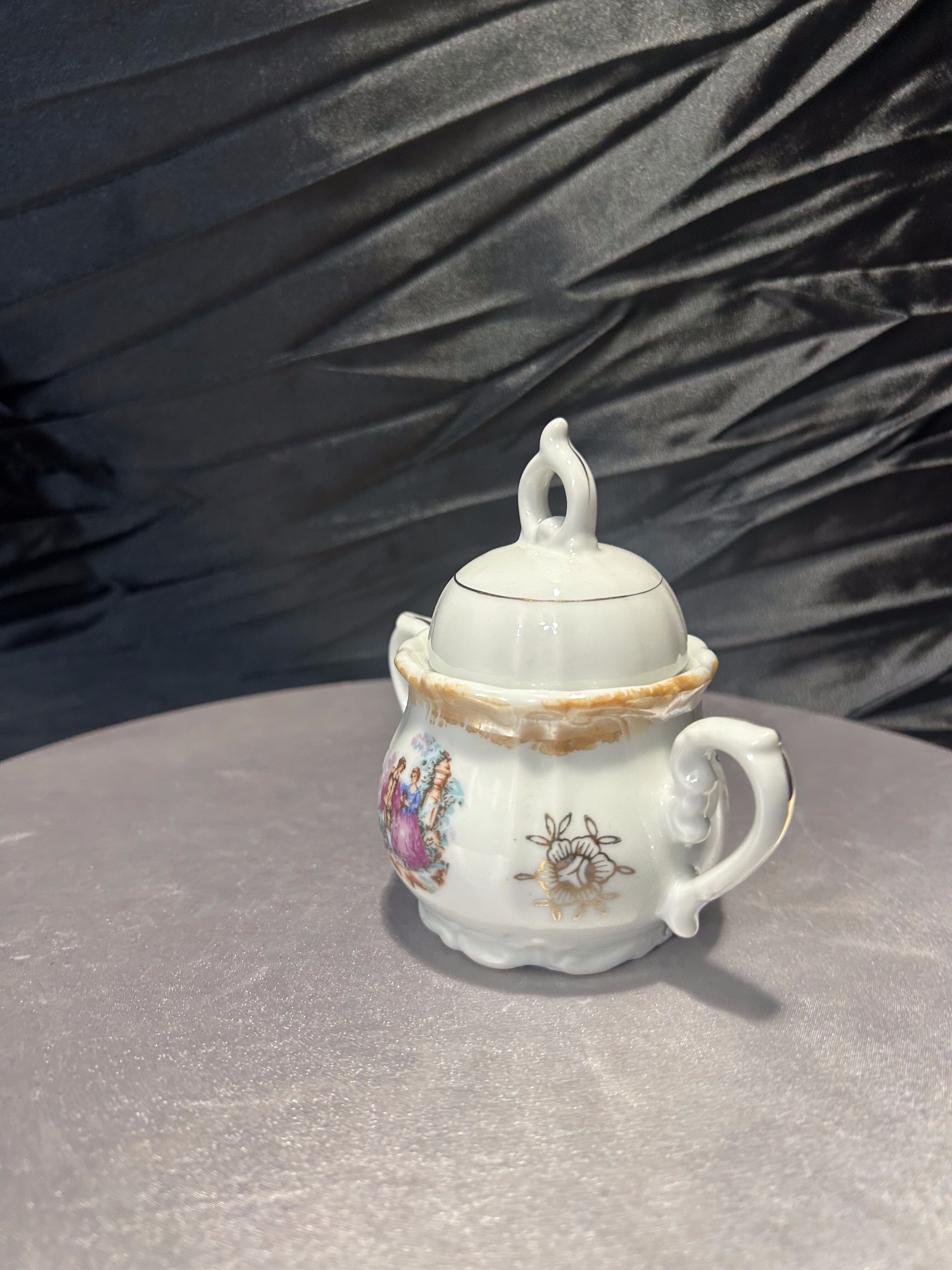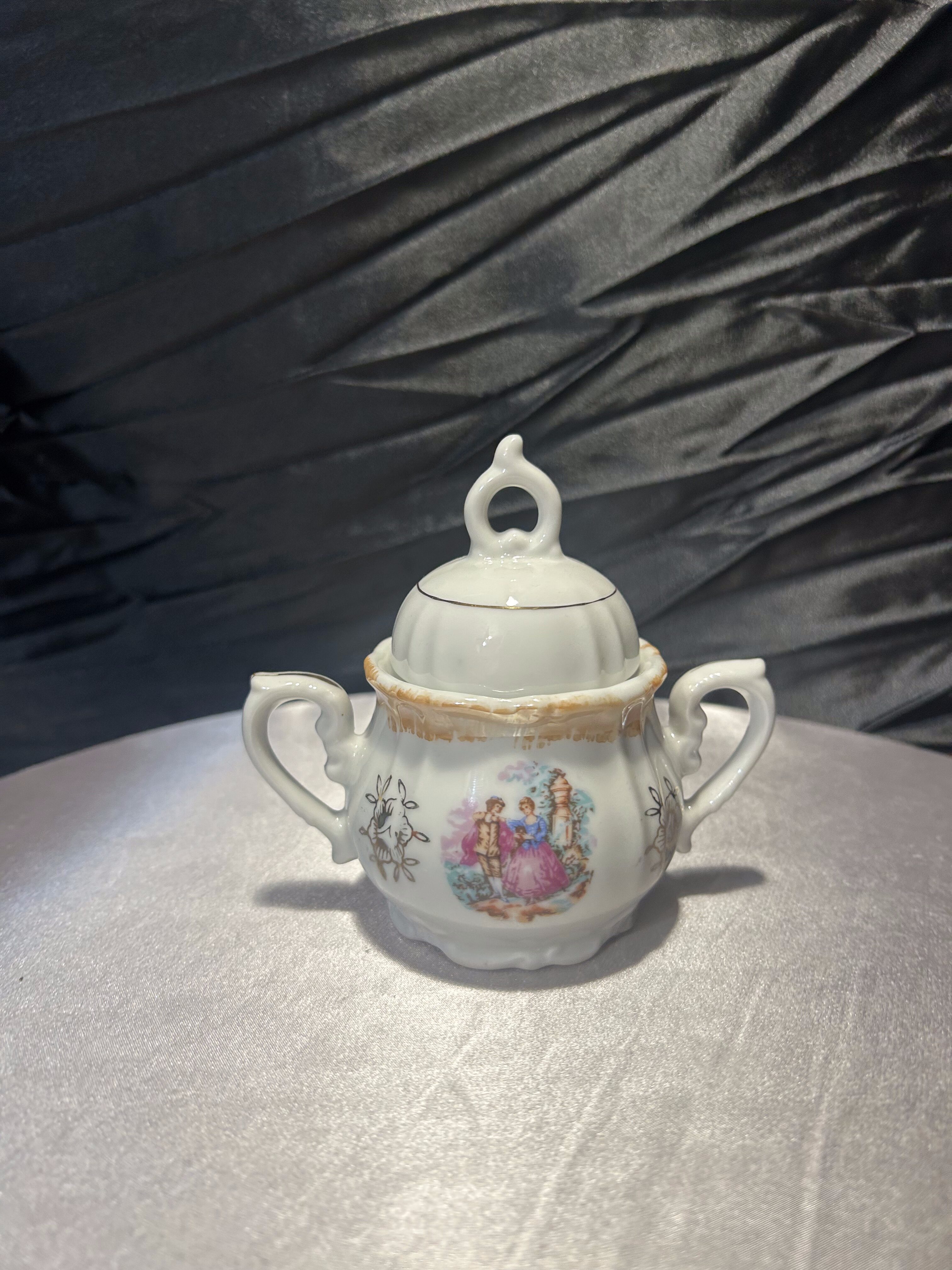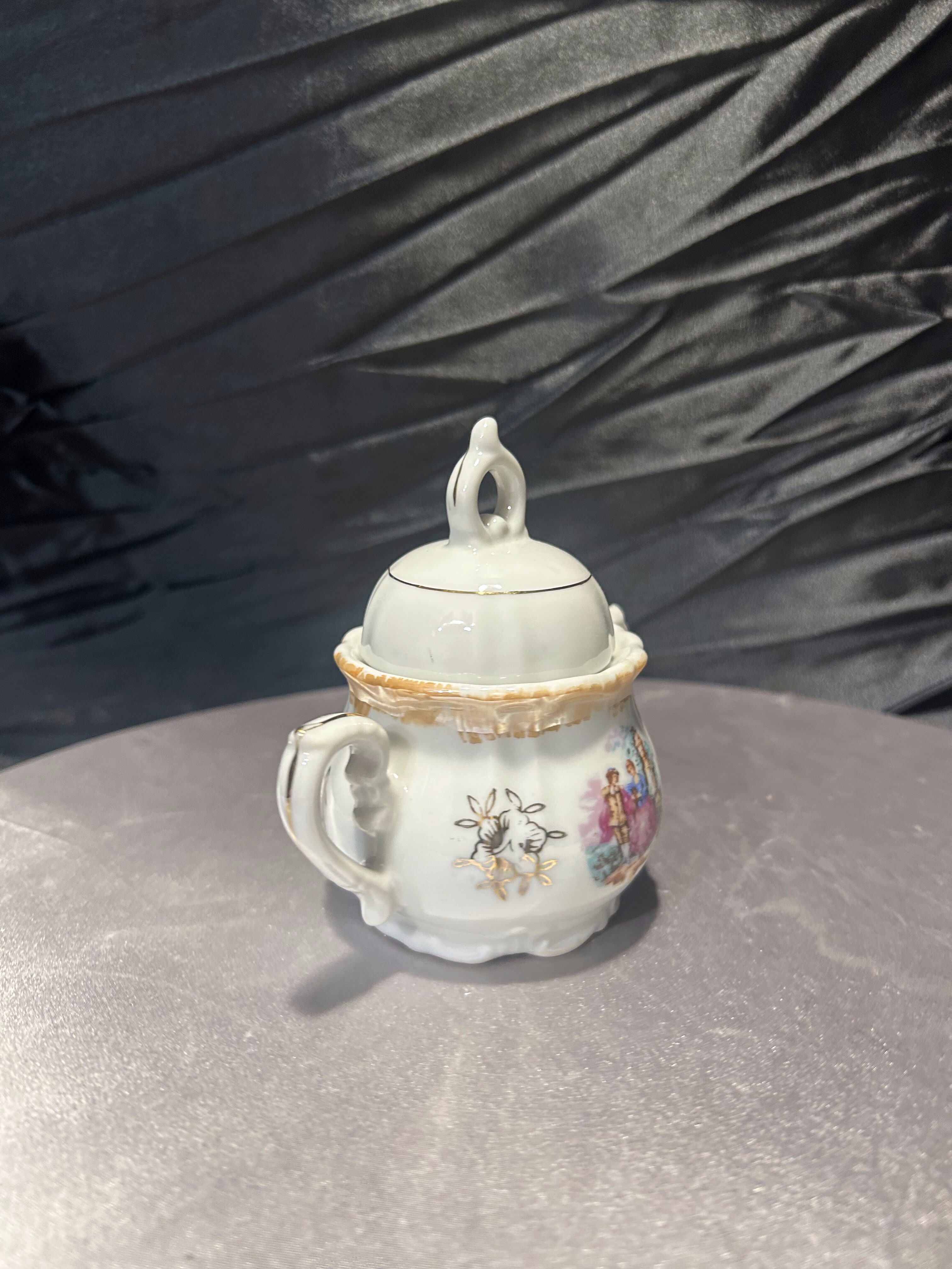 Porcelanowa cukiernica sygnowana znakiem Yamato Japan, pochodząca z Japonii. To wyrób z połowy XX wieku, kiedy japońska porcelana była intensywnie eksportowana na rynek zachodni. Delikatne złocenia oraz klasyczna dekoracja w stylu romantycznym z motywem scenki rodzajowej podkreślają jej elegancki charakter.