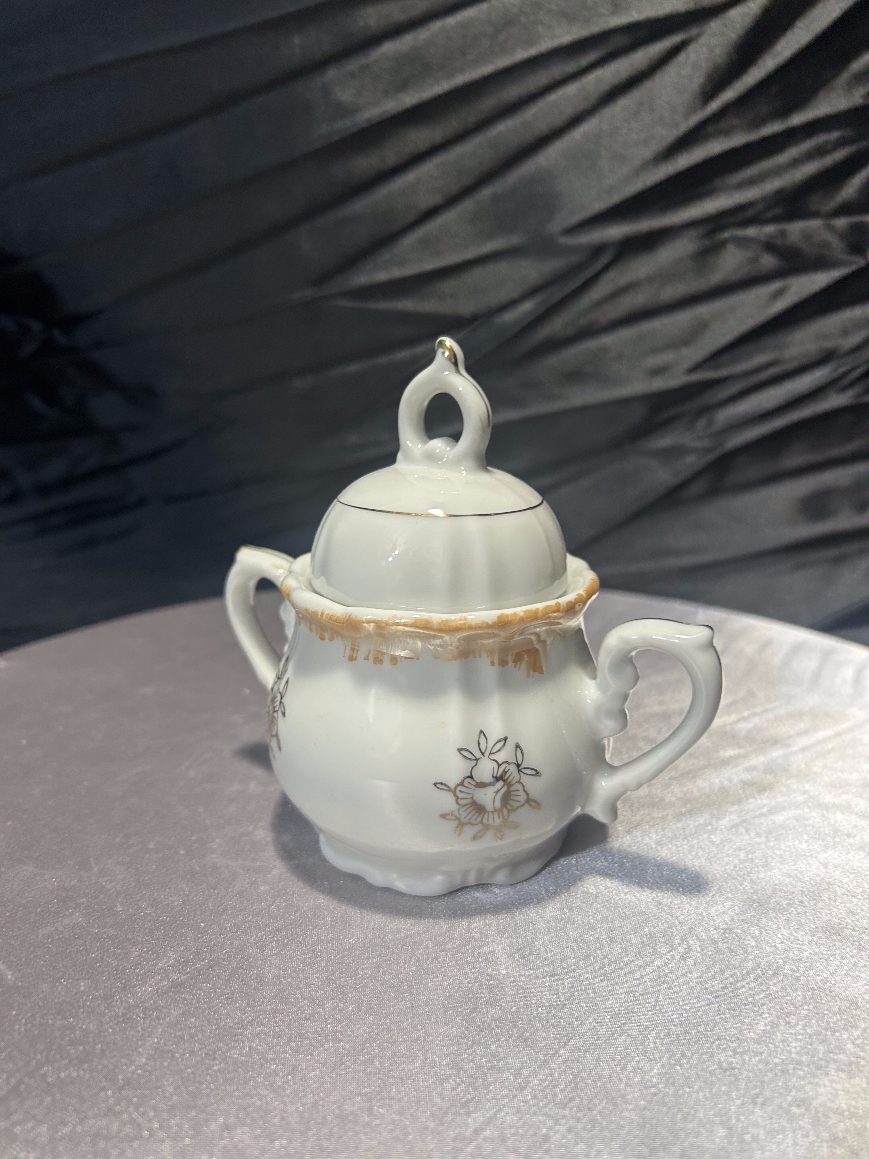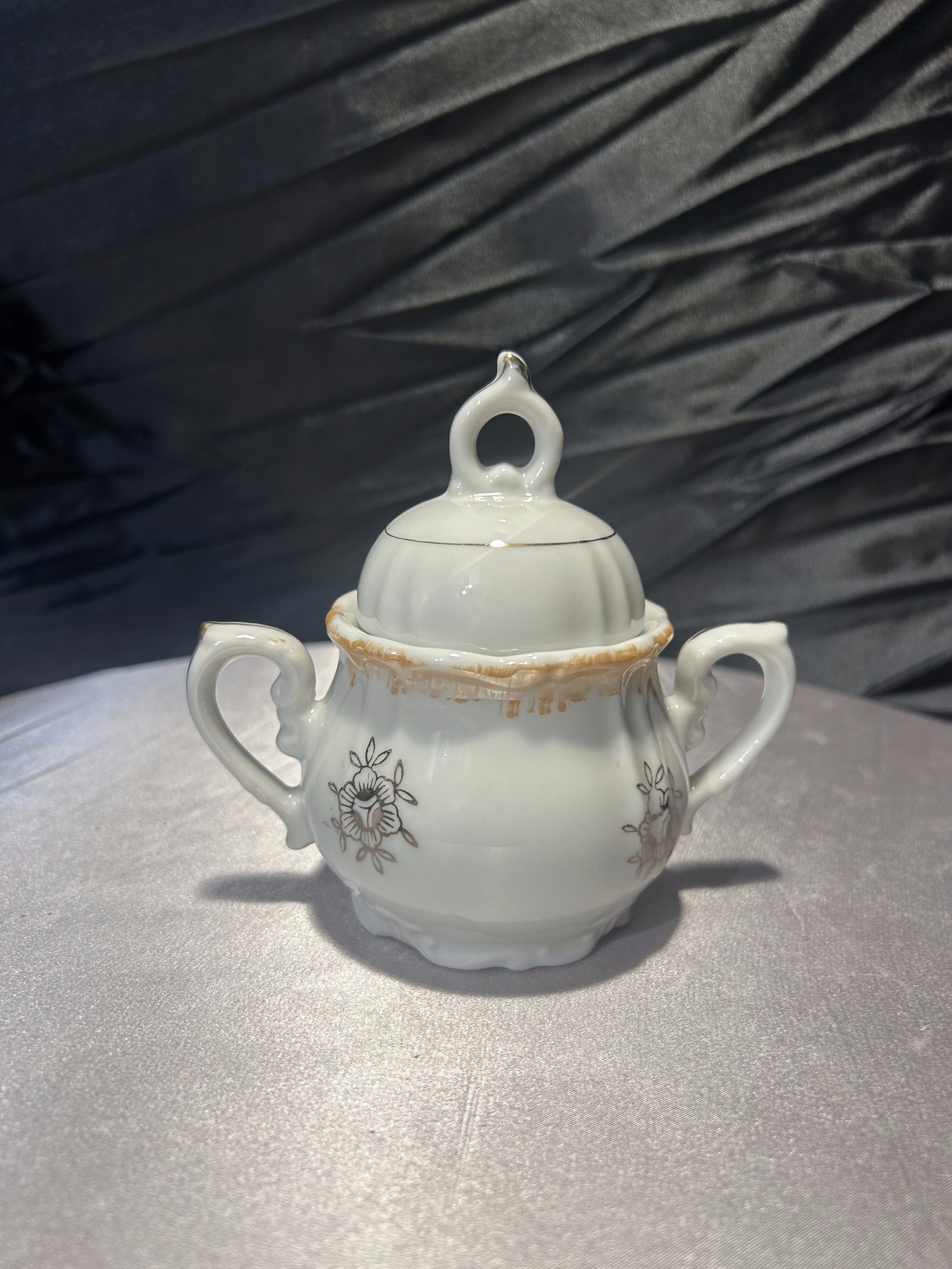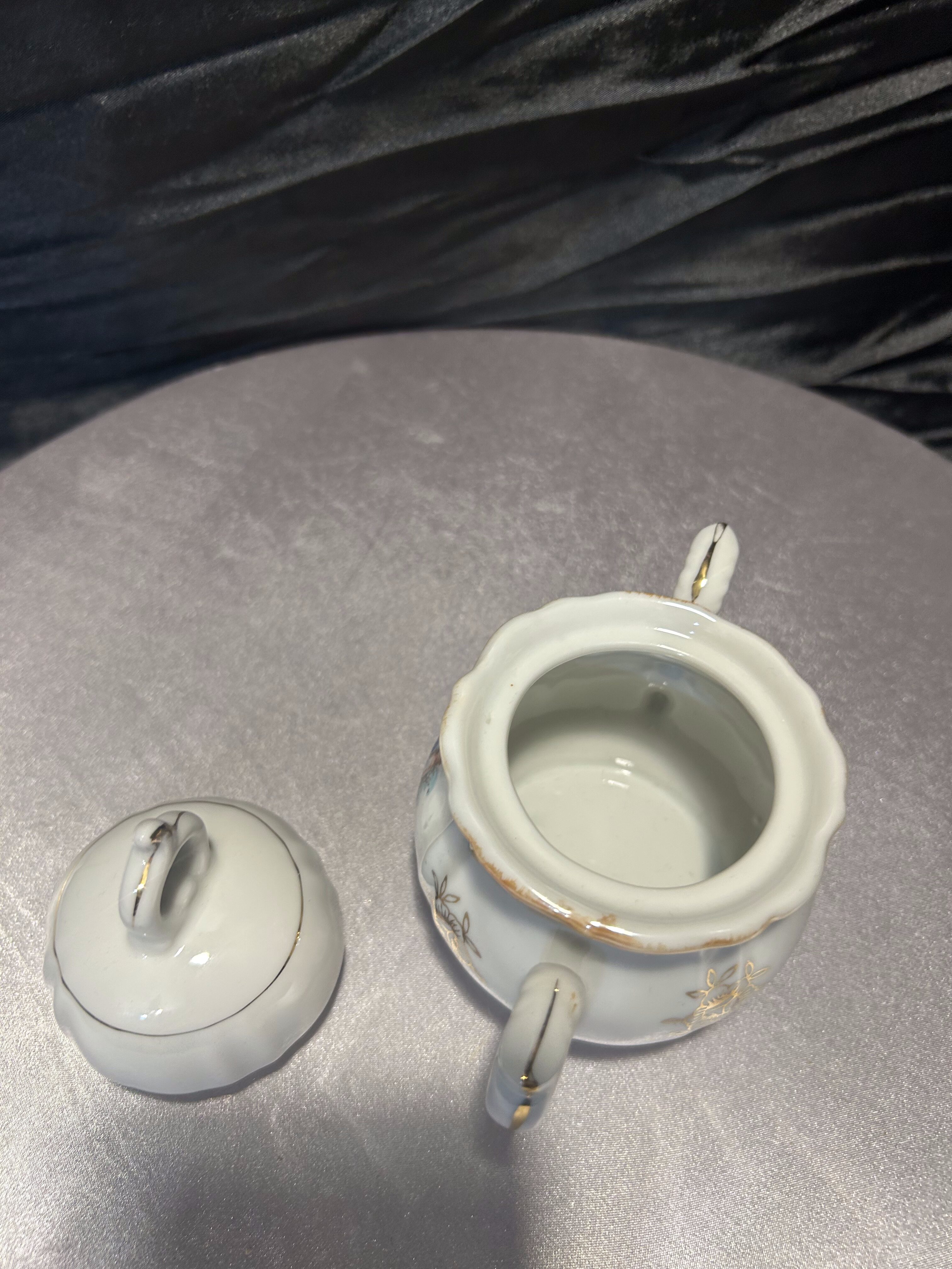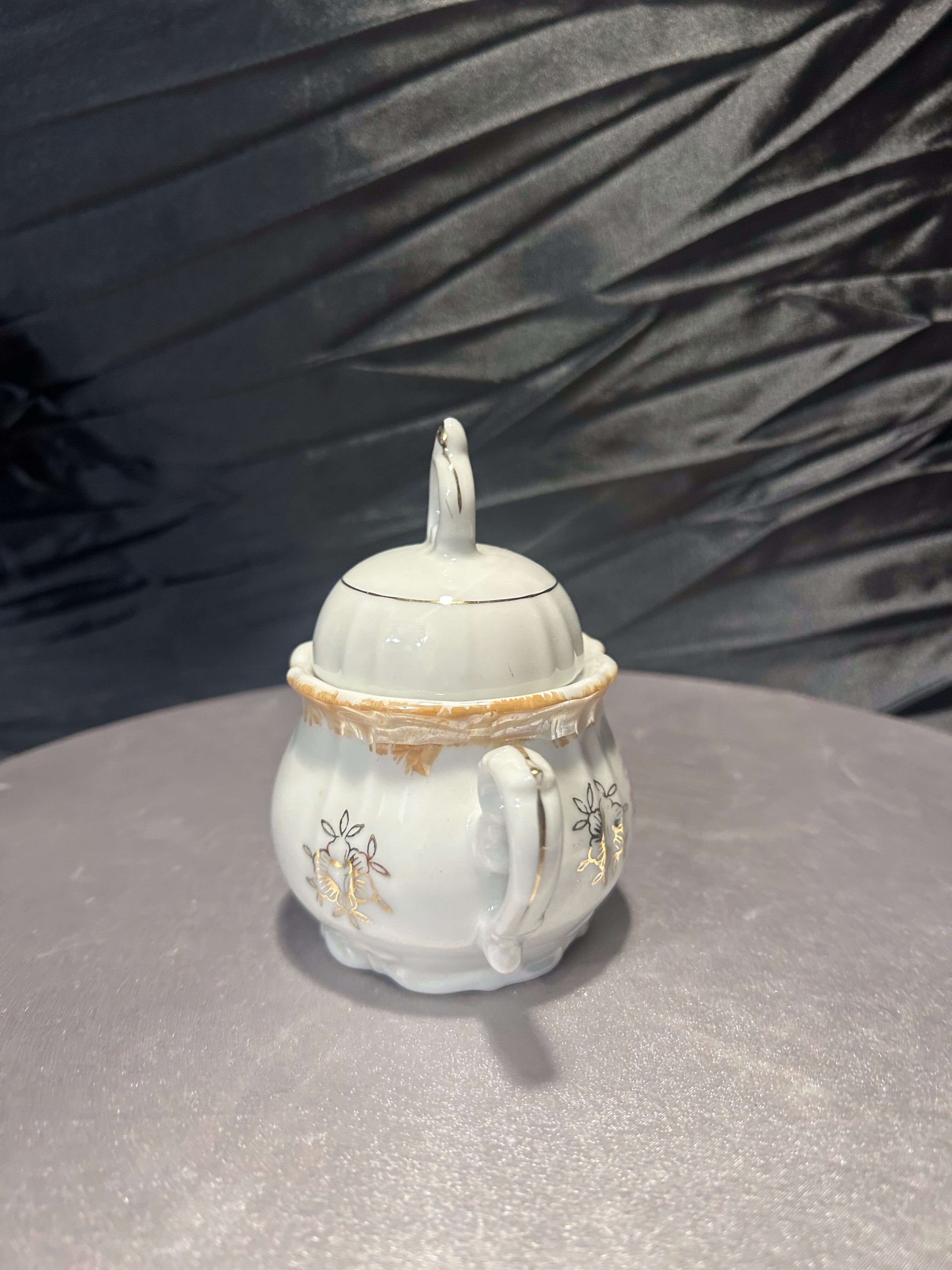Porcelanowa cukiernica sygnowana znakiem Yamato Japan, pochodząca z Japonii. To wyrób z połowy XX wieku, kiedy japońska porcelana była intensywnie eksportowana na rynek zachodni. Delikatne złocenia oraz klasyczna dekoracja w stylu romantycznym z motywem scenki rodzajowej podkreślają jej elegancki charakter.