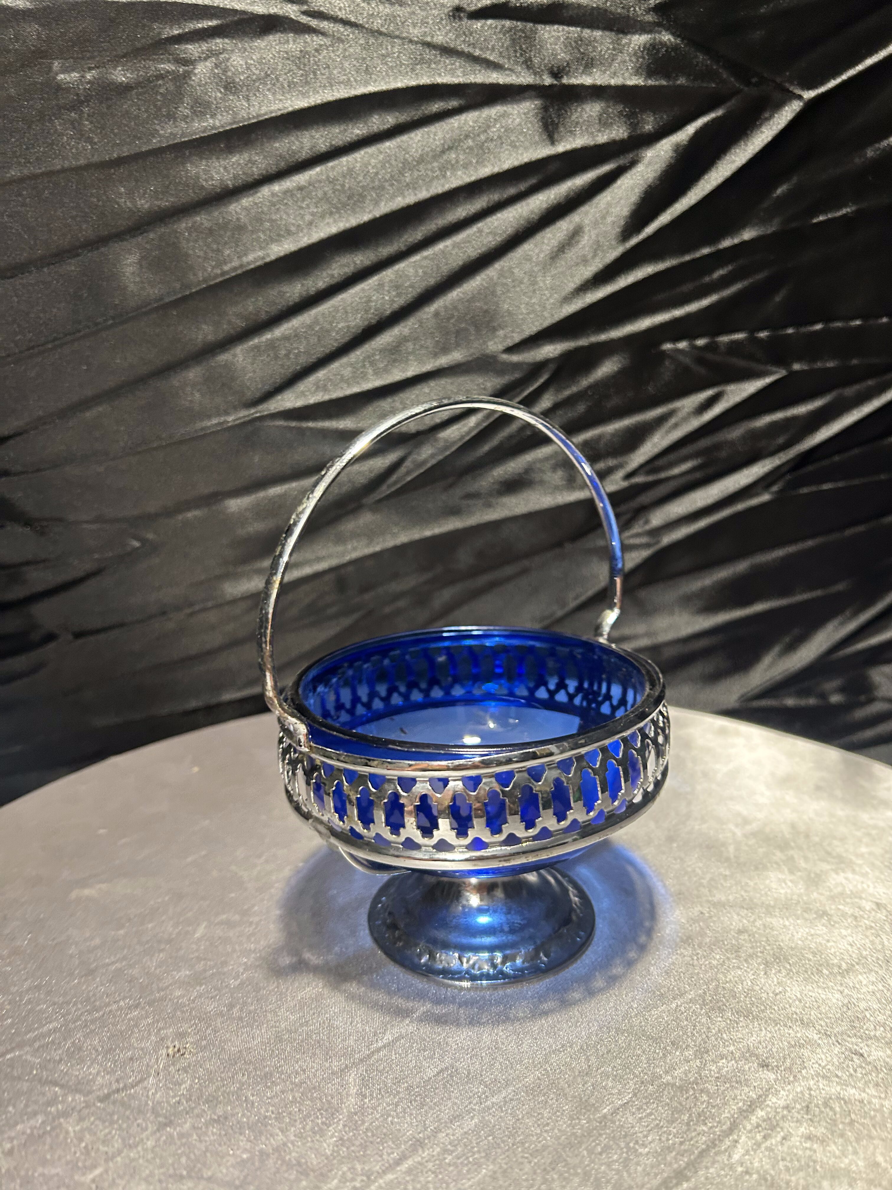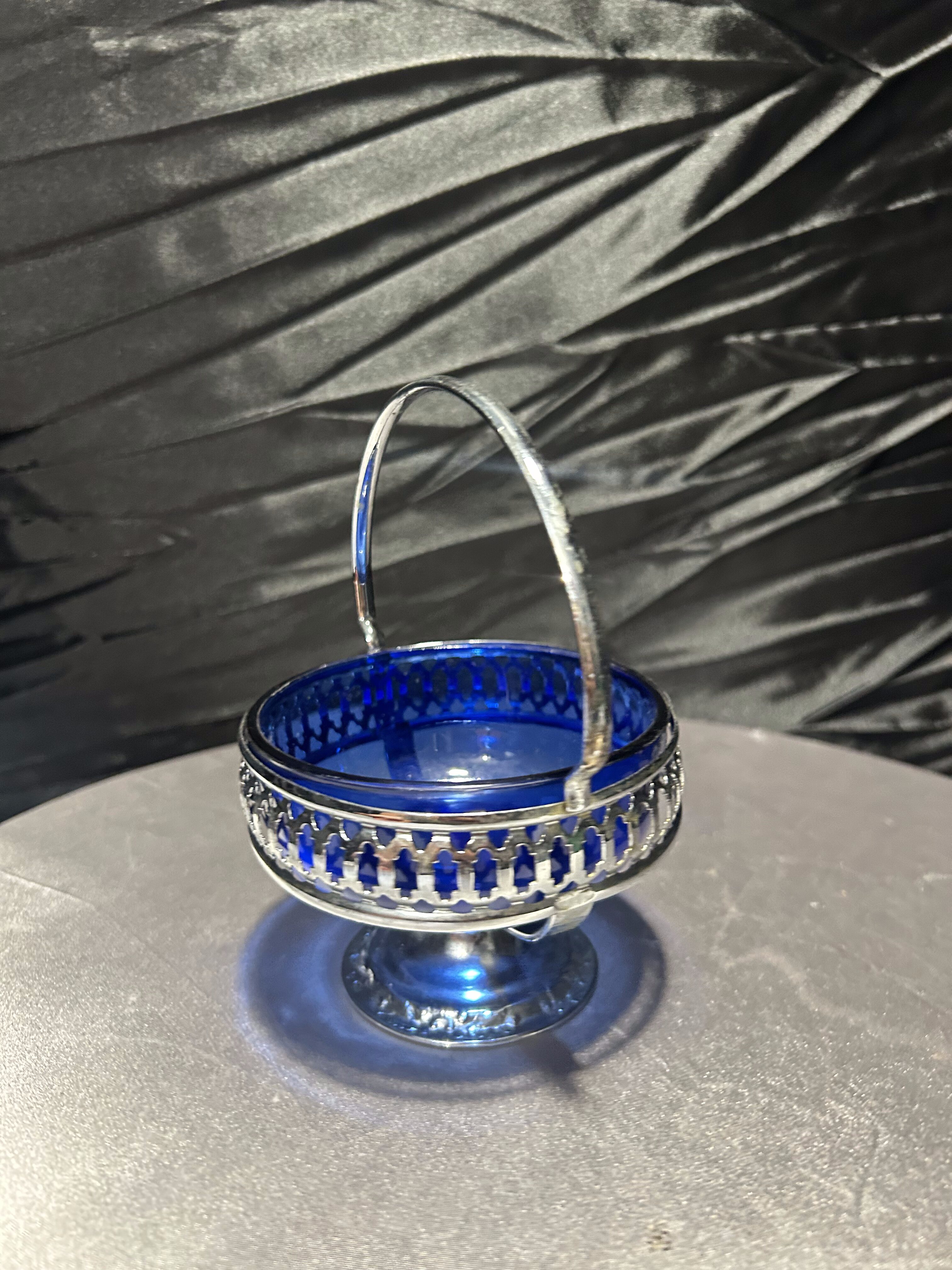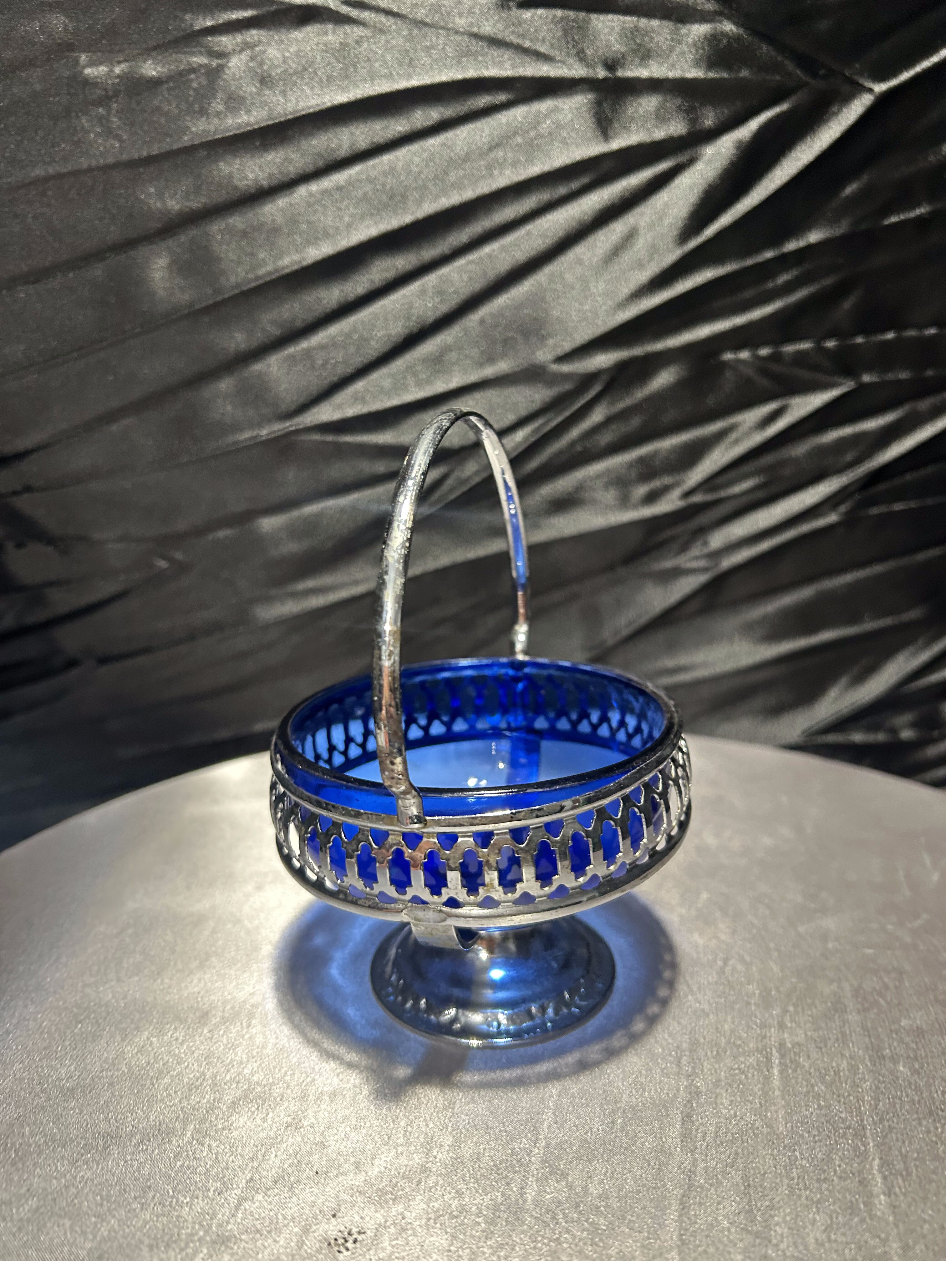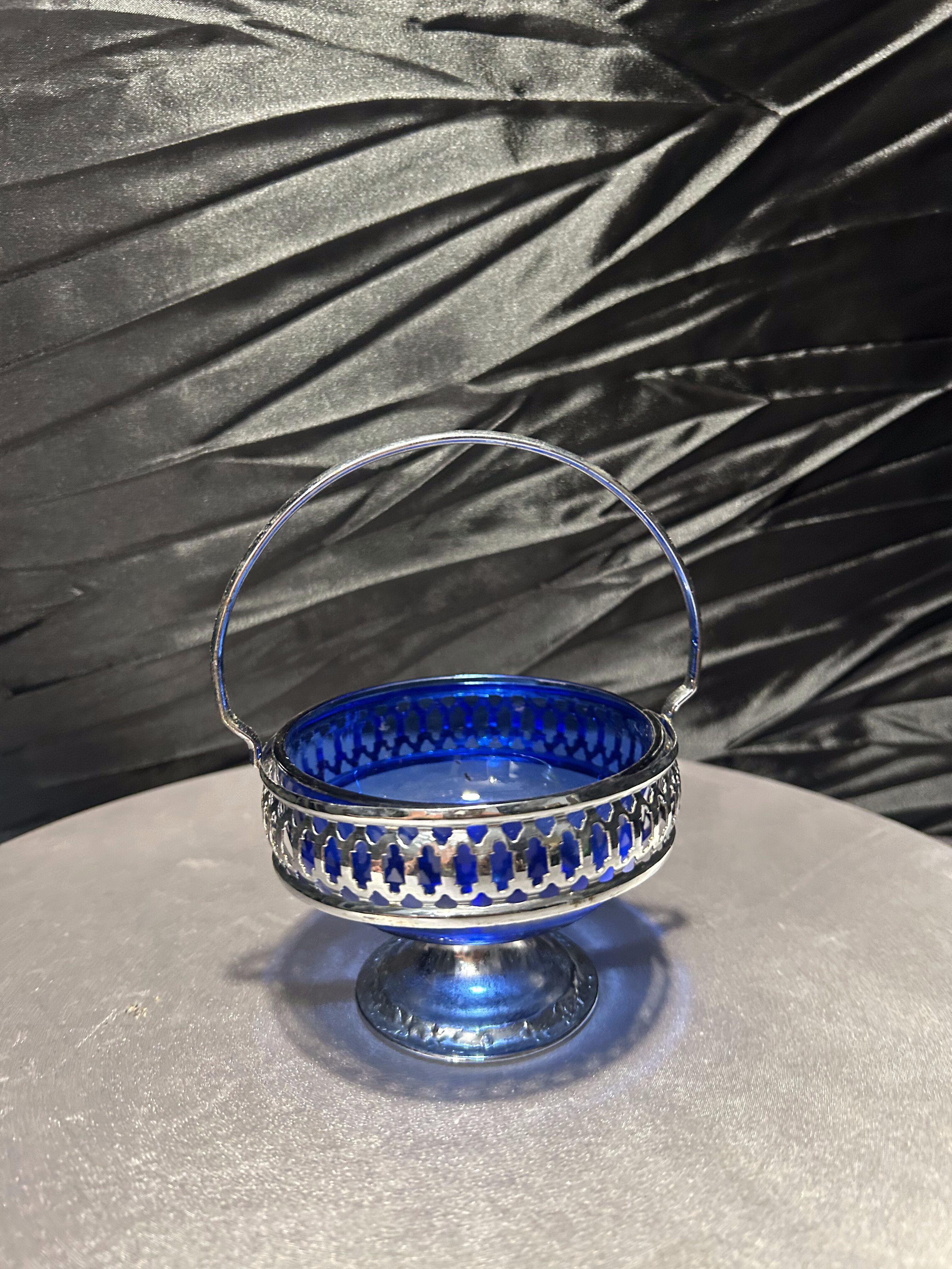 Cukiernica z niebieskiego szkła w srebrnym ażurowym stelażu – styl vintage – 15 cm