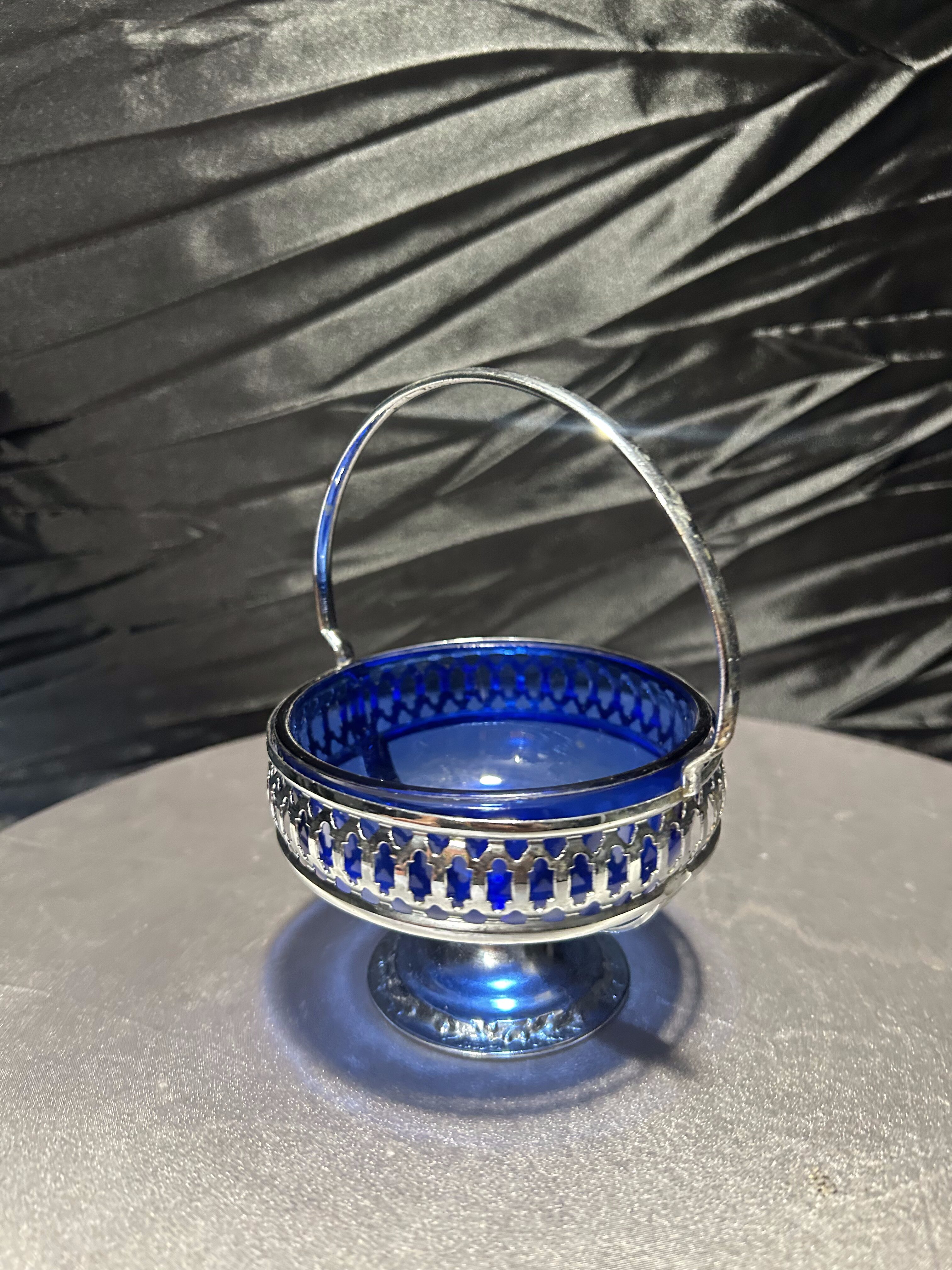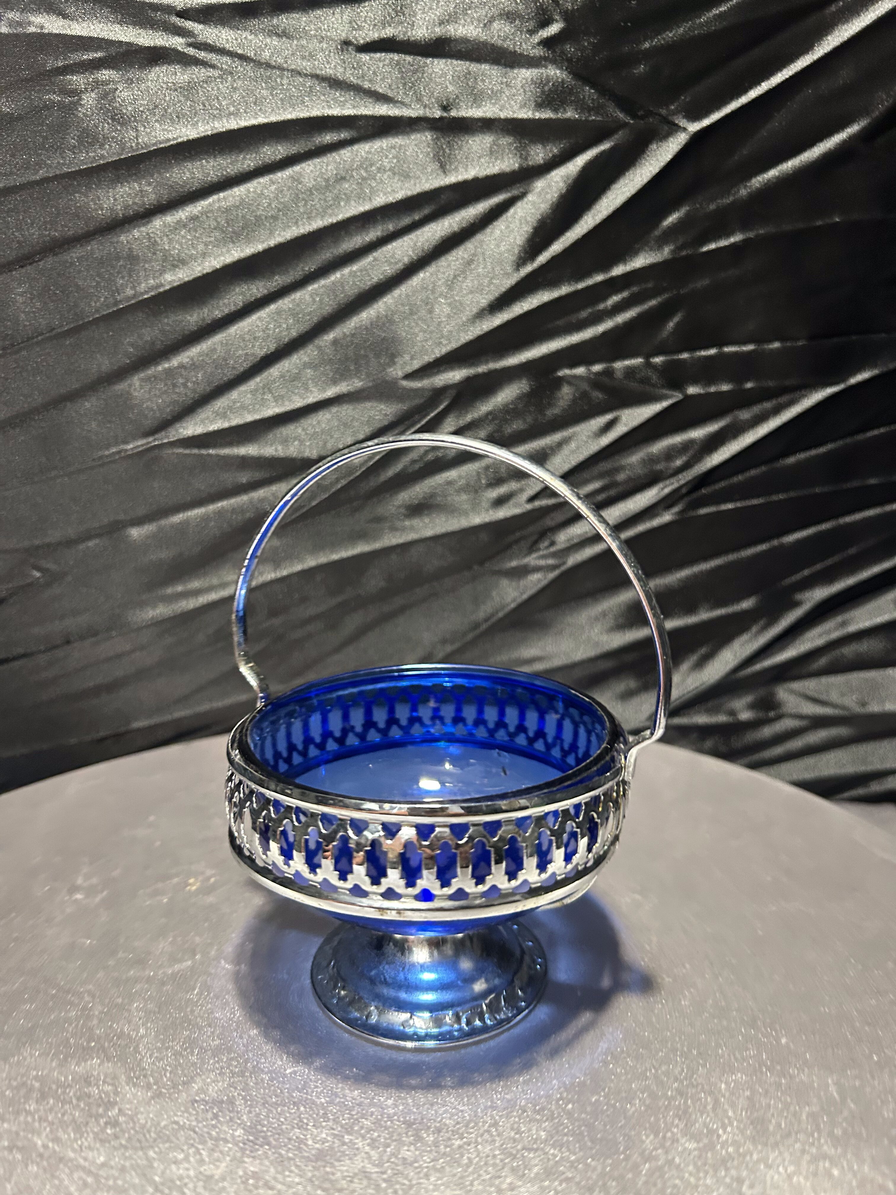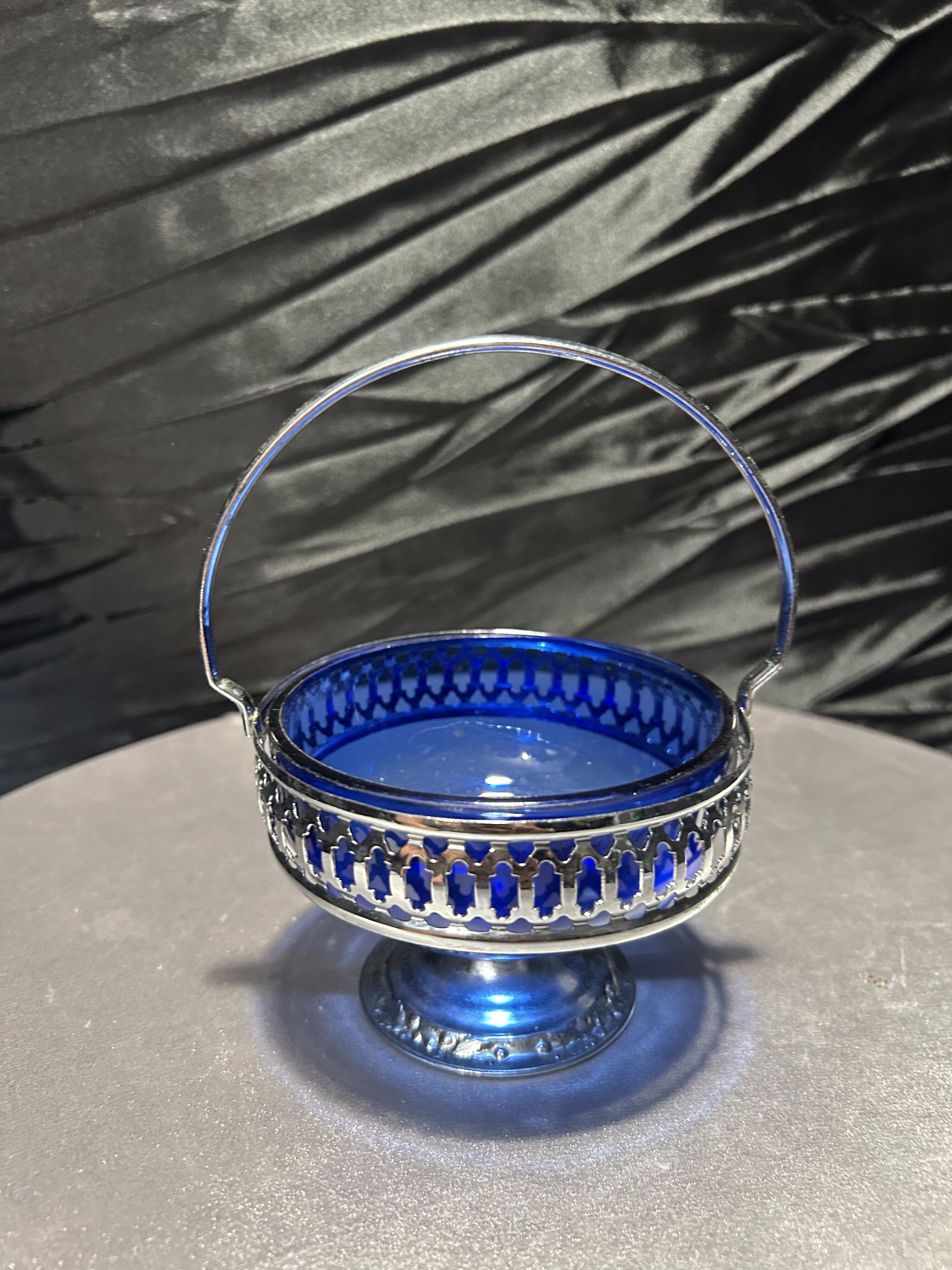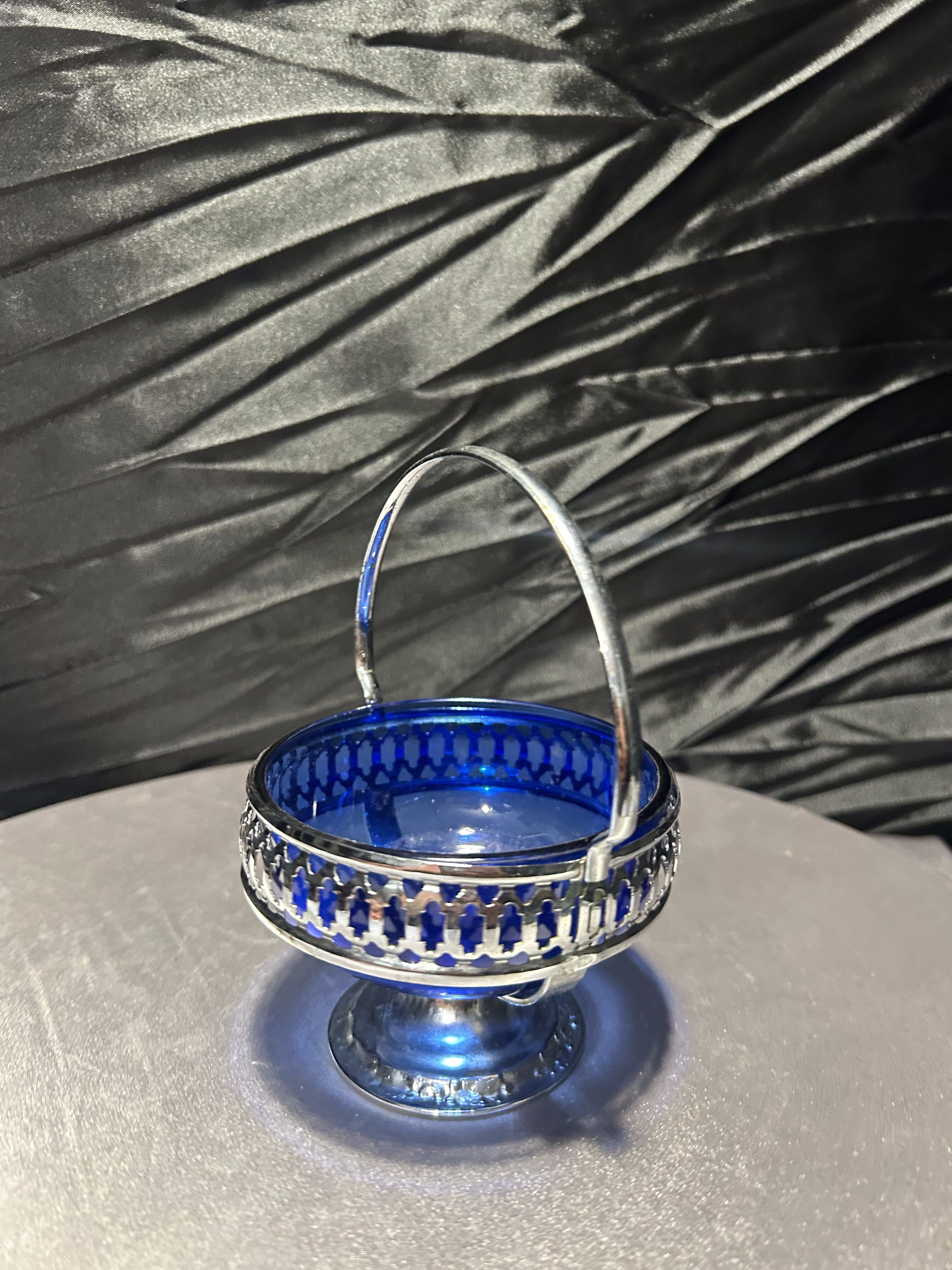Cukiernica z niebieskiego szkła w srebrnym ażurowym stelażu – styl vintage – 15 cm