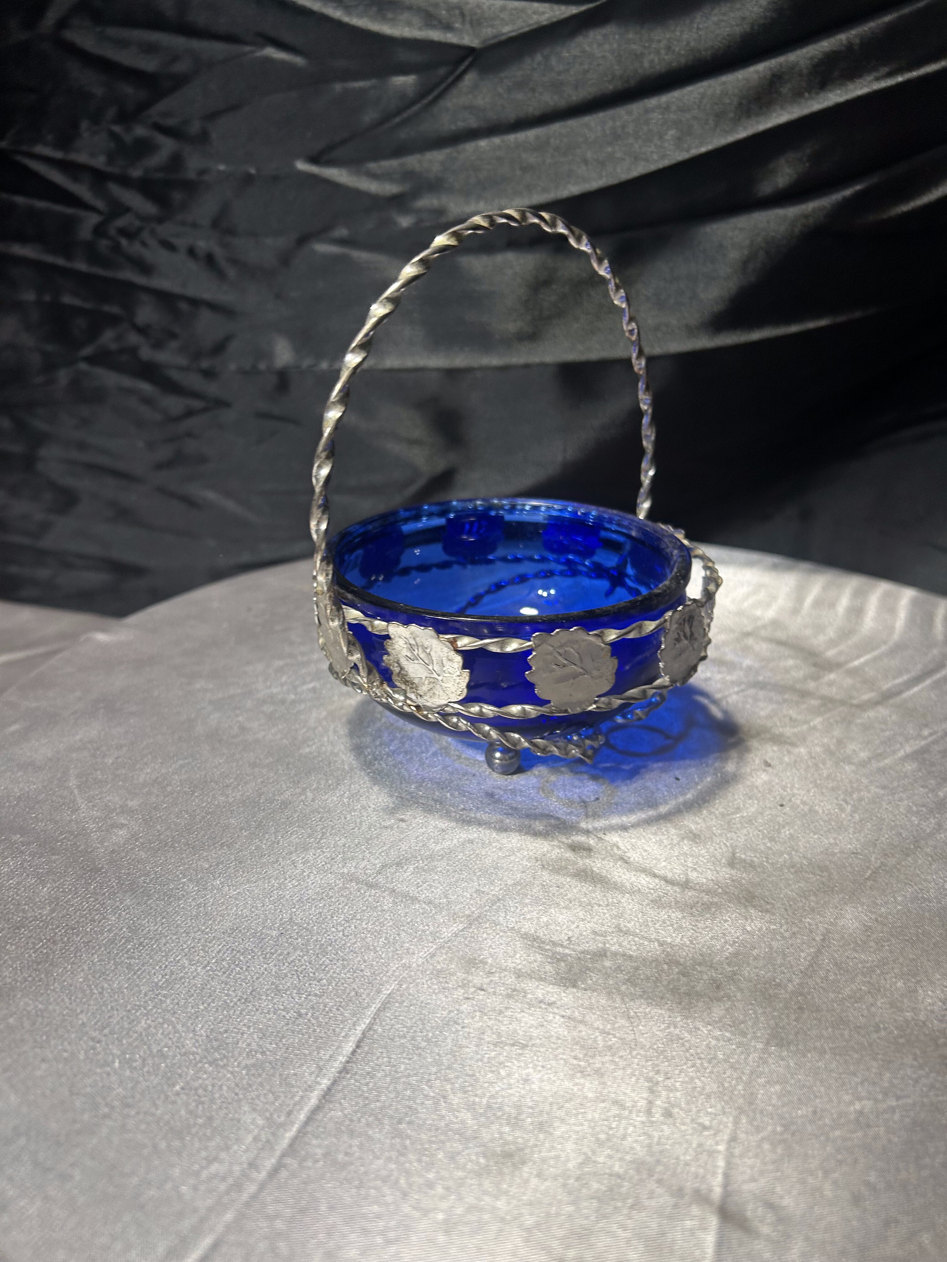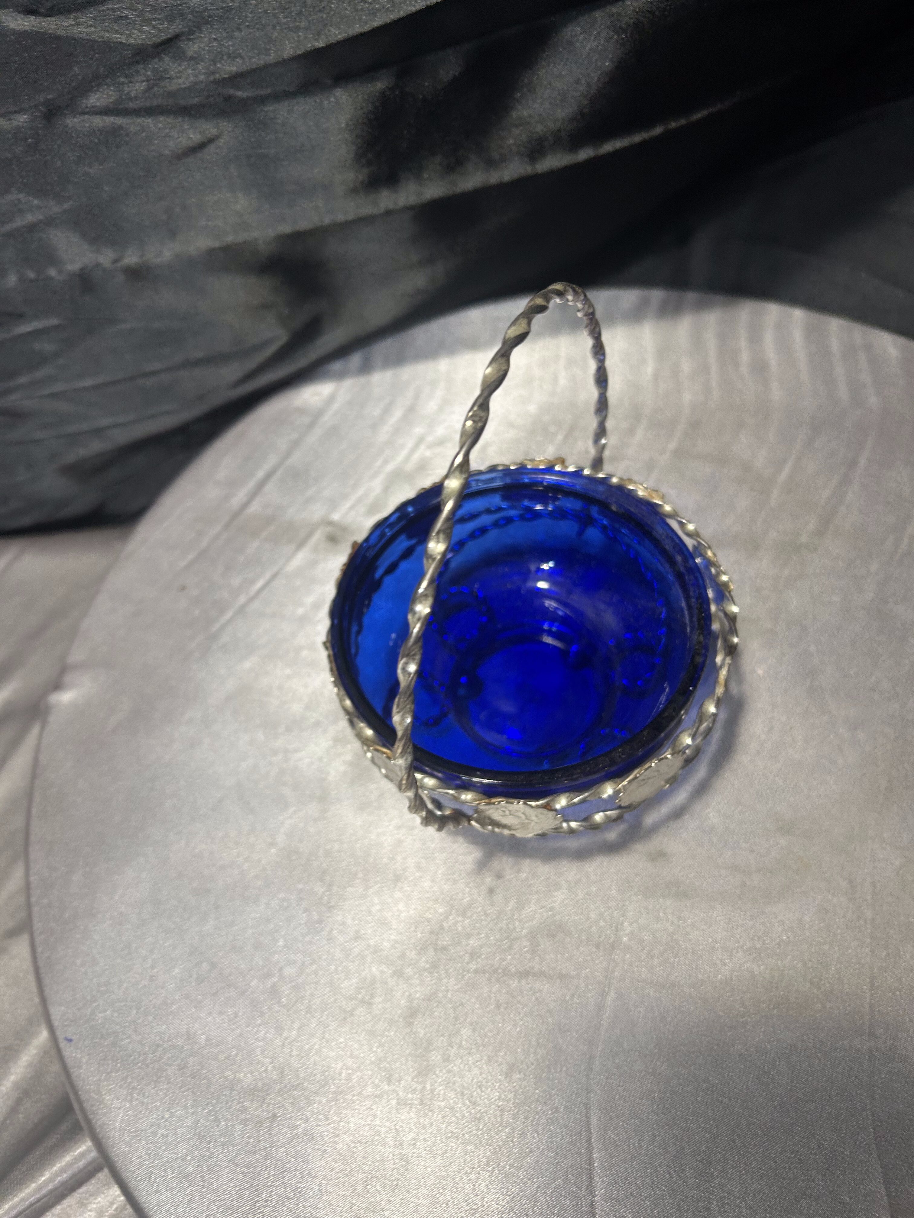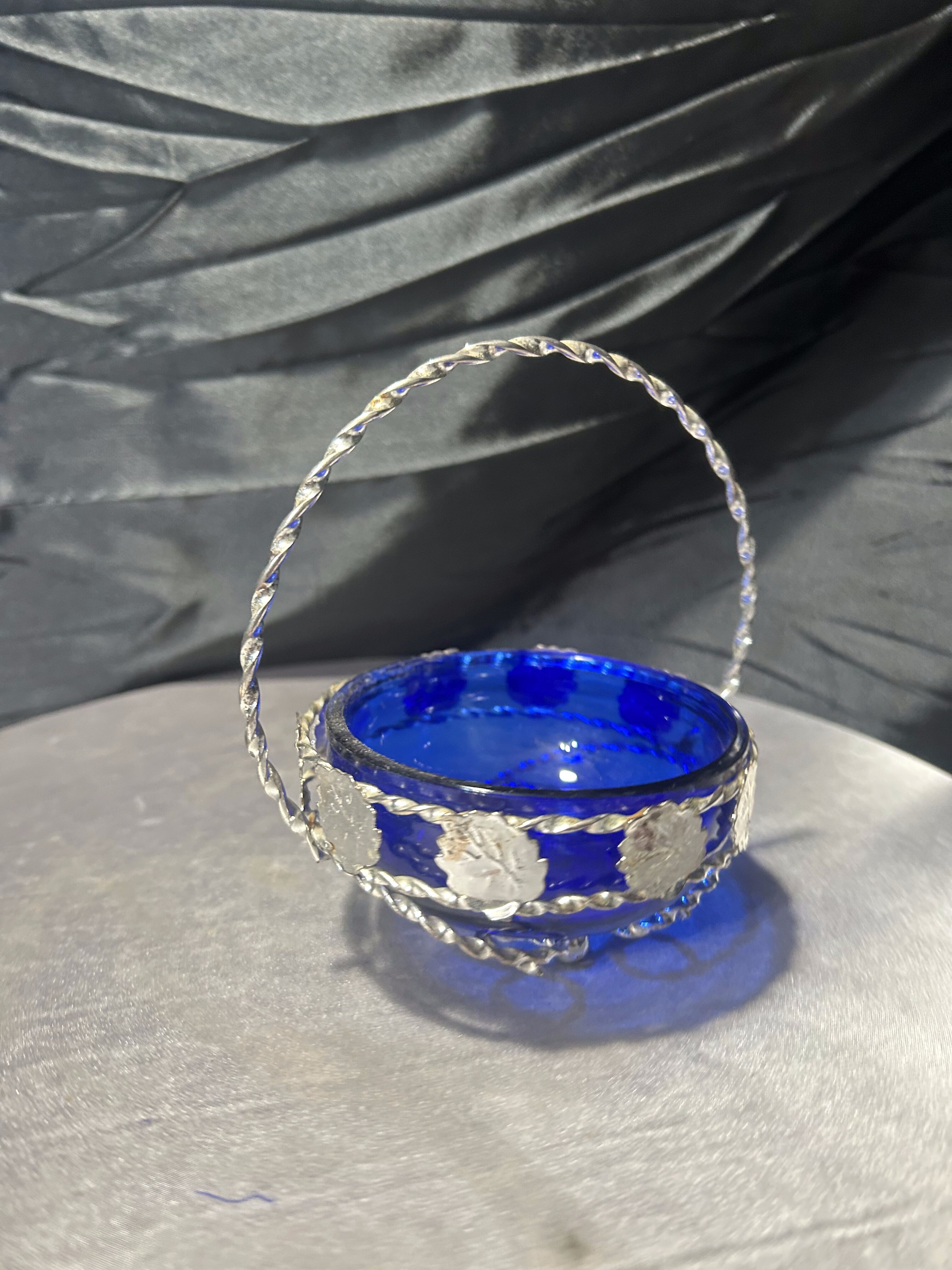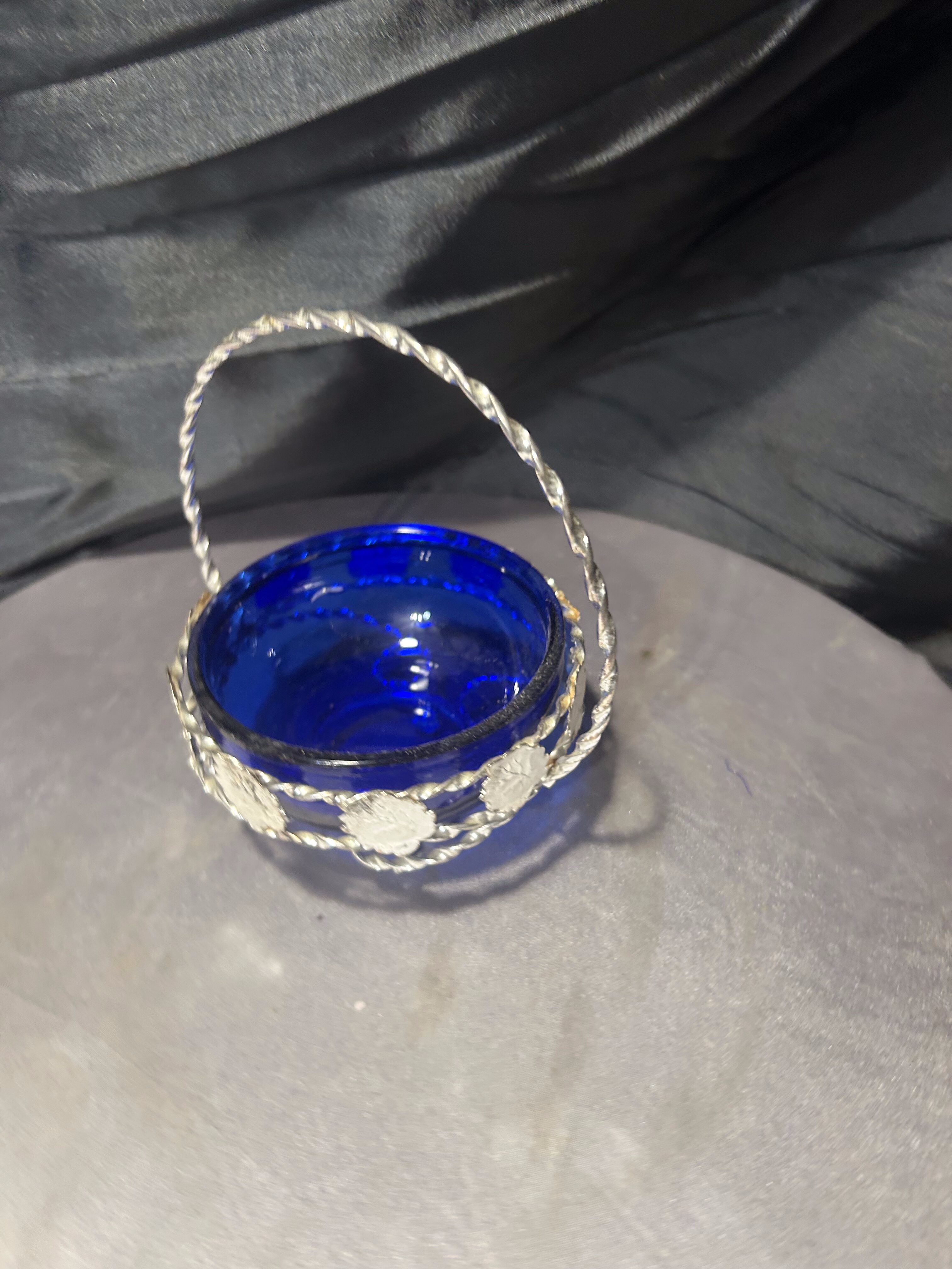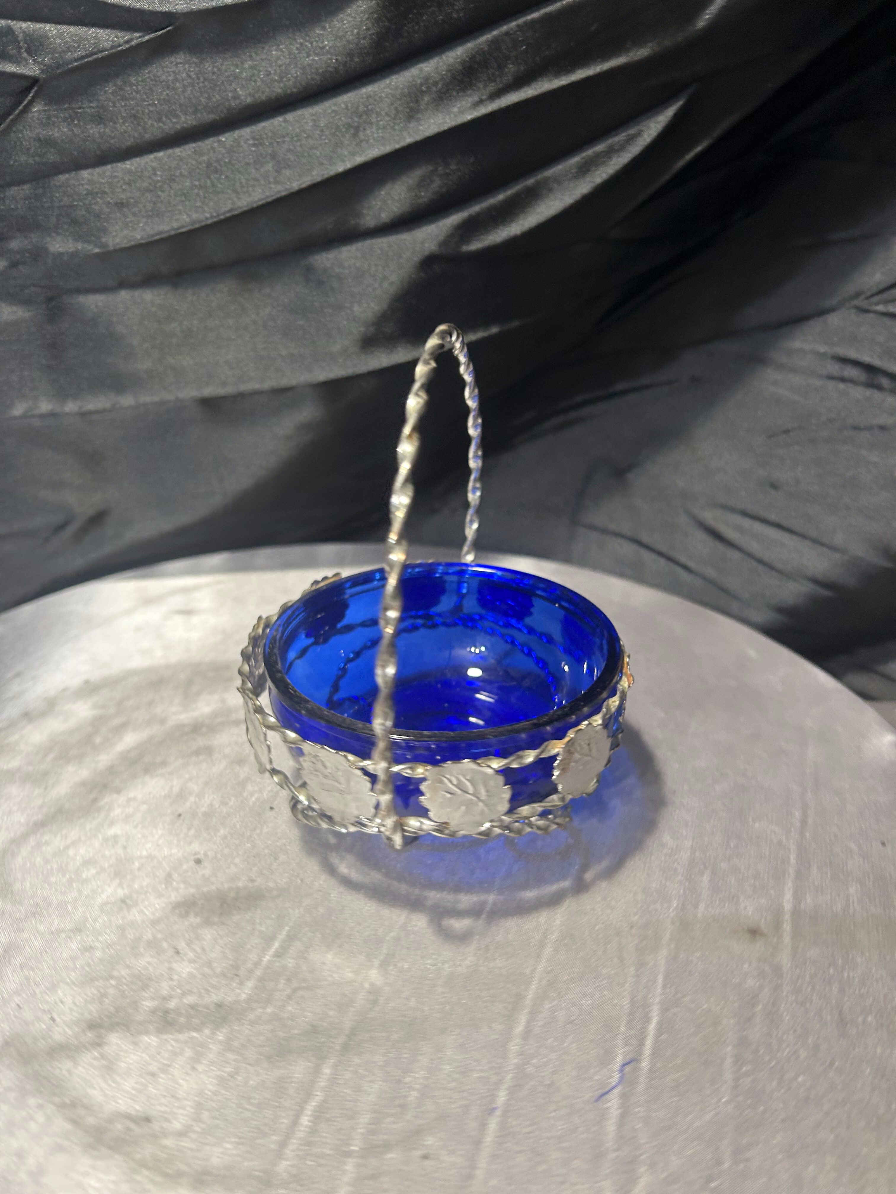 Cukiernica z niebieskiego szkła w srebrnym ażurowym stelażu – styl vintage – 15 cm