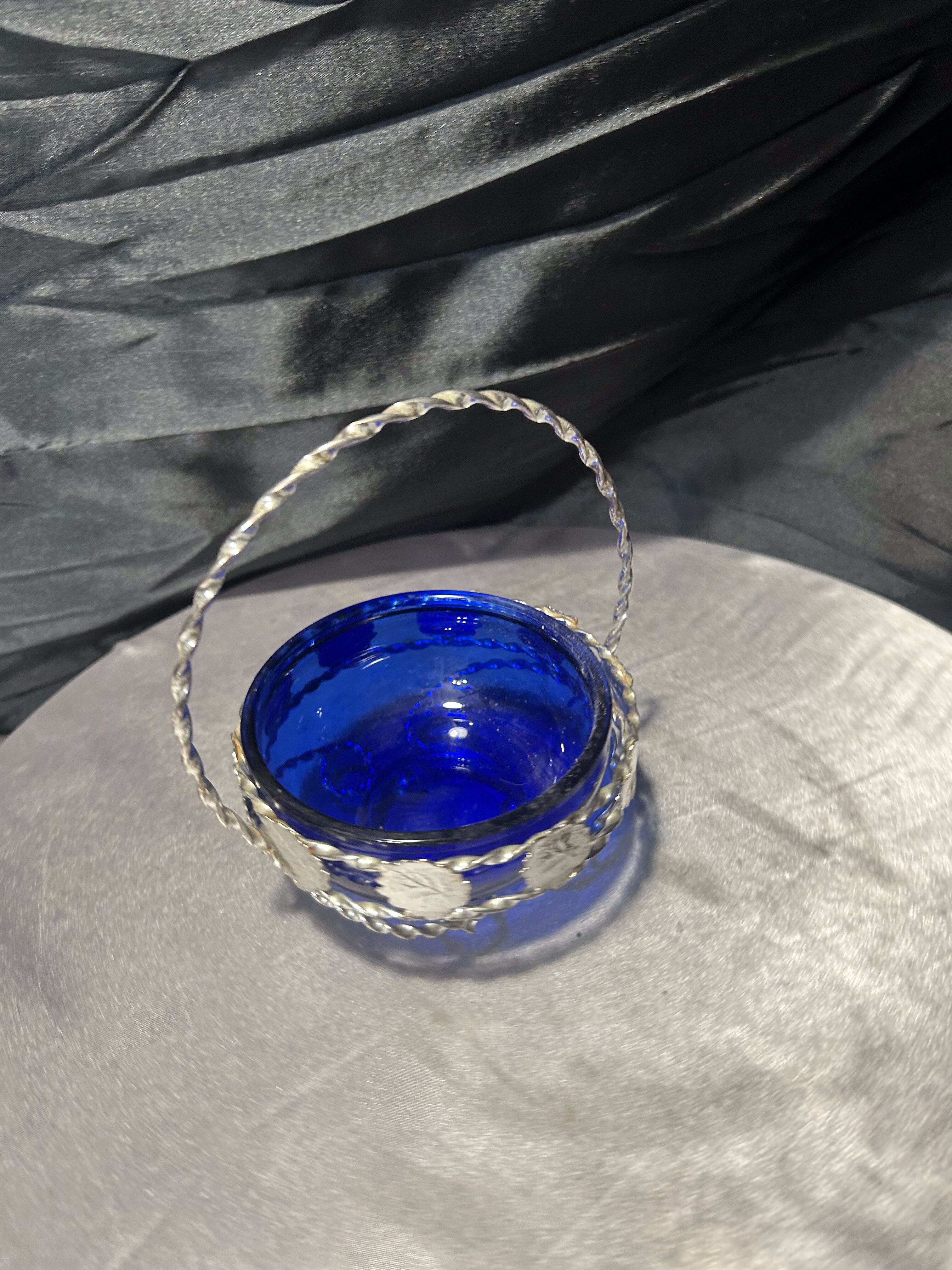 Cukiernica ze szkła kobaltowego w srebrnym koszyczku – dekoracyjny stelaż z motywem liści
