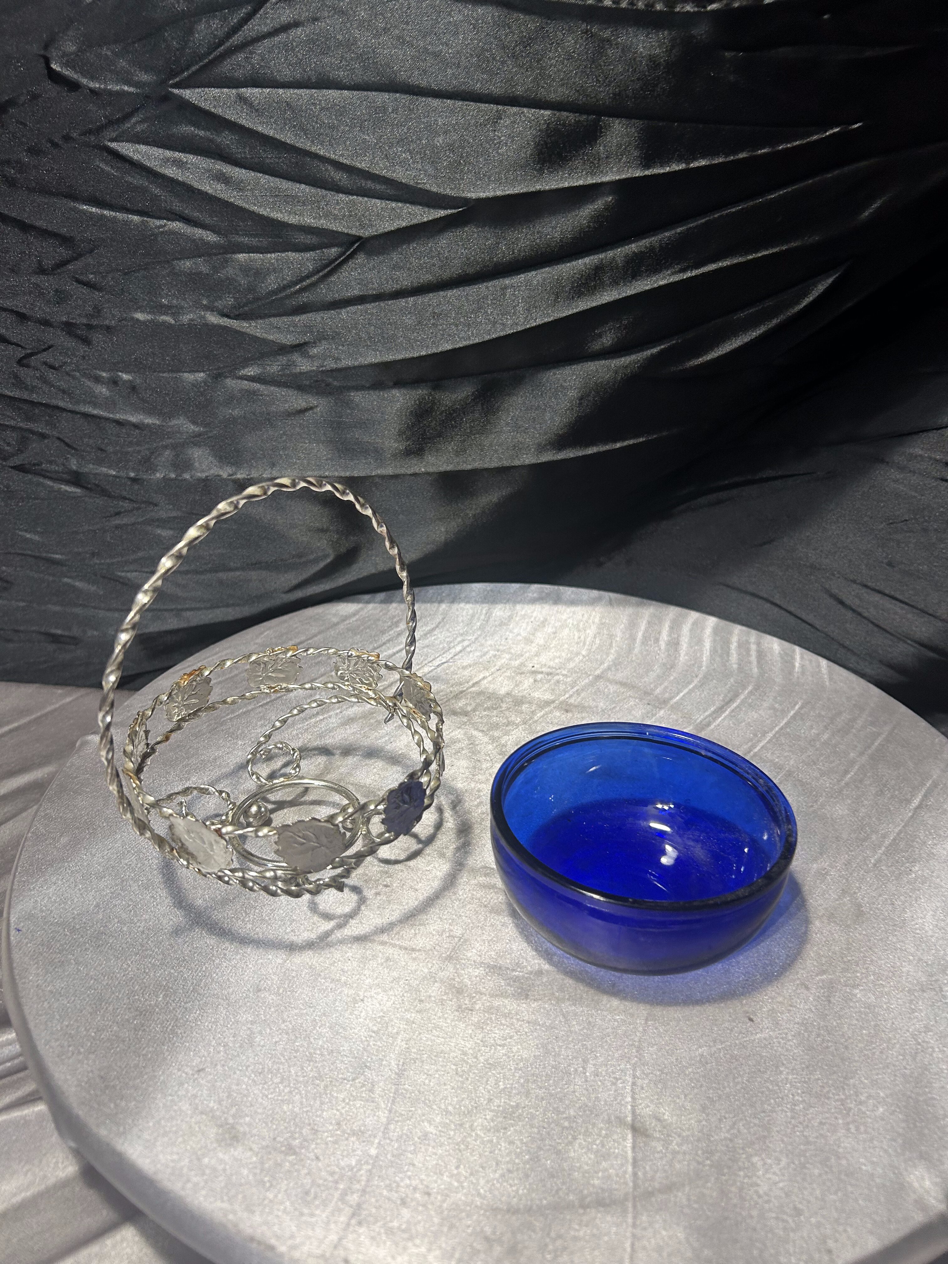 - Cukiernica ze szkła kobaltowego w srebrnym koszyczku – dekoracyjny stelaż z motywem liści