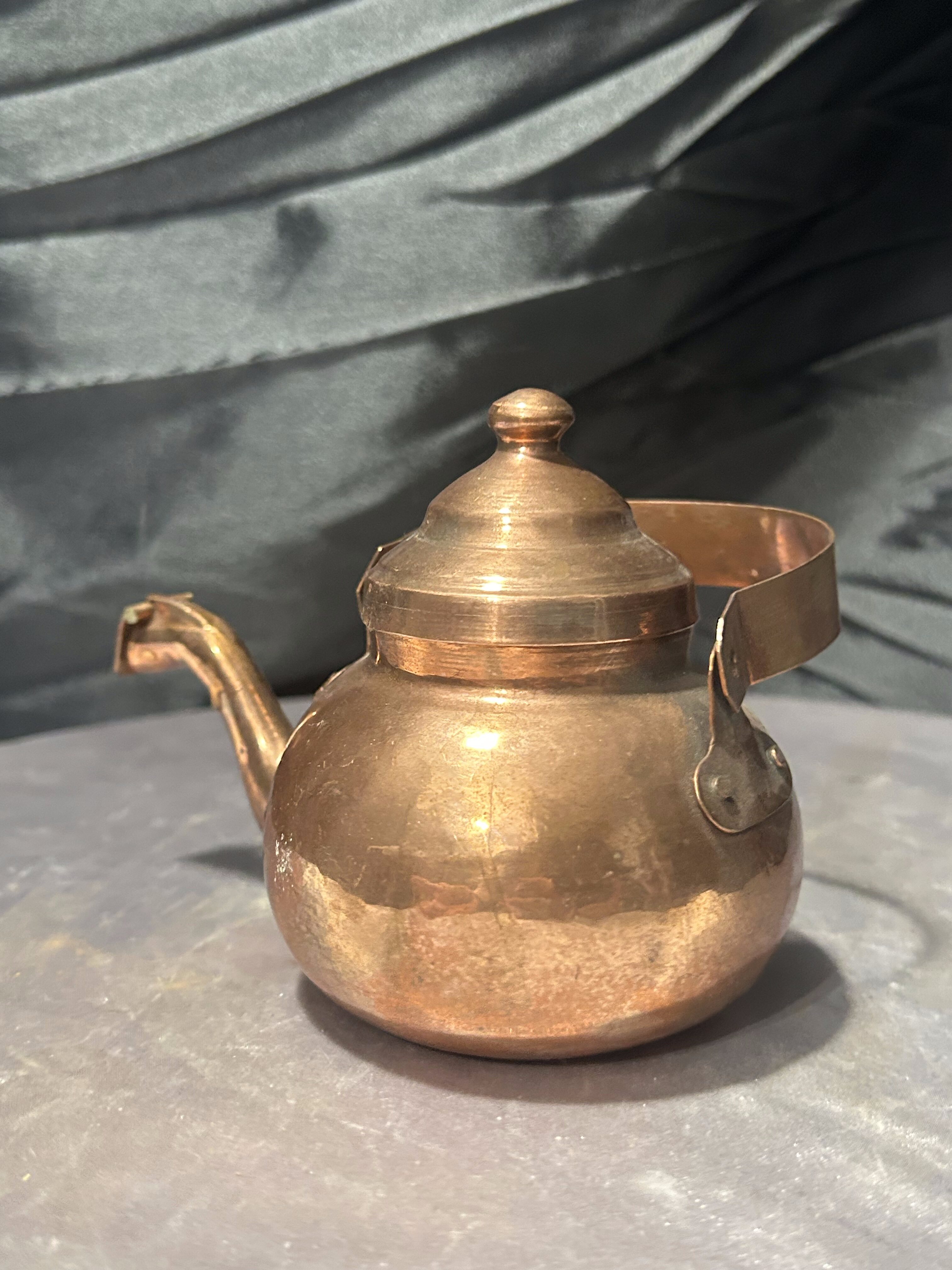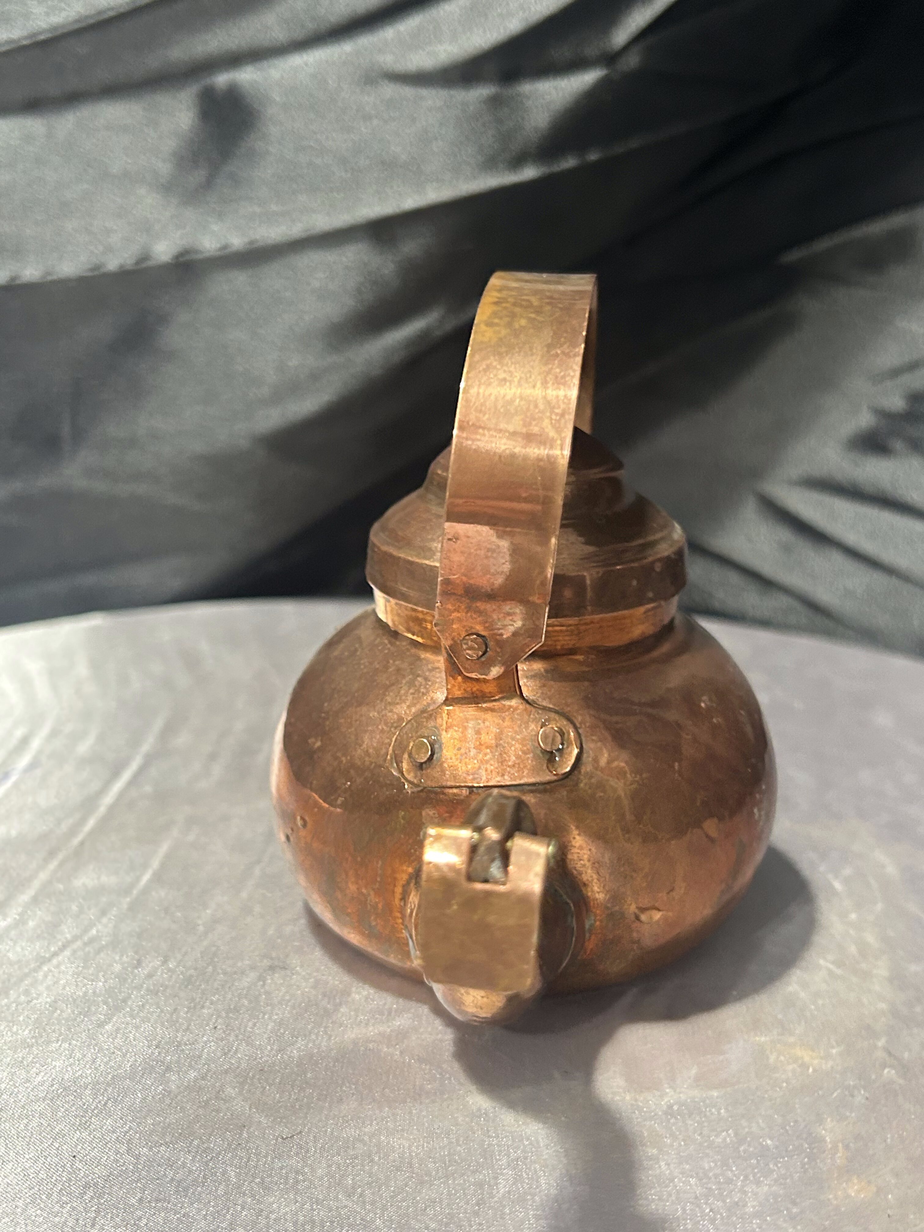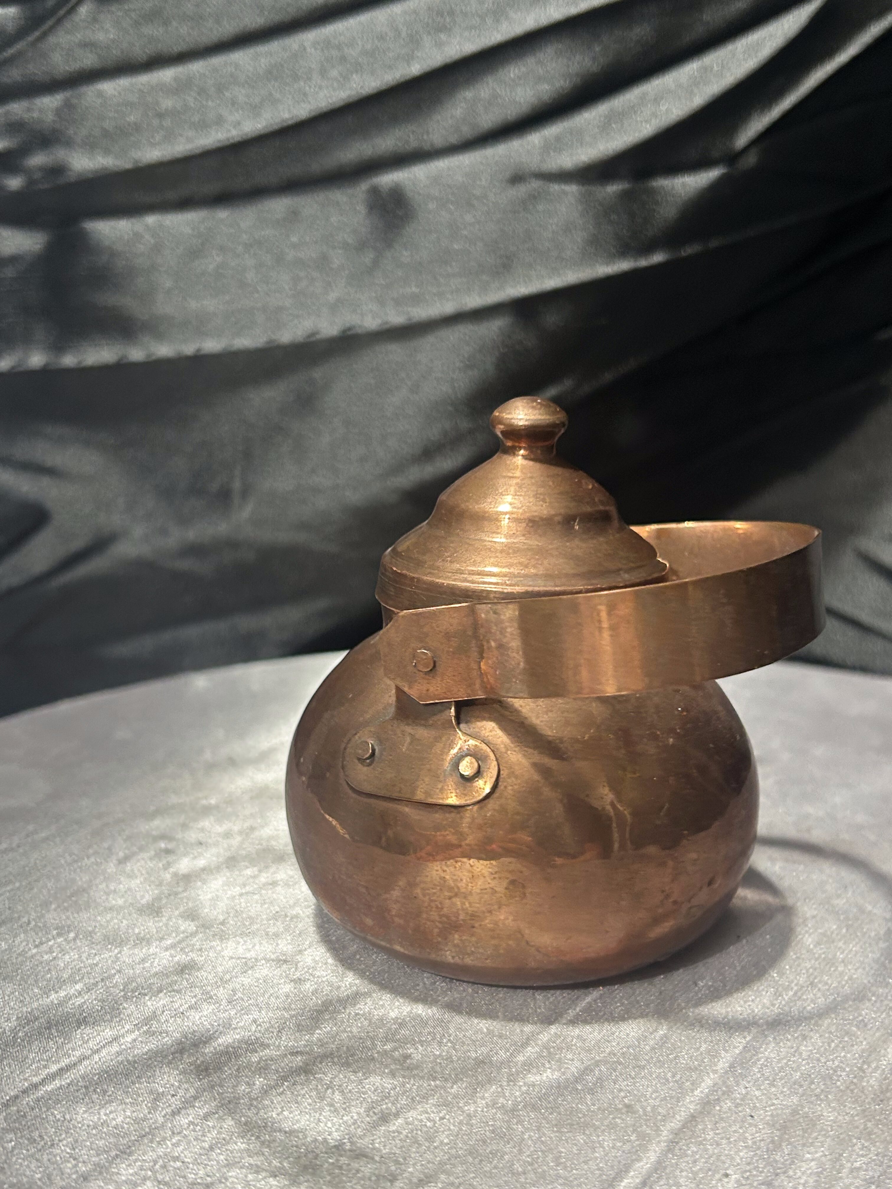 Niewielki czajnik wykonany z miedzi, zachowany w bardzo dobrym stanie. Prosta, klasyczna forma z wyraźnie zarysowanym dzióbkiem i pokrywką sprawia, że jest to przedmiot zarówno praktyczny, jak i estetyczny. Idealny do mniejszych porcji wody lub jako element kuchni w stylu rustykalnym, vintage czy skandynawskim.