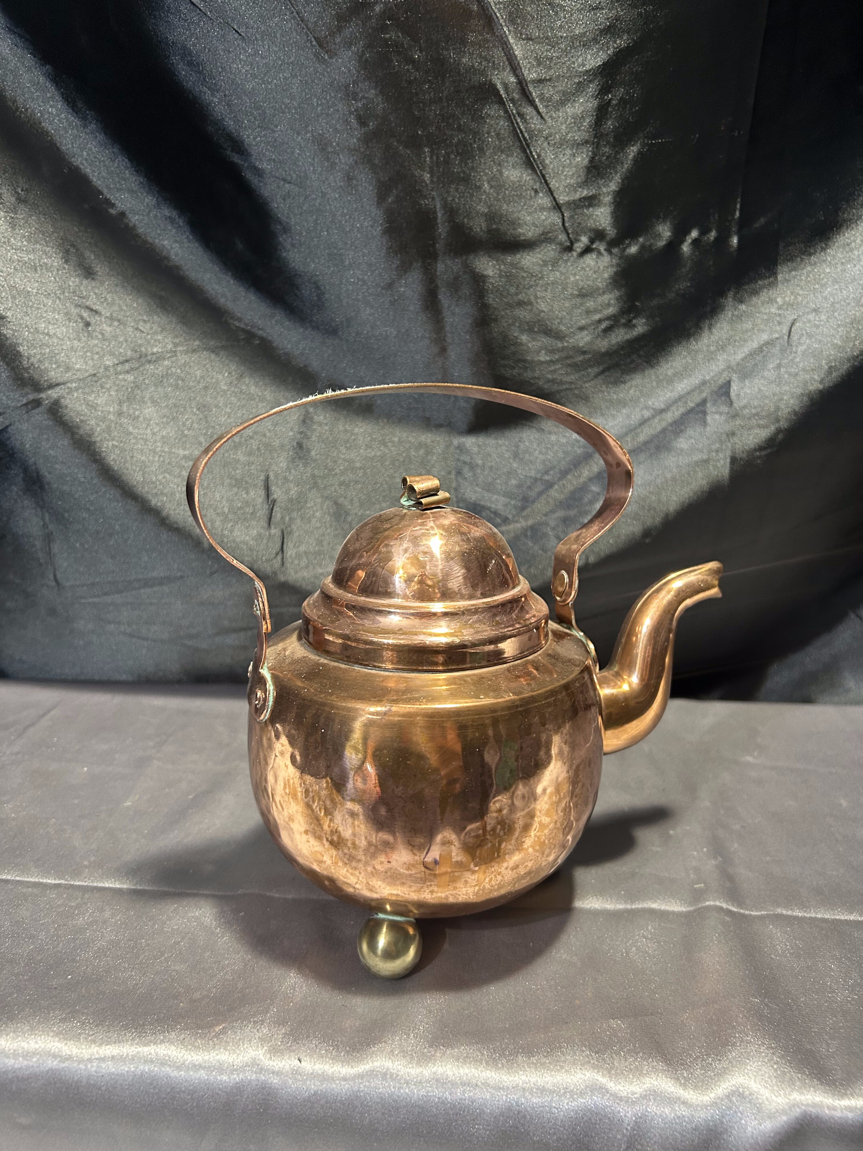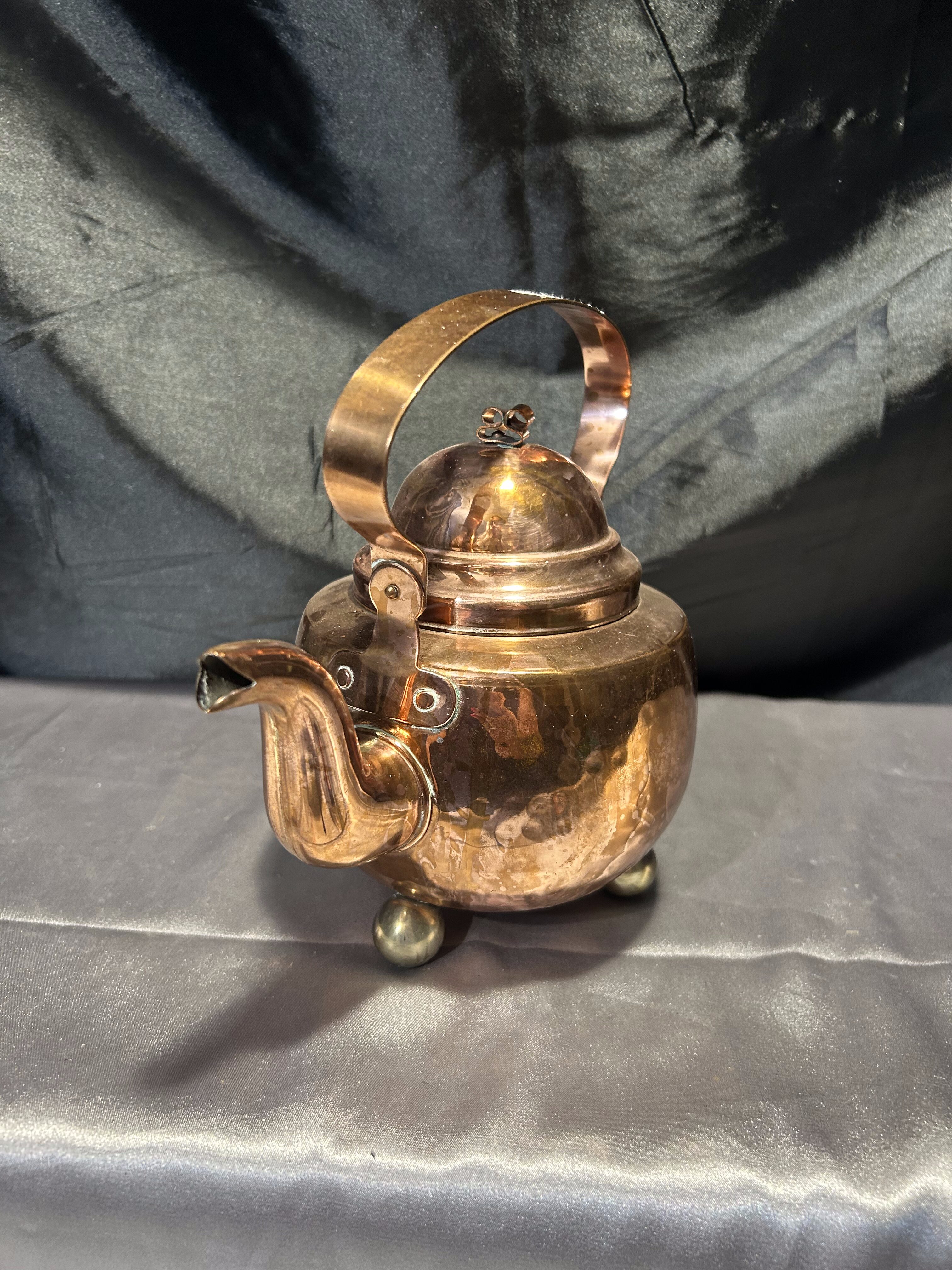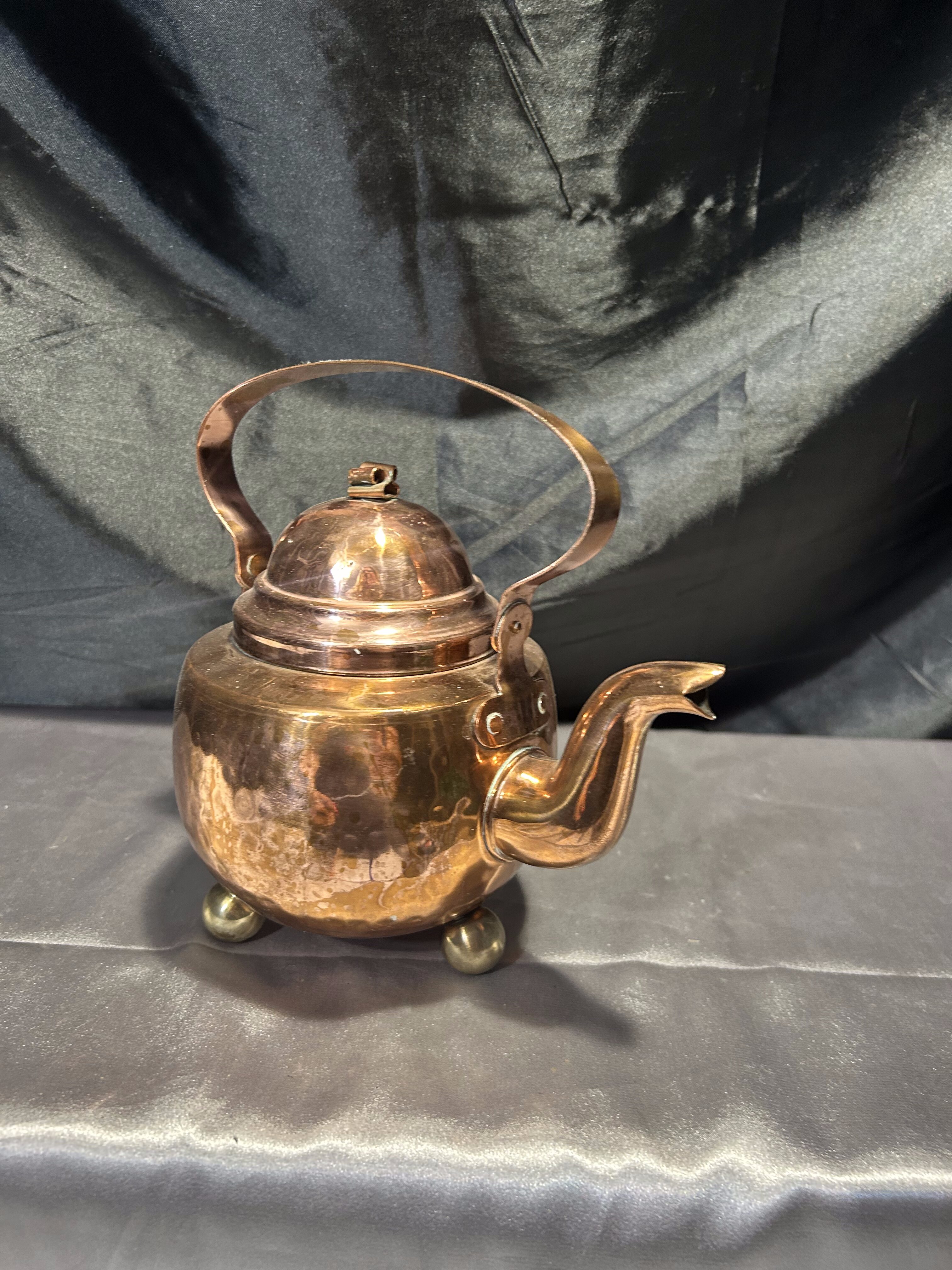 Na sprzedaż wyjątkowy miedziany czajnik osadzony na trzech dekoracyjnych, kulistych nóżkach. Klasyczna forma z pięknie wyprofilowanym uchwytem i pokrywką. Czajnik jest w pełni szczelny, a jego wnętrze zachowane w oryginalnym, nienaruszonym stanie – wygląda jak nowe.