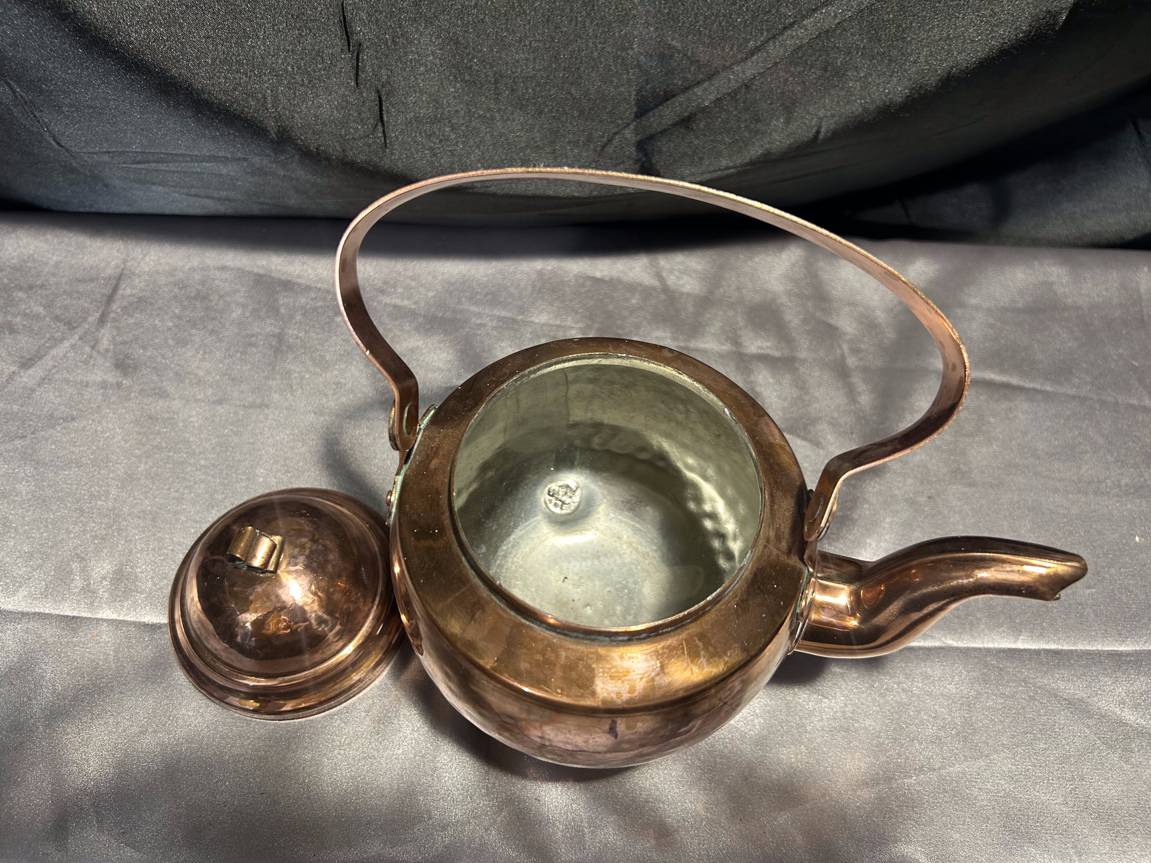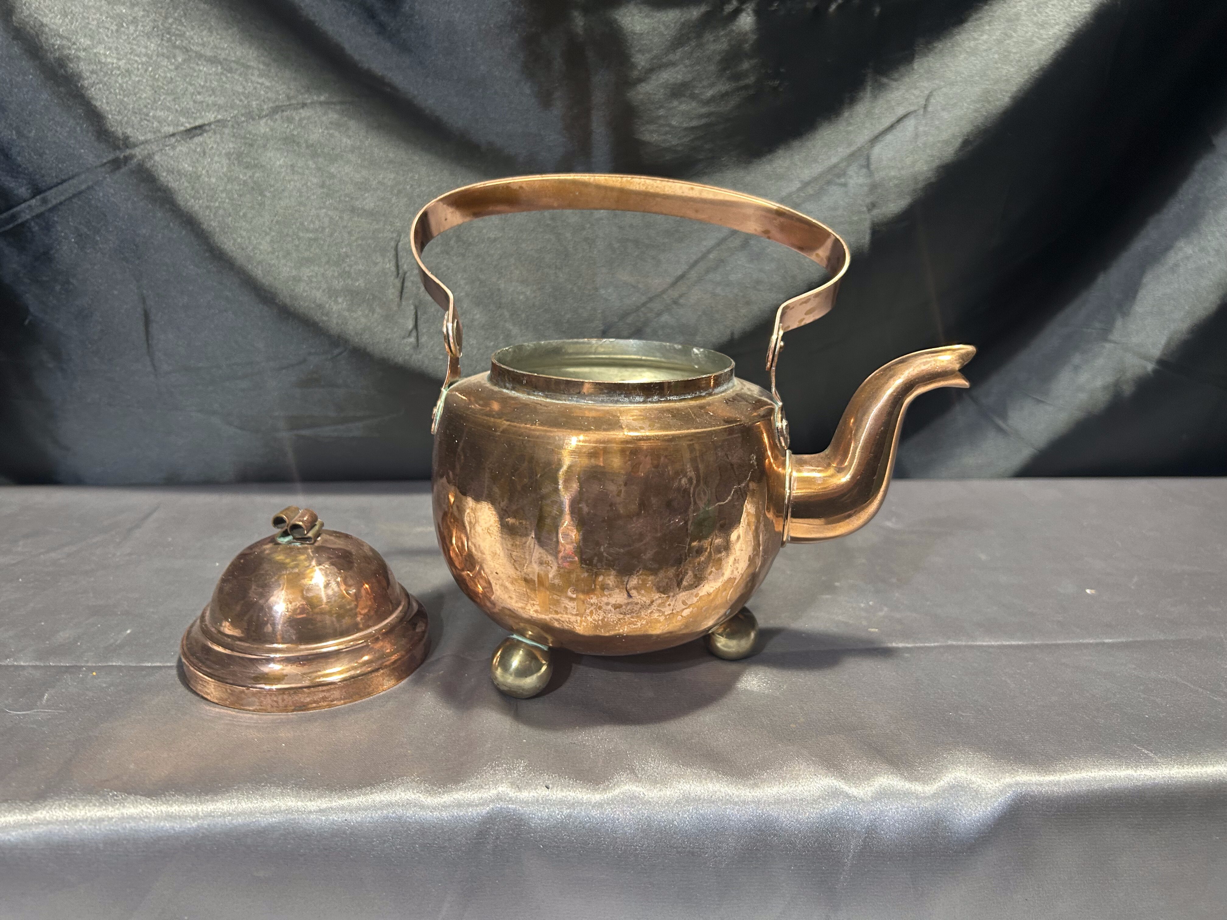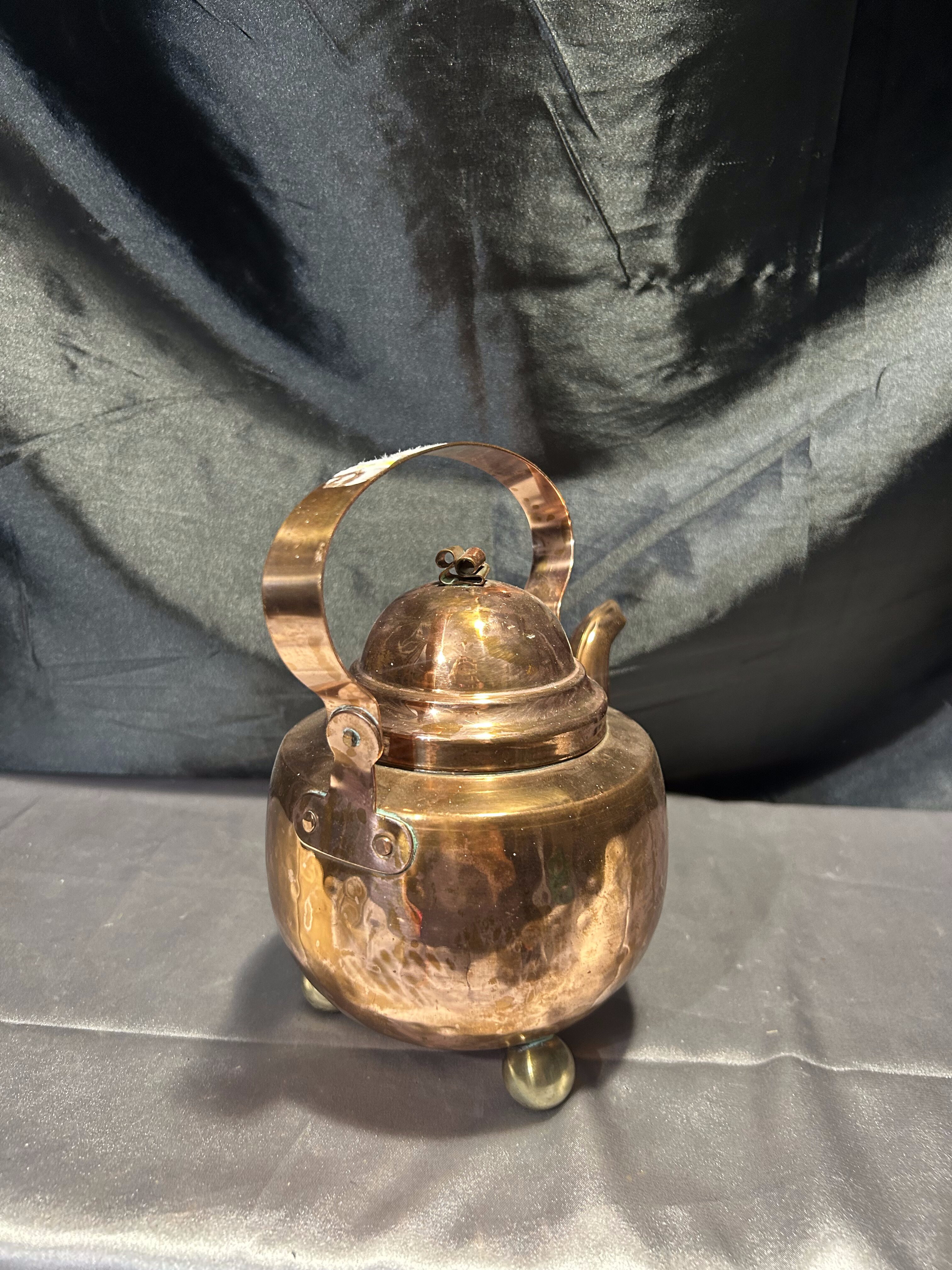 Na sprzedaż wyjątkowy miedziany czajnik osadzony na trzech dekoracyjnych, kulistych nóżkach. Klasyczna forma z pięknie wyprofilowanym uchwytem i pokrywką. Czajnik jest w pełni szczelny, a jego wnętrze zachowane w oryginalnym, nienaruszonym stanie – wygląda jak nowe.