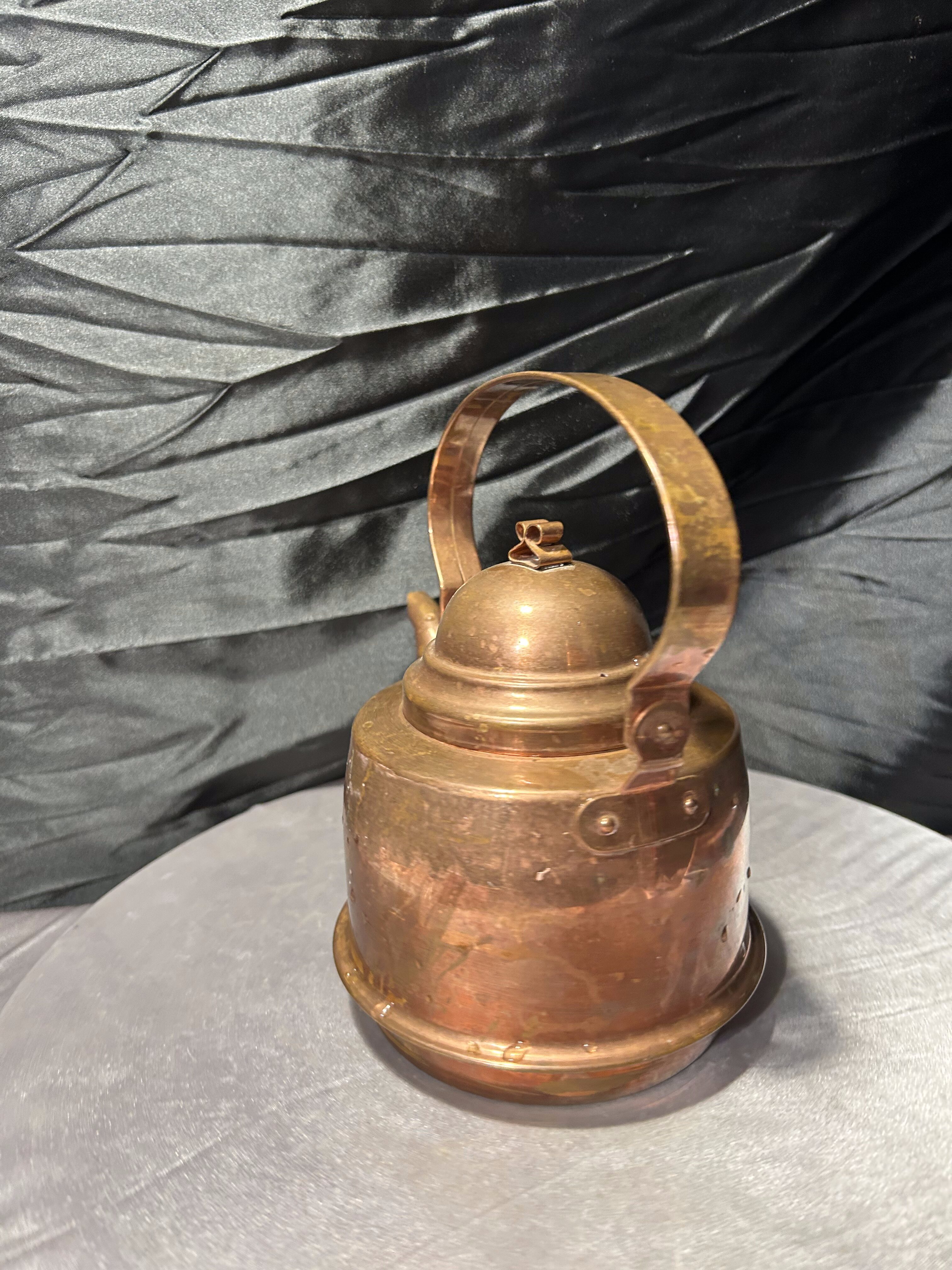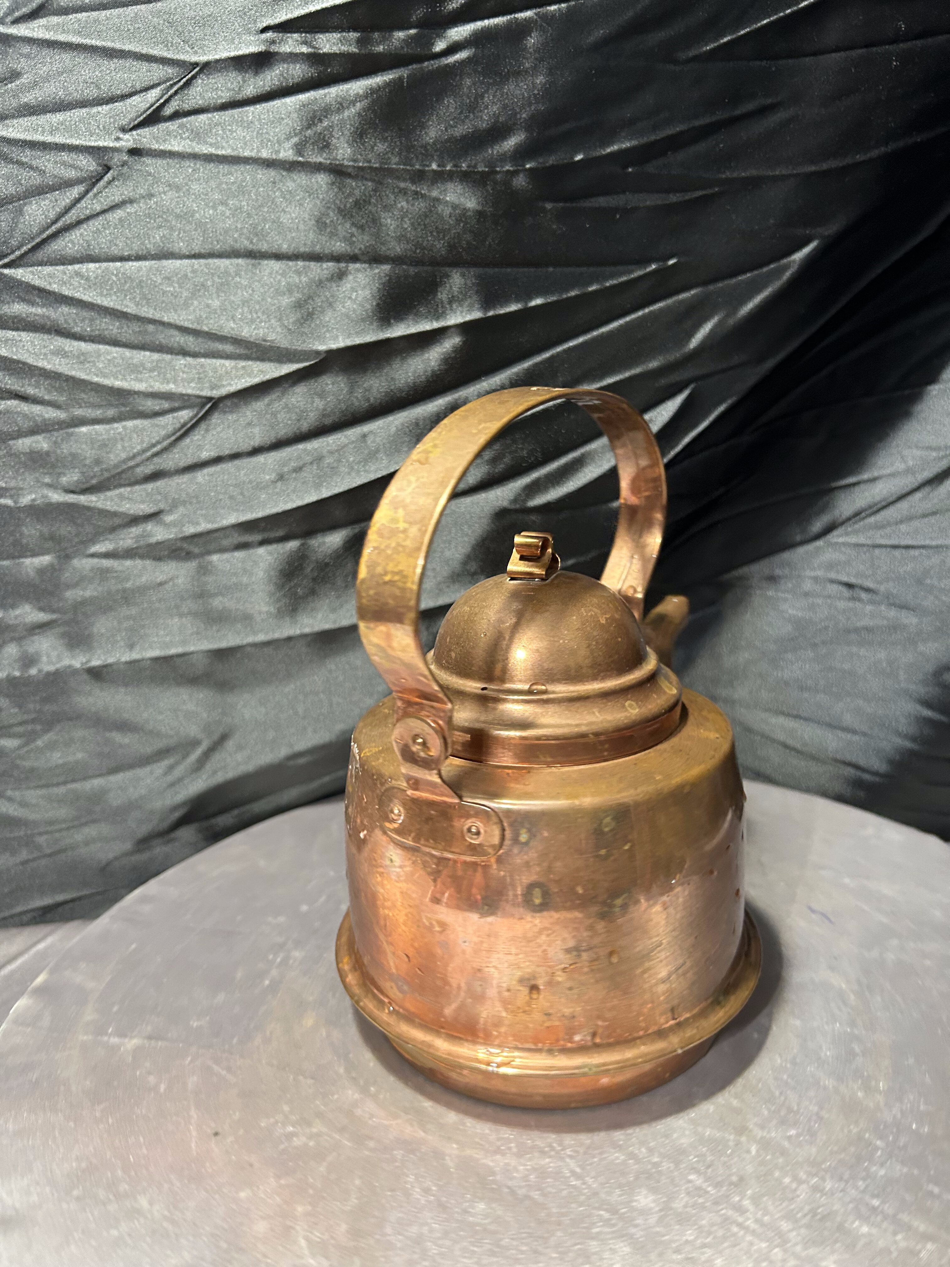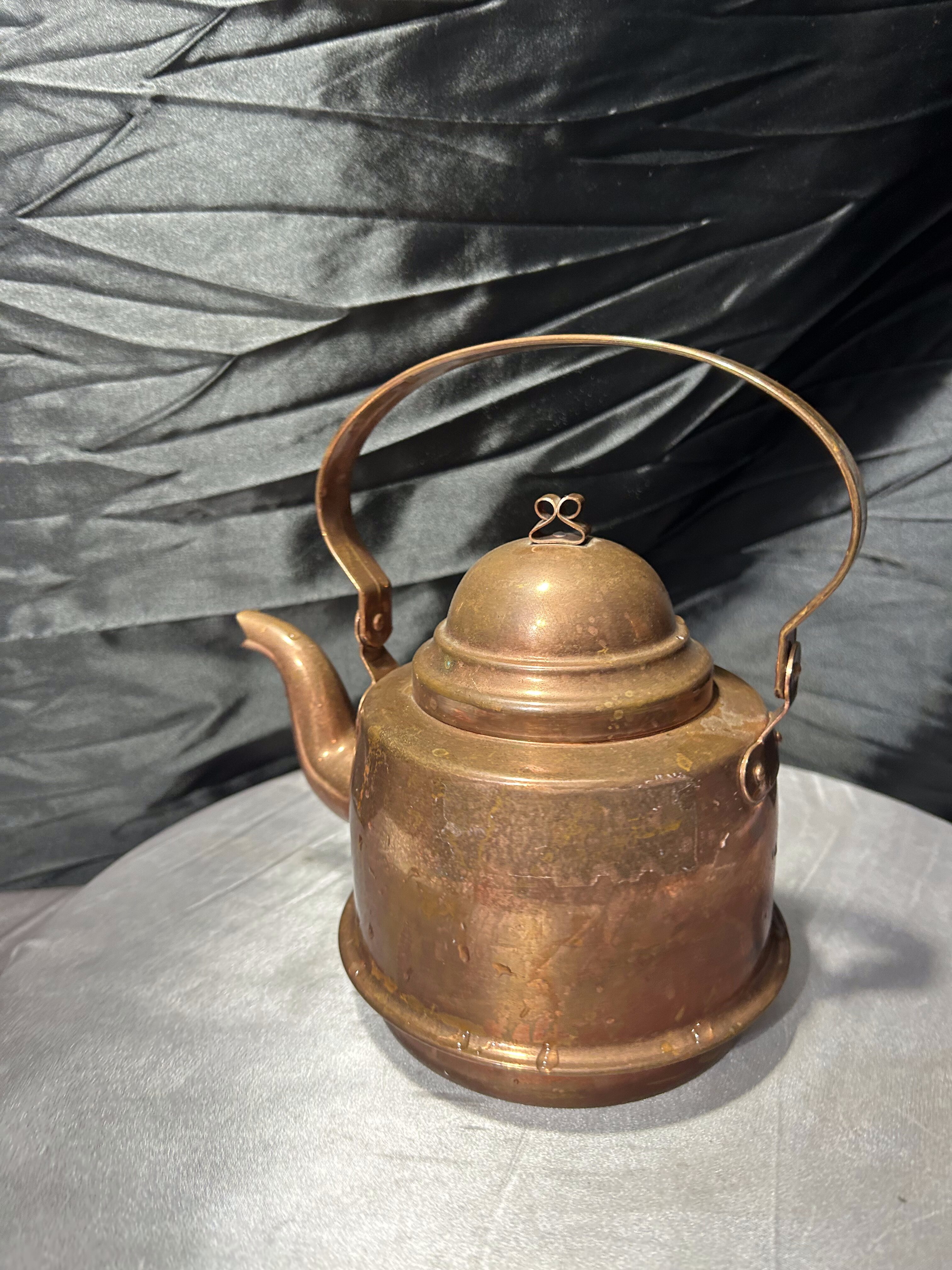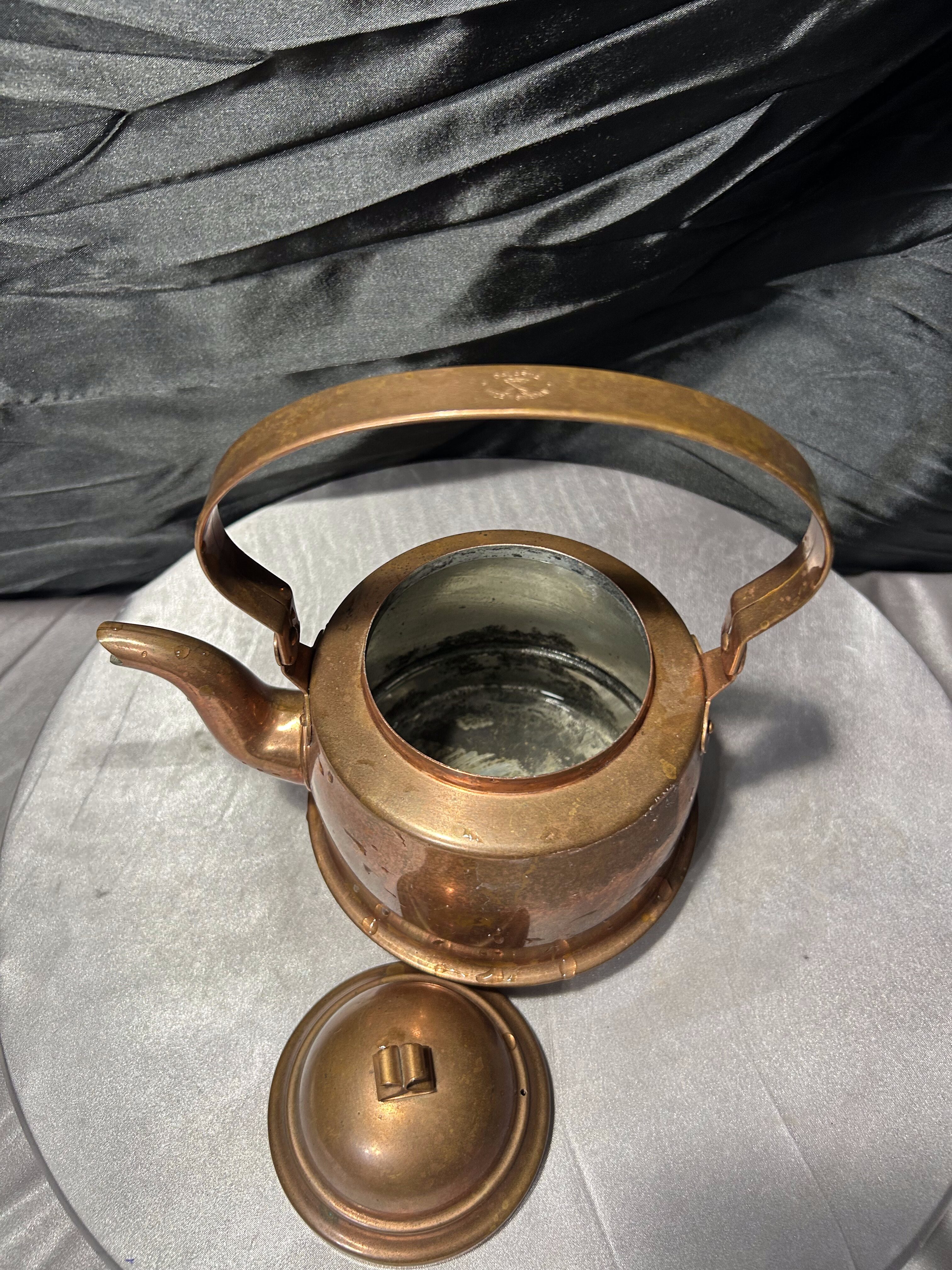 Klasyczny czajnik wykonany z miedzi, o tradycyjnej, solidnej formie. Wyposażony w praktyczny rant u podstawy, który umożliwia stabilne ustawienie na piecu z fajerkami. Model z ruchomym uchwytem i charakterystyczną, wyprofilowaną wylewką. Czajnik sygnowany, zachowany w stanie zgodnym z wiekiem i użytkowaniem.