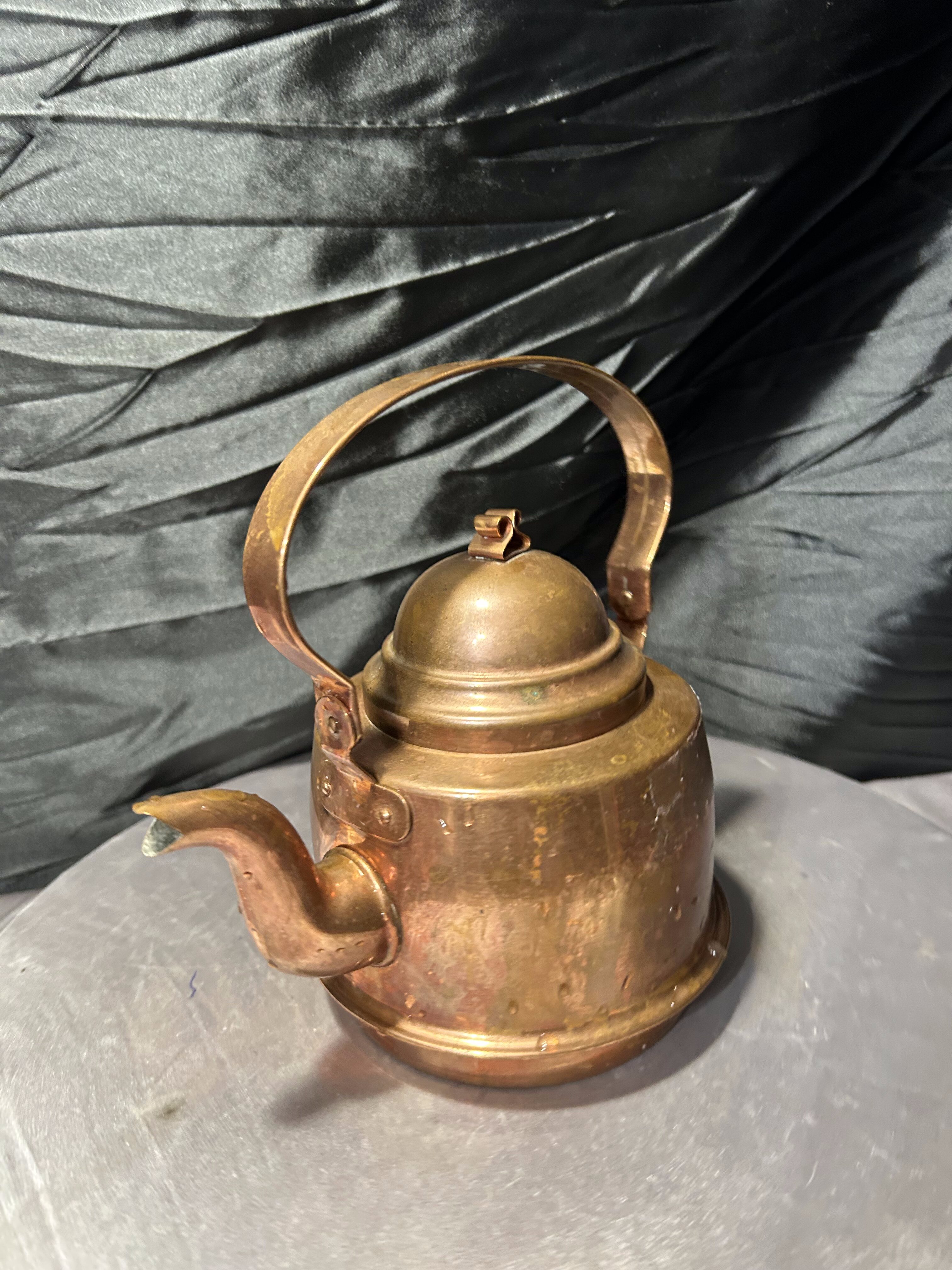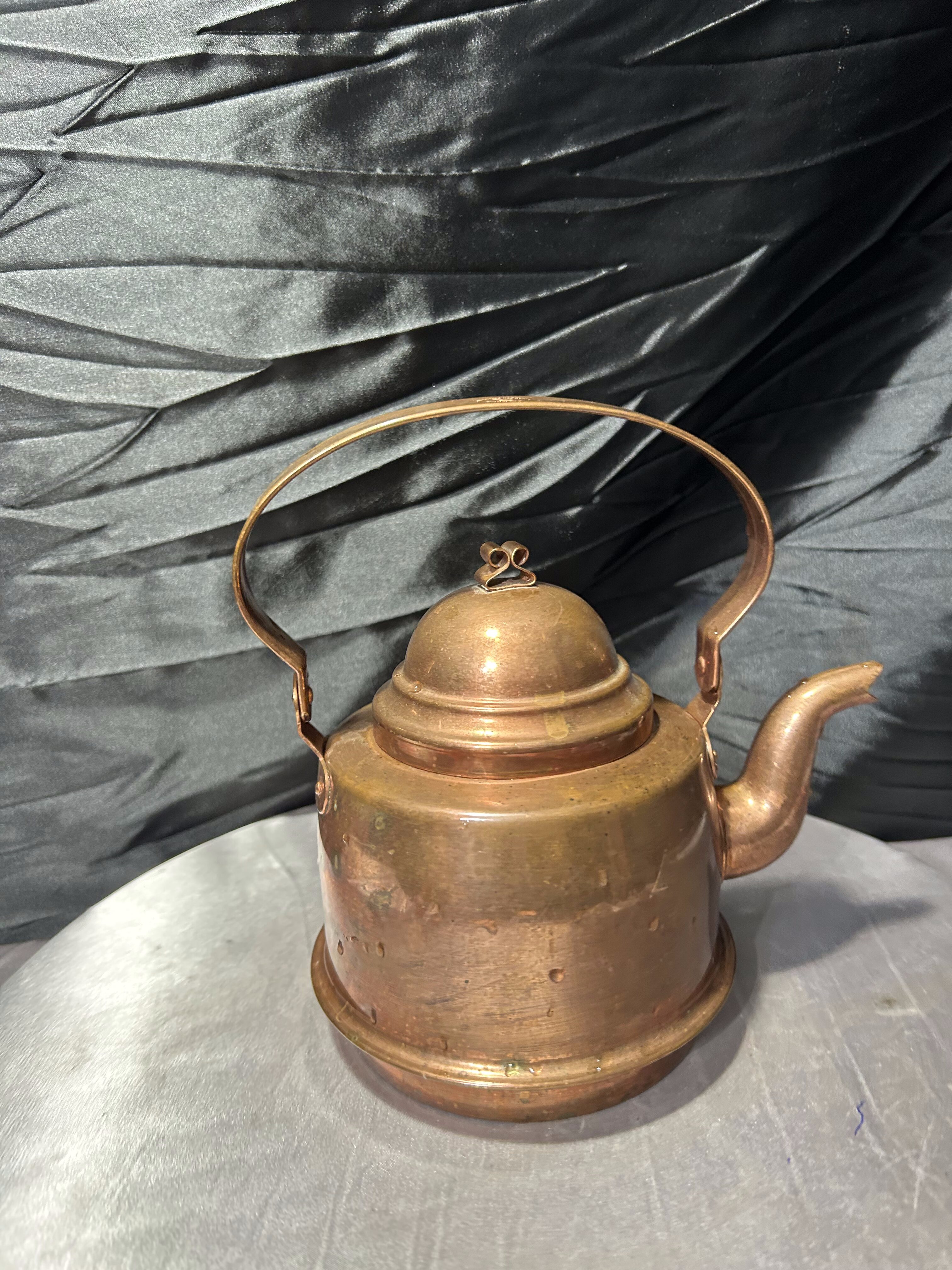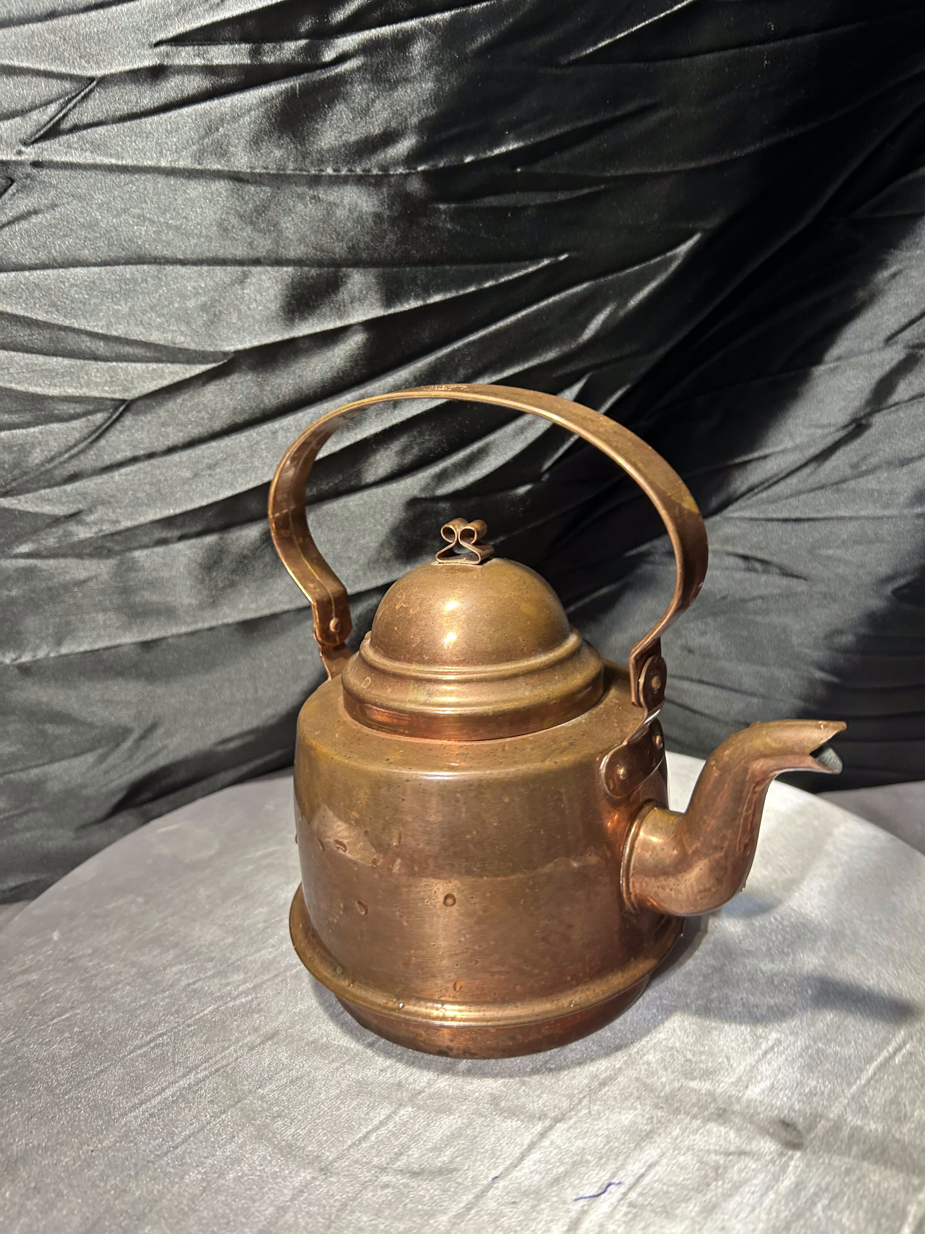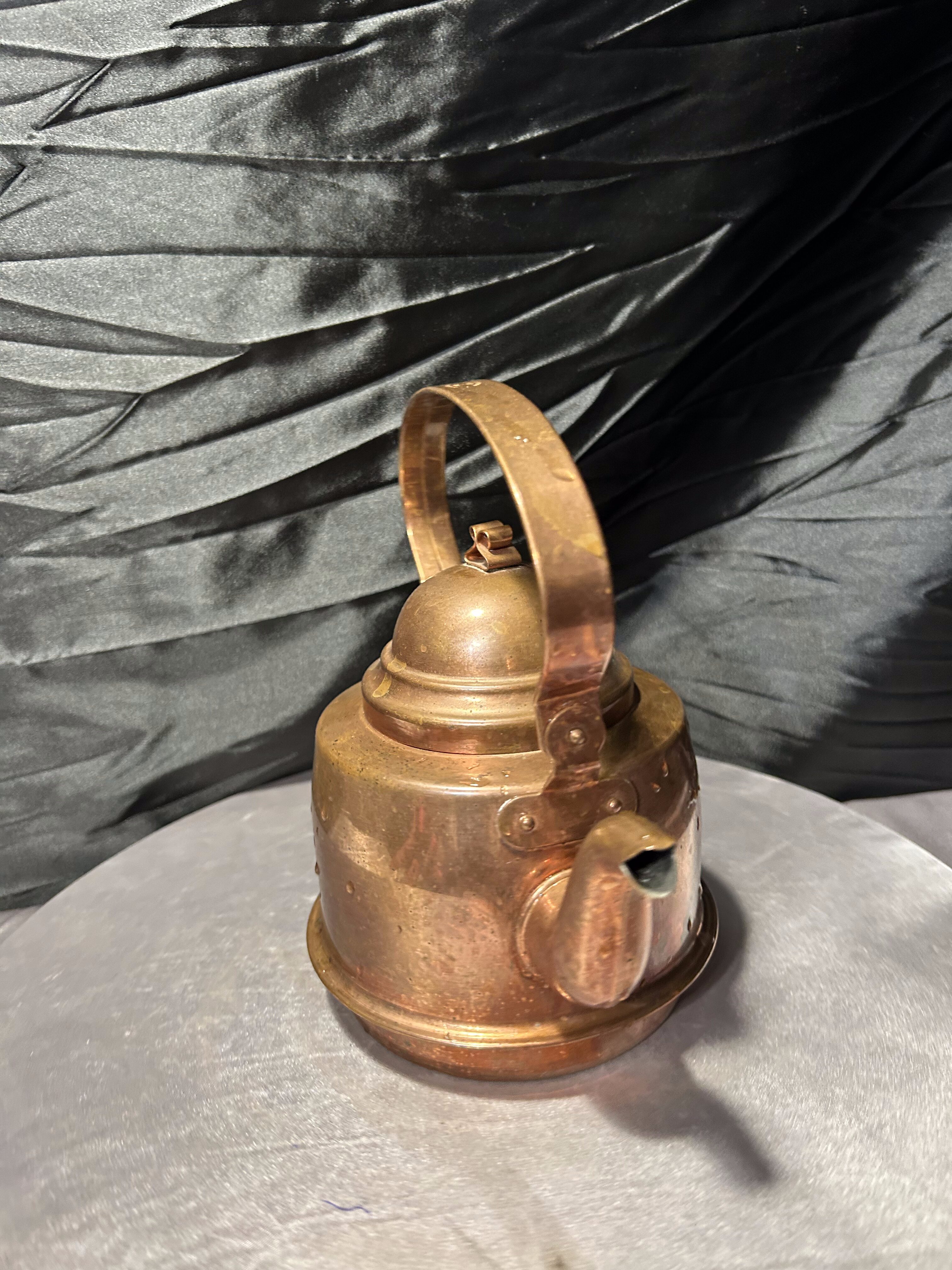 Klasyczny czajnik wykonany z miedzi, o tradycyjnej, solidnej formie. Wyposażony w praktyczny rant u podstawy, który umożliwia stabilne ustawienie na piecu z fajerkami. Model z ruchomym uchwytem i charakterystyczną, wyprofilowaną wylewką. Czajnik sygnowany, zachowany w stanie zgodnym z wiekiem i użytkowaniem.