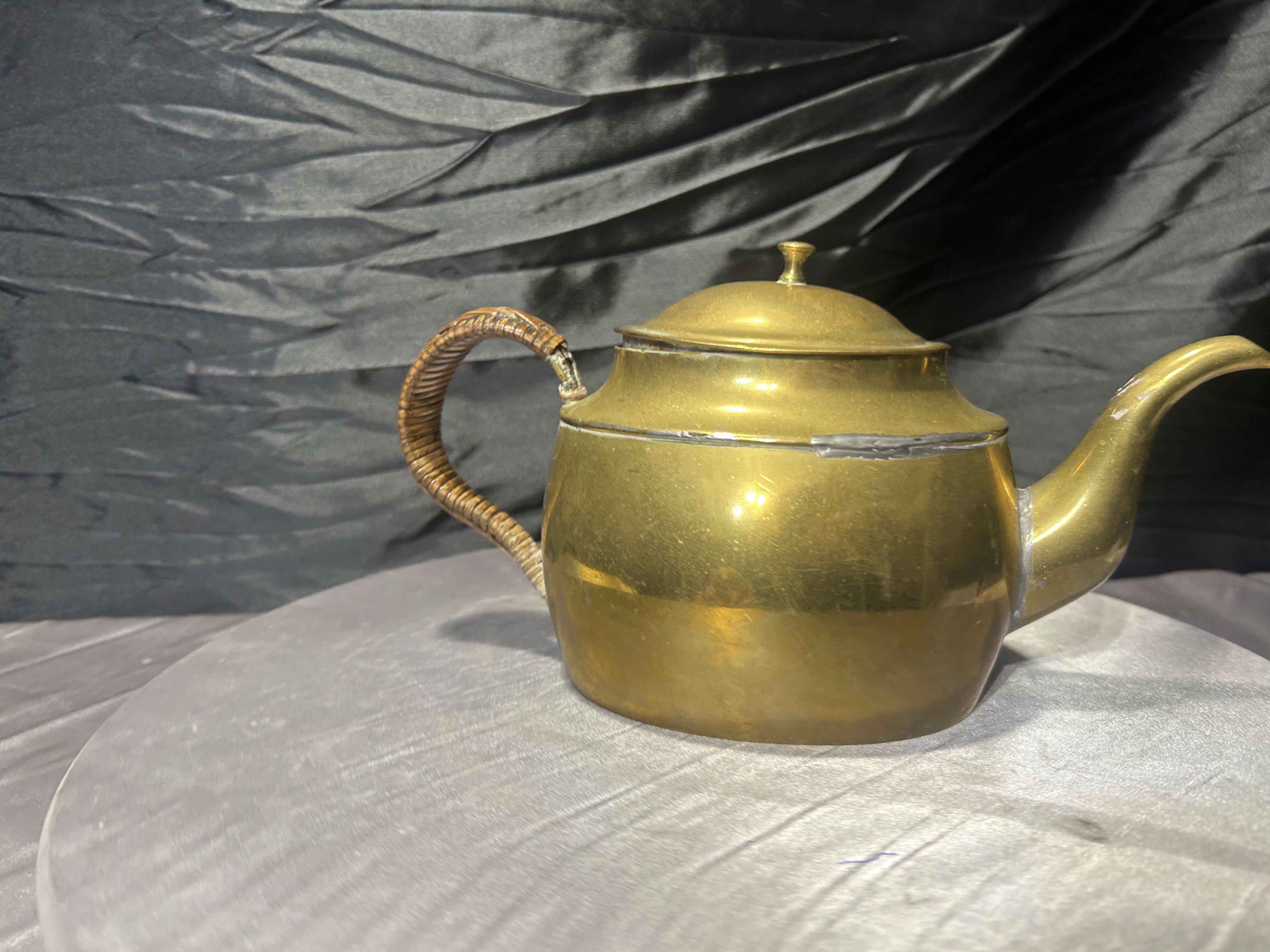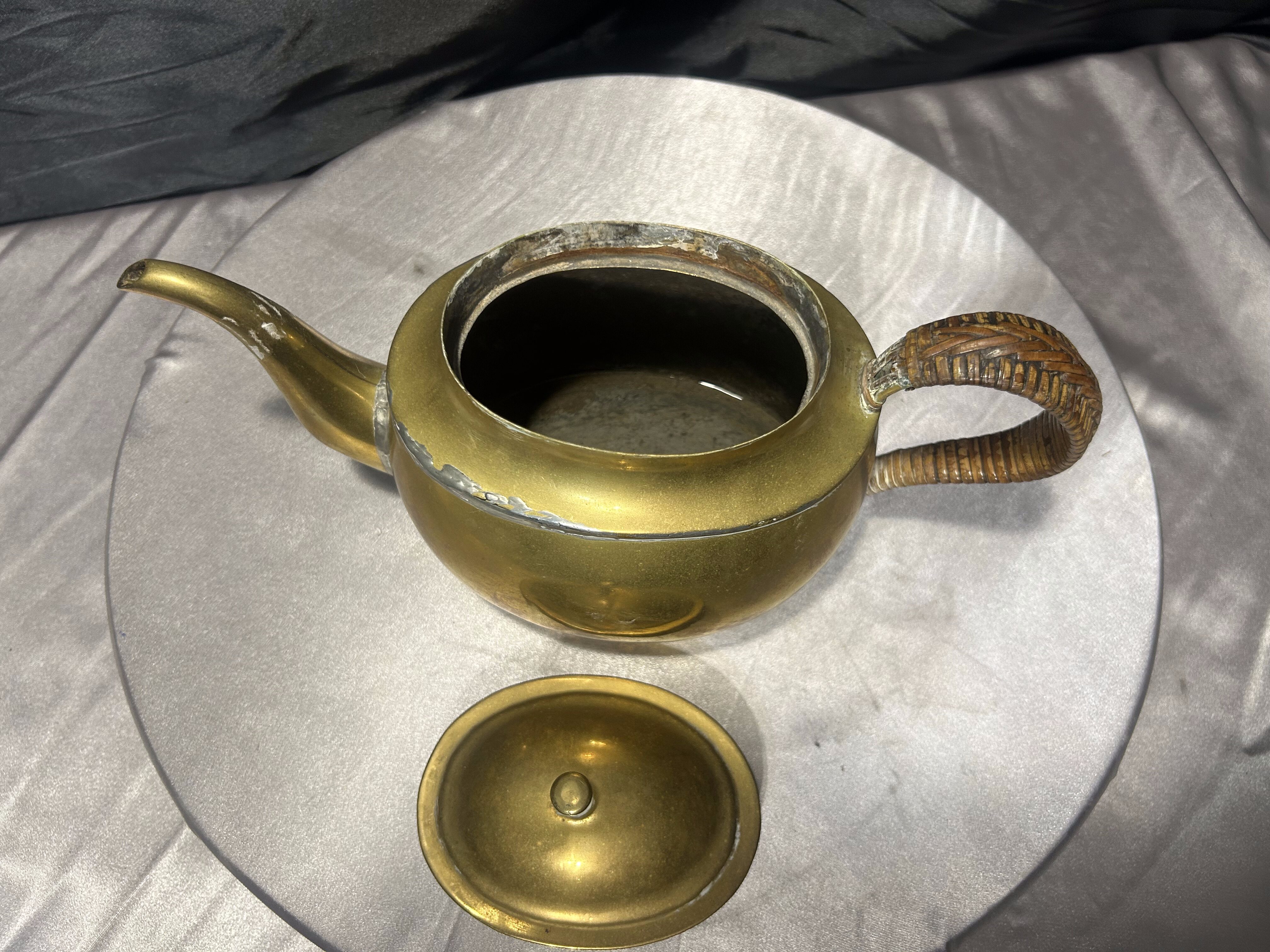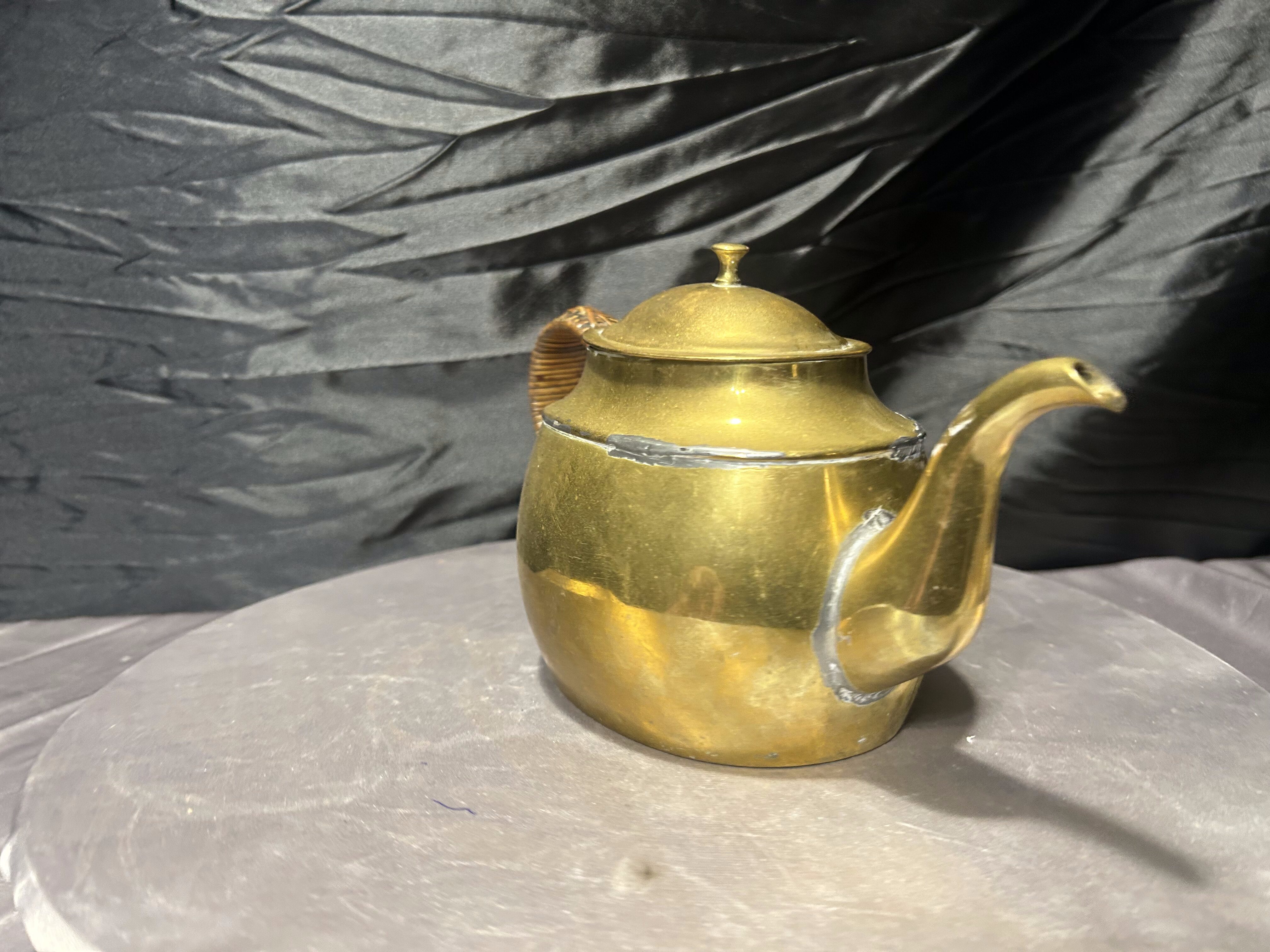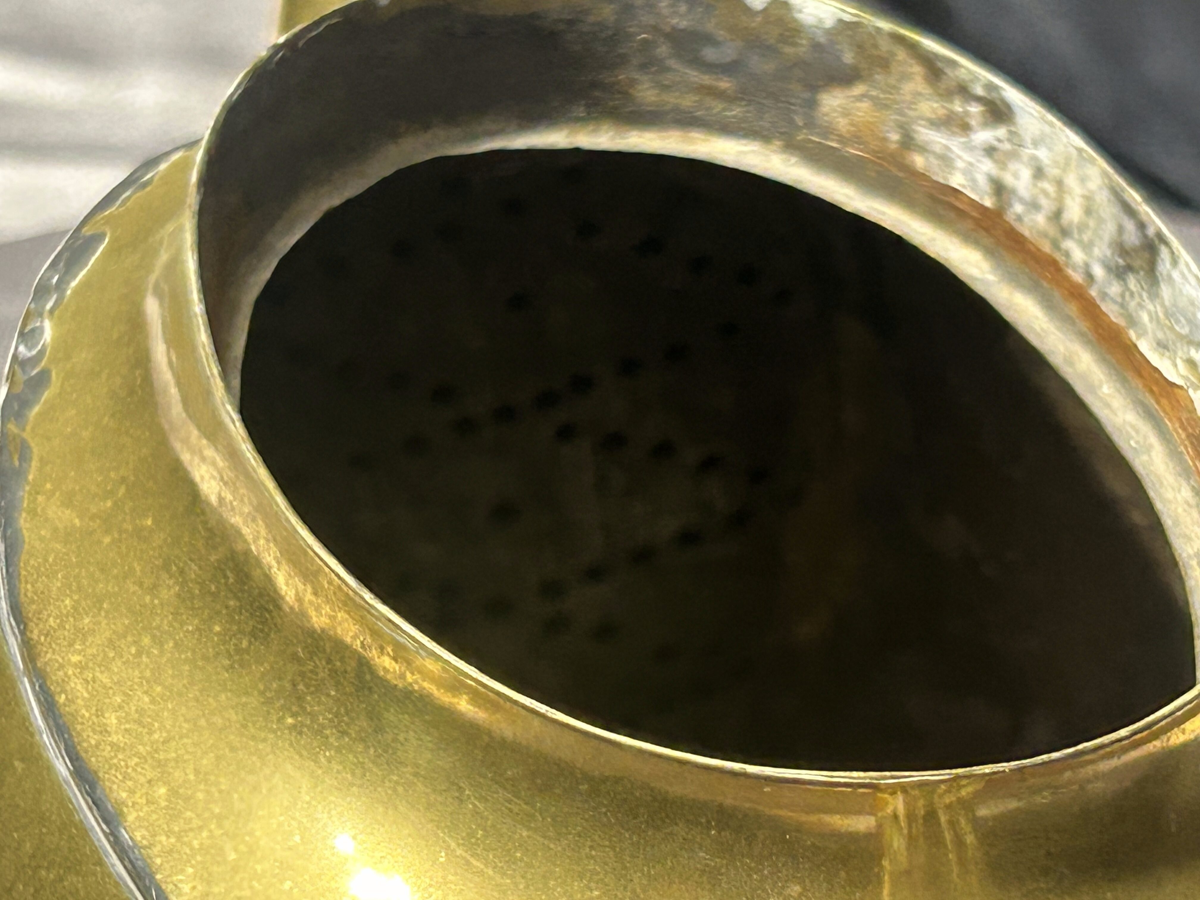 Klasyczny czajnik z mosiądzu o pojemności 0,9 litra, wyposażony w wewnętrzne siteczko, które umożliwia parzenie herbaty liściastej oraz różnego rodzaju naparów ziołowych. Prosta, funkcjonalna forma została uzupełniona wygodnym uchwytem oraz dobrze wyprofilowanym dzióbkiem, zapewniającym komfortowe nalewanie. Naturalna patyna i ślady użytkowania podkreślają autentyczny, użytkowy charakter przedmiotu.