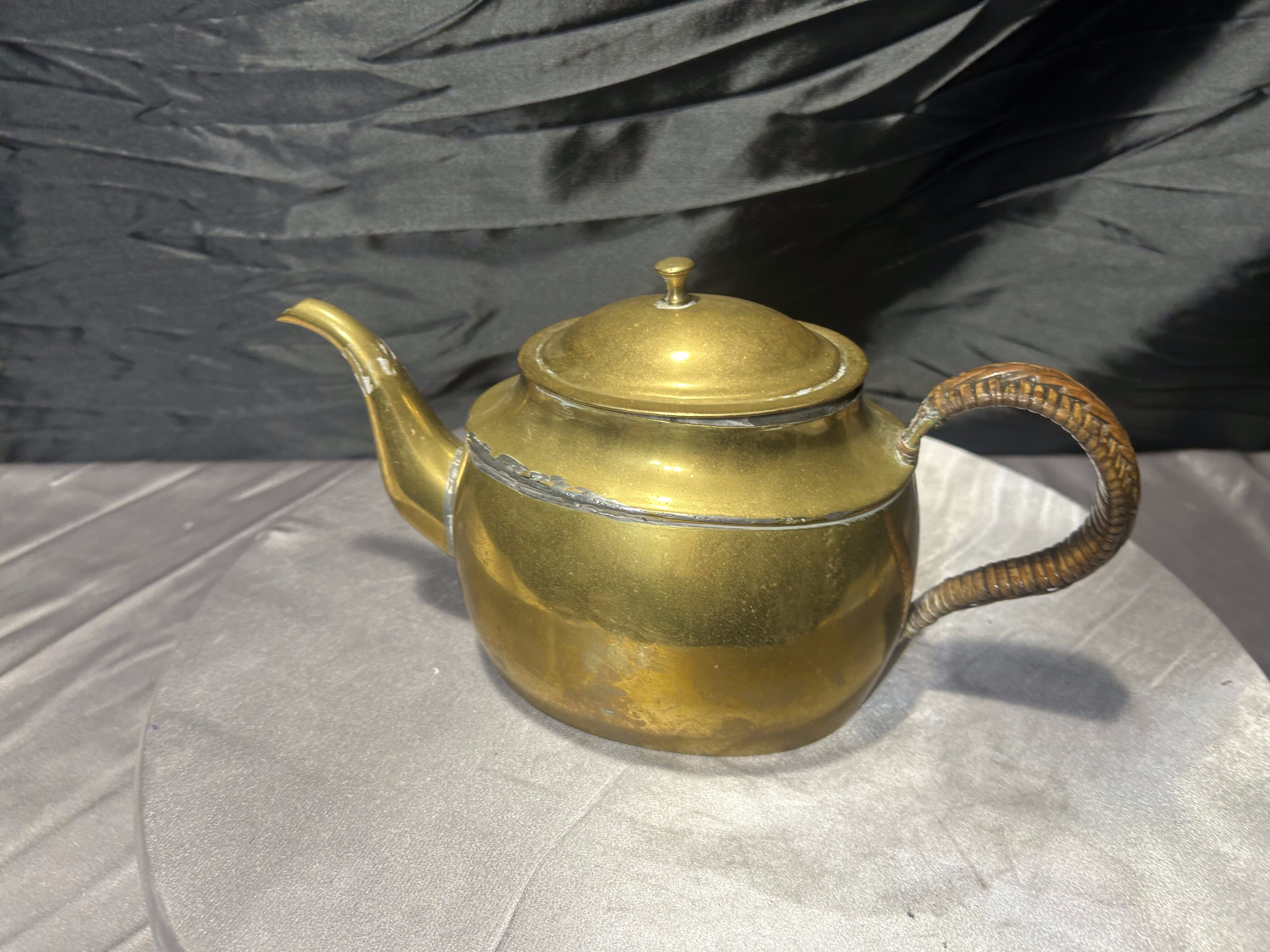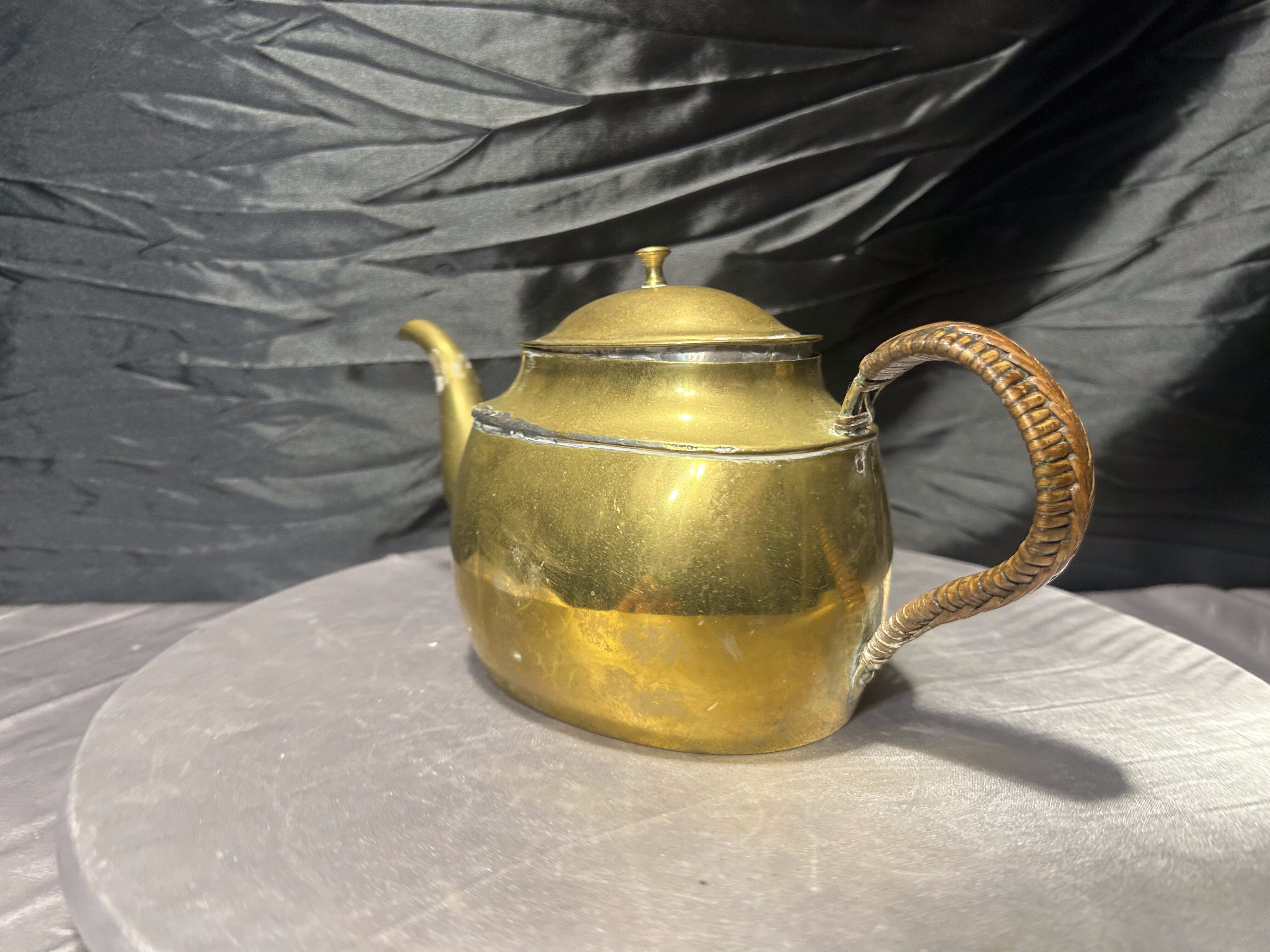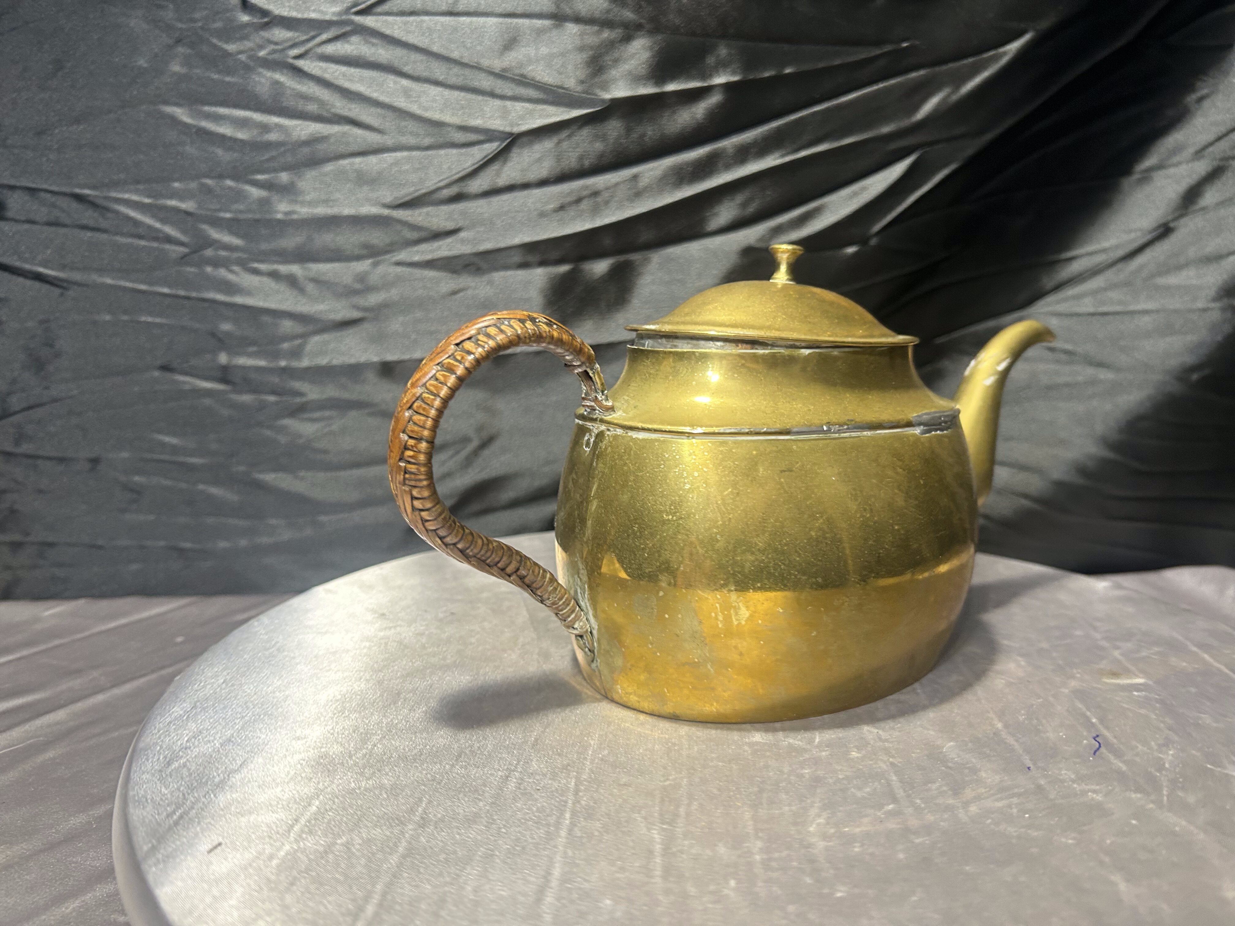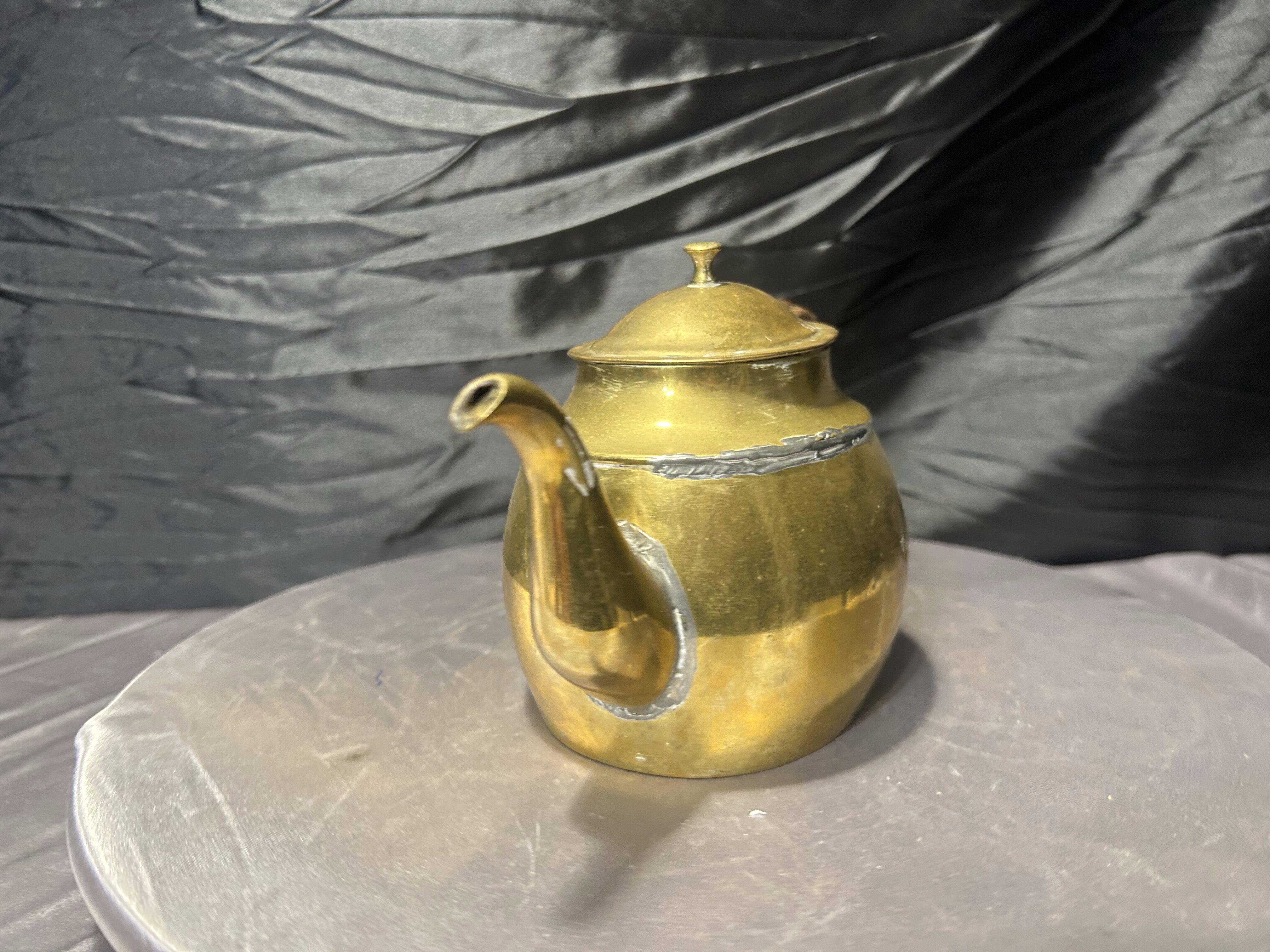 Klasyczny czajnik z mosiądzu o pojemności 0,9 litra, wyposażony w wewnętrzne siteczko, które umożliwia parzenie herbaty liściastej oraz różnego rodzaju naparów ziołowych. Prosta, funkcjonalna forma została uzupełniona wygodnym uchwytem oraz dobrze wyprofilowanym dzióbkiem, zapewniającym komfortowe nalewanie. Naturalna patyna i ślady użytkowania podkreślają autentyczny, użytkowy charakter przedmiotu.