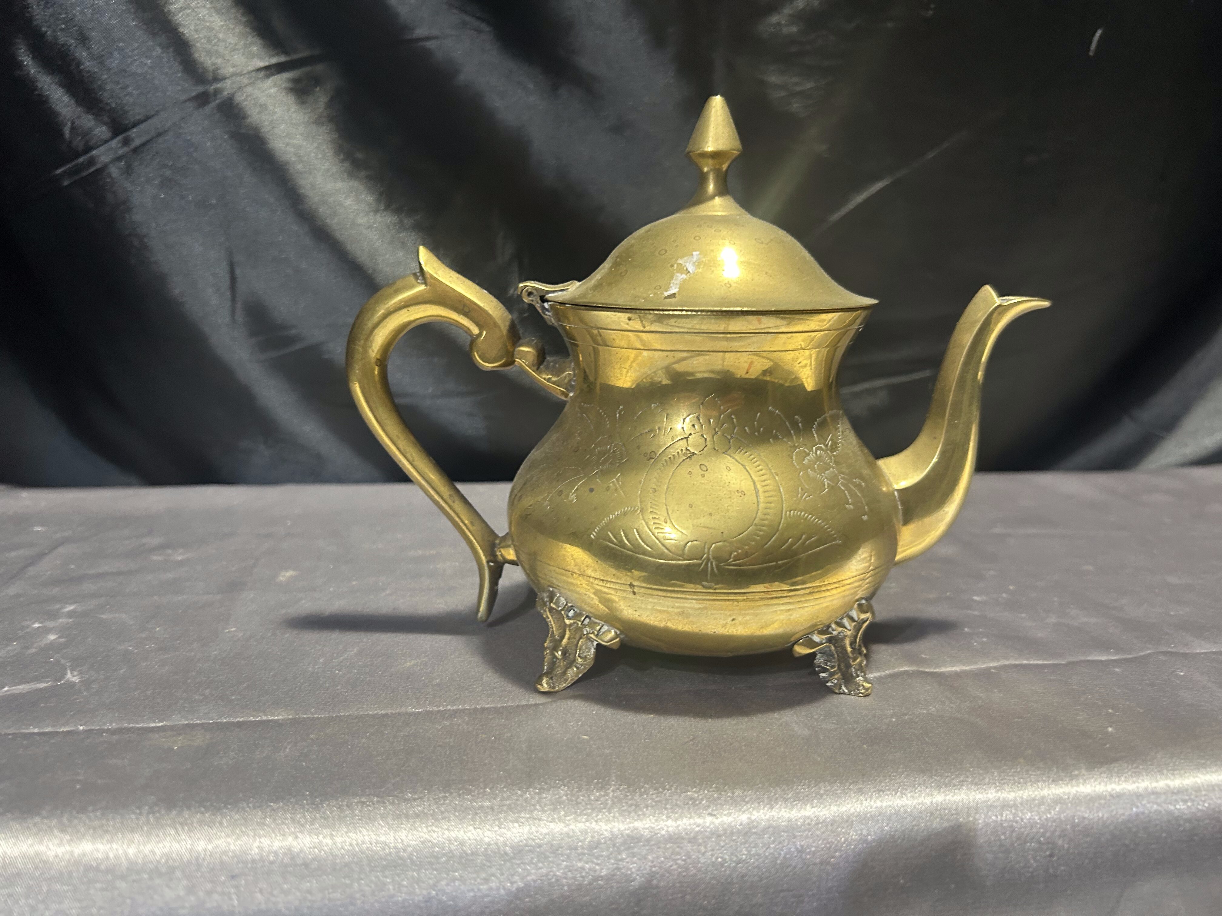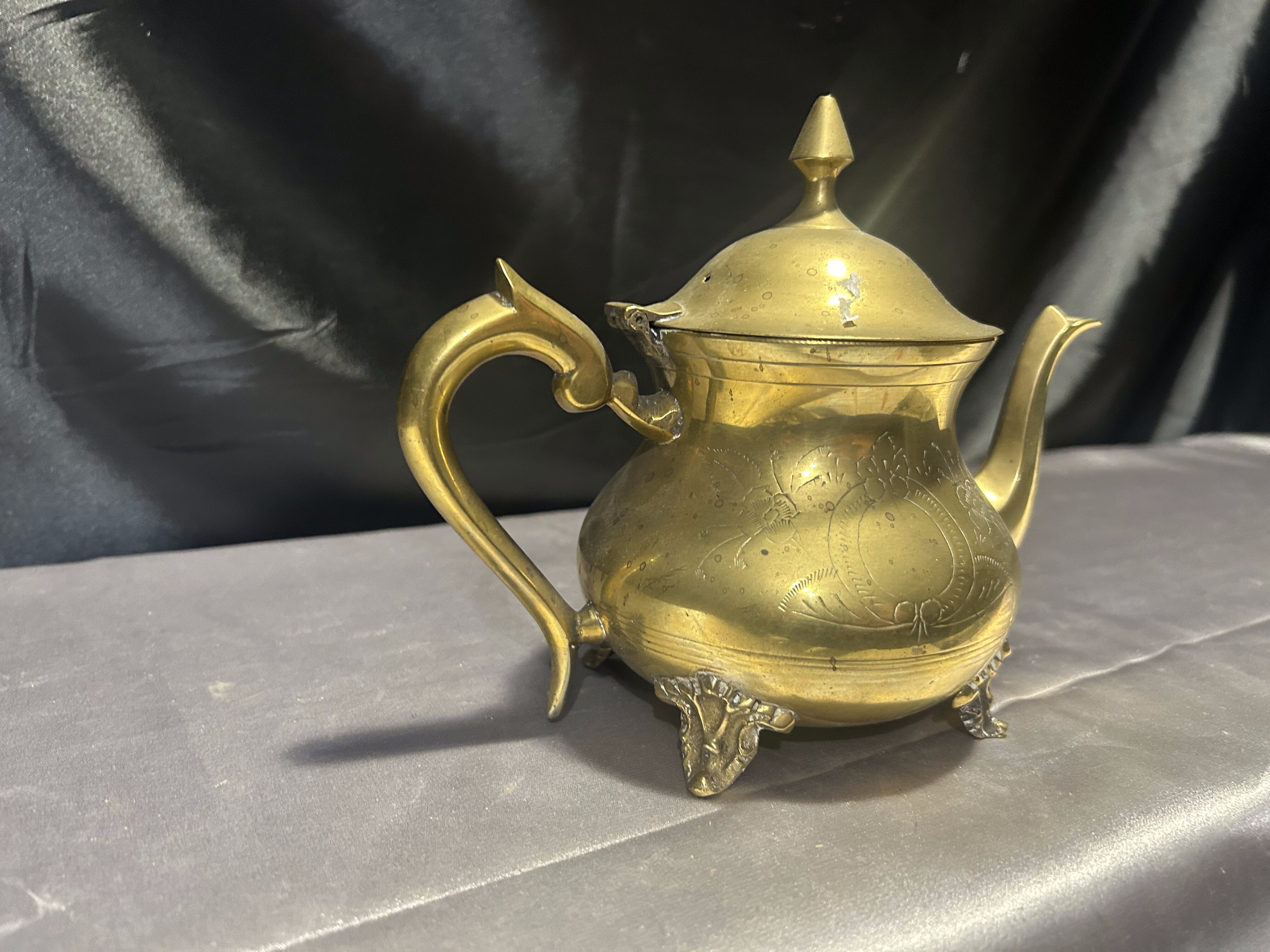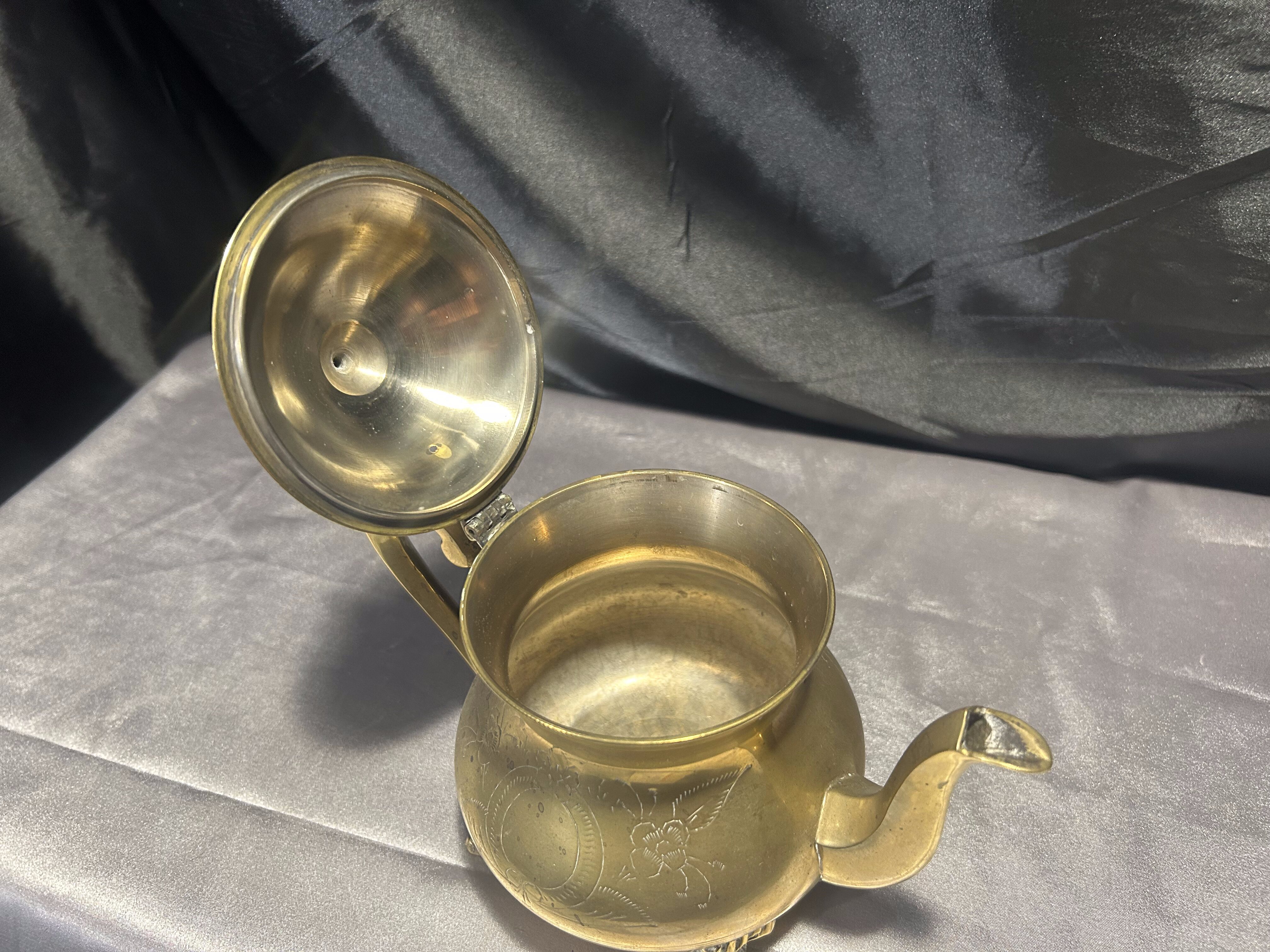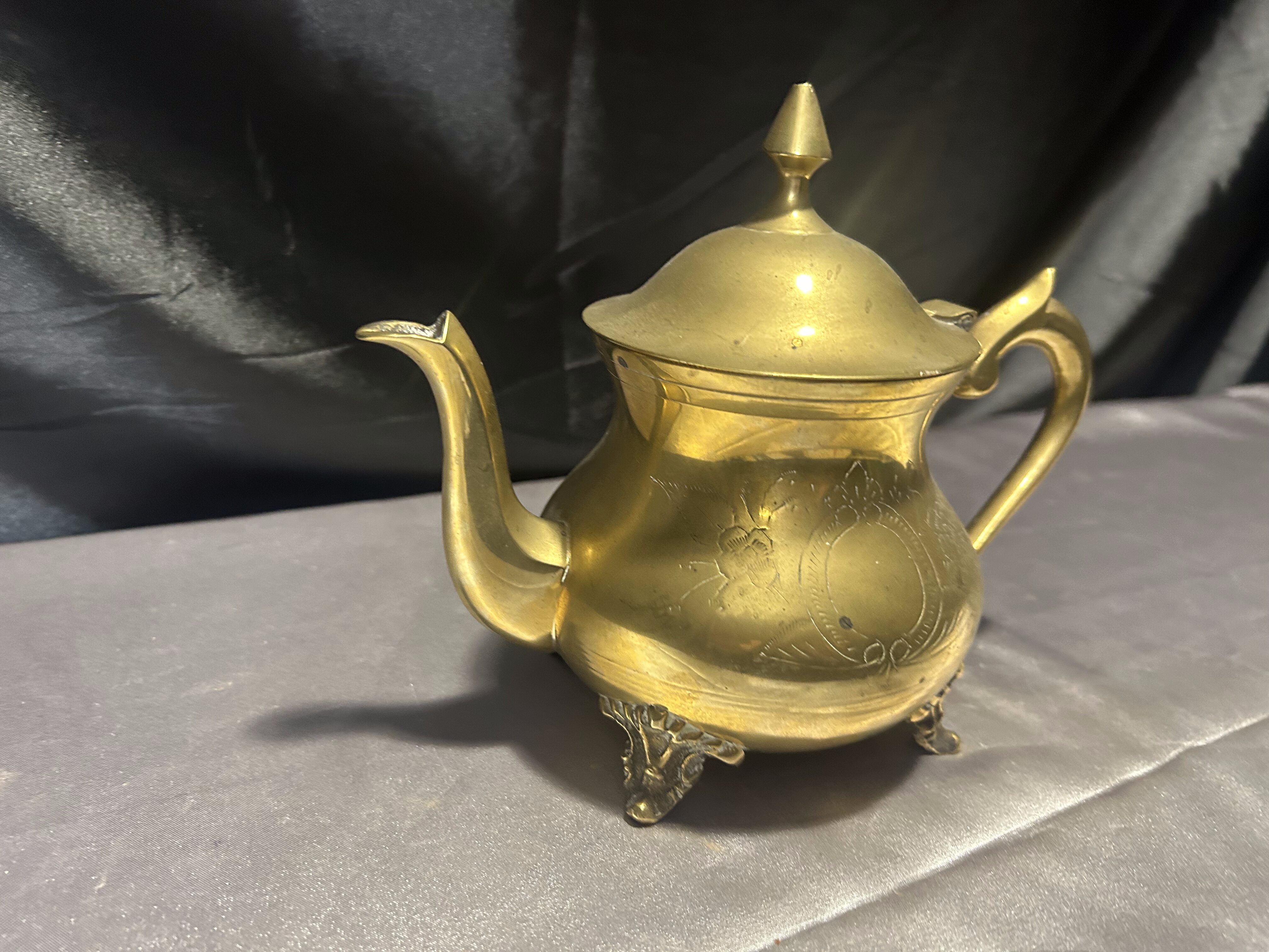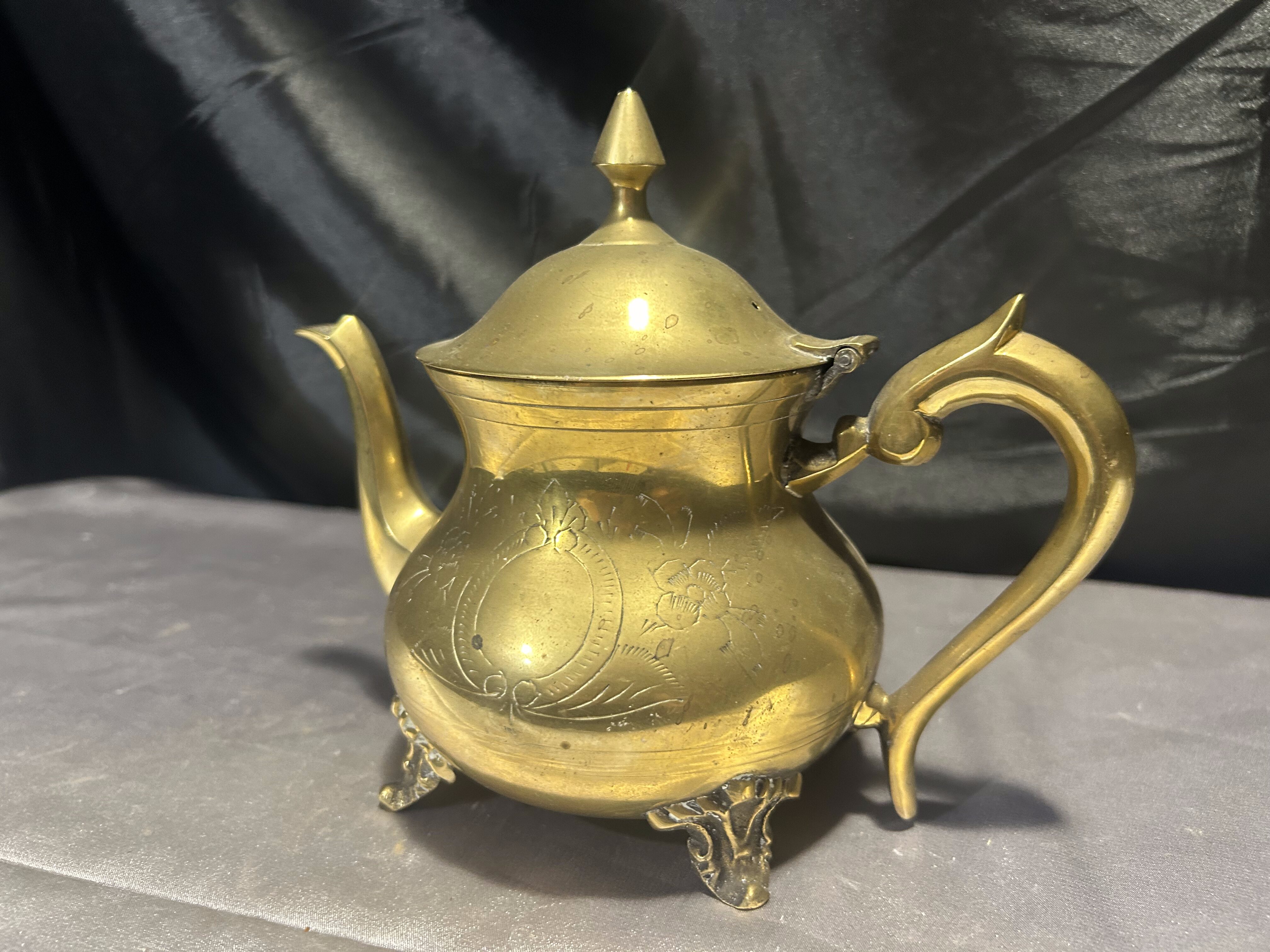 Elegancki czajnik z mosiądzu o klasycznej formie, bogato zdobiony subtelnymi grawerunkami i osadzony na dekoracyjnych nóżkach. Idealny jako element dekoracyjny w stylu vintage lub rustykalnym, ale również może pełnić funkcję użytkową. Mosiądz pięknie odbija światło, a staranne detale dodają mu uroku i wyjątkowego charakteru.