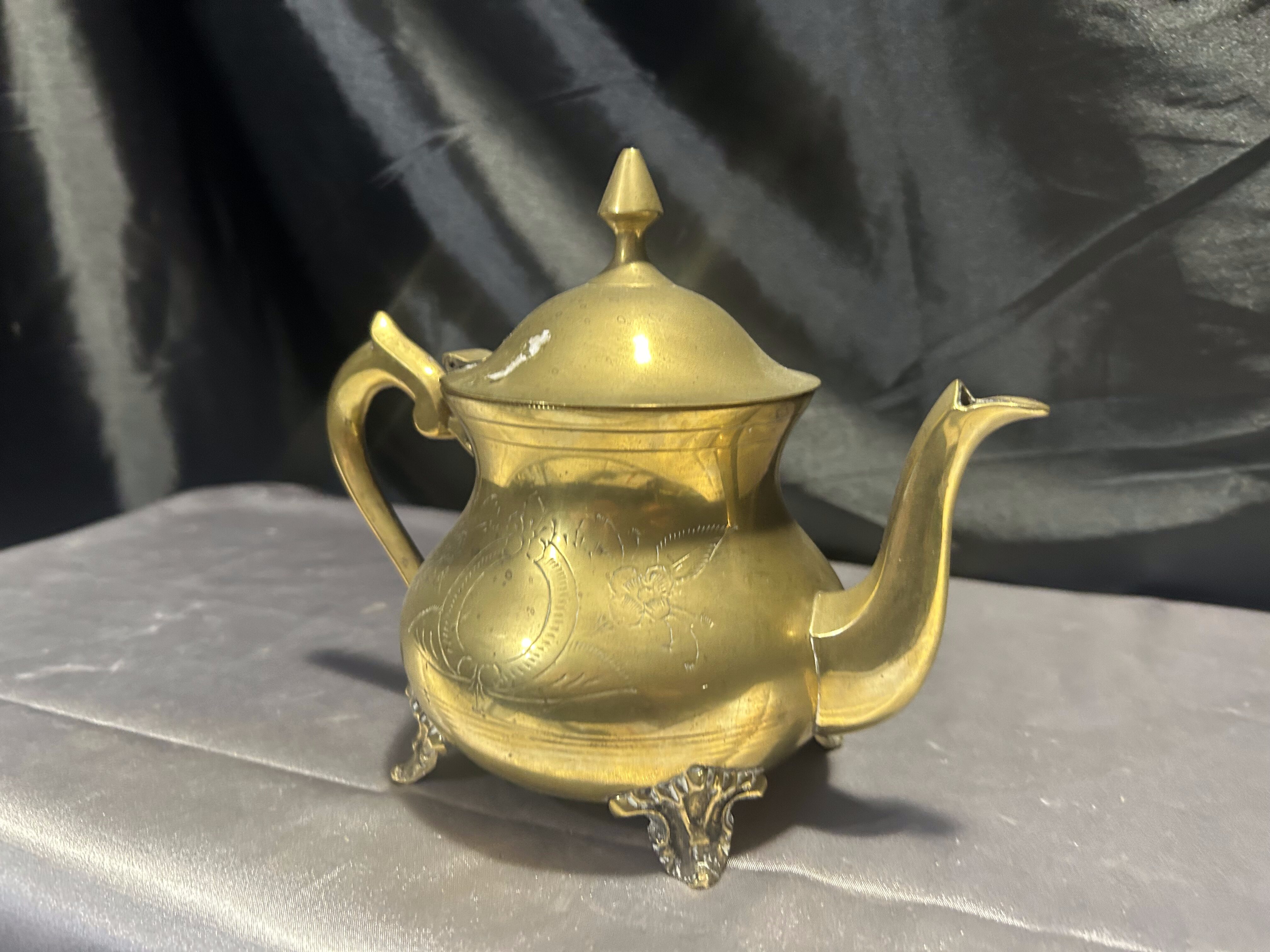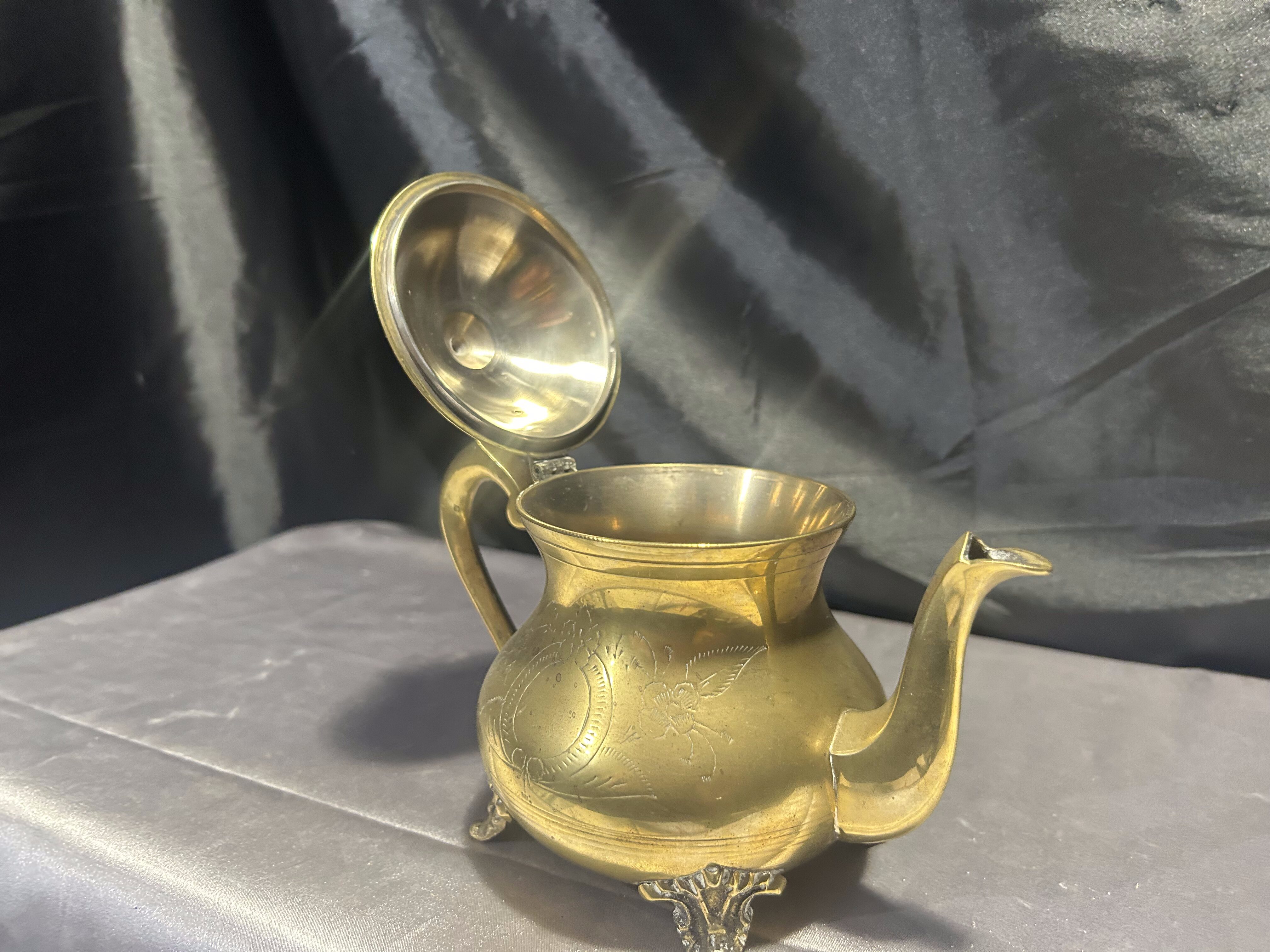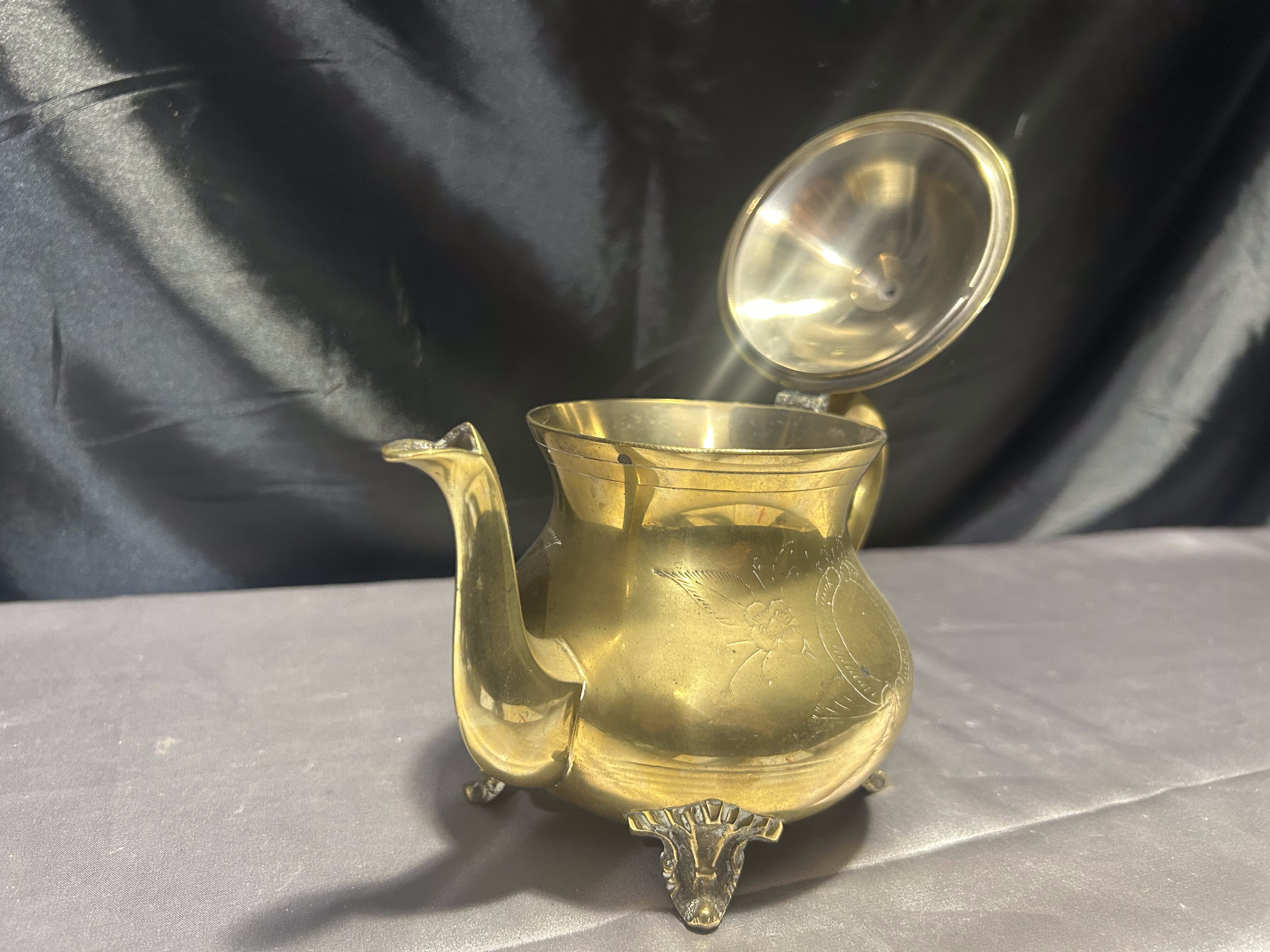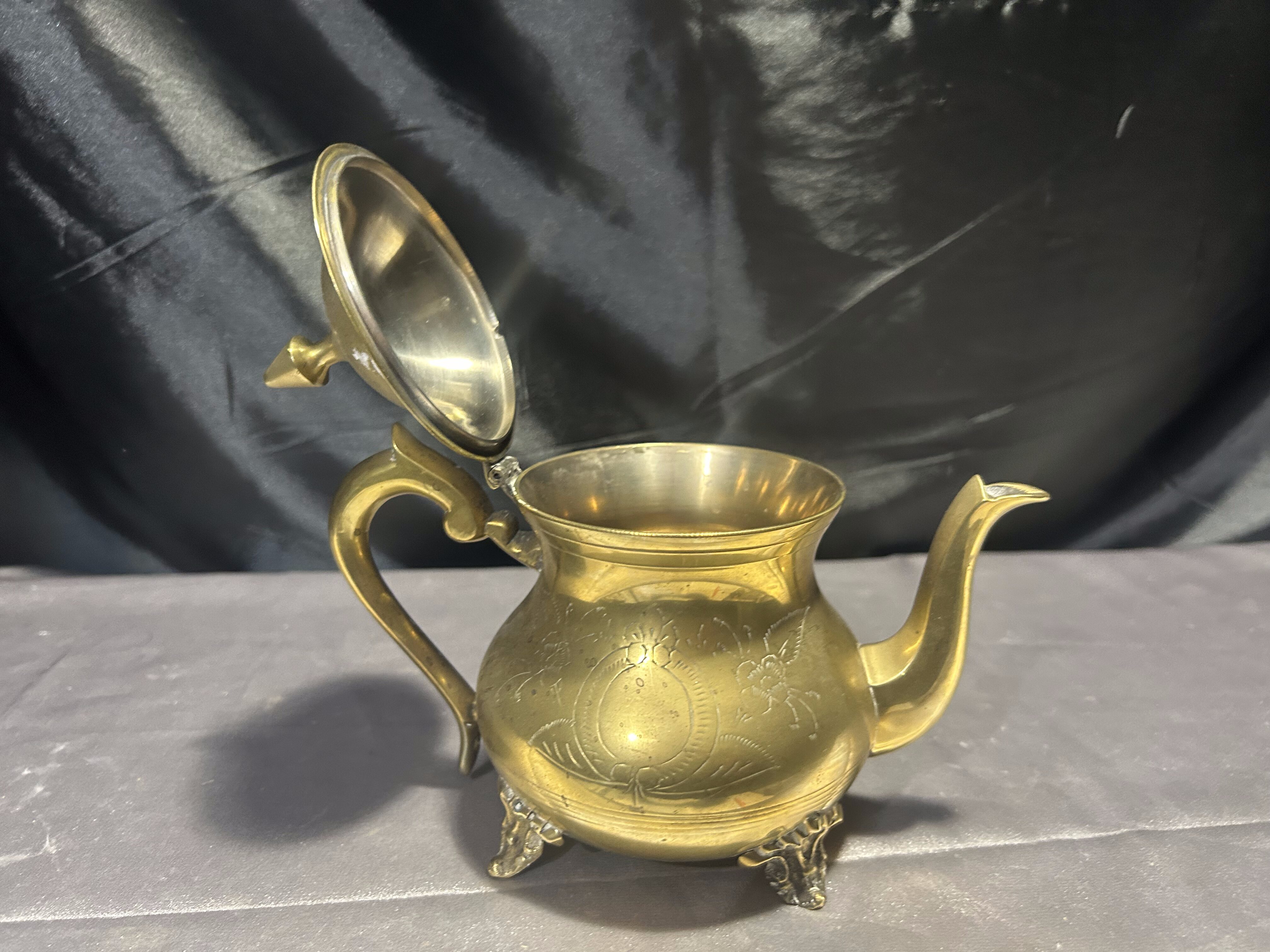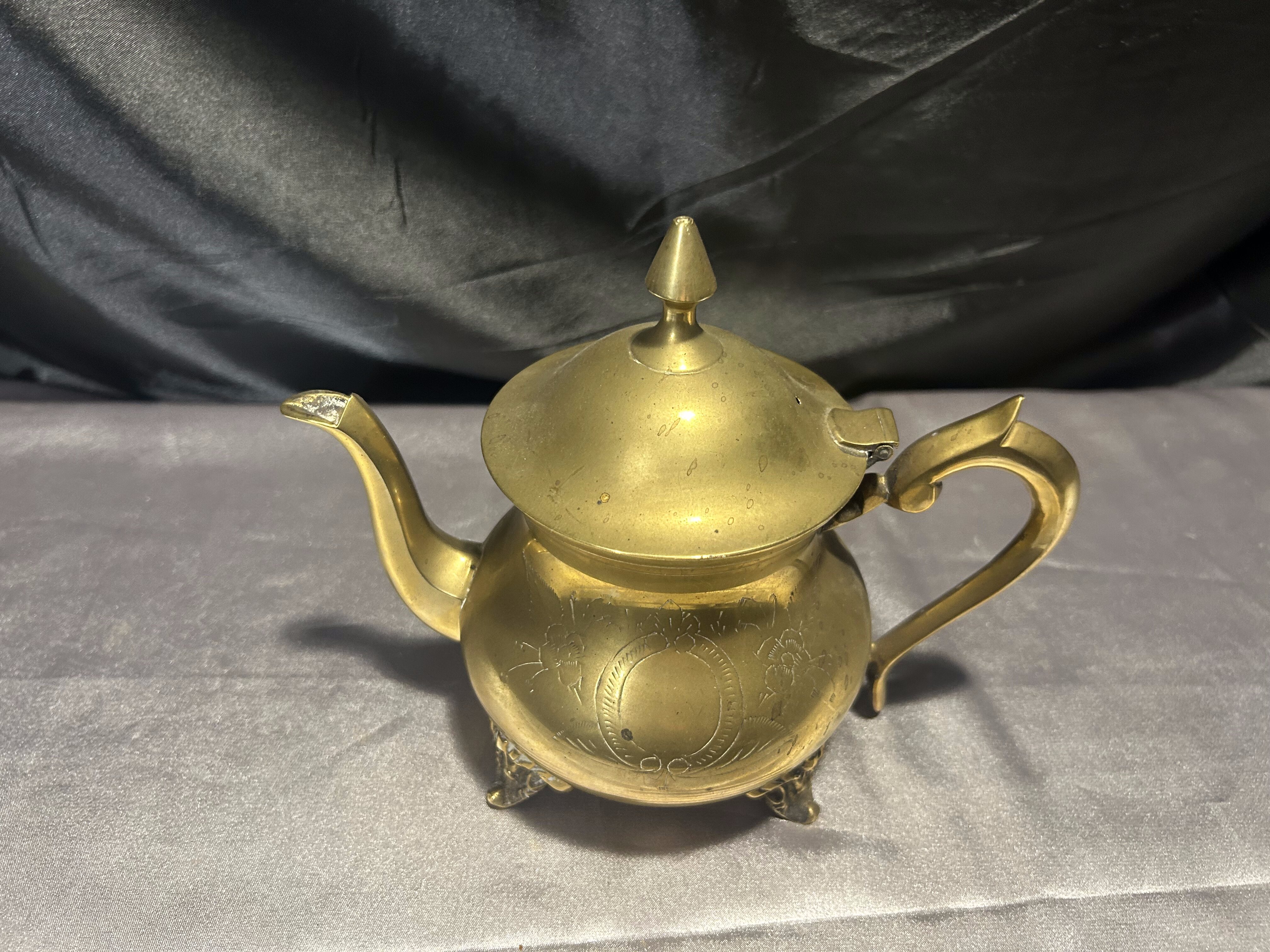 Elegancki czajnik z mosiądzu o klasycznej formie, bogato zdobiony subtelnymi grawerunkami i osadzony na dekoracyjnych nóżkach. Idealny jako element dekoracyjny w stylu vintage lub rustykalnym, ale również może pełnić funkcję użytkową. Mosiądz pięknie odbija światło, a staranne detale dodają mu uroku i wyjątkowego charakteru.