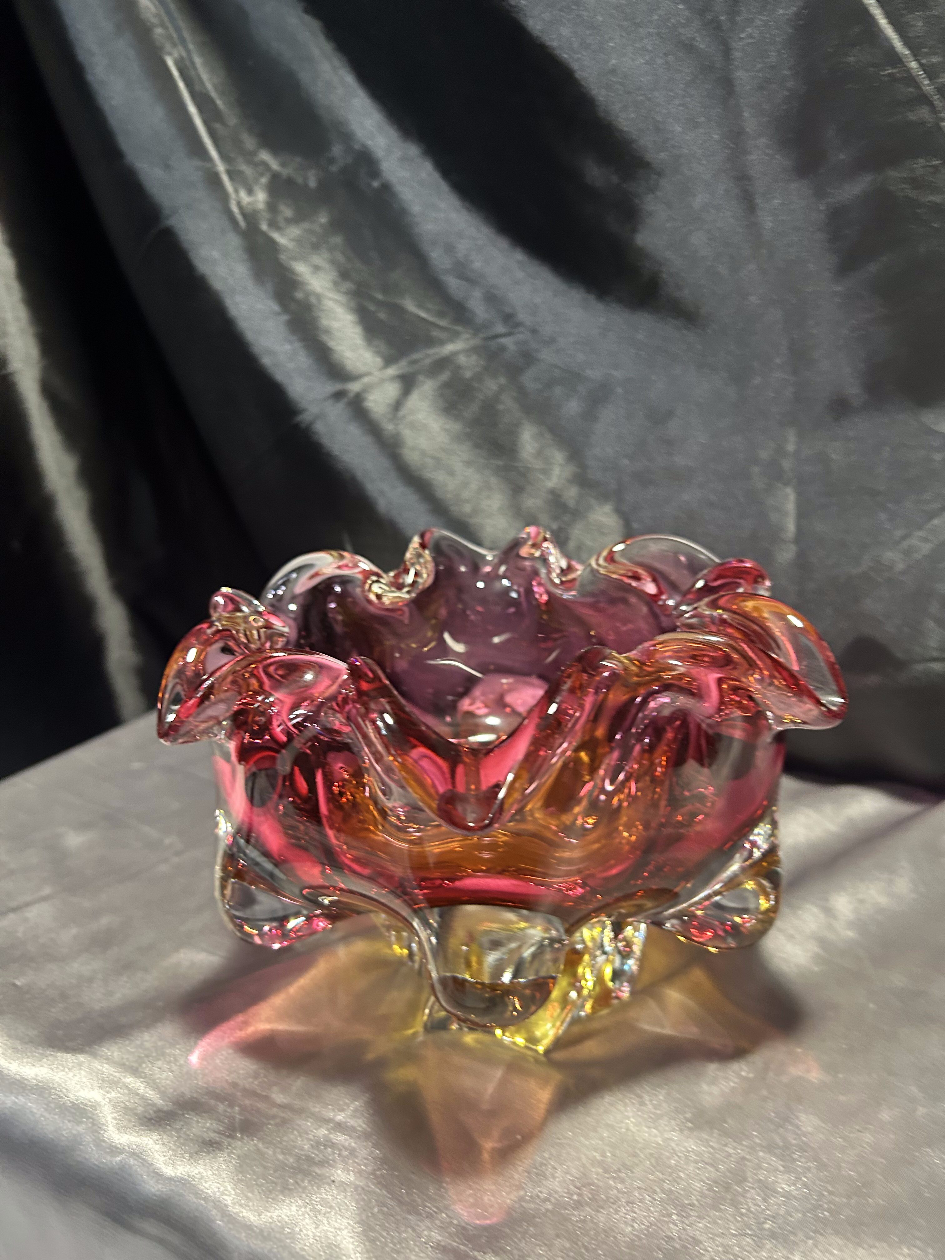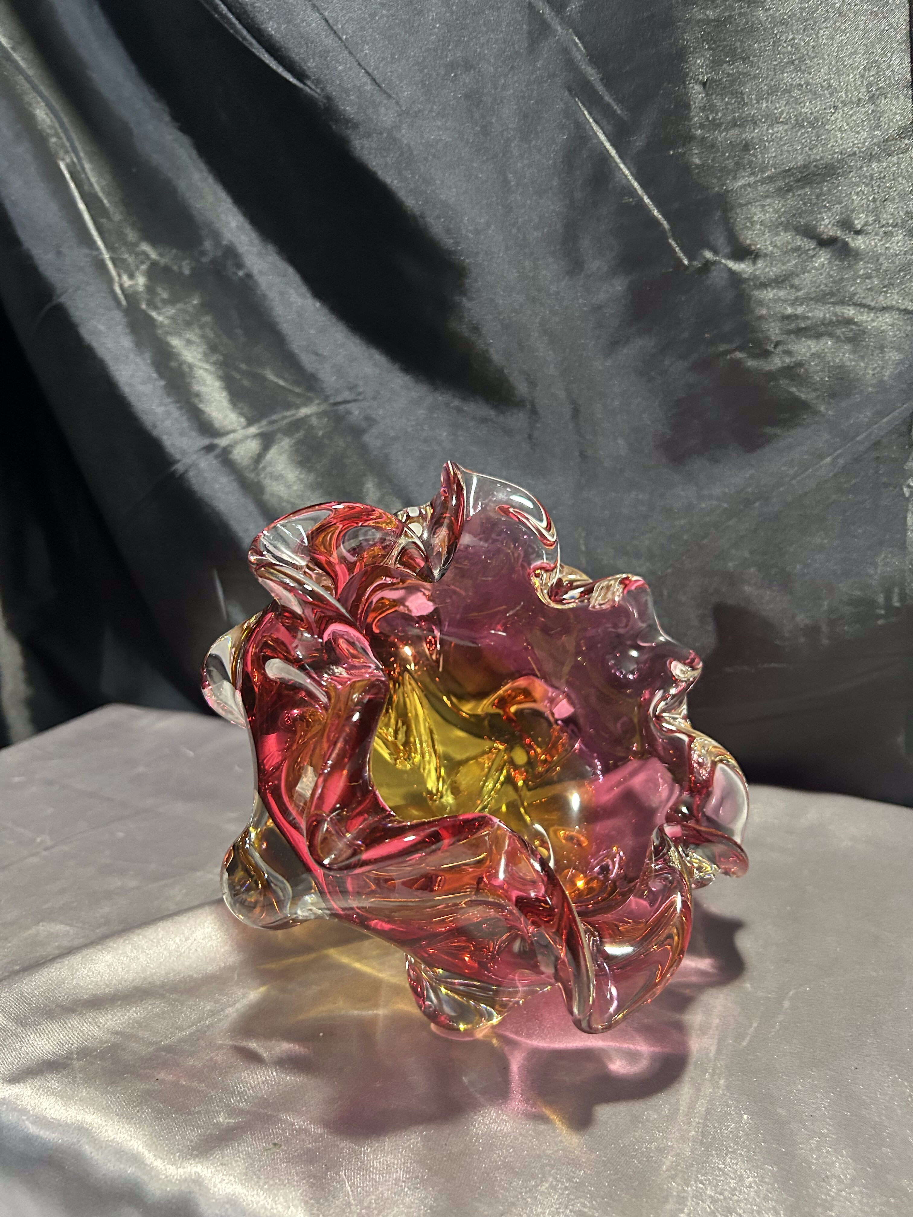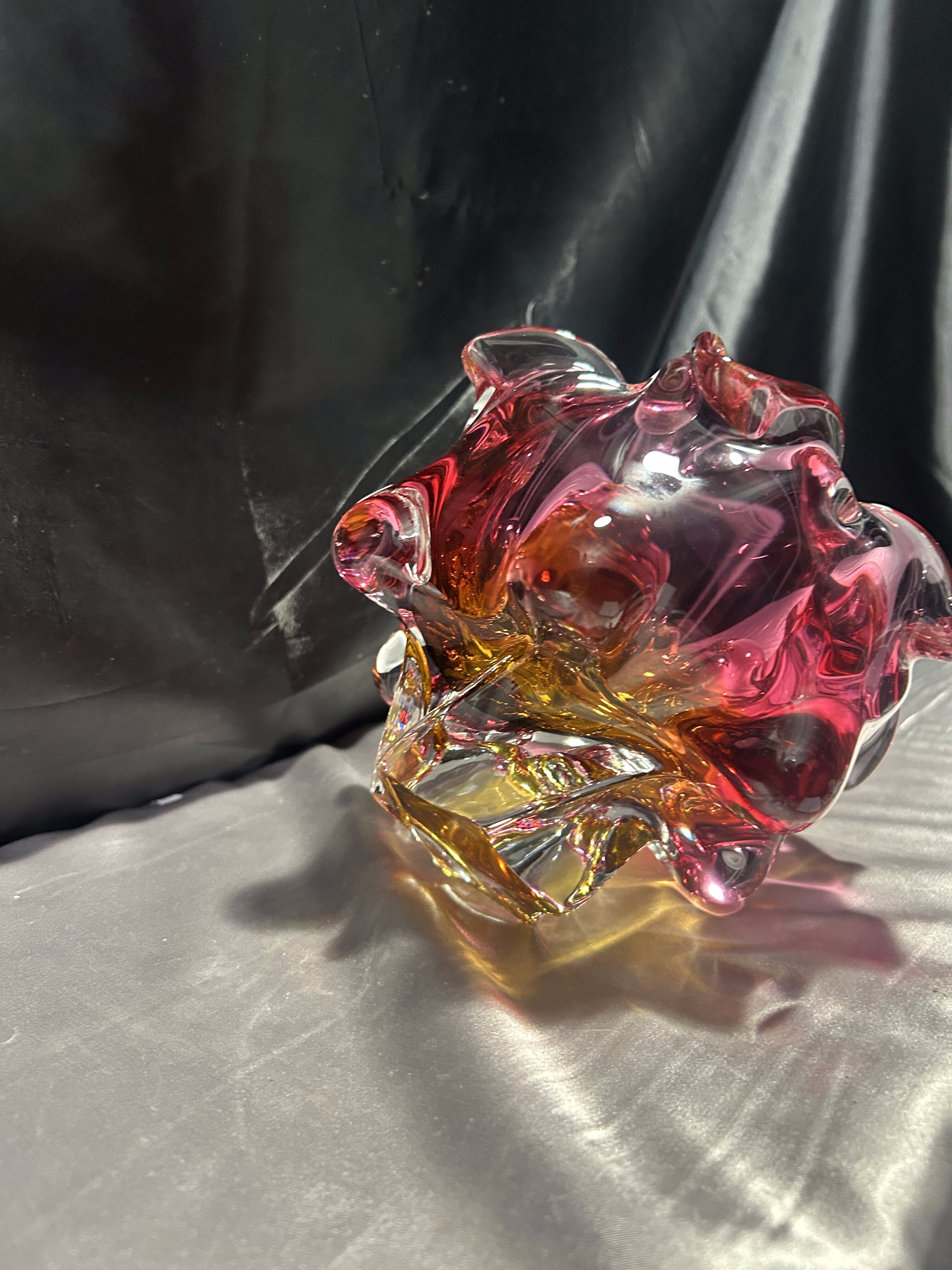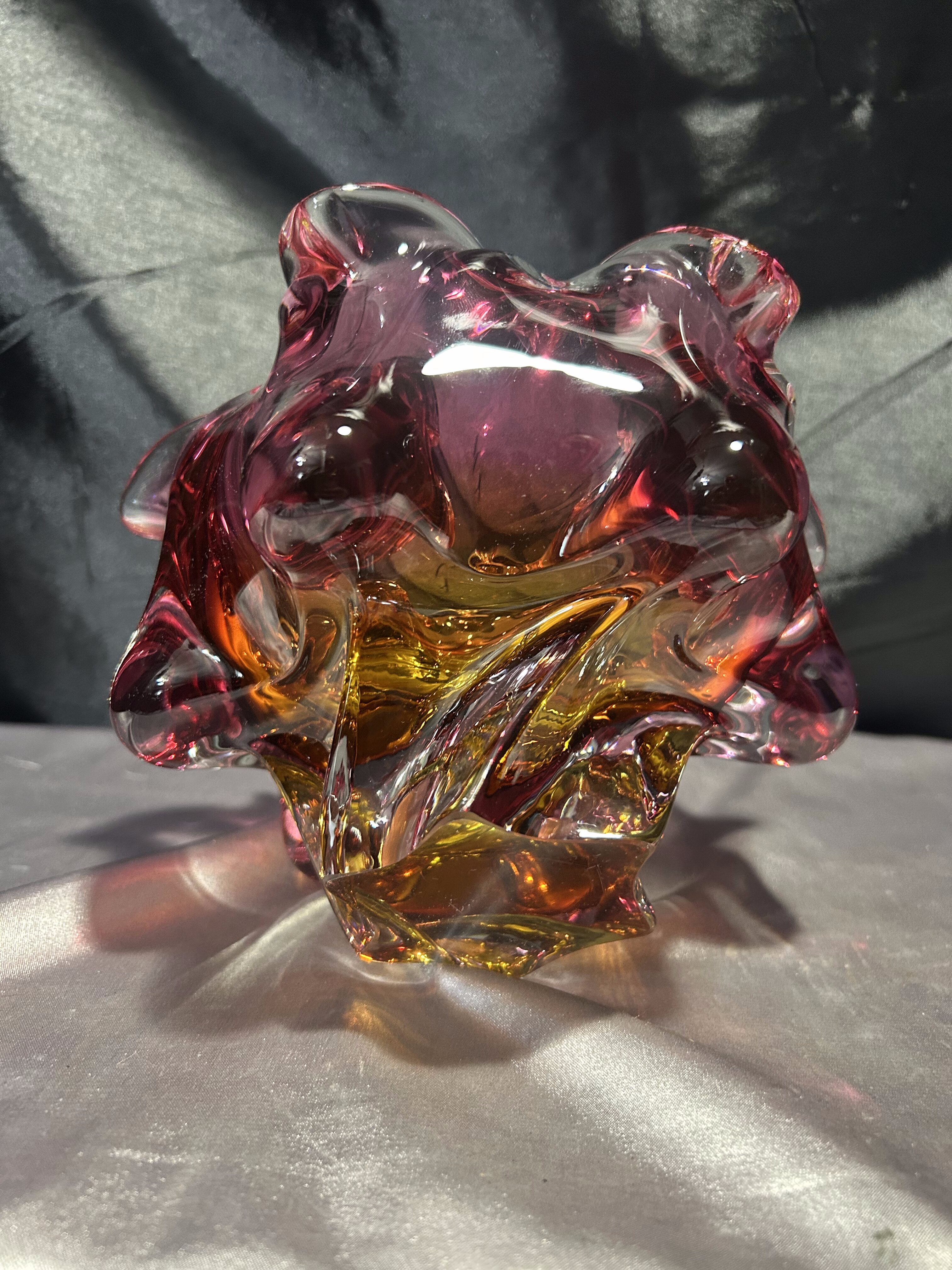 Wyjątkowa czarka dekoracyjna zaprojektowana przez czeskiego artystę Josefa Hospodkę w latach 60. XX wieku. Wykonana z ręcznie formowanego szkła o intensywnych barwach różu i żółci, tworzących efekt płynnego światła i barwy. Nieregularne, falujące krawędzie oraz organiczna forma nadają jej rzeźbiarski charakter.