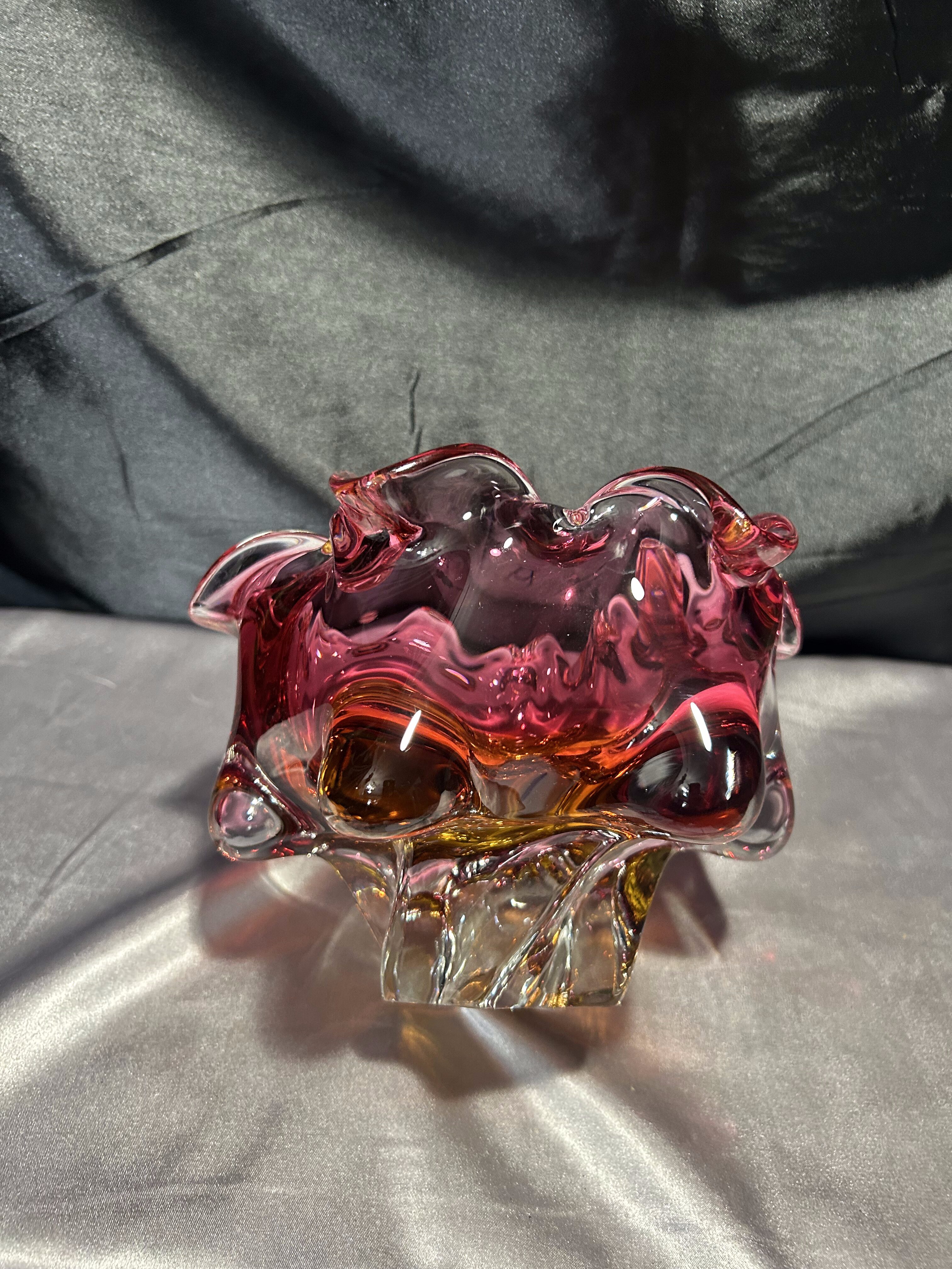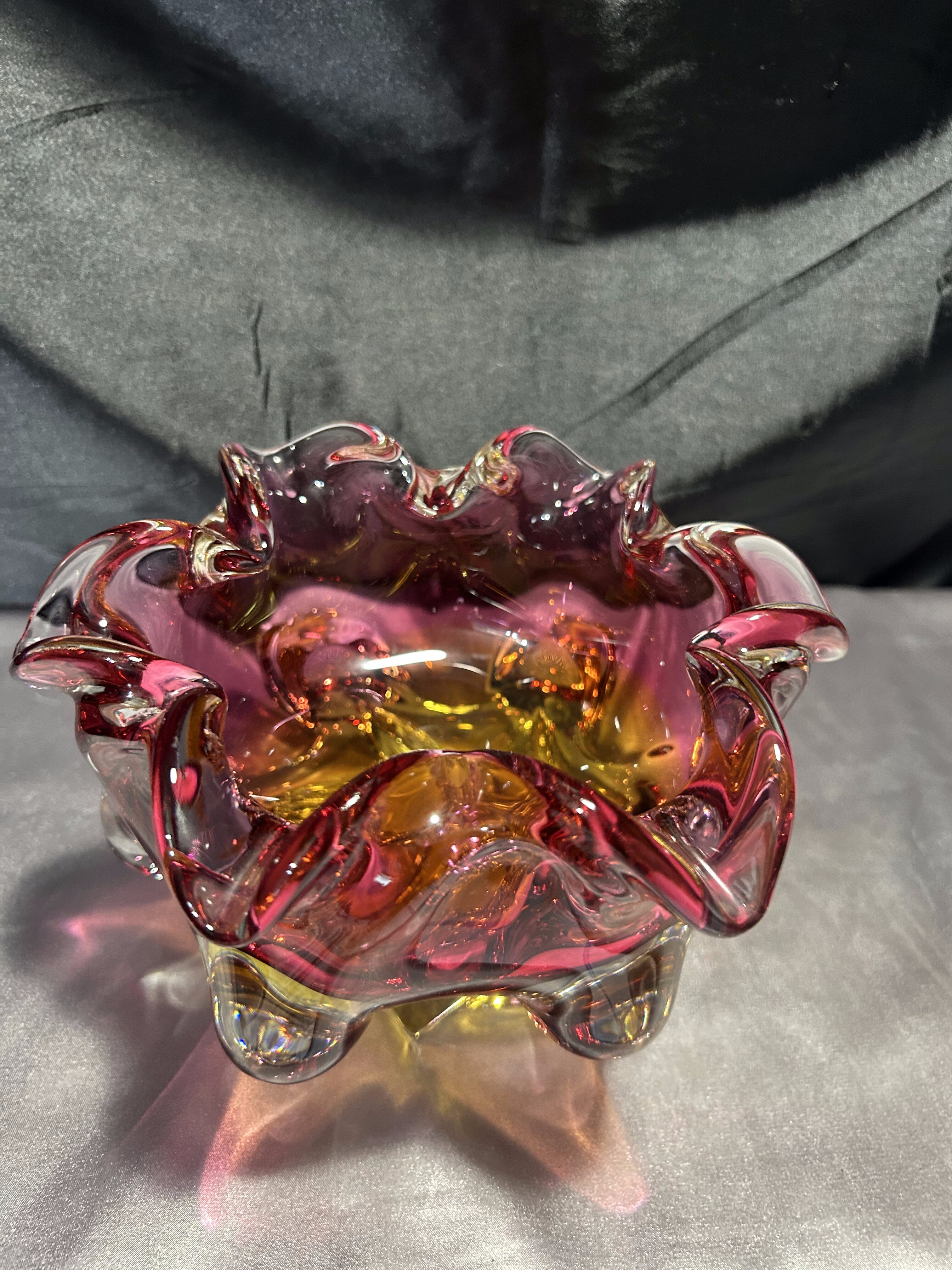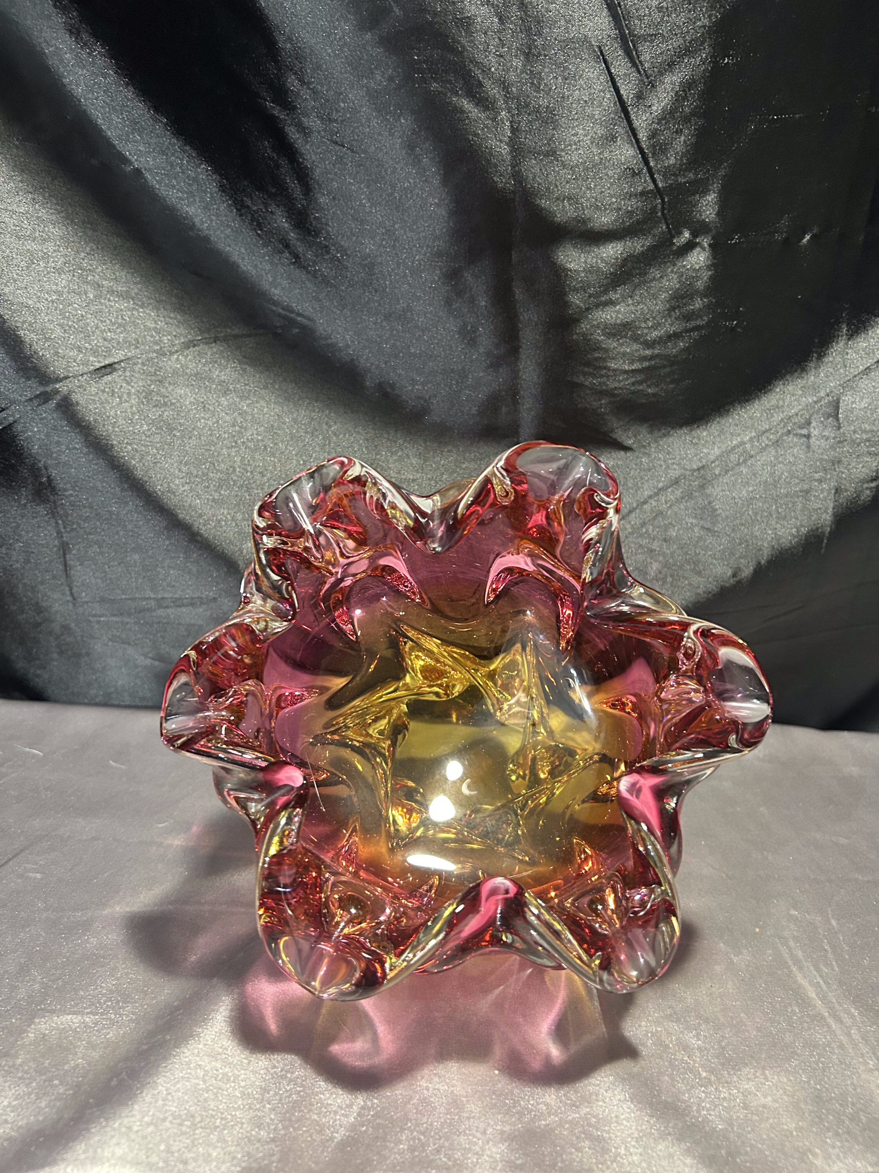 Wyjątkowa czarka dekoracyjna zaprojektowana przez czeskiego artystę Josefa Hospodkę w latach 60. XX wieku. Wykonana z ręcznie formowanego szkła o intensywnych barwach różu i żółci, tworzących efekt płynnego światła i barwy. Nieregularne, falujące krawędzie oraz organiczna forma nadają jej rzeźbiarski charakter.