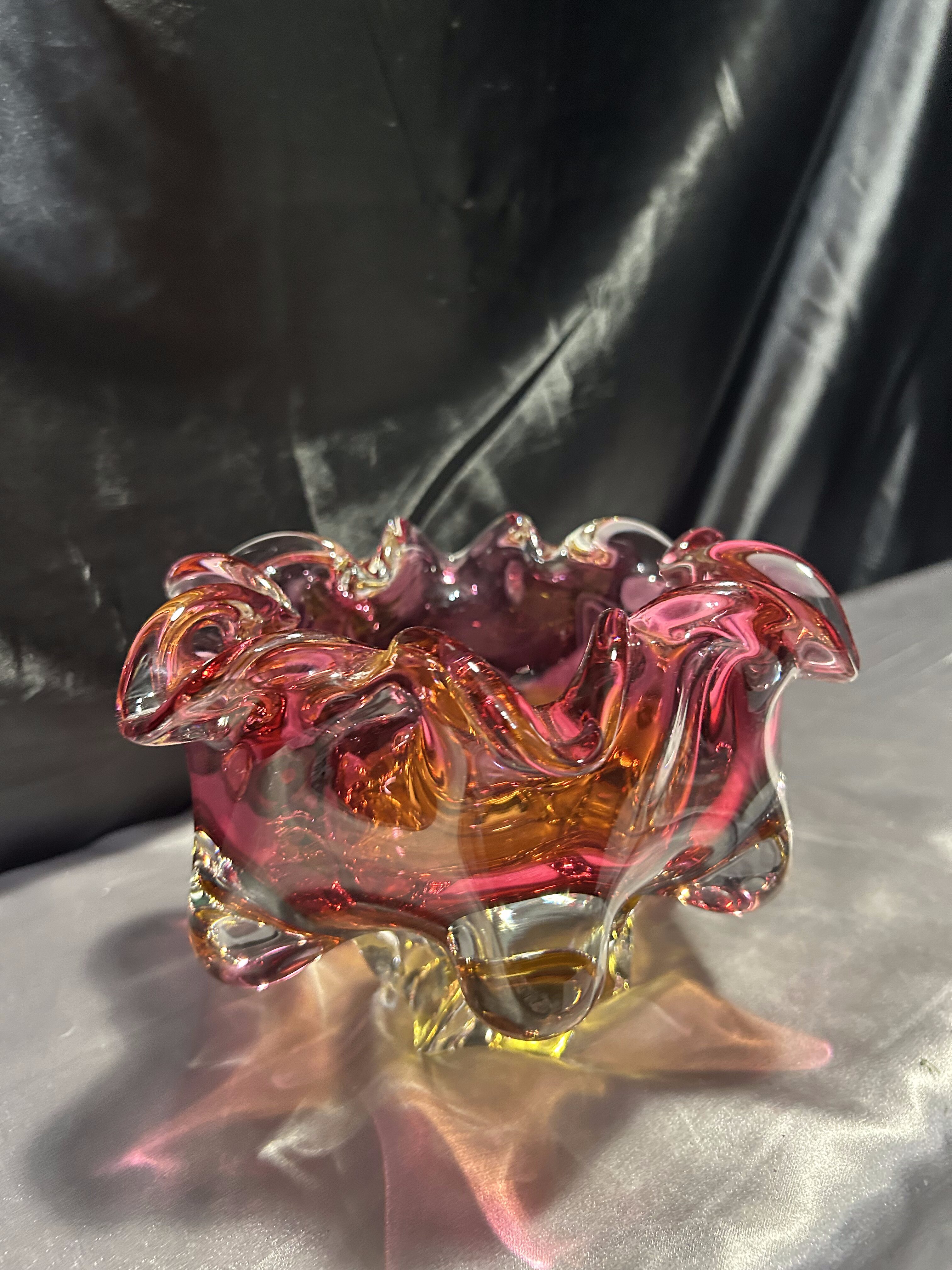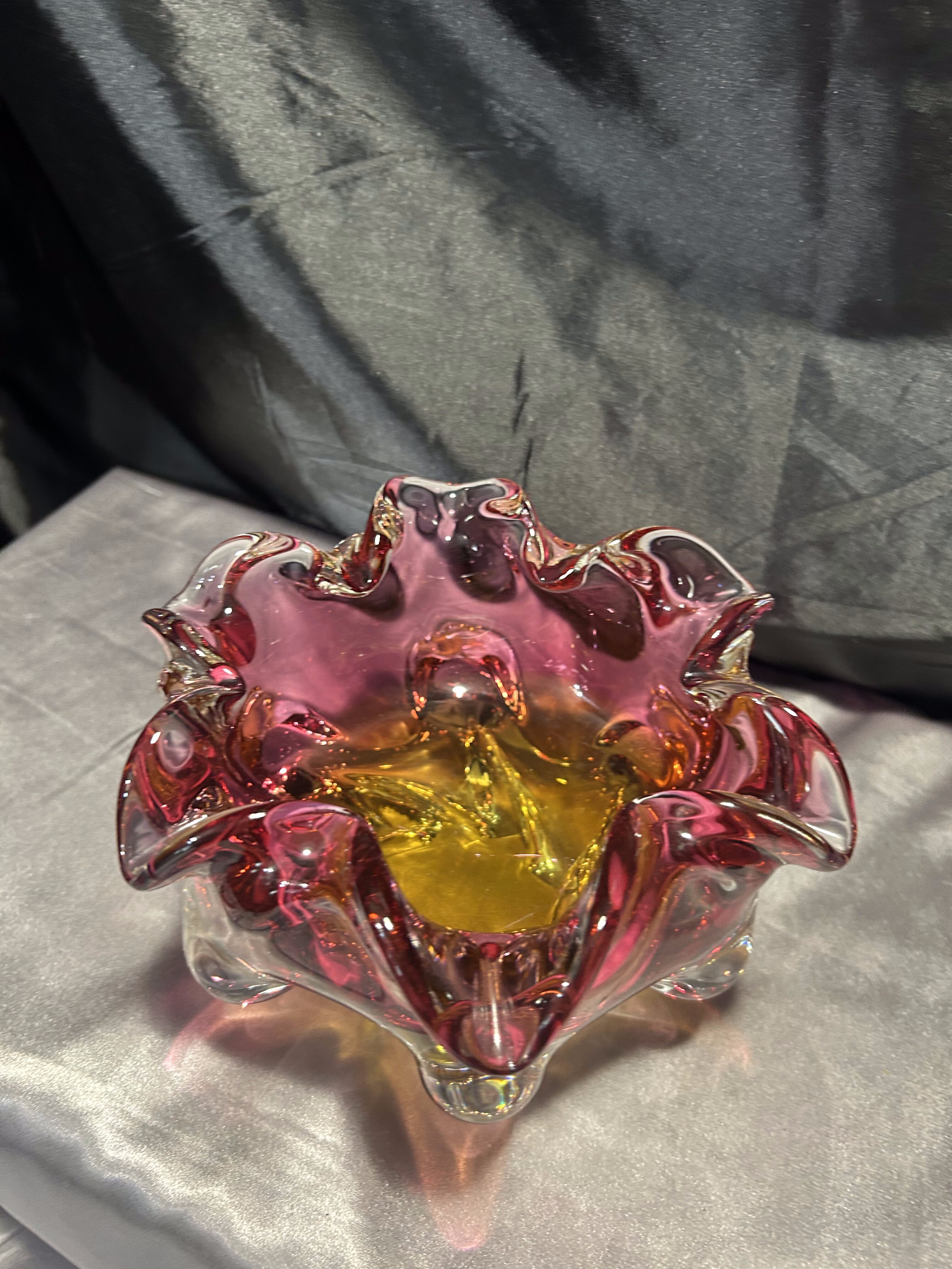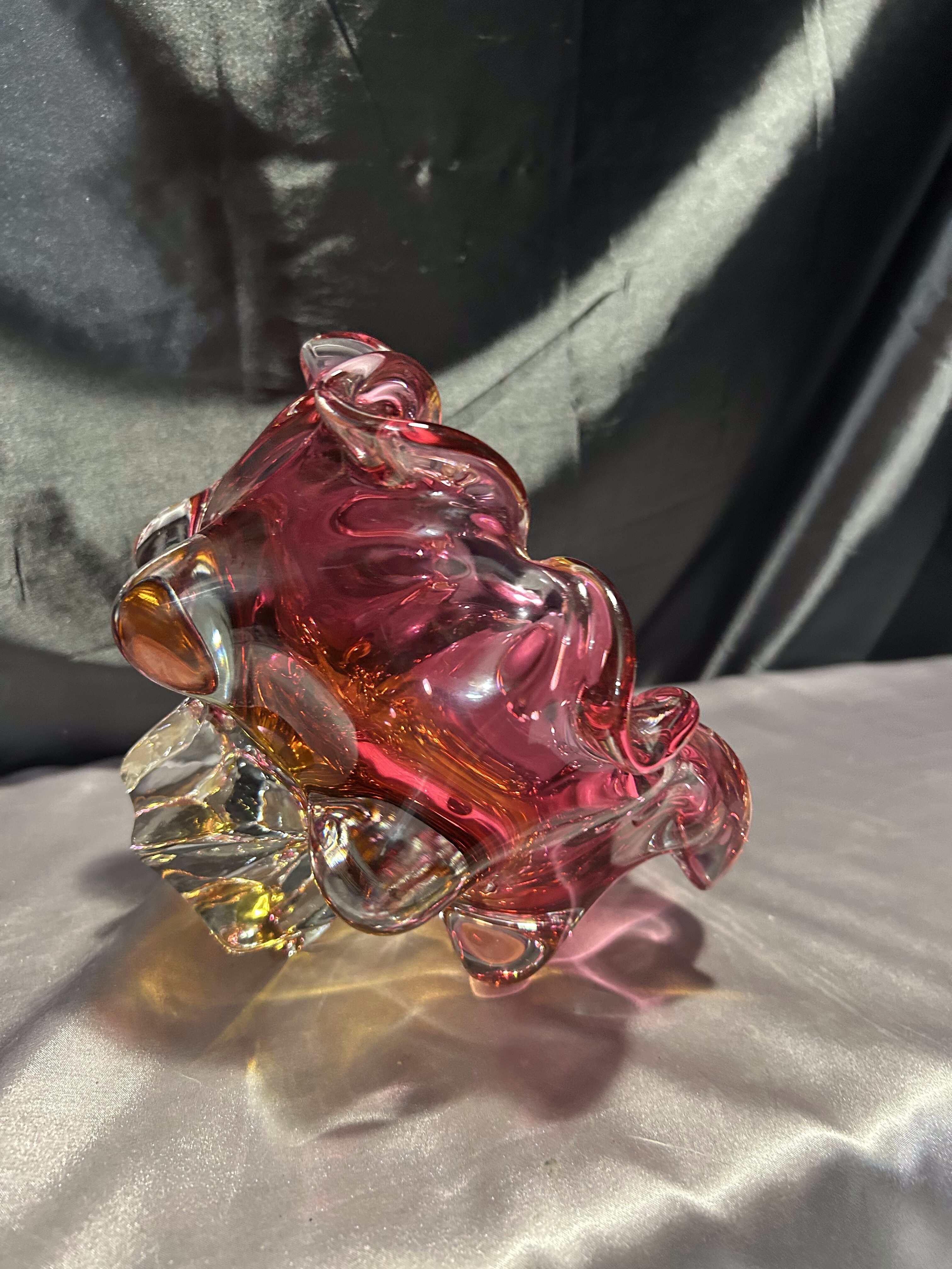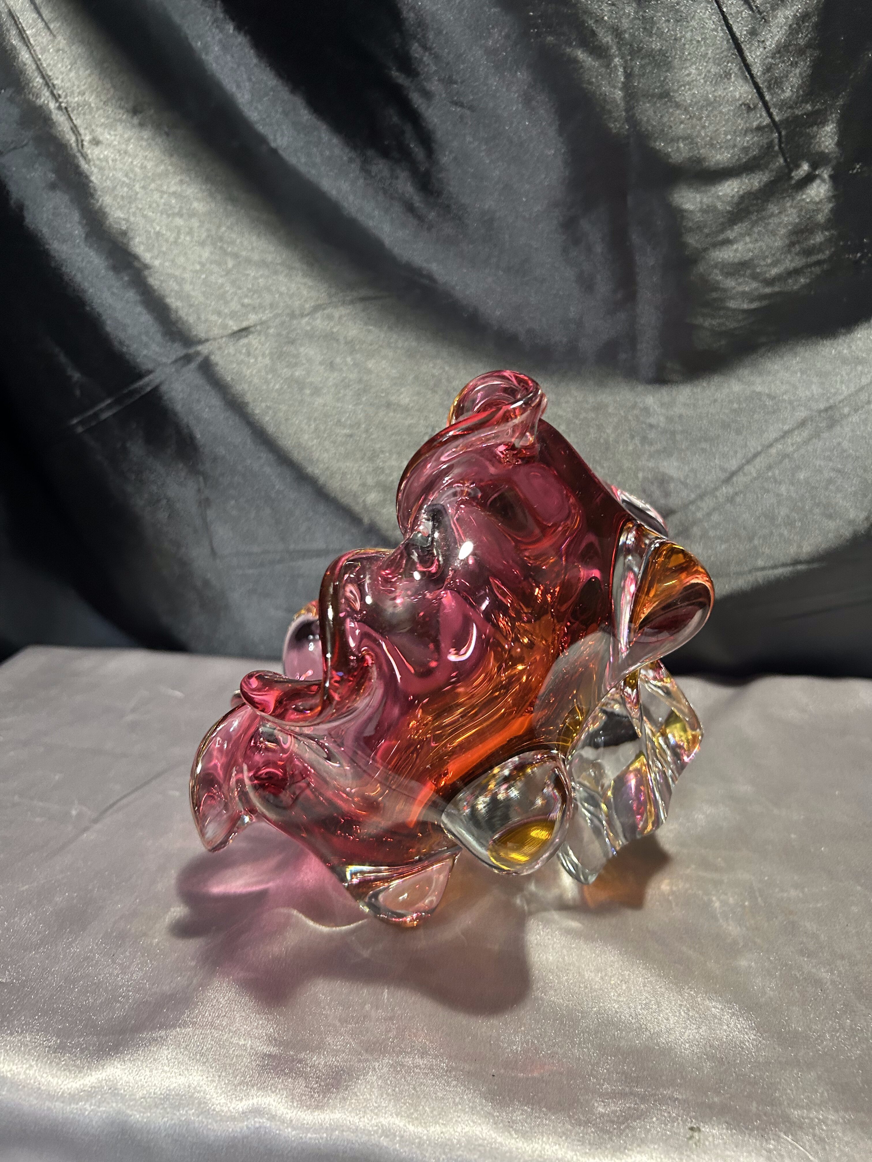 Wyjątkowa czarka dekoracyjna zaprojektowana przez czeskiego artystę Josefa Hospodkę w latach 60. XX wieku. Wykonana z ręcznie formowanego szkła o intensywnych barwach różu i żółci, tworzących efekt płynnego światła i barwy. Nieregularne, falujące krawędzie oraz organiczna forma nadają jej rzeźbiarski charakter.
