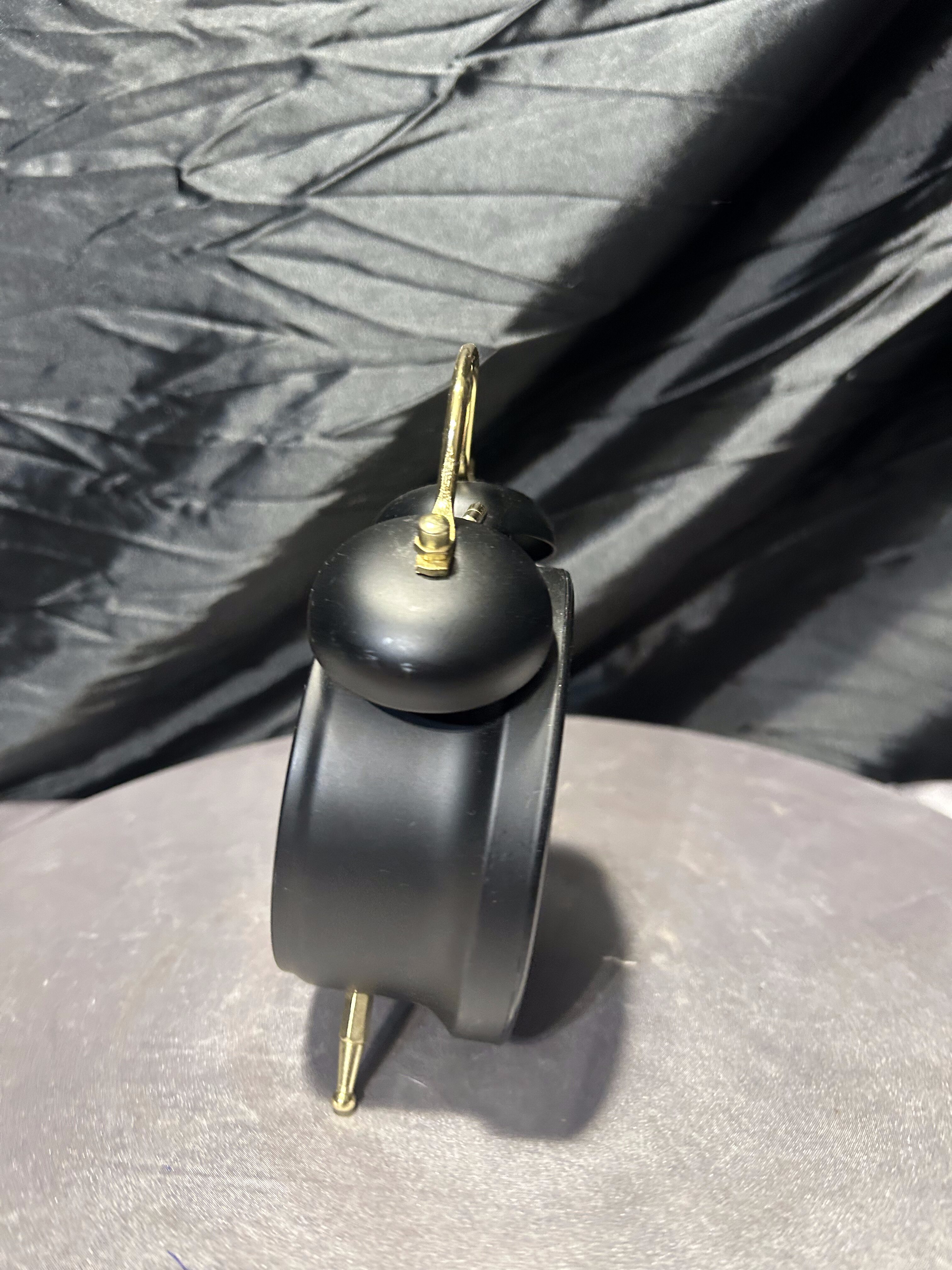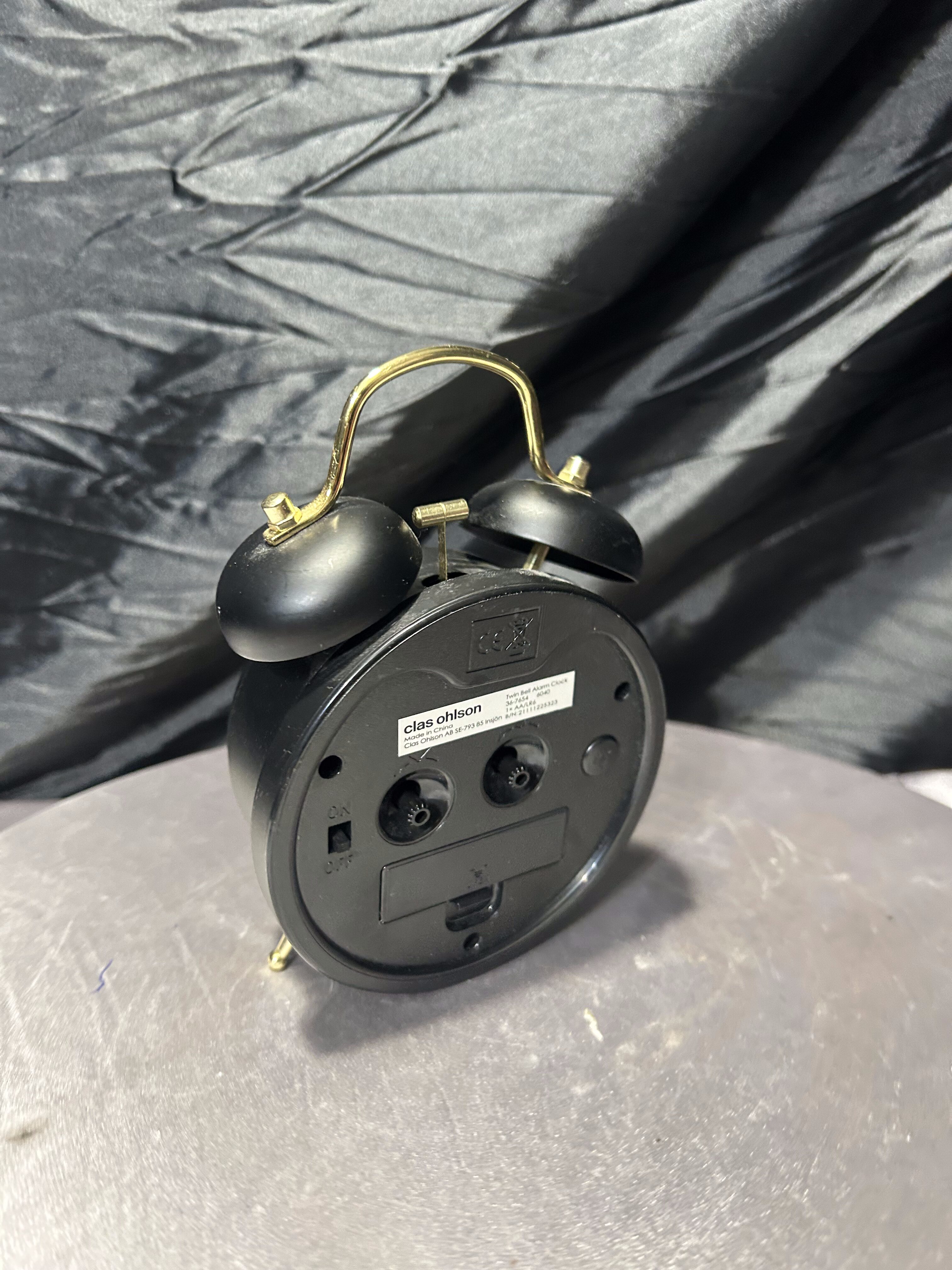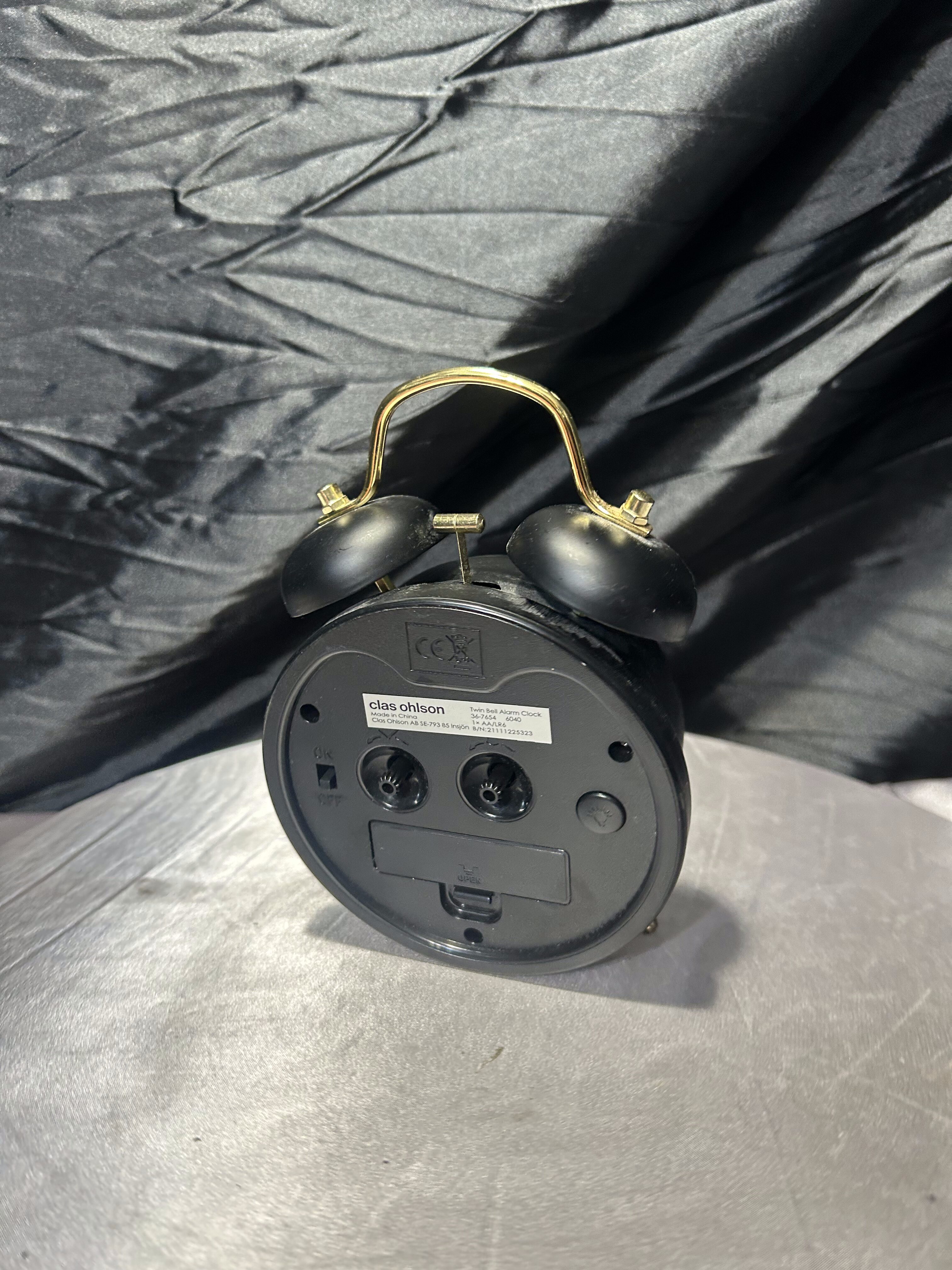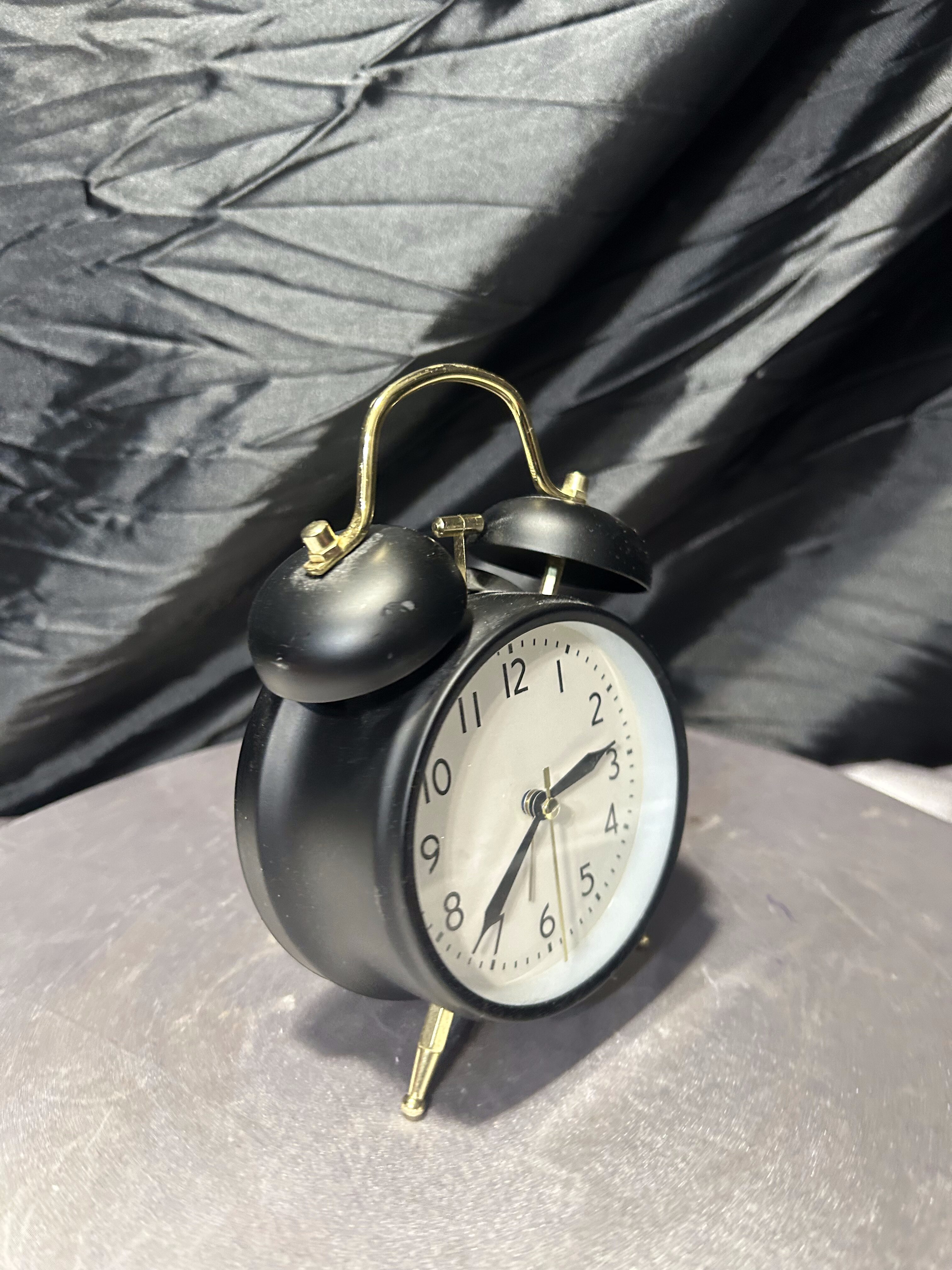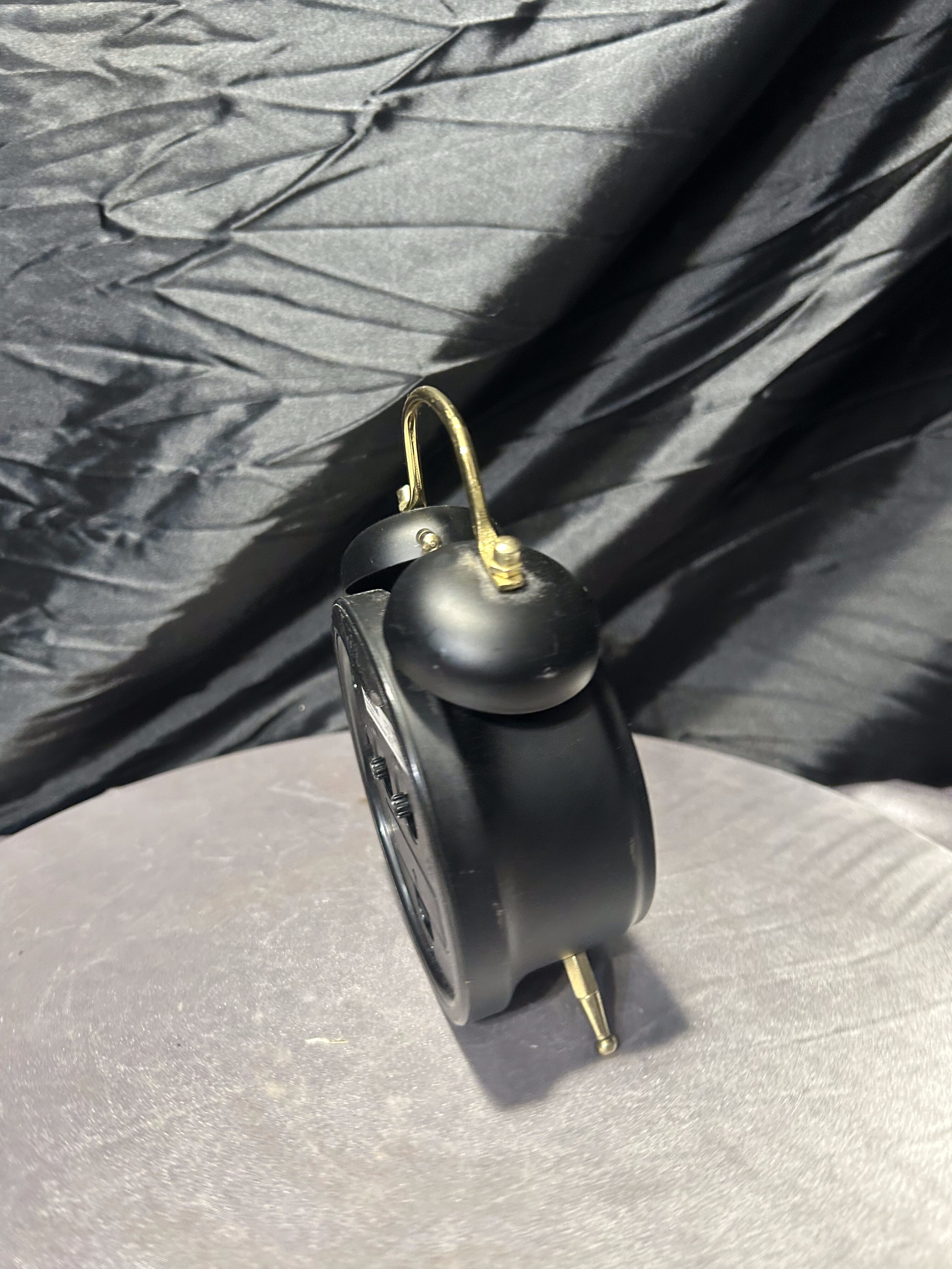 Klasyczny budzik w ponadczasowej formie, utrzymany w eleganckiej czerni z dodatkami w odcieniu złota. Model łączy tradycyjny wygląd z nowoczesną funkcjonalnością – działa na baterię, a jednocześnie posiada elementy mechaniczne nawiązujące do dawnych budzików nakręcanych.
