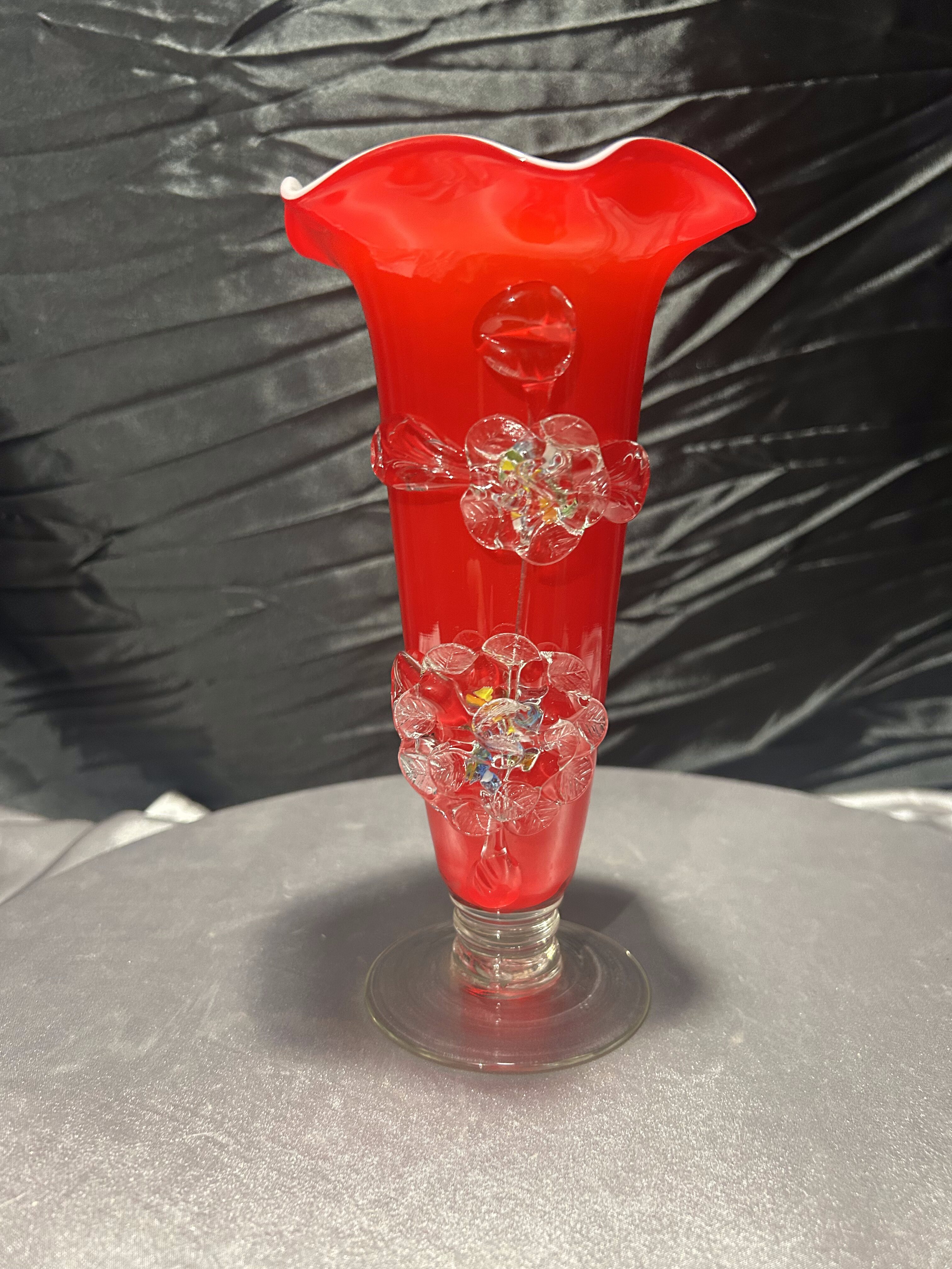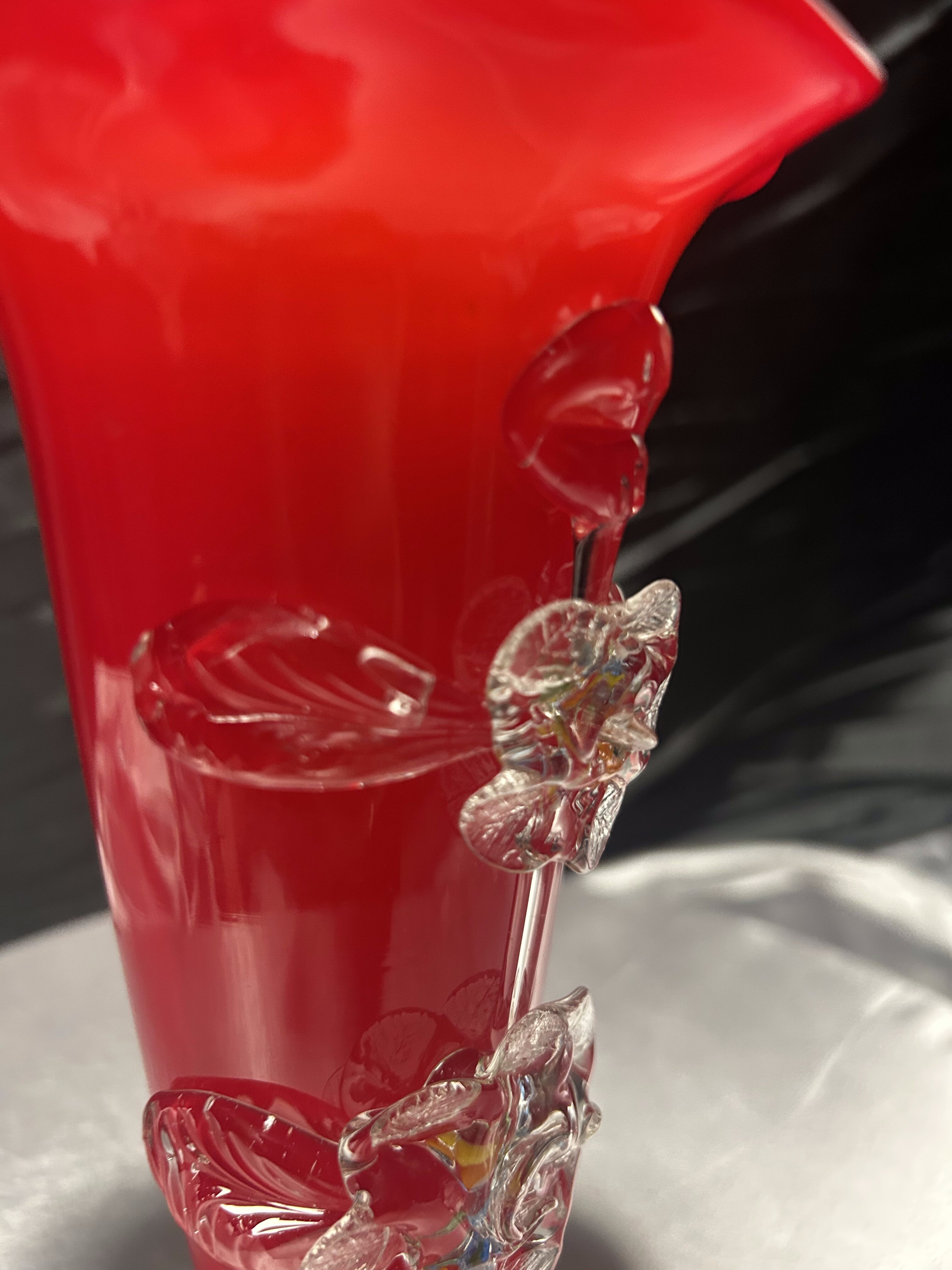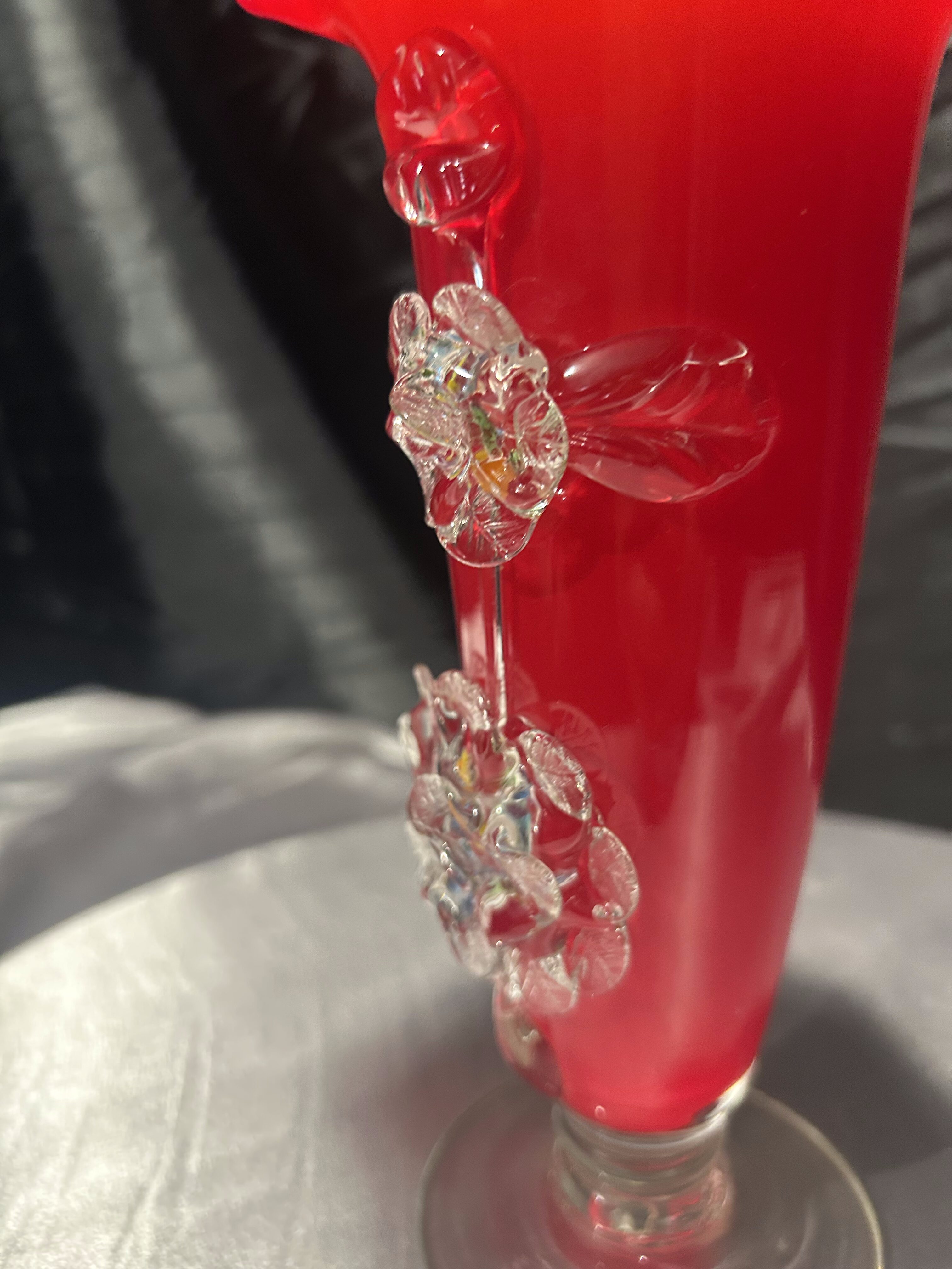 - Czerwony flakon z aplikacjami kwiatowymi ze szkła – włoski styl artystyczny