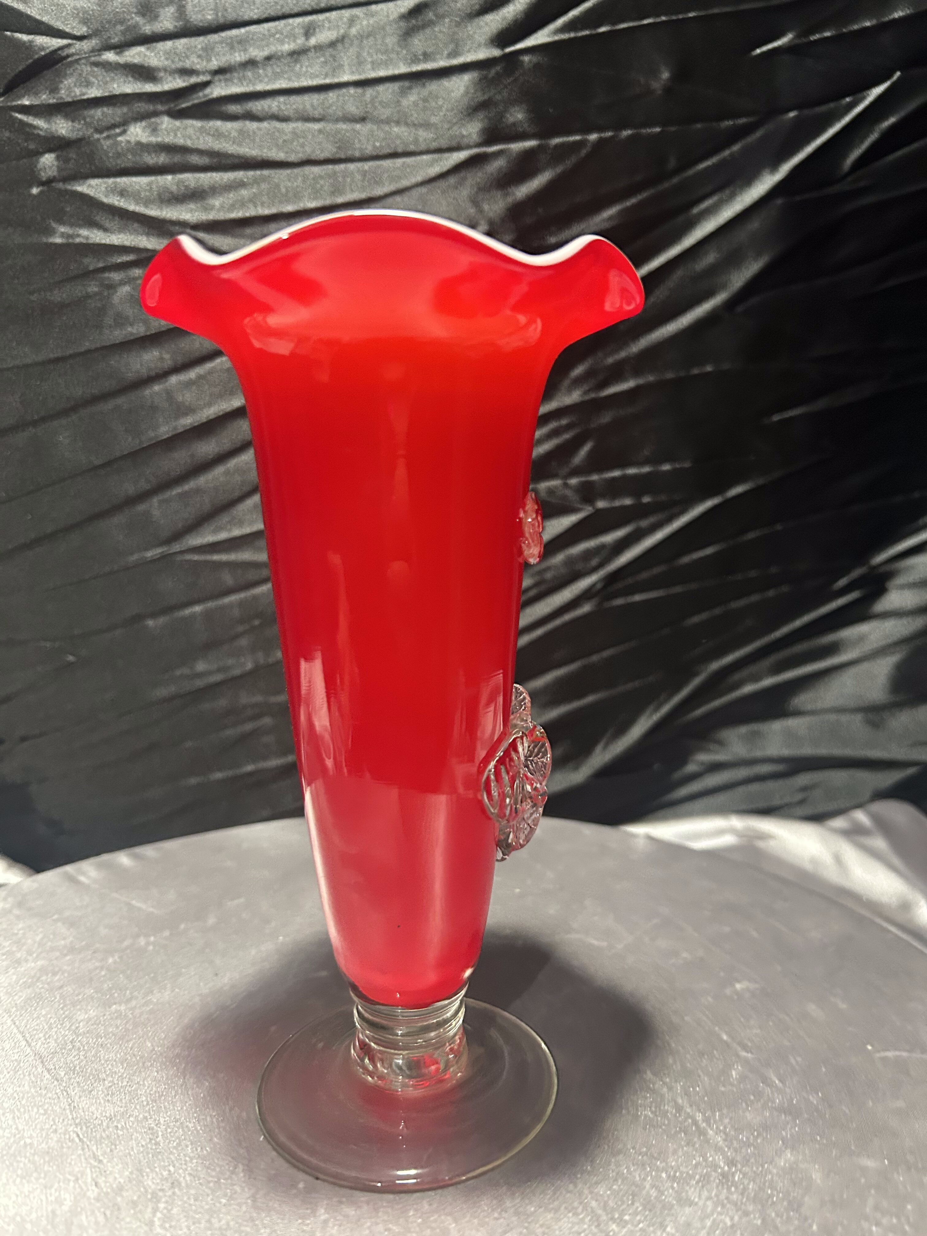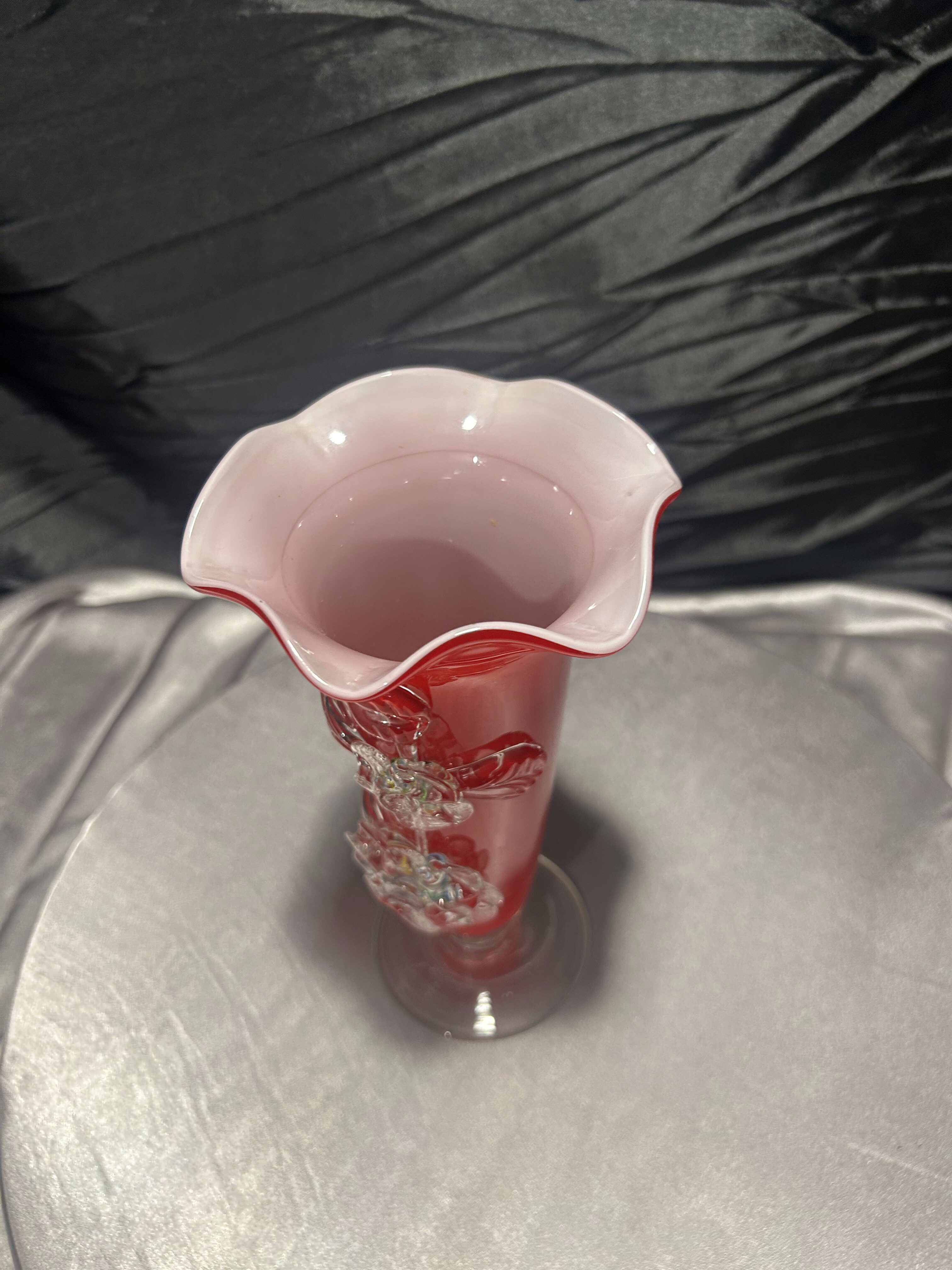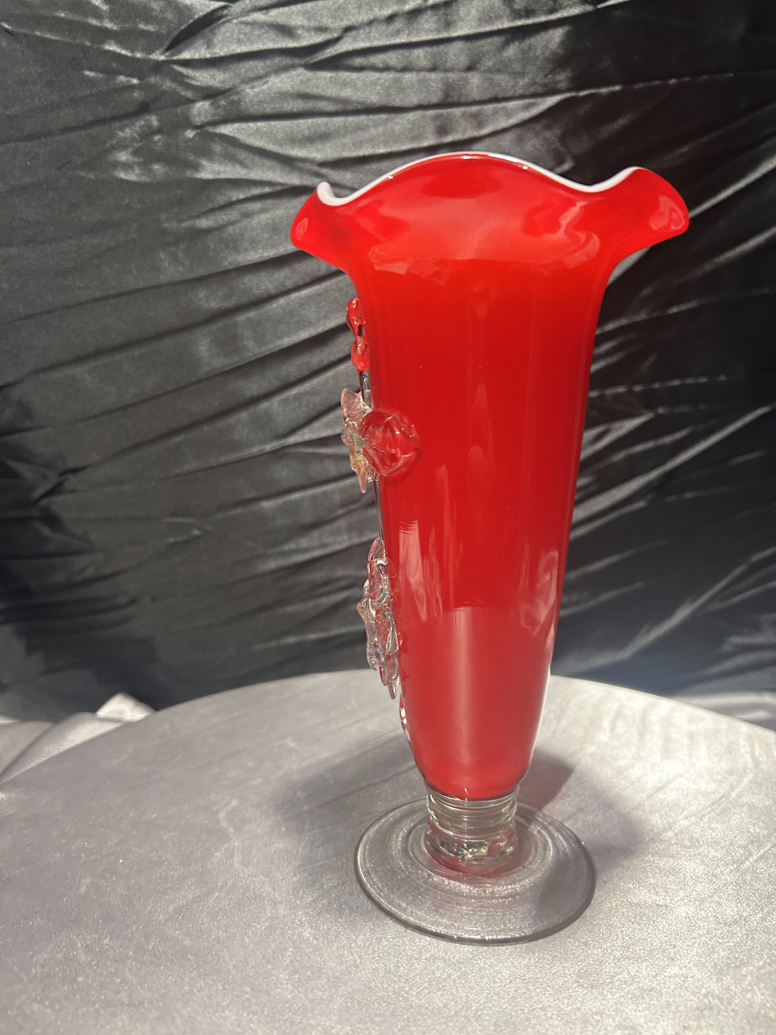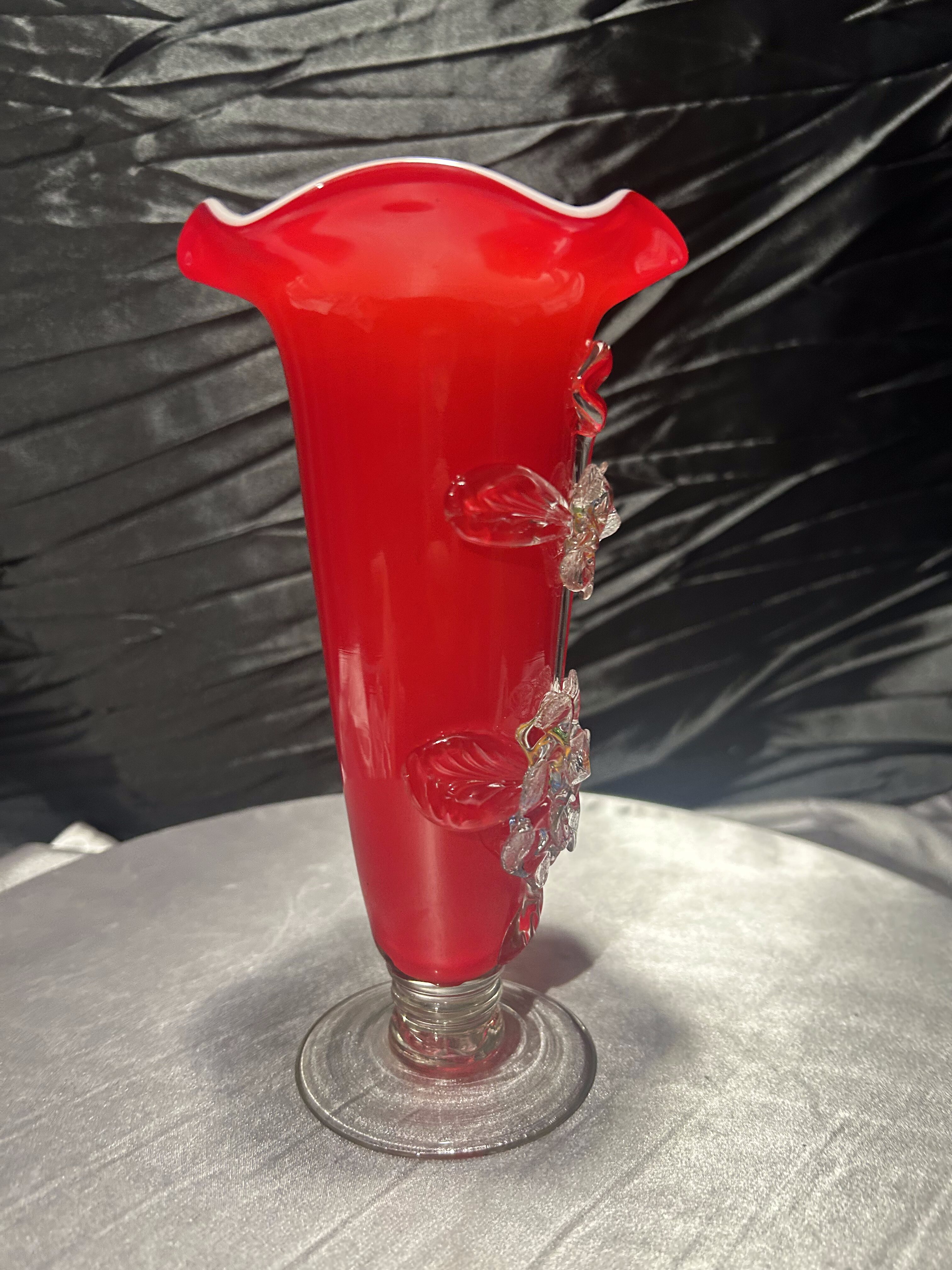 - Czerwony flakon z aplikacjami kwiatowymi ze szkła – włoski styl artystyczny