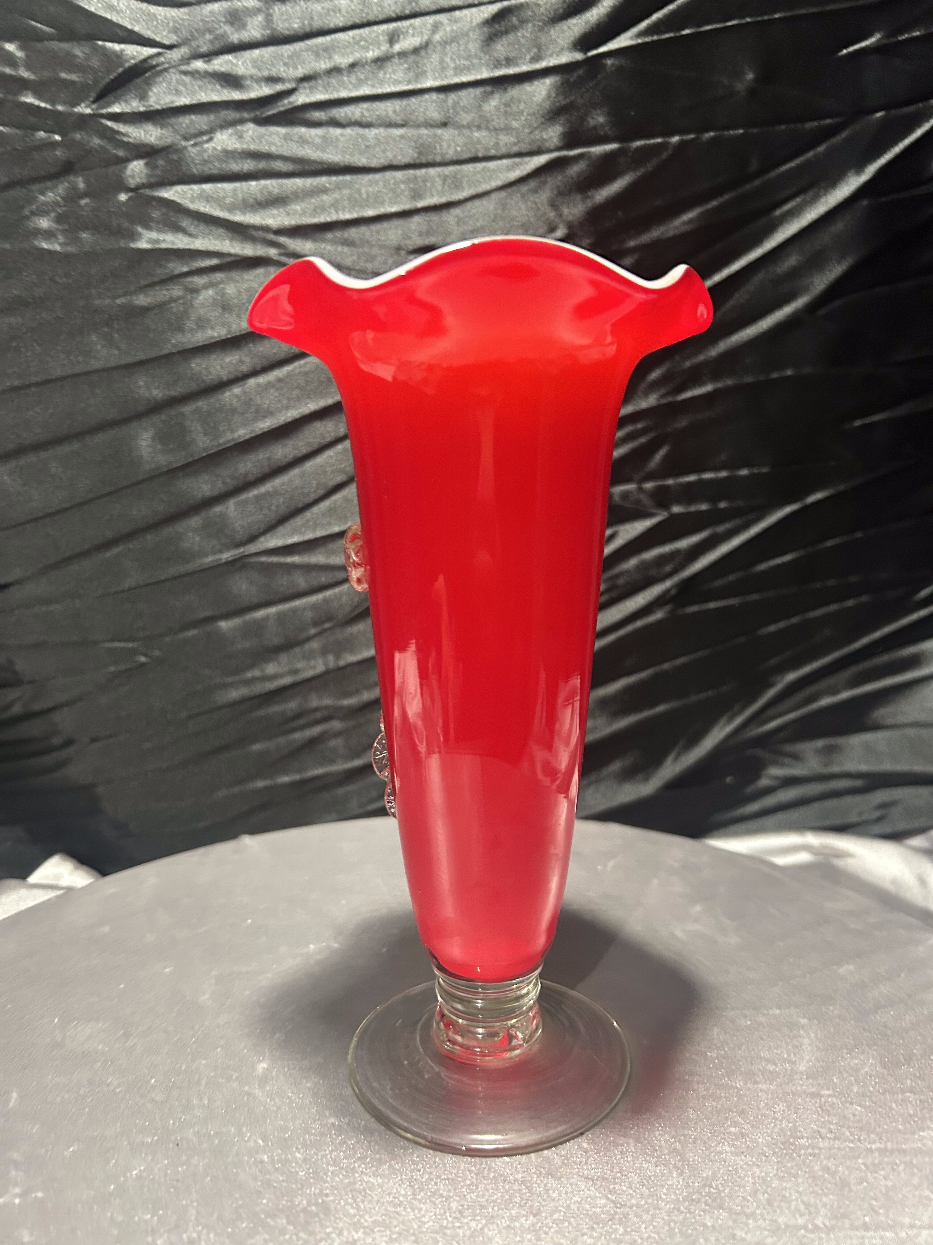 Wyjątkowy flakon w intensywnie czerwonym kolorze, ozdobiony misternymi aplikacjami w formie przezroczystych, szklanych kwiatów. Wykonany z dbałością o każdy detal, zachwyca elegancką formą i pięknym kontrastem barw. Charakterystyczna falbanka w górnej części naczynia dodaje mu lekkości i artystycznego uroku. Idealny jako dekoracja wnętrza, która wprowadzi odrobinę luksusu i koloru do przestrzeni.