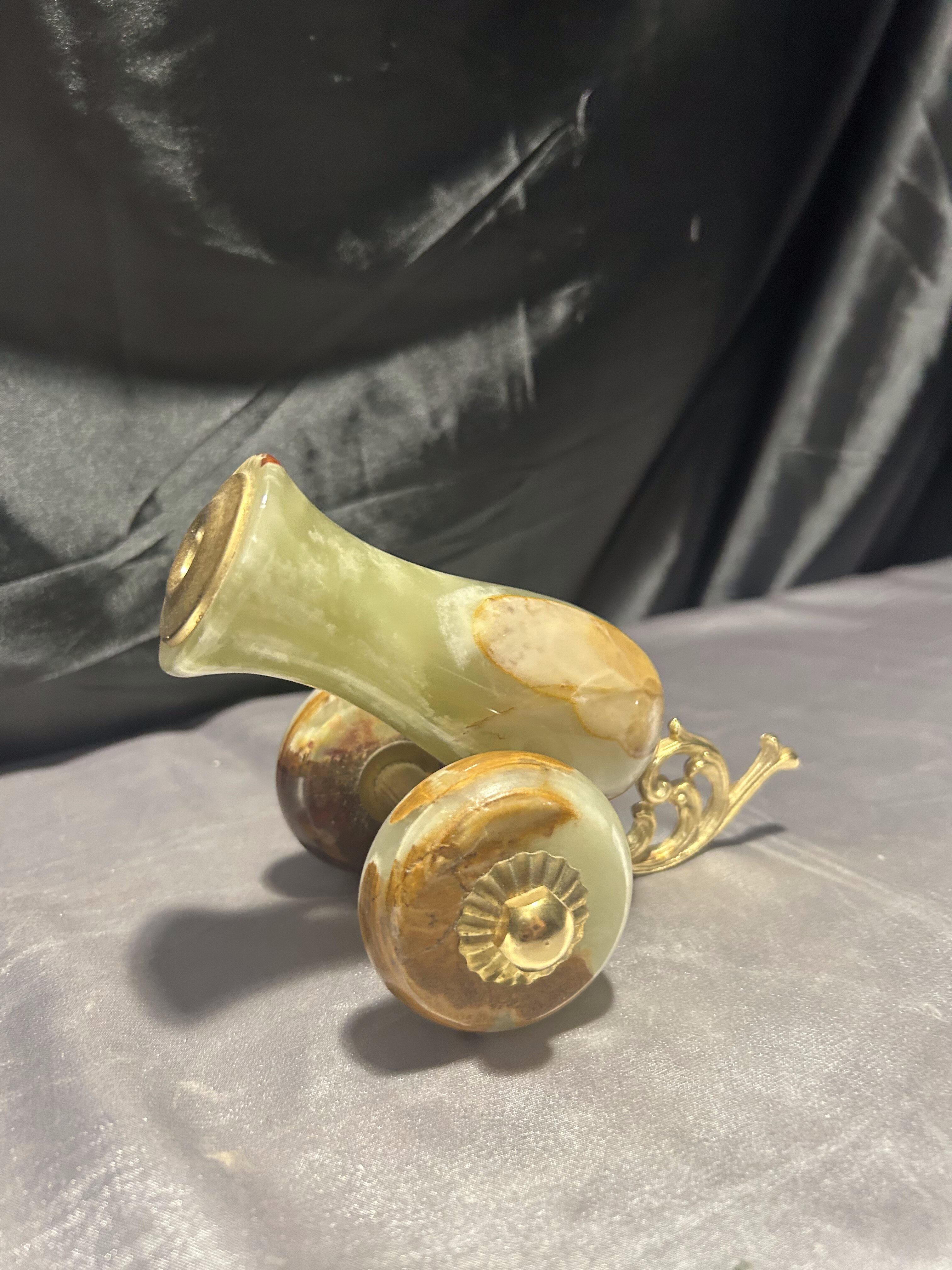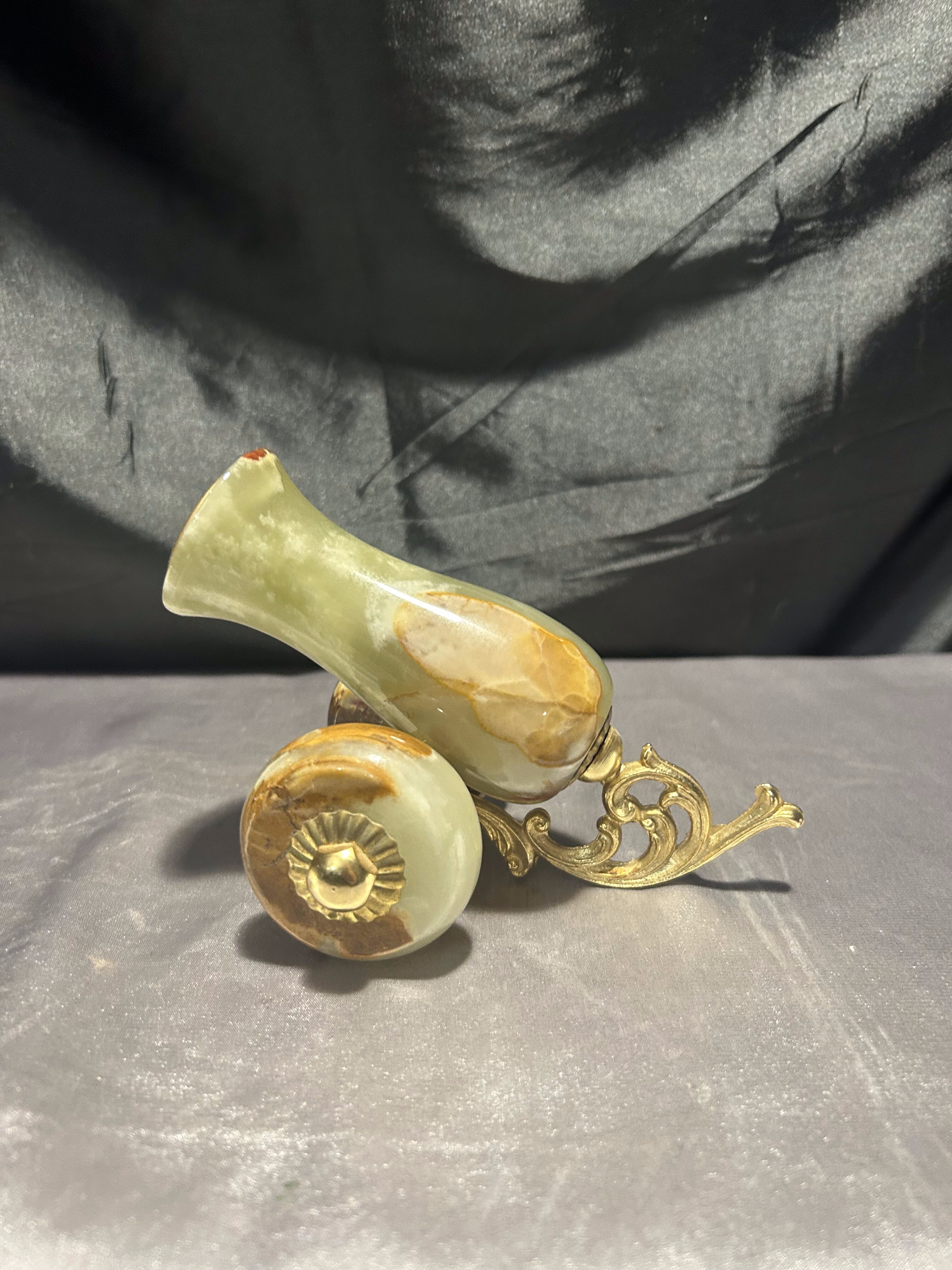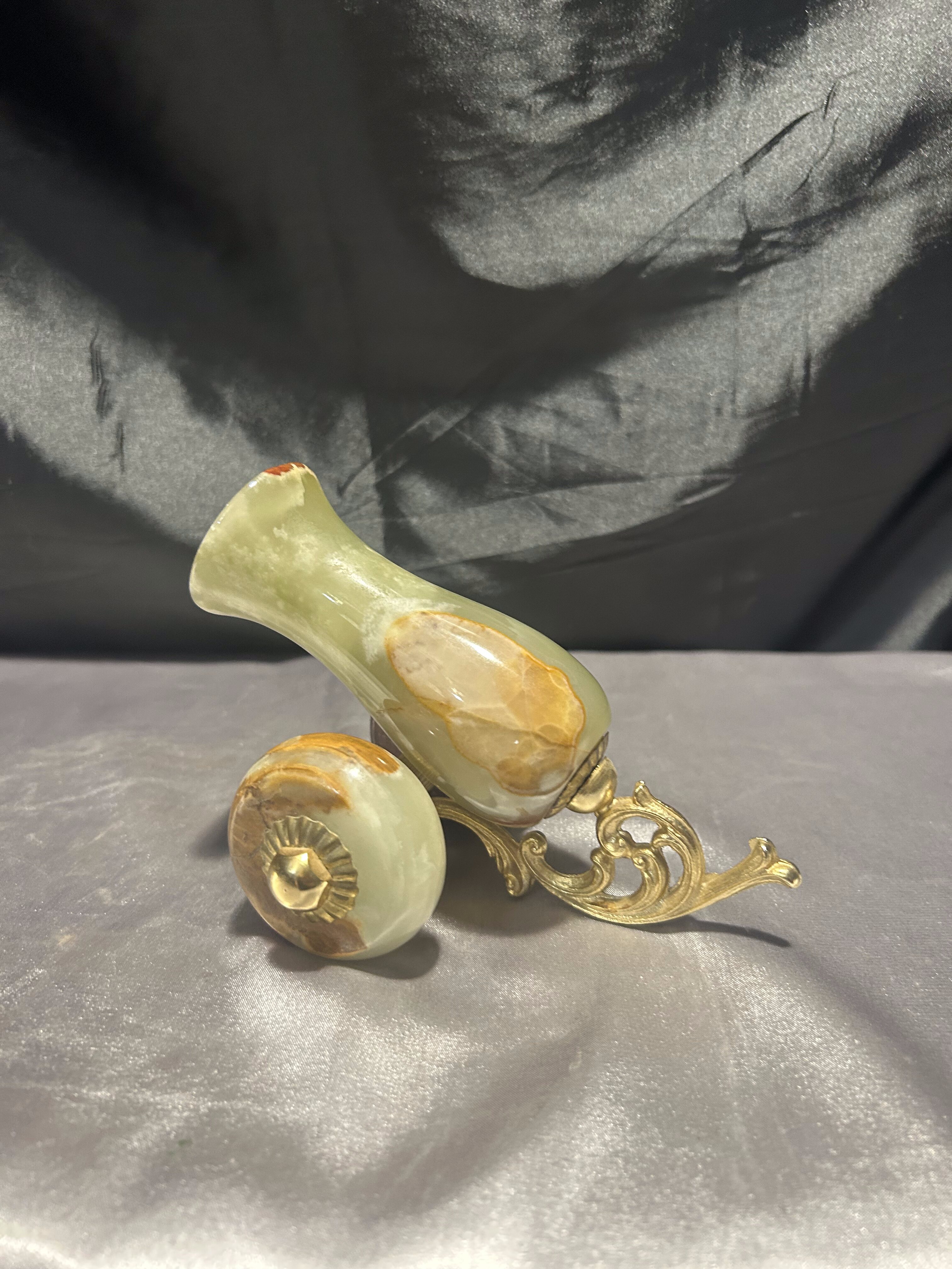Efektowna figurka w formie armaty, wykonana z naturalnego onyksu w odcieniach zieleni i bursztynu, osadzona na bogato zdobionej podstawie z mosiądzu. Przedmiot łączy funkcję ozdobną z praktycznym zastosowaniem – otwór w lufie pozwala wykorzystać go jako elegancki stojak na pióro lub długopis.