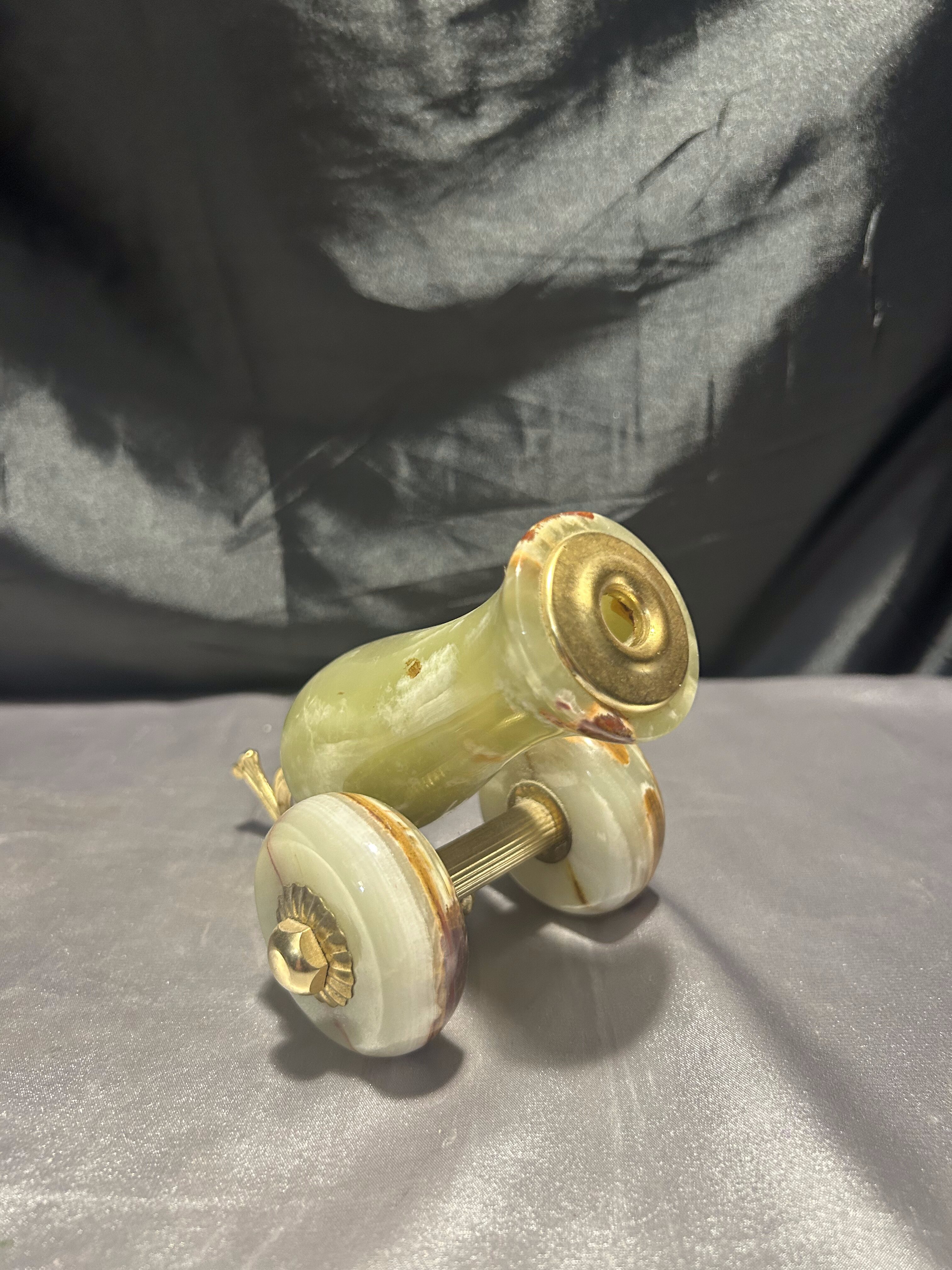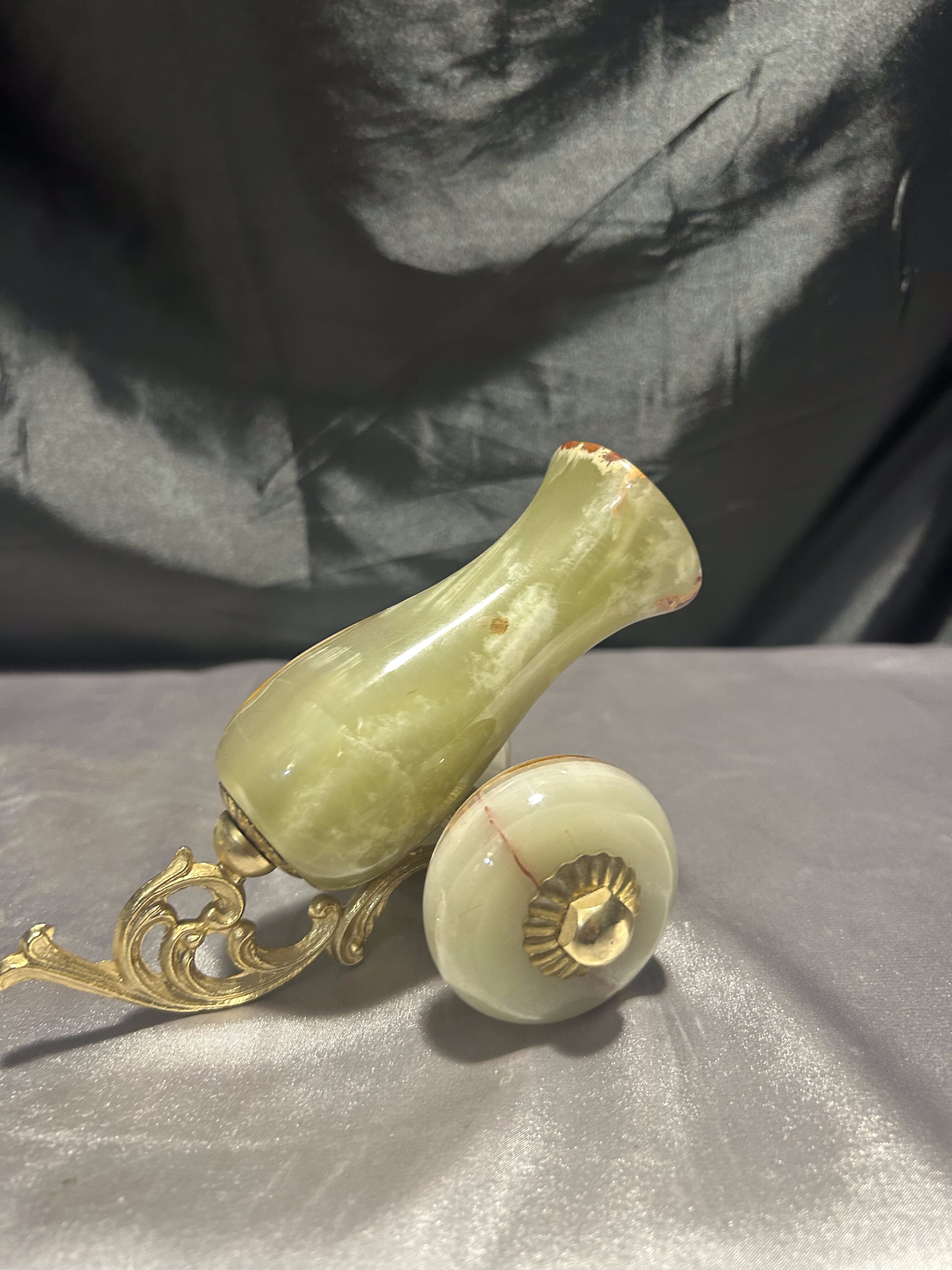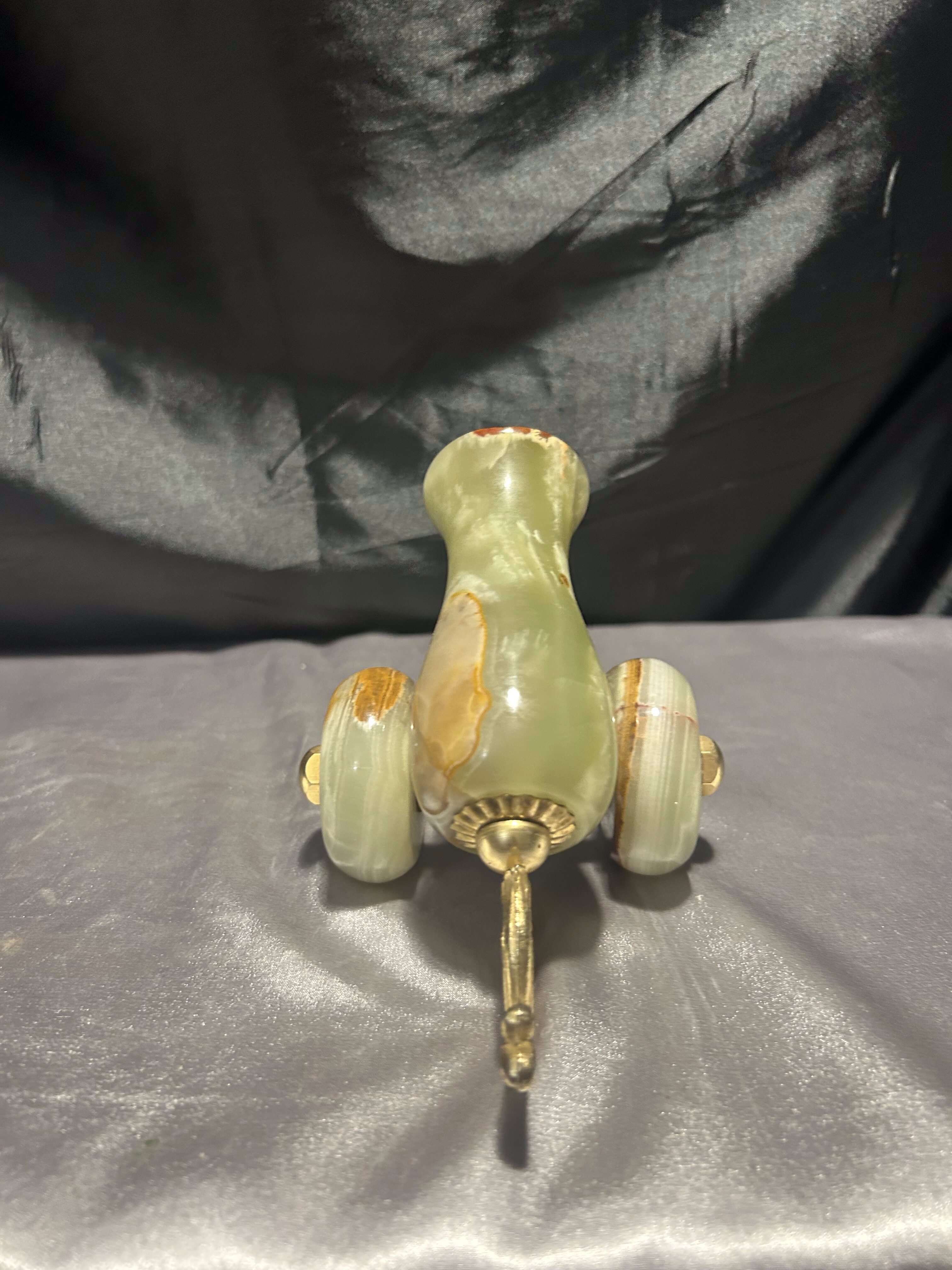Efektowna figurka w formie armaty, wykonana z naturalnego onyksu w odcieniach zieleni i bursztynu, osadzona na bogato zdobionej podstawie z mosiądzu. Przedmiot łączy funkcję ozdobną z praktycznym zastosowaniem – otwór w lufie pozwala wykorzystać go jako elegancki stojak na pióro lub długopis.