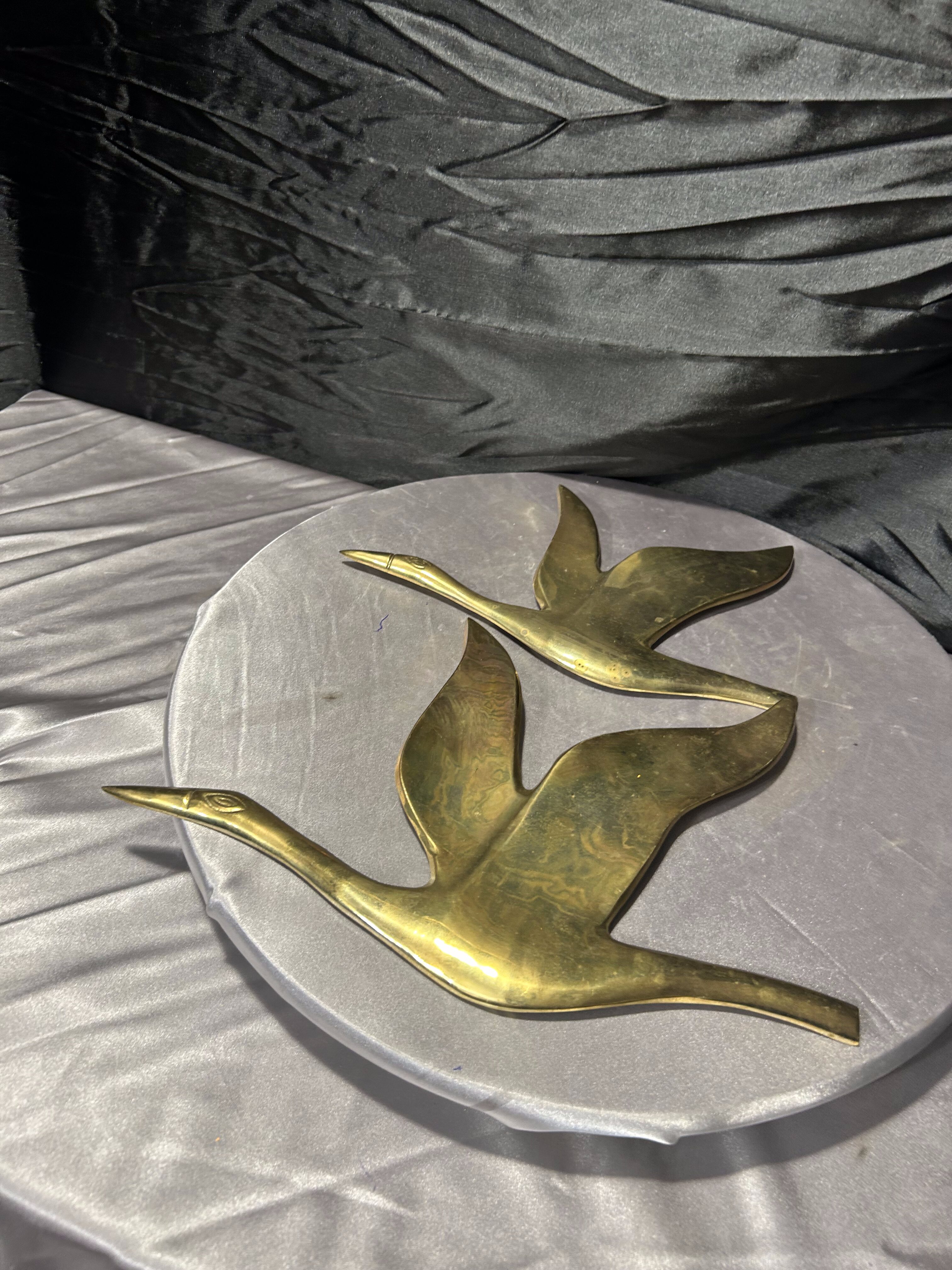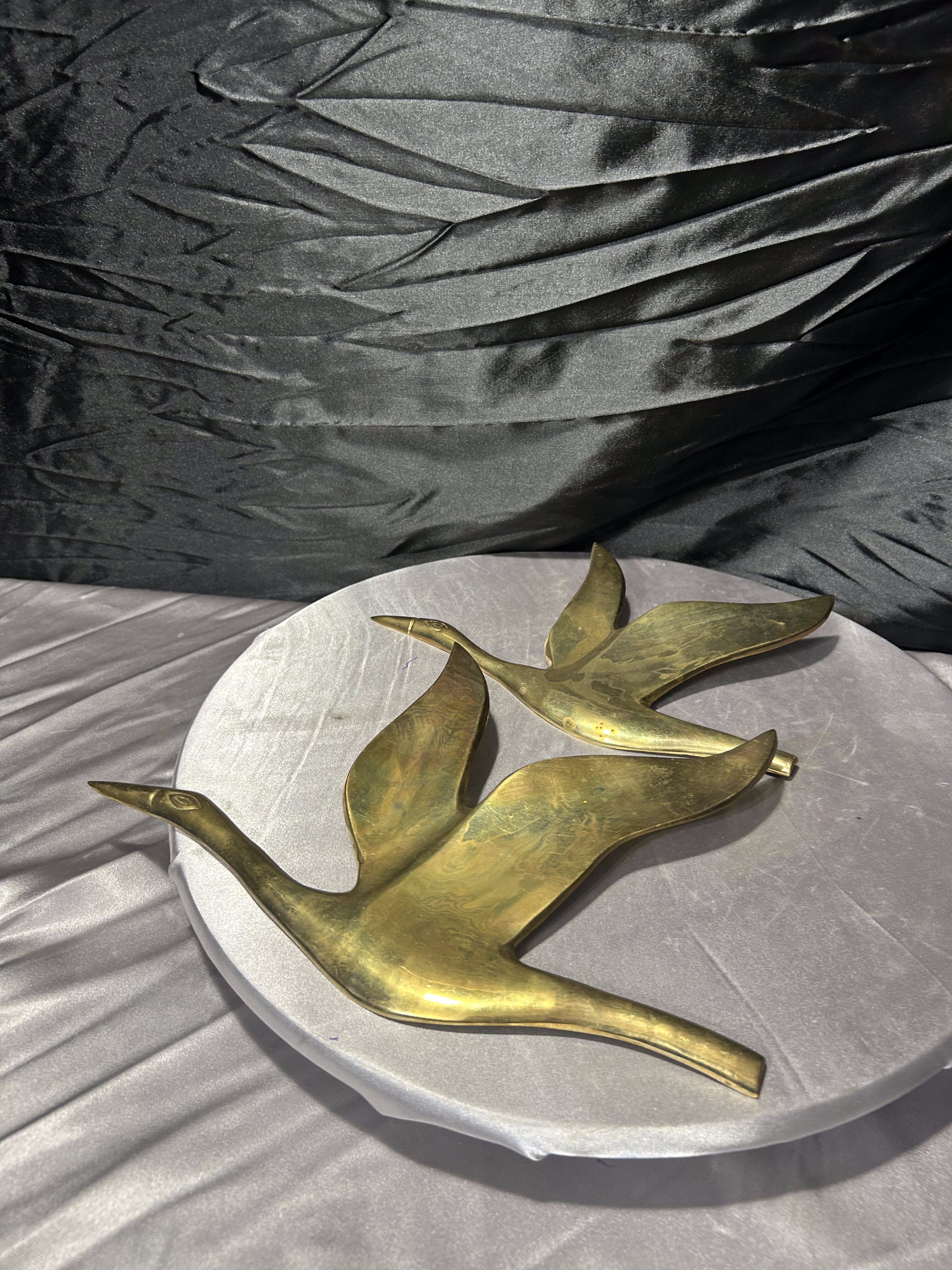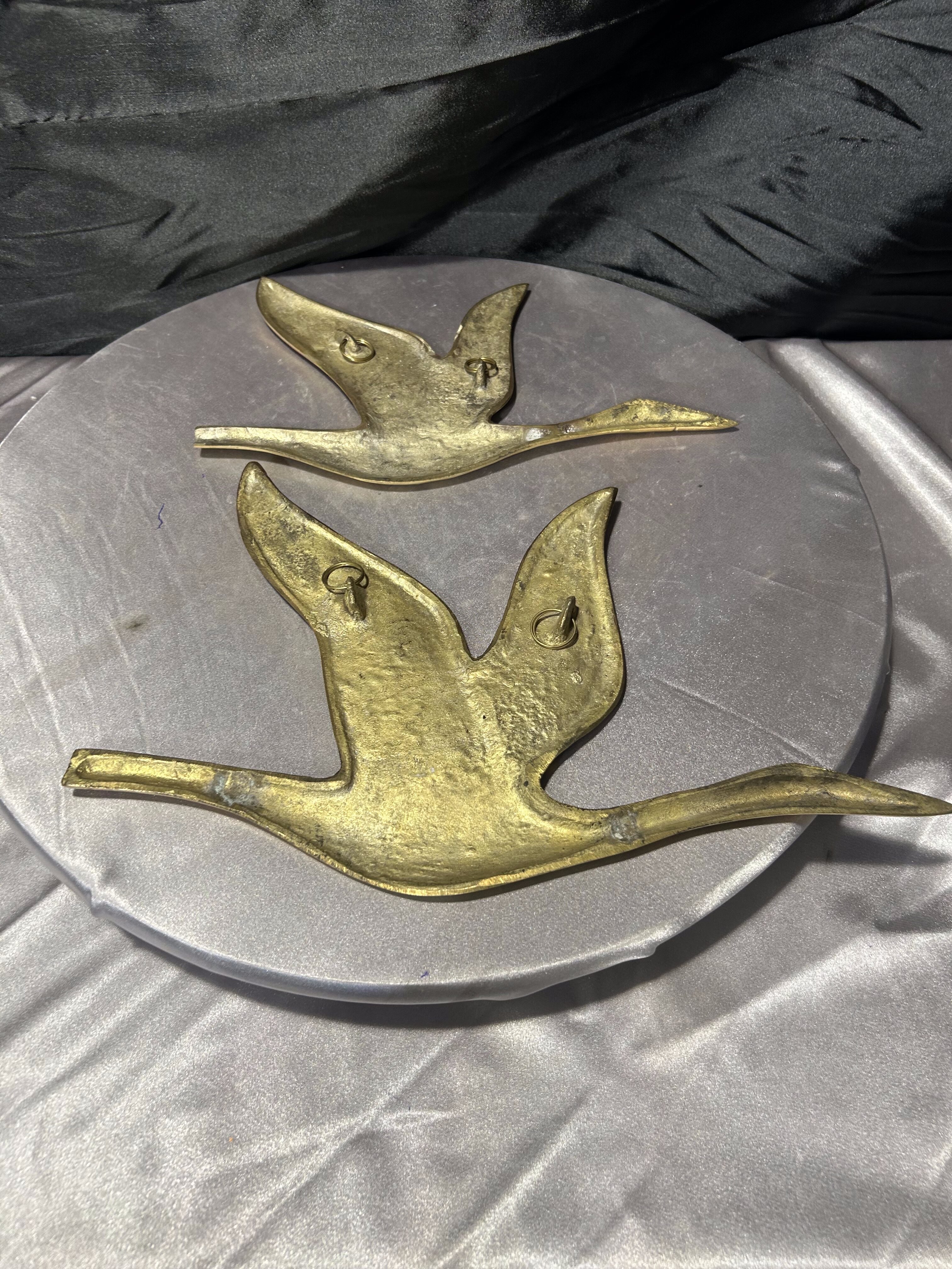 Przedmiotem oferty jest przepiękny zestaw dwóch ściennych zawieszek wykonanych z litego mosiądzu, przedstawiających kaczki w locie. Każda z figur jest osobnym elementem, co pozwala na dowolną aranżację na ścianie – można je powiesić obok siebie, w pionie lub pod skosem, tworząc dynamiczną kompozycję. Kaczki charakteryzują się elegancką, smukłą linią oraz gładką, polerowaną powierzchnią, która pięknie odbija światło, nadając wnętrzu luksusowego charakteru. To klasyczna i ponadczasowa dekoracja, która doskonale wpisuje się w styl skandynawski, vintage oraz gabinetowy.