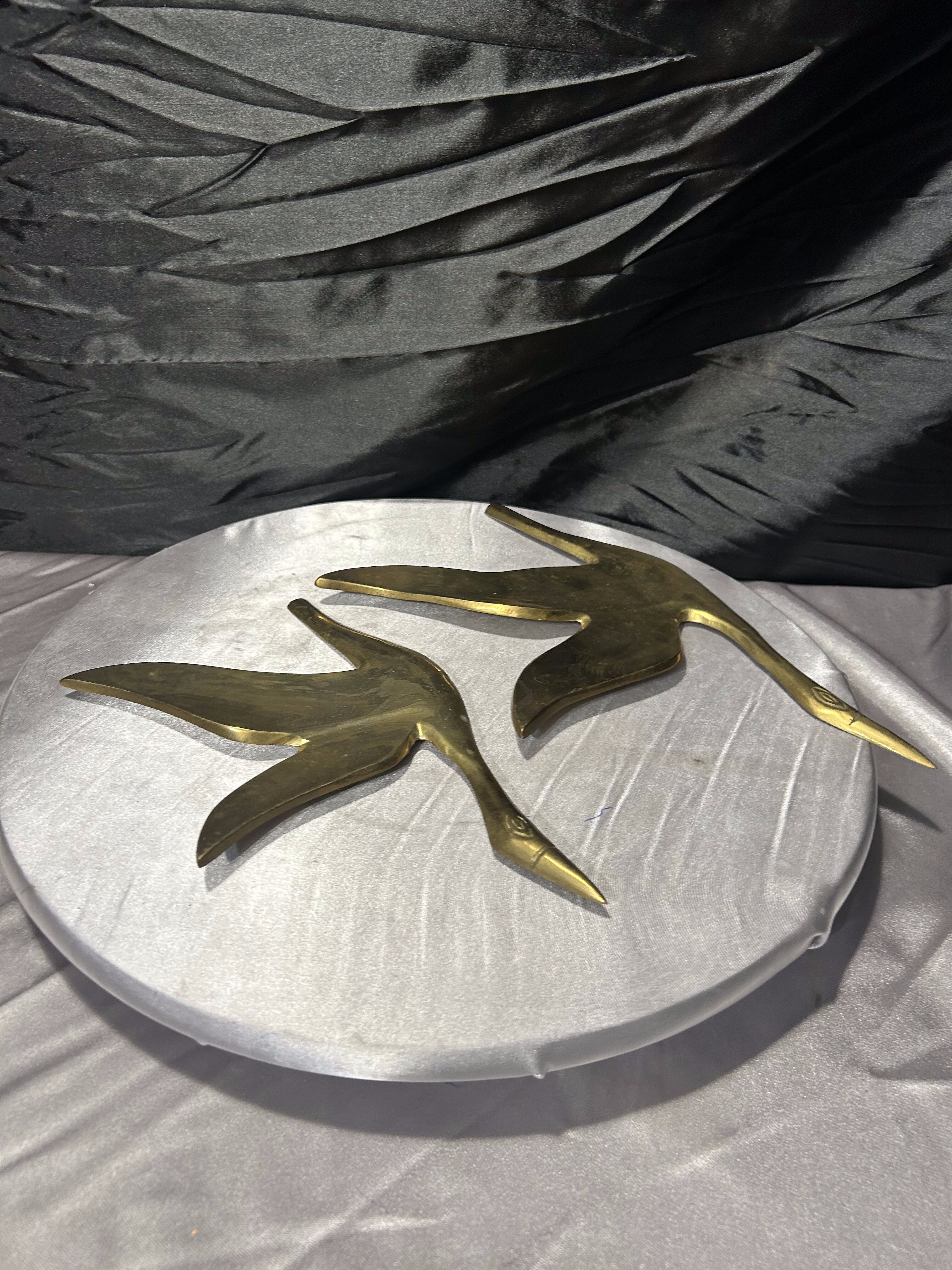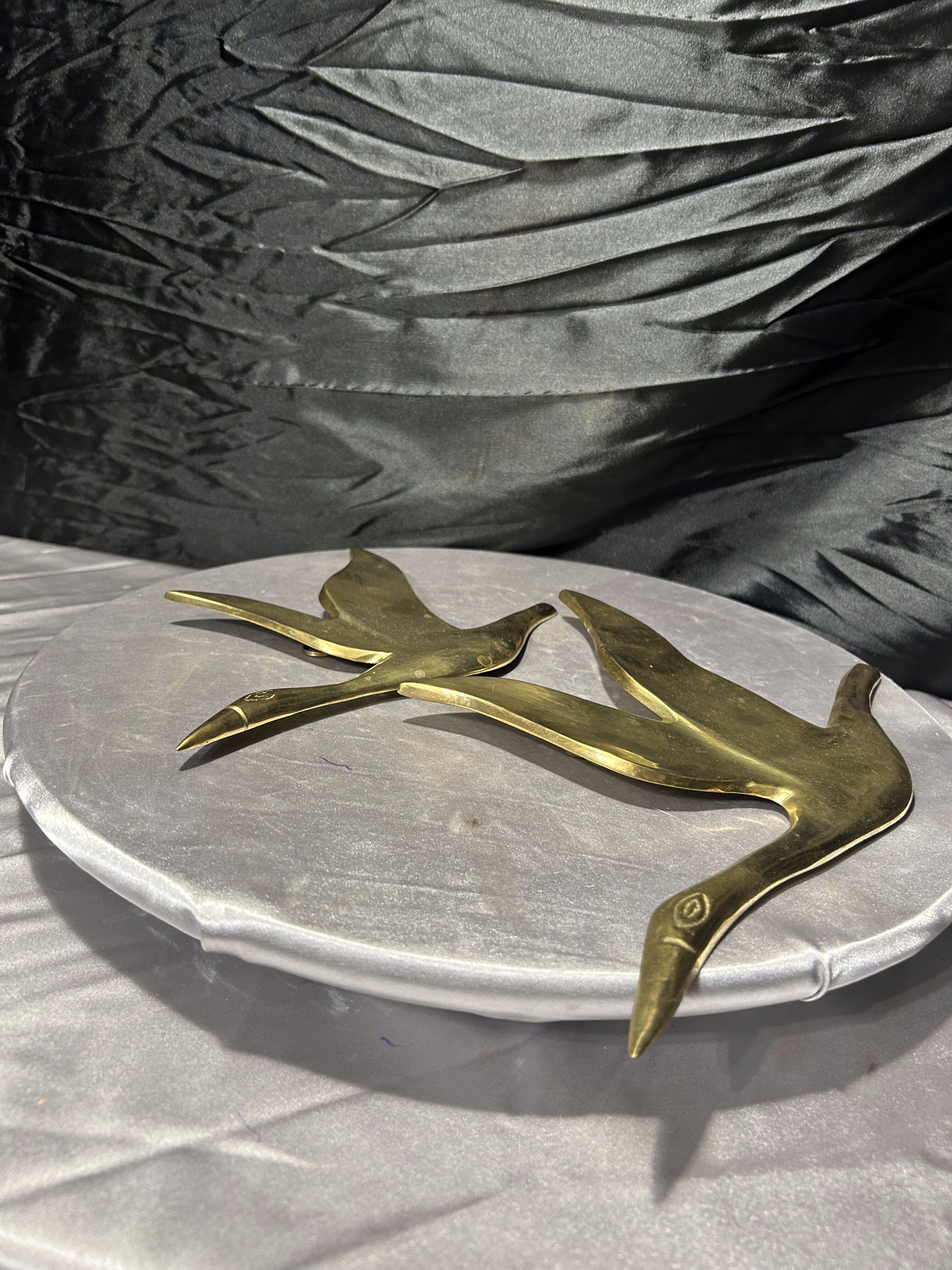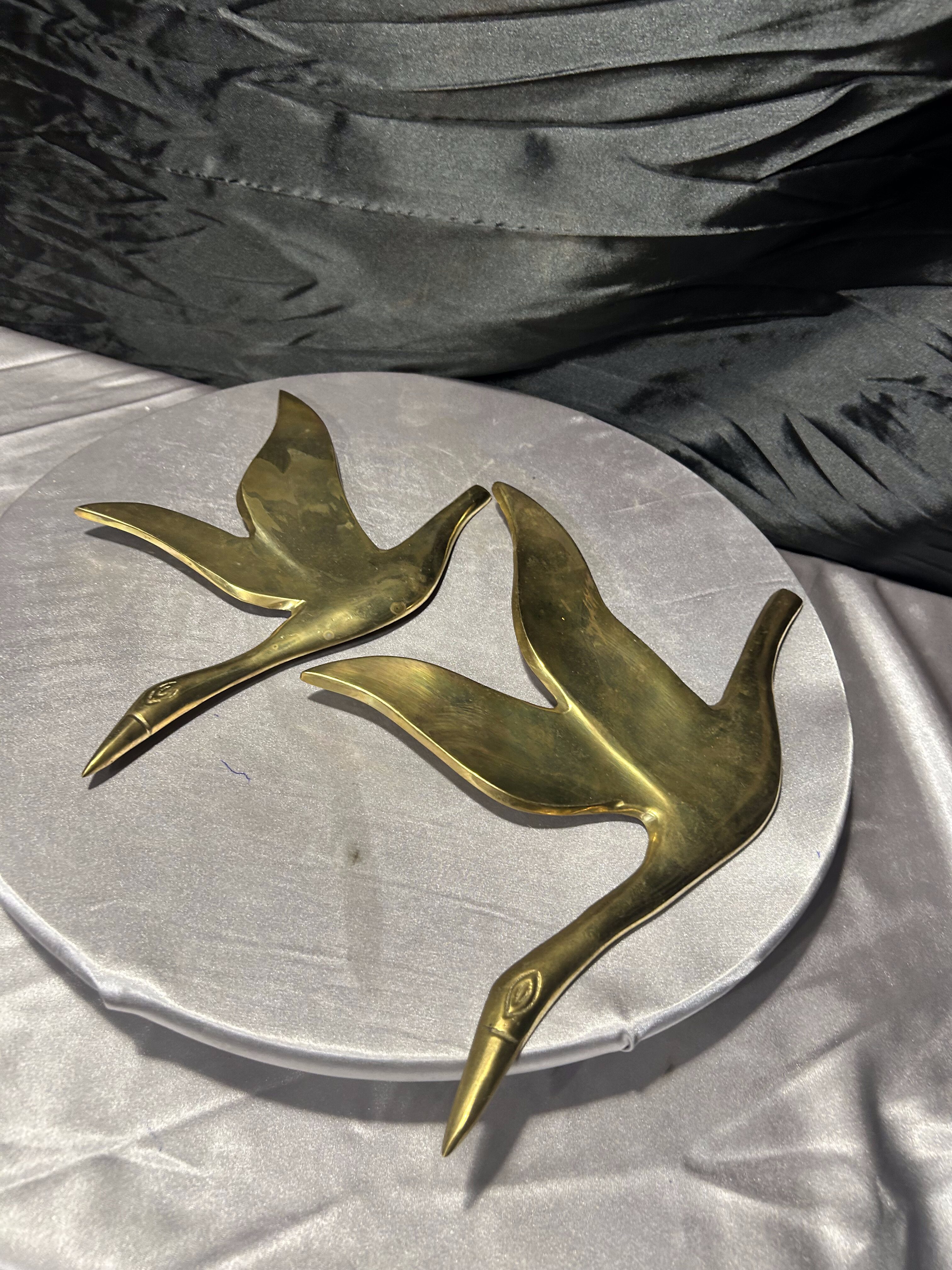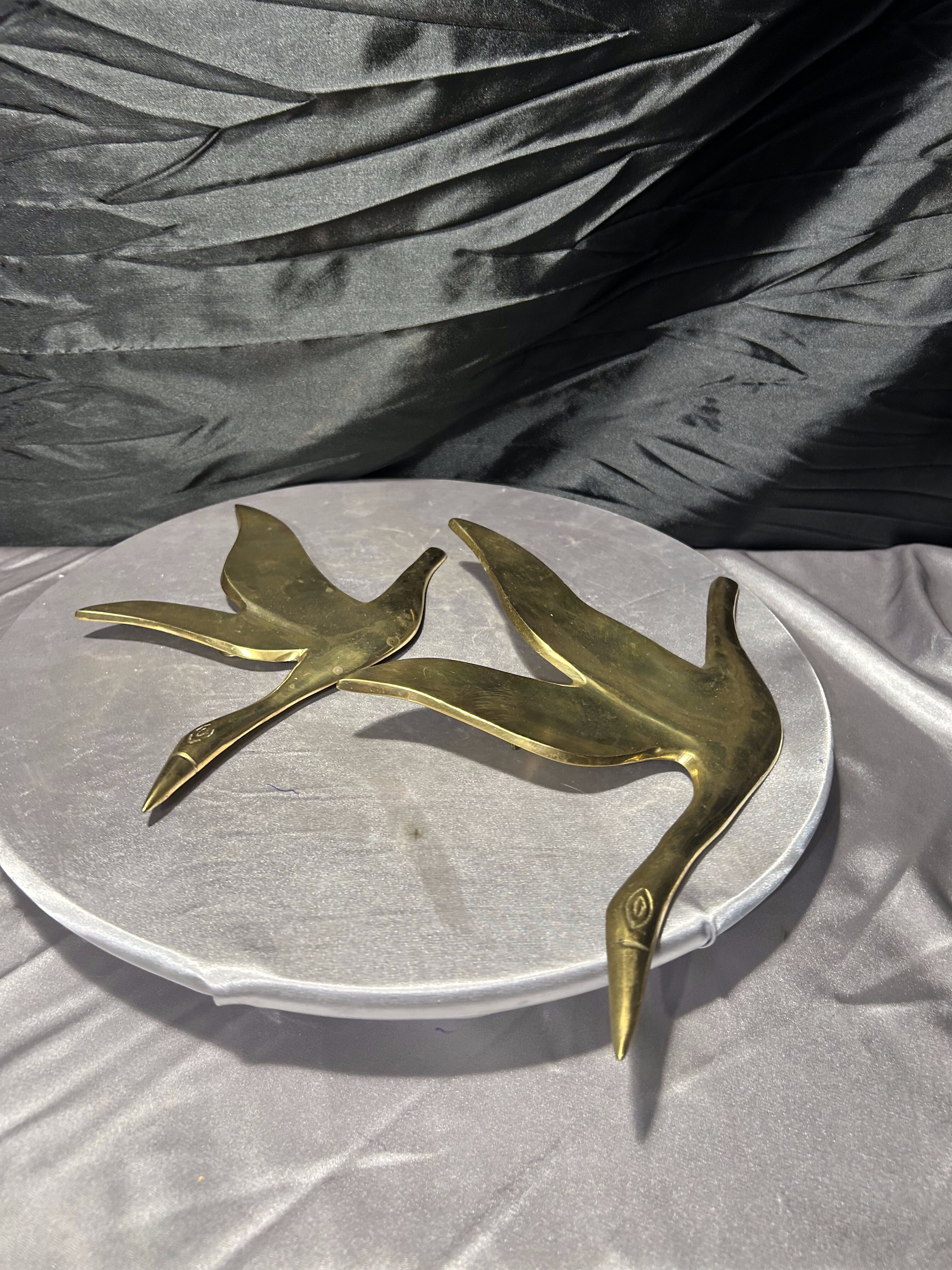 Przedmiotem oferty jest przepiękny zestaw dwóch ściennych zawieszek wykonanych z litego mosiądzu, przedstawiających kaczki w locie. Każda z figur jest osobnym elementem, co pozwala na dowolną aranżację na ścianie – można je powiesić obok siebie, w pionie lub pod skosem, tworząc dynamiczną kompozycję. Kaczki charakteryzują się elegancką, smukłą linią oraz gładką, polerowaną powierzchnią, która pięknie odbija światło, nadając wnętrzu luksusowego charakteru. To klasyczna i ponadczasowa dekoracja, która doskonale wpisuje się w styl skandynawski, vintage oraz gabinetowy.