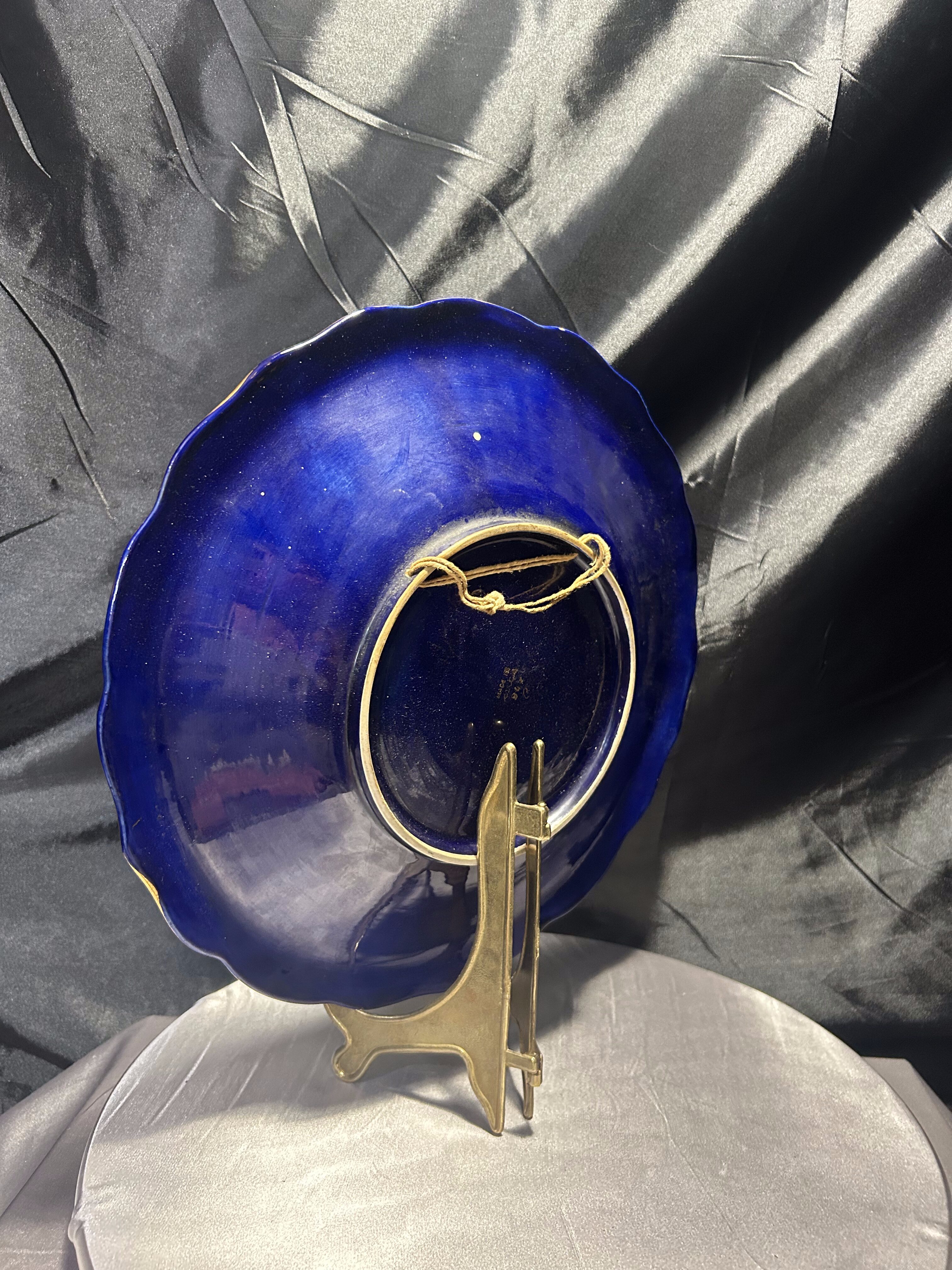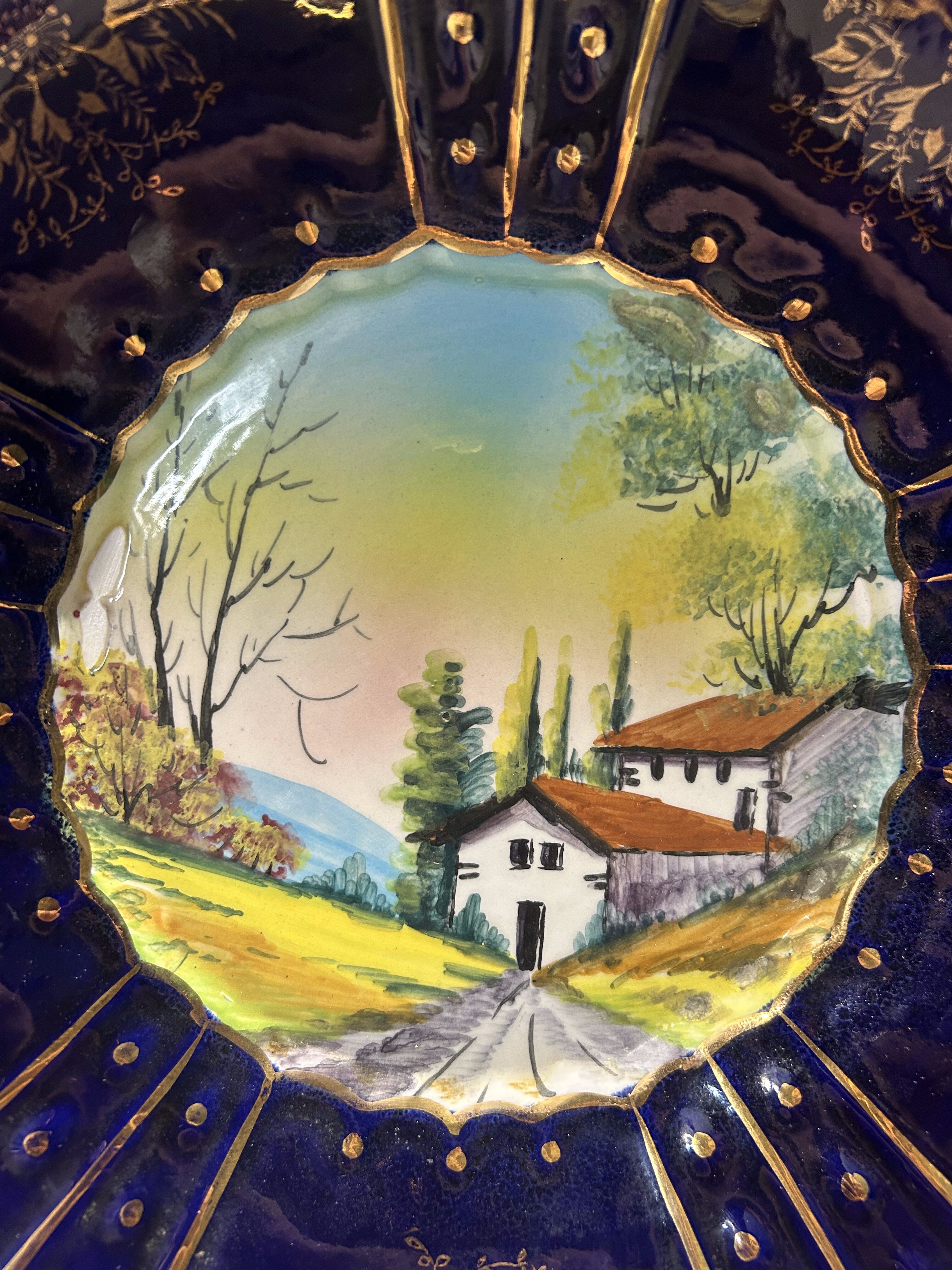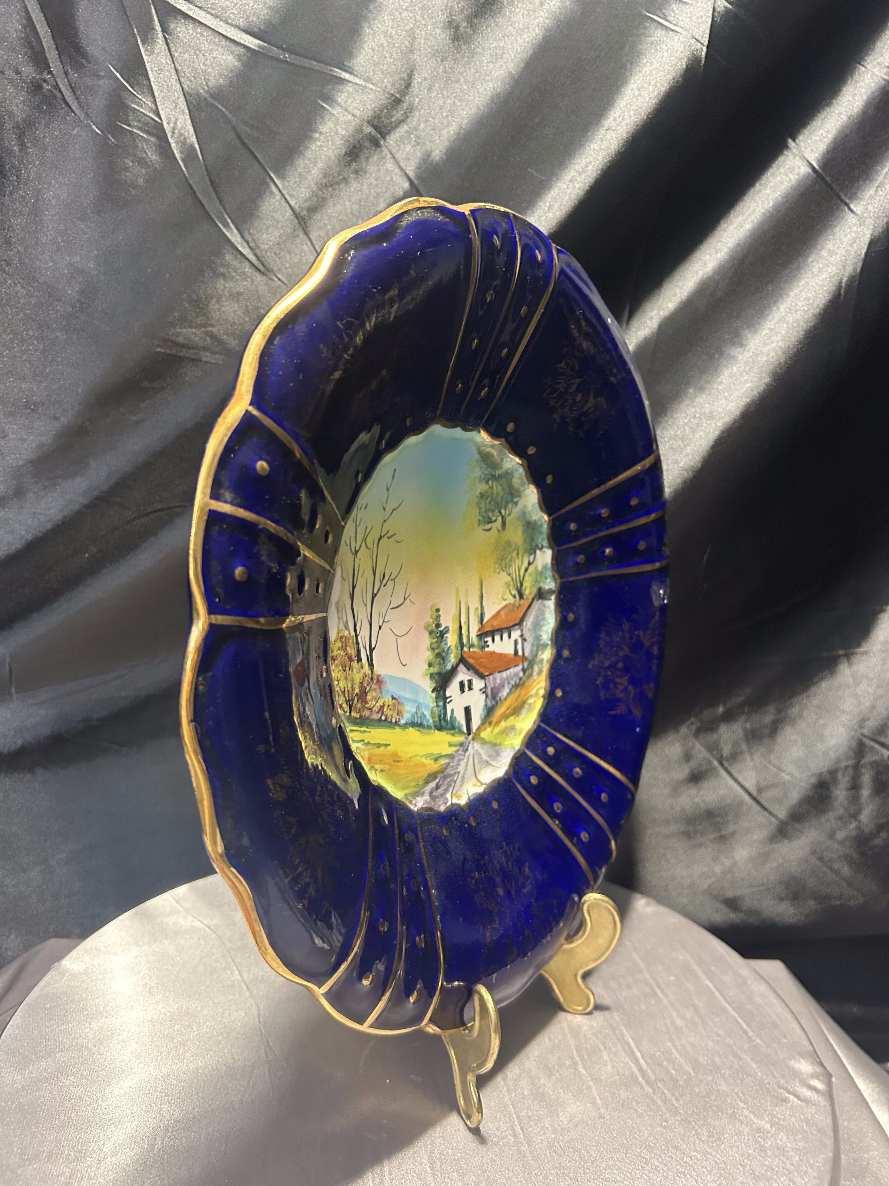 Opis: Unikatowy dekoracyjny talerz porcelanowy w klasycznym stylu włoskim, sygnowany „Made in Italy”. Przedmiot zachwyca intensywnym kobaltowym tłem z ręcznie malowanymi złotymi motywami kwiatowymi oraz delikatnym żłobieniem rozdzielającym powierzchnię. W centralnej części znajduje się barwny, ręcznie malowany pejzaż z domkiem i górami, utrzymany w romantycznej stylistyce.