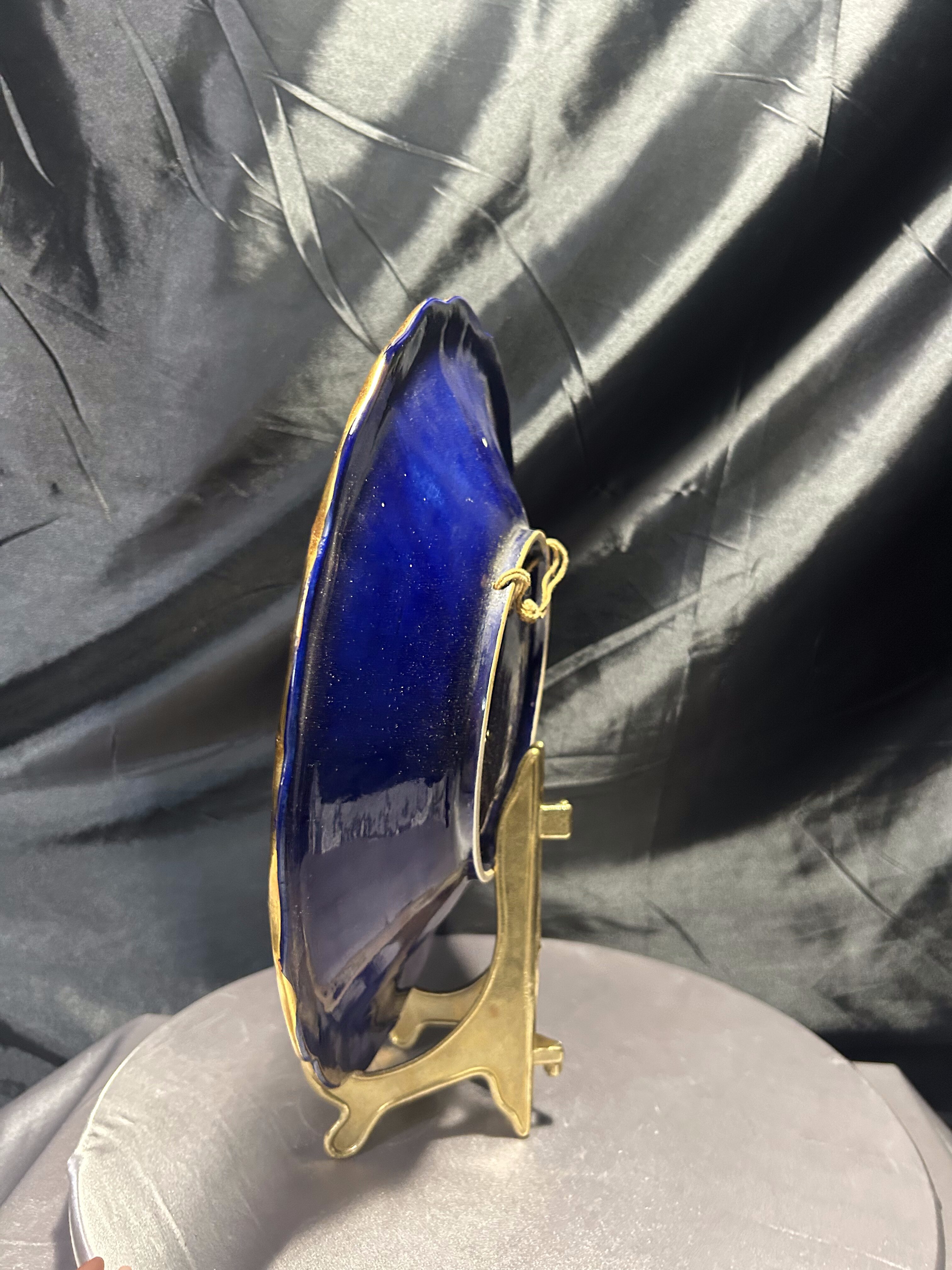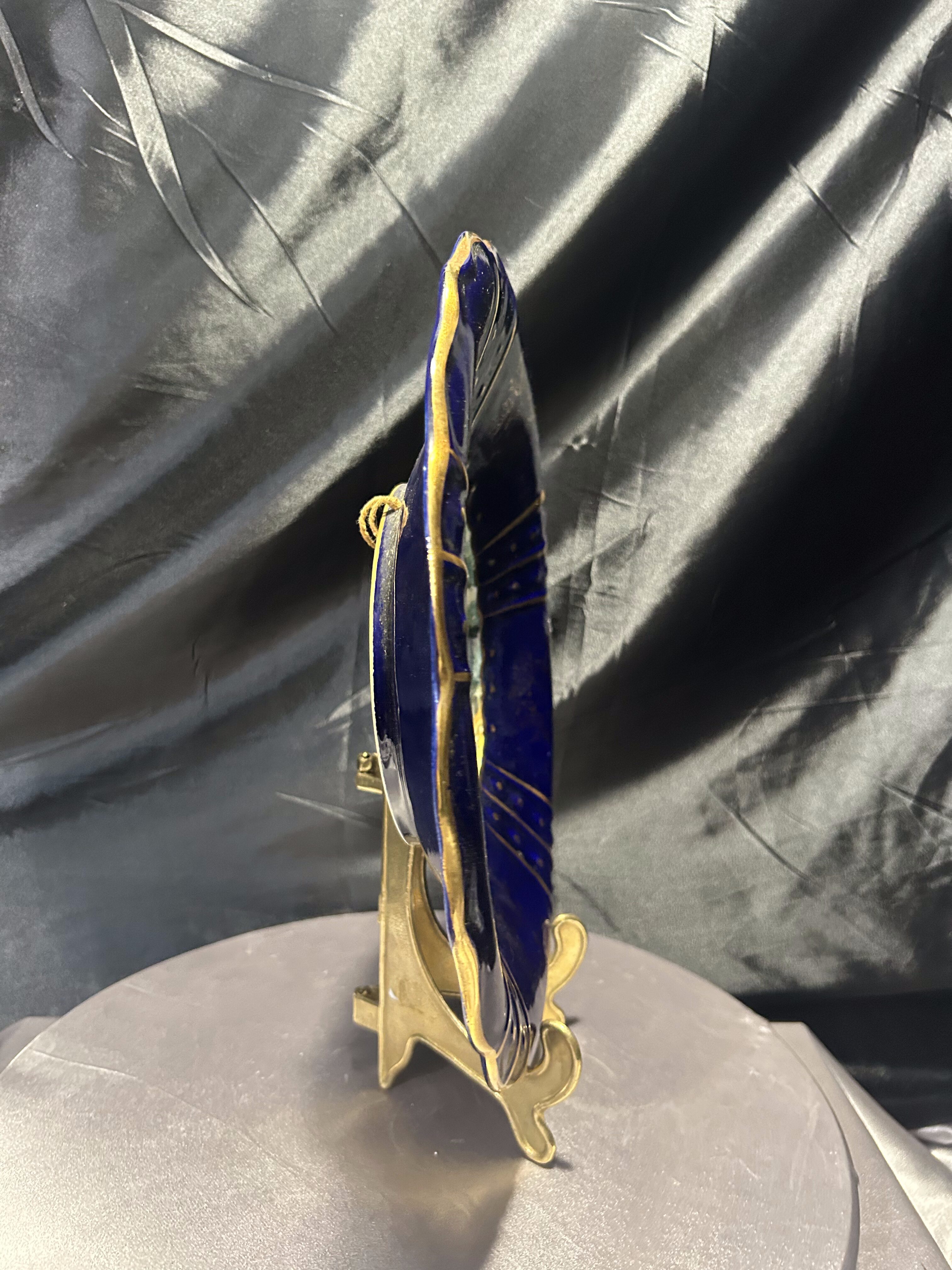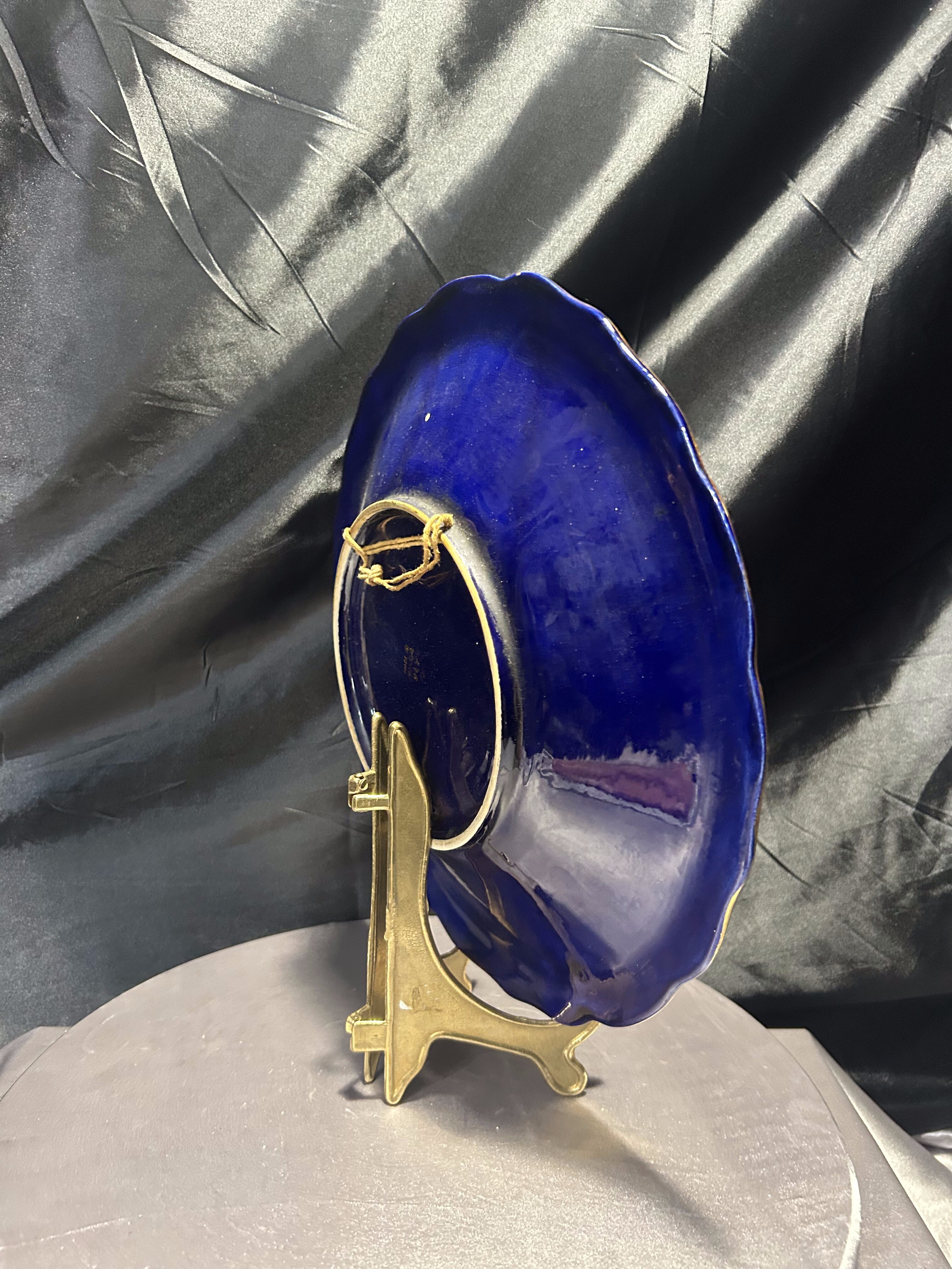Opis: Unikatowy dekoracyjny talerz porcelanowy w klasycznym stylu włoskim, sygnowany „Made in Italy”. Przedmiot zachwyca intensywnym kobaltowym tłem z ręcznie malowanymi złotymi motywami kwiatowymi oraz delikatnym żłobieniem rozdzielającym powierzchnię. W centralnej części znajduje się barwny, ręcznie malowany pejzaż z domkiem i górami, utrzymany w romantycznej stylistyce.