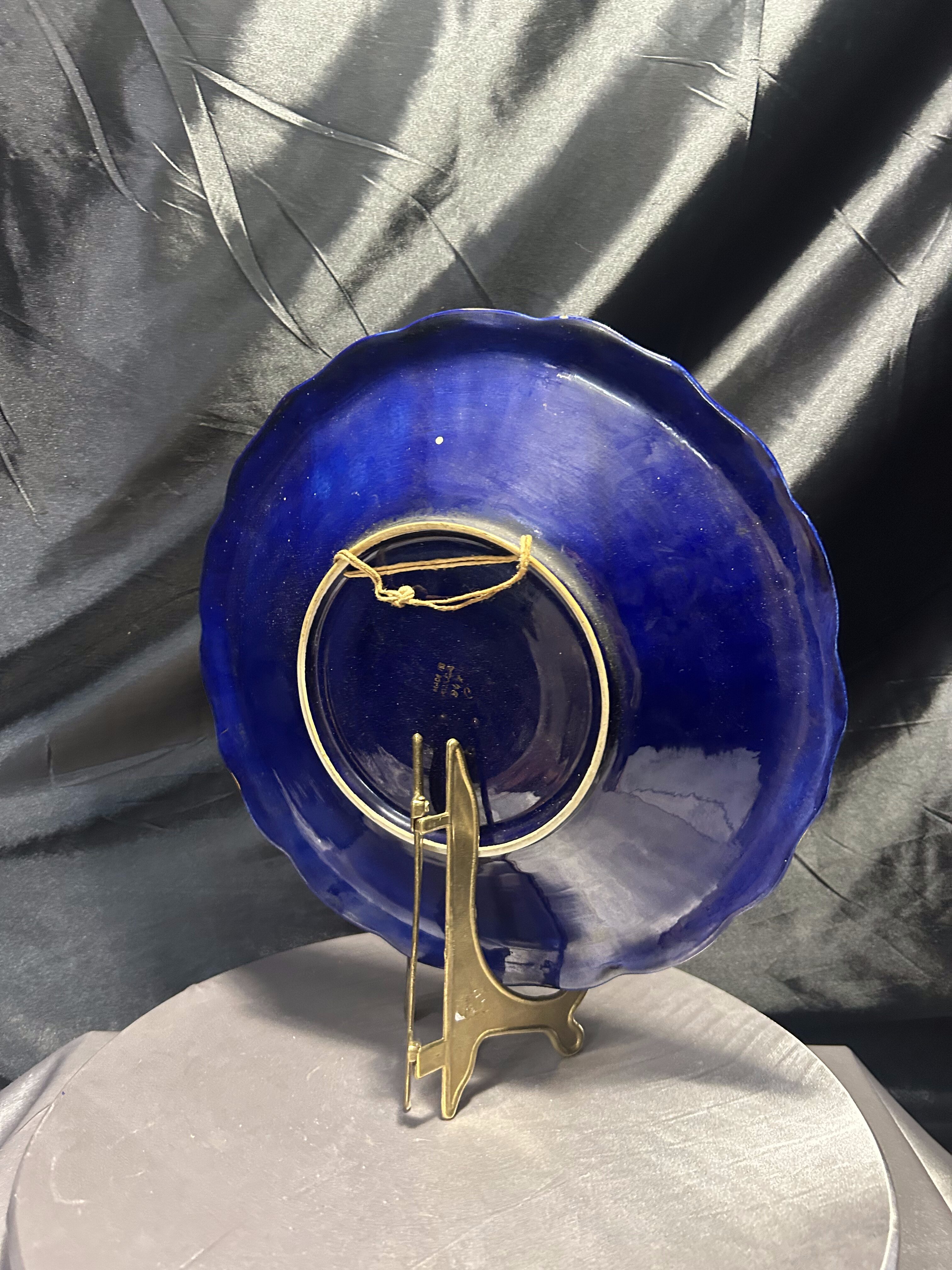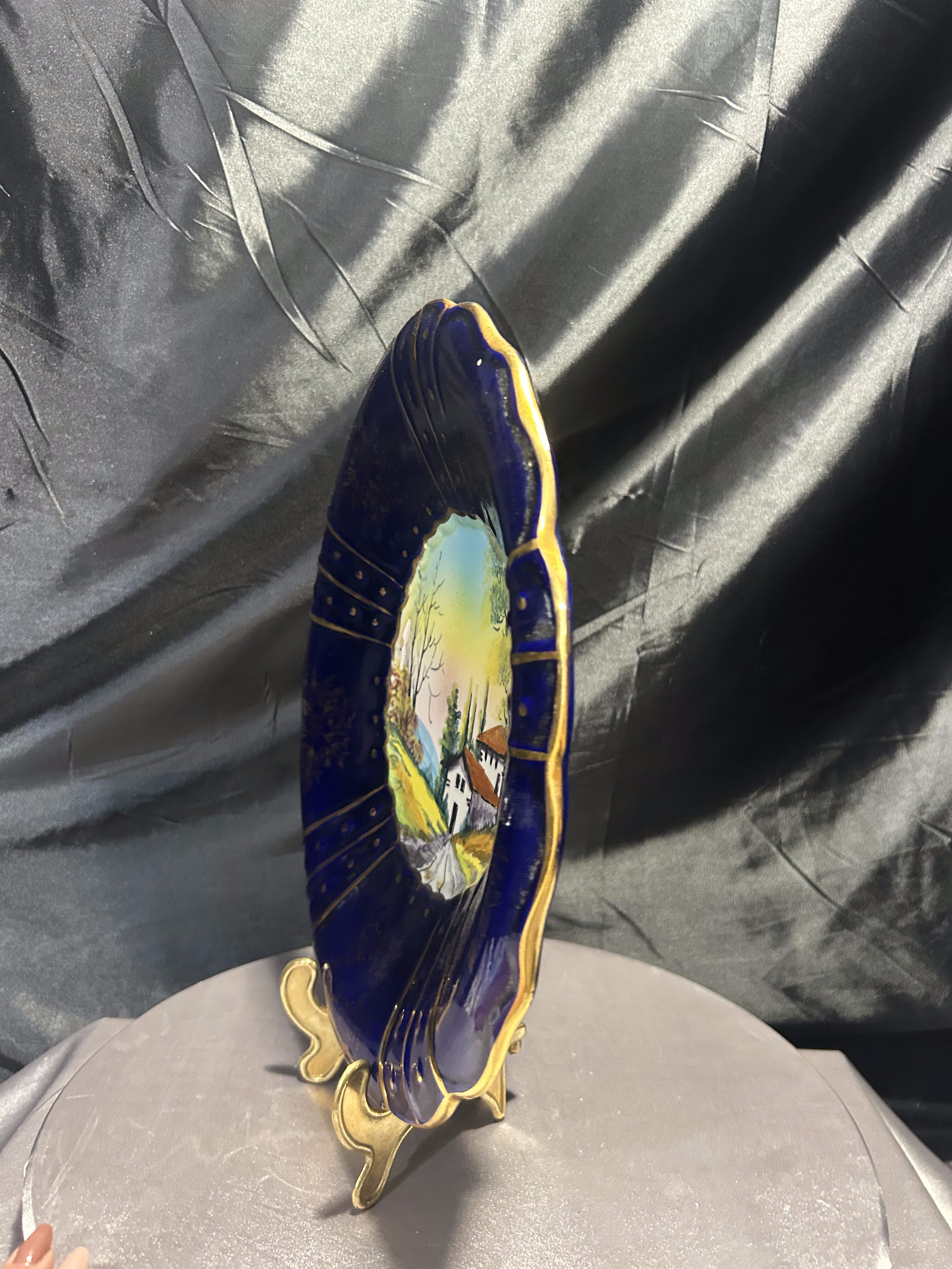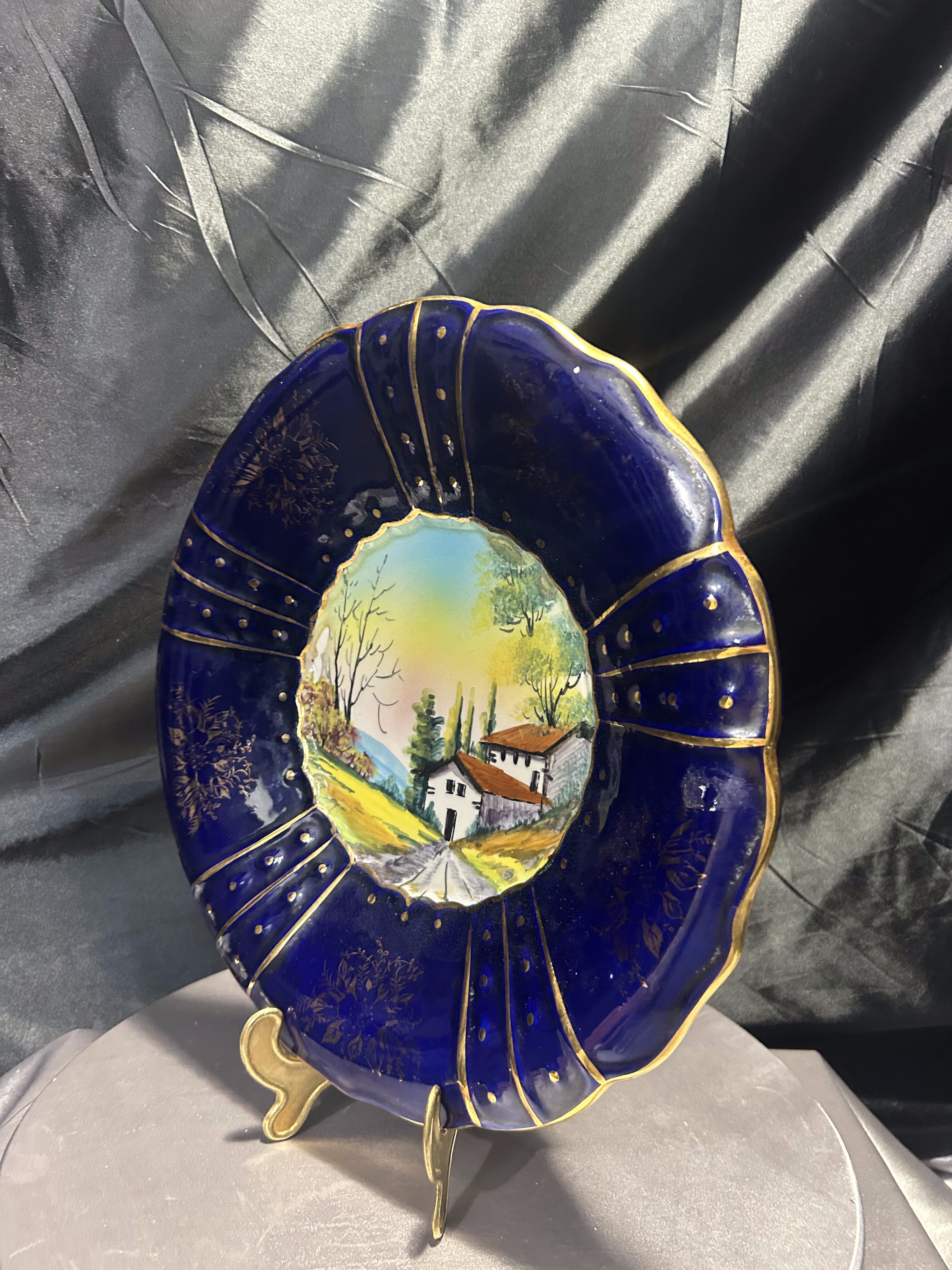 Dekoracyjny talerz porcelanowy – ręcznie malowany pejzaż – cobalt & złoto – Italy