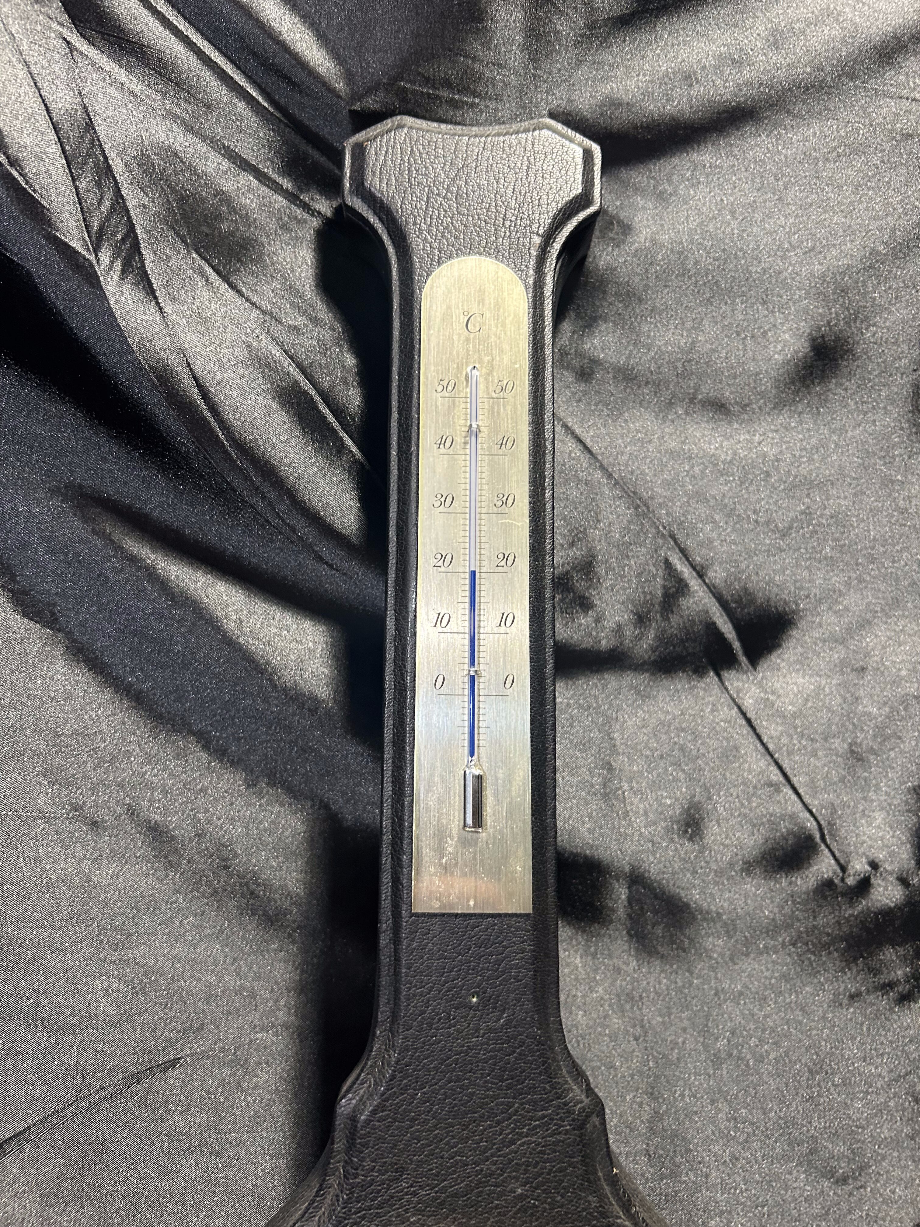 Elegancka stacja meteorologiczna w podłużnym drewnianym stelażu obitym czarną skórą, wyposażona w trzy precyzyjne wskaźniki: barometr, higrometr i termometr. Stylowy wygląd i czytelne tarcze sprawiają, że jest nie tylko funkcjonalnym przyrządem do monitorowania warunków atmosferycznych, ale i dekoracyjnym akcentem do wnętrz klasycznych lub gabinetowych.