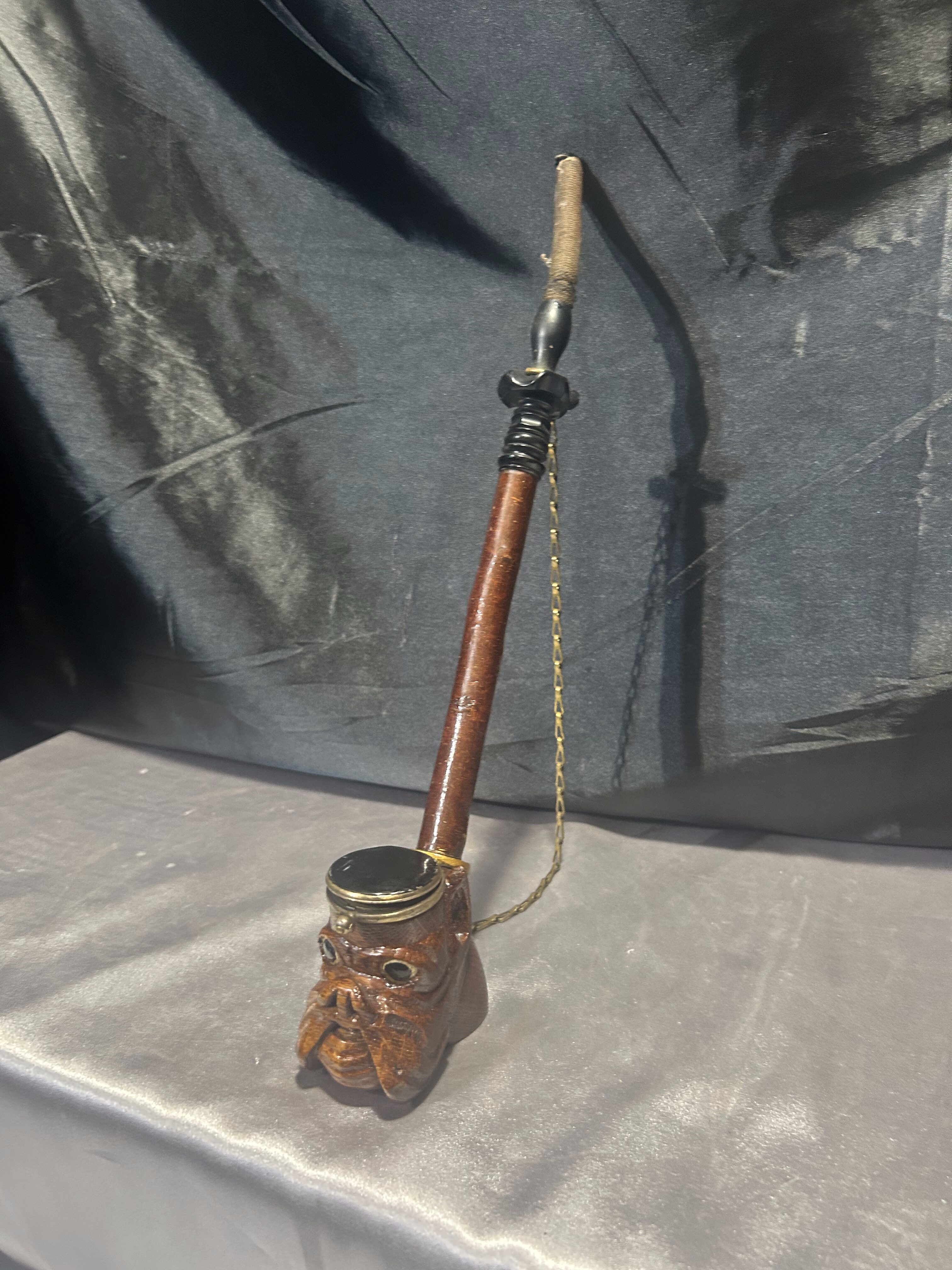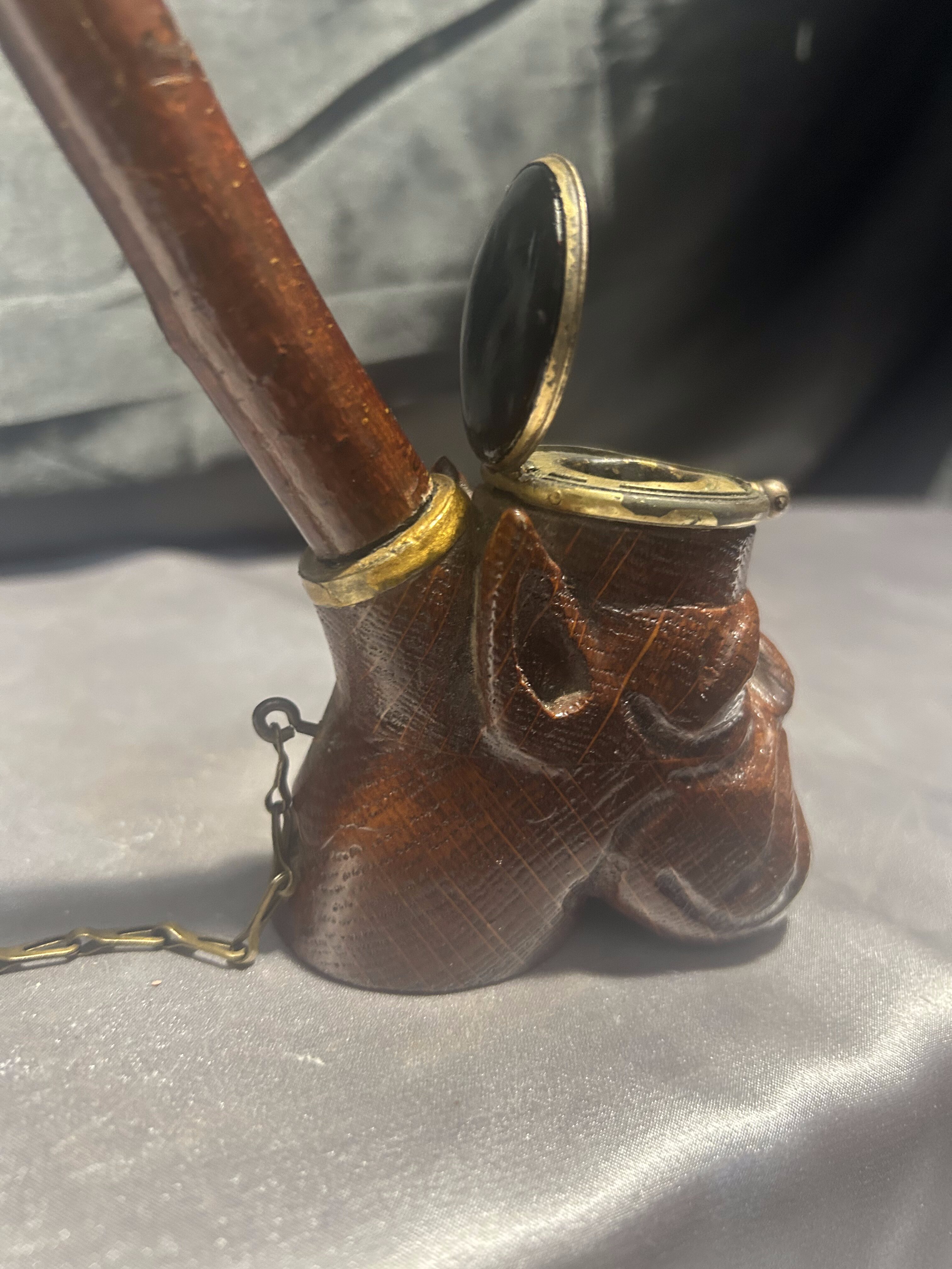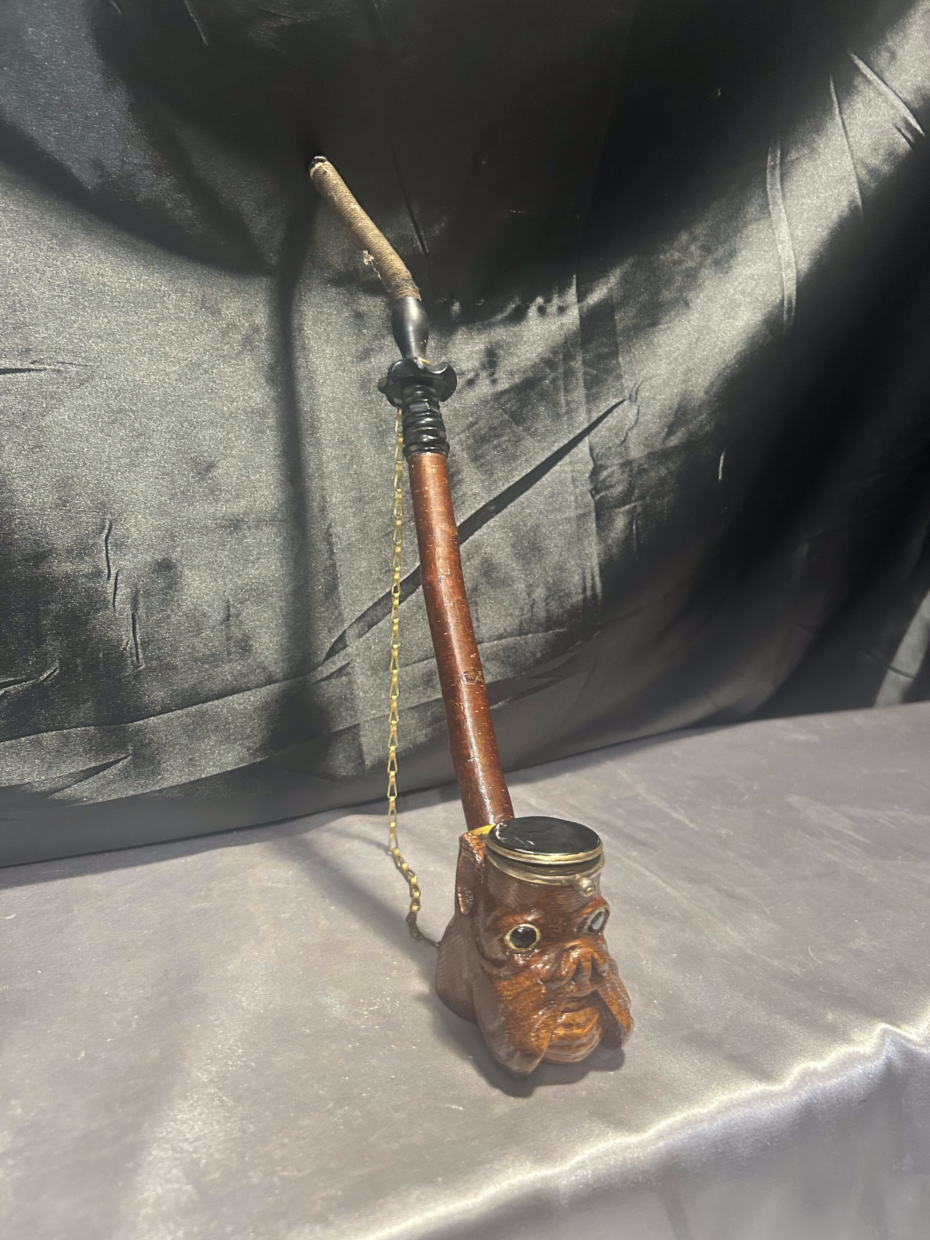 Na sprzedaż unikatowa drewniana fajka, misternie rzeźbiona w kształcie głowy psa, co nadaje jej wyjątkowego charakteru. Posiada metalowe okucie oraz łańcuszek, który pełni zarówno funkcję dekoracyjną, jak i praktyczną. Fajka jest ozdobna, ale może również pełnić funkcję użytkową, stanowiąc ciekawy element kolekcji dla miłośników rzemiosła i antyków.