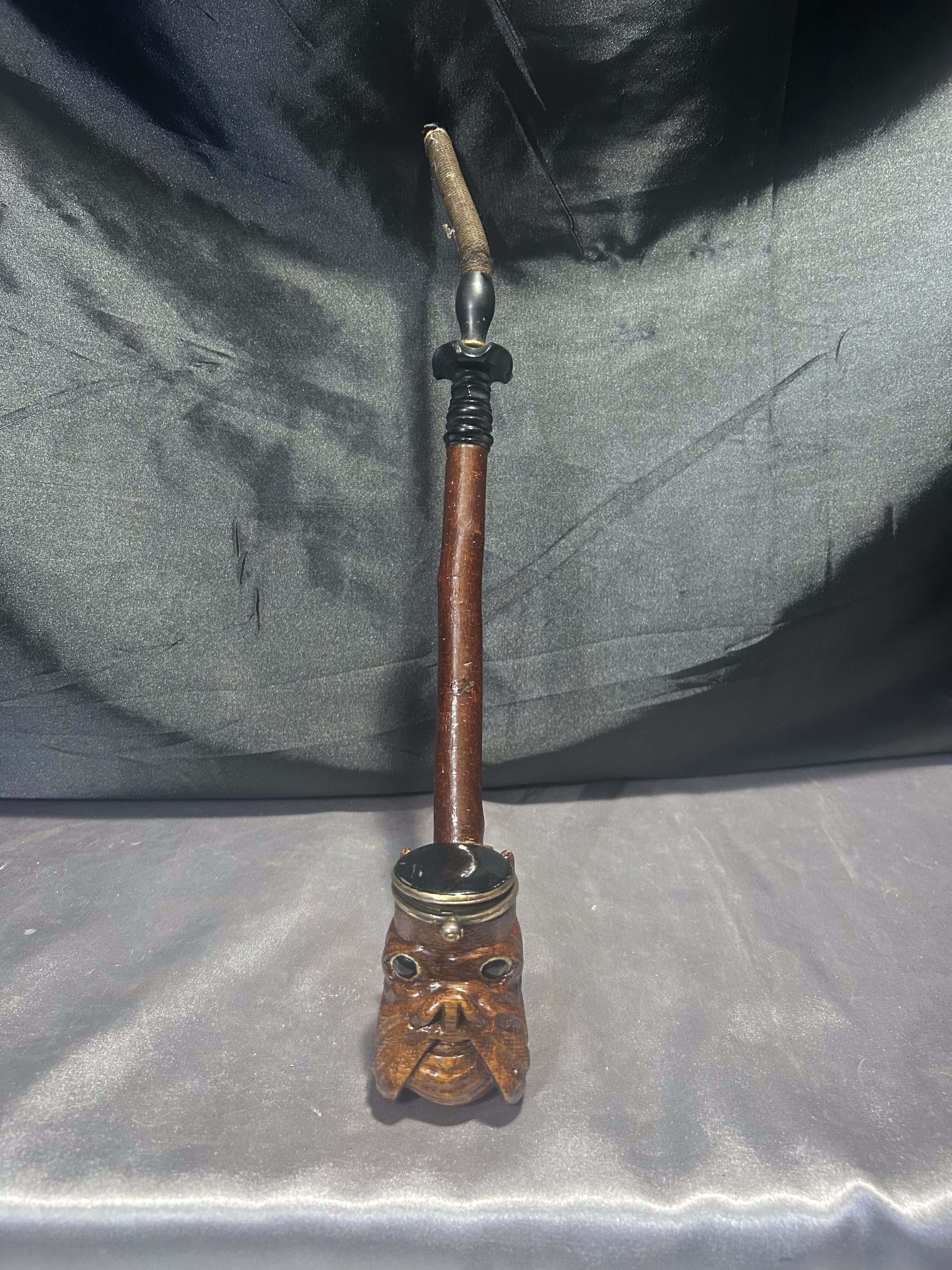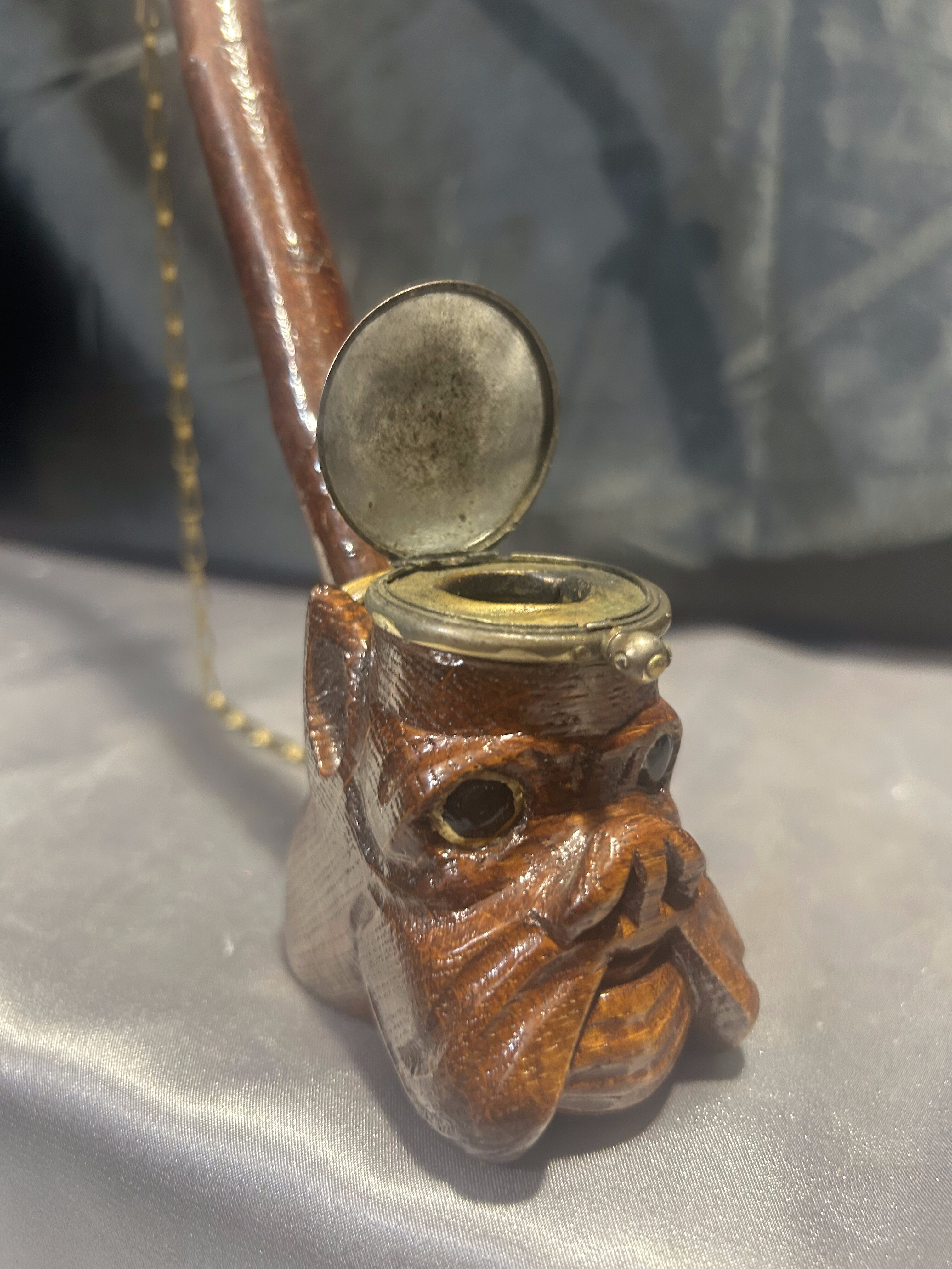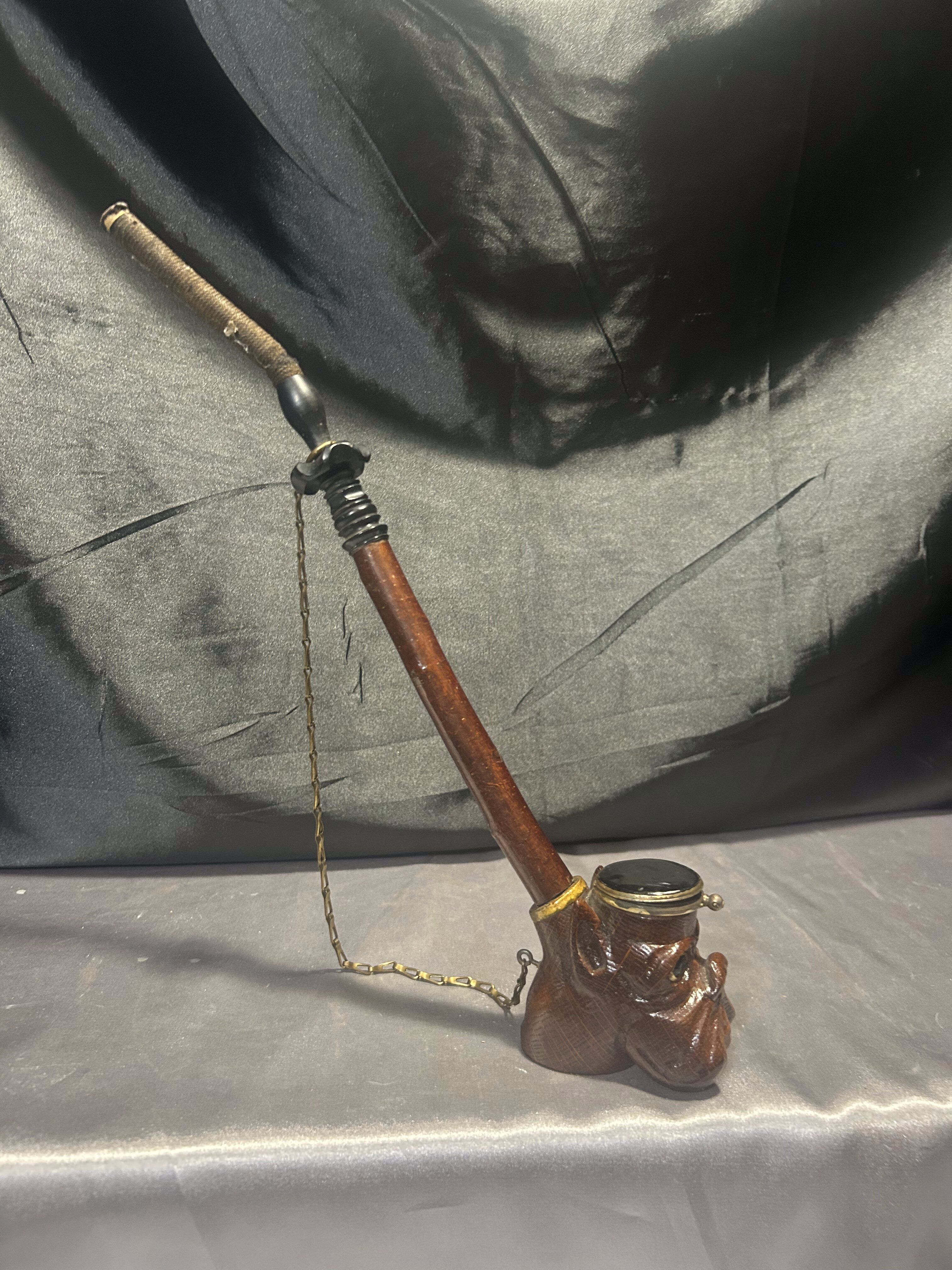 Na sprzedaż unikatowa drewniana fajka, misternie rzeźbiona w kształcie głowy psa, co nadaje jej wyjątkowego charakteru. Posiada metalowe okucie oraz łańcuszek, który pełni zarówno funkcję dekoracyjną, jak i praktyczną. Fajka jest ozdobna, ale może również pełnić funkcję użytkową, stanowiąc ciekawy element kolekcji dla miłośników rzemiosła i antyków.