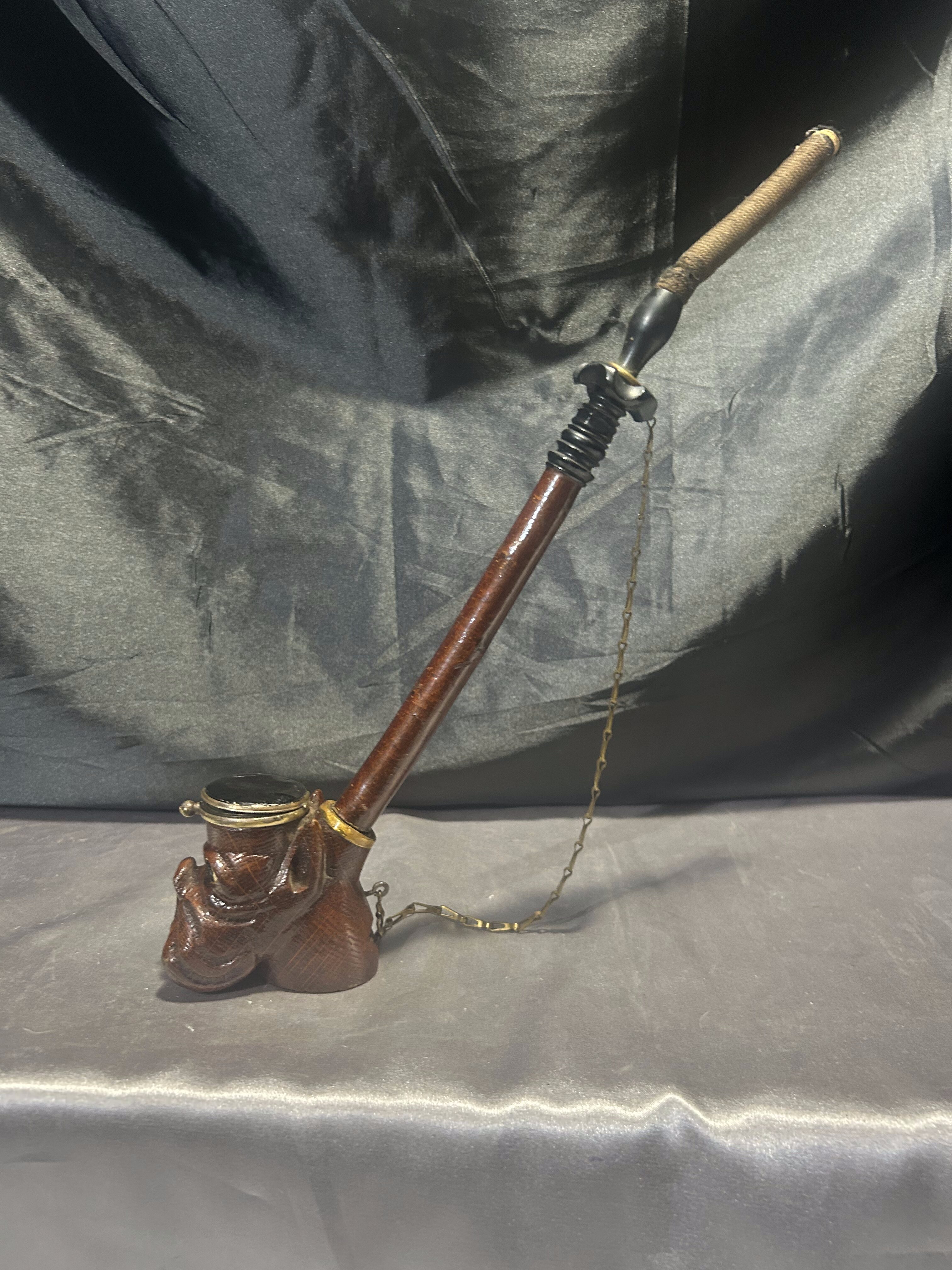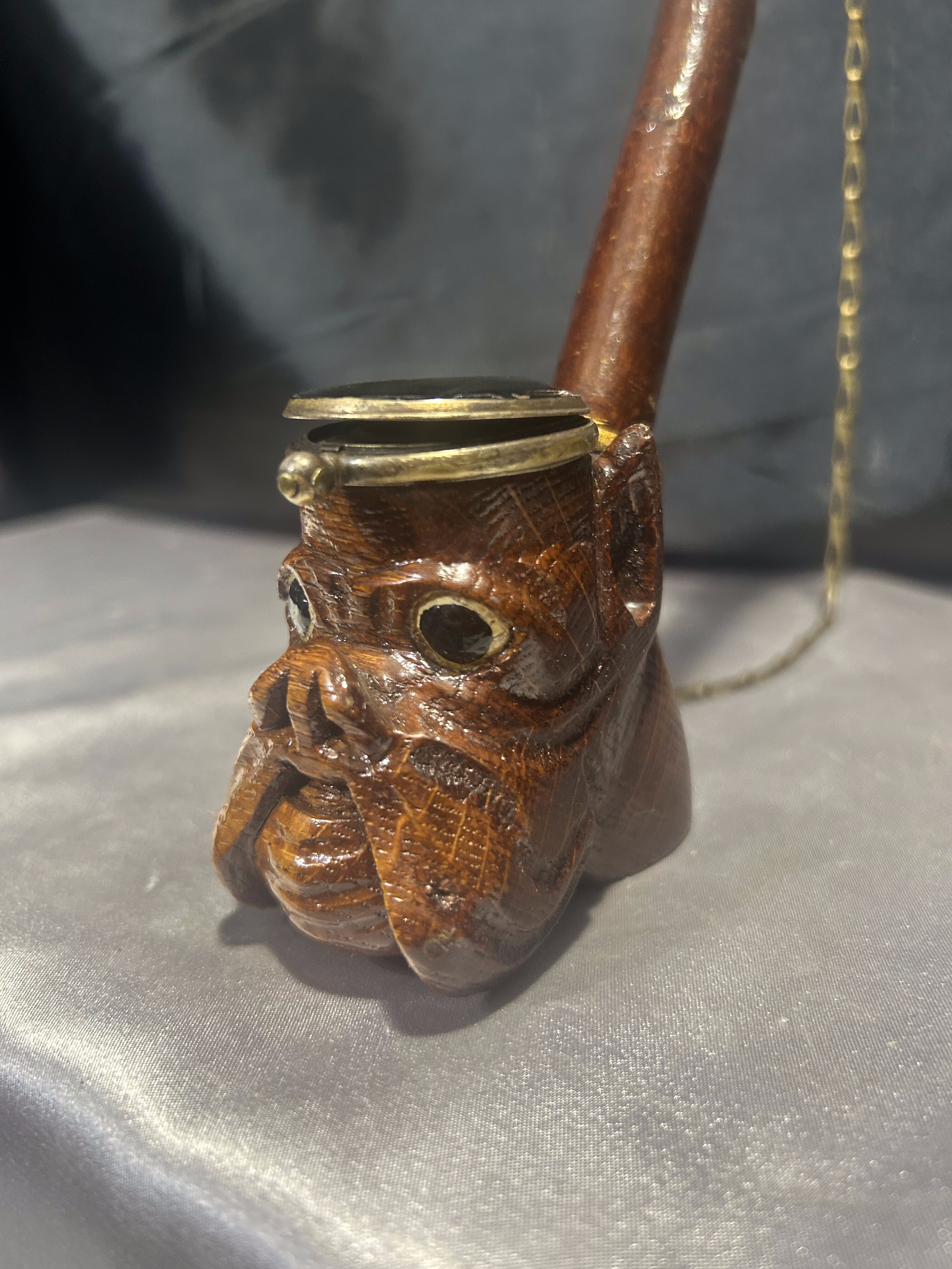 Ta drewniana fajka rzeźbiona w kształcie głowy psa to prawdziwa perełka rzemiosła. Jej detaliczne wykonanie, starannie wyrzeźbione rysy i metalowe okucie sprawiają, że jest nie tylko kolekcjonerskim przedmiotem, ale i pięknym dodatkiem do wnętrza. Może stanowić ozdobę gabinetu, eksponat na półce lub oryginalny prezent dla miłośnika klasycznych akcesoriów.