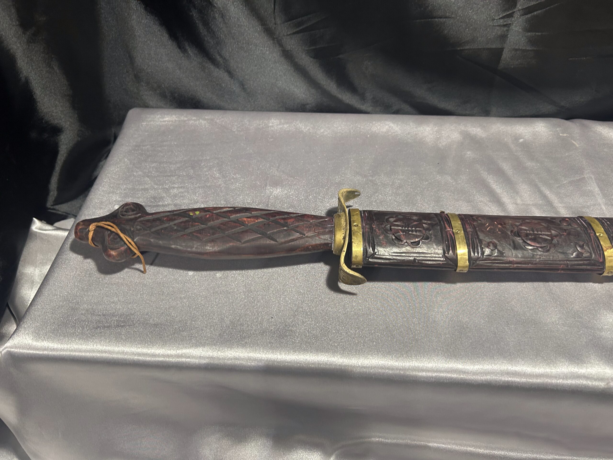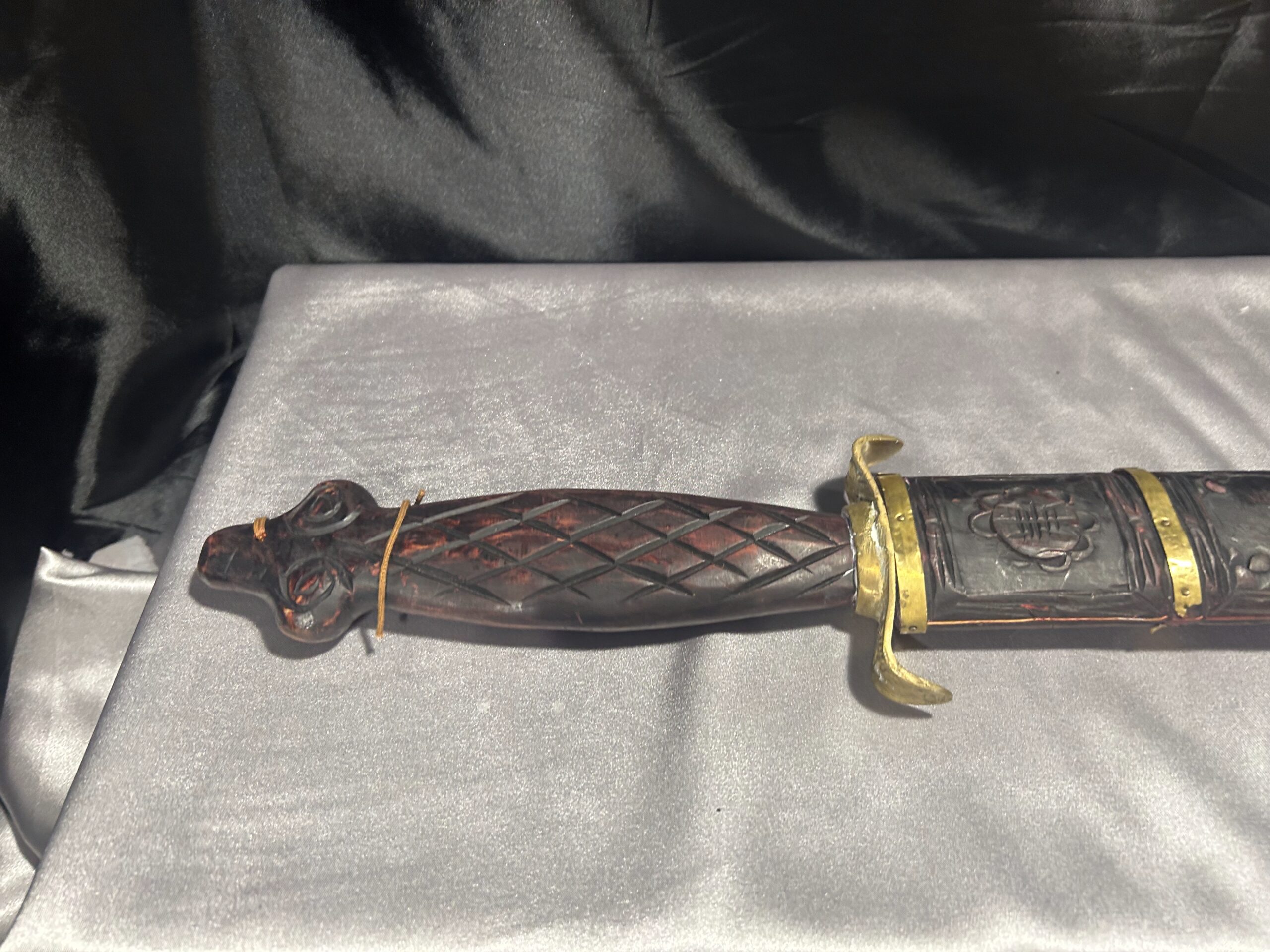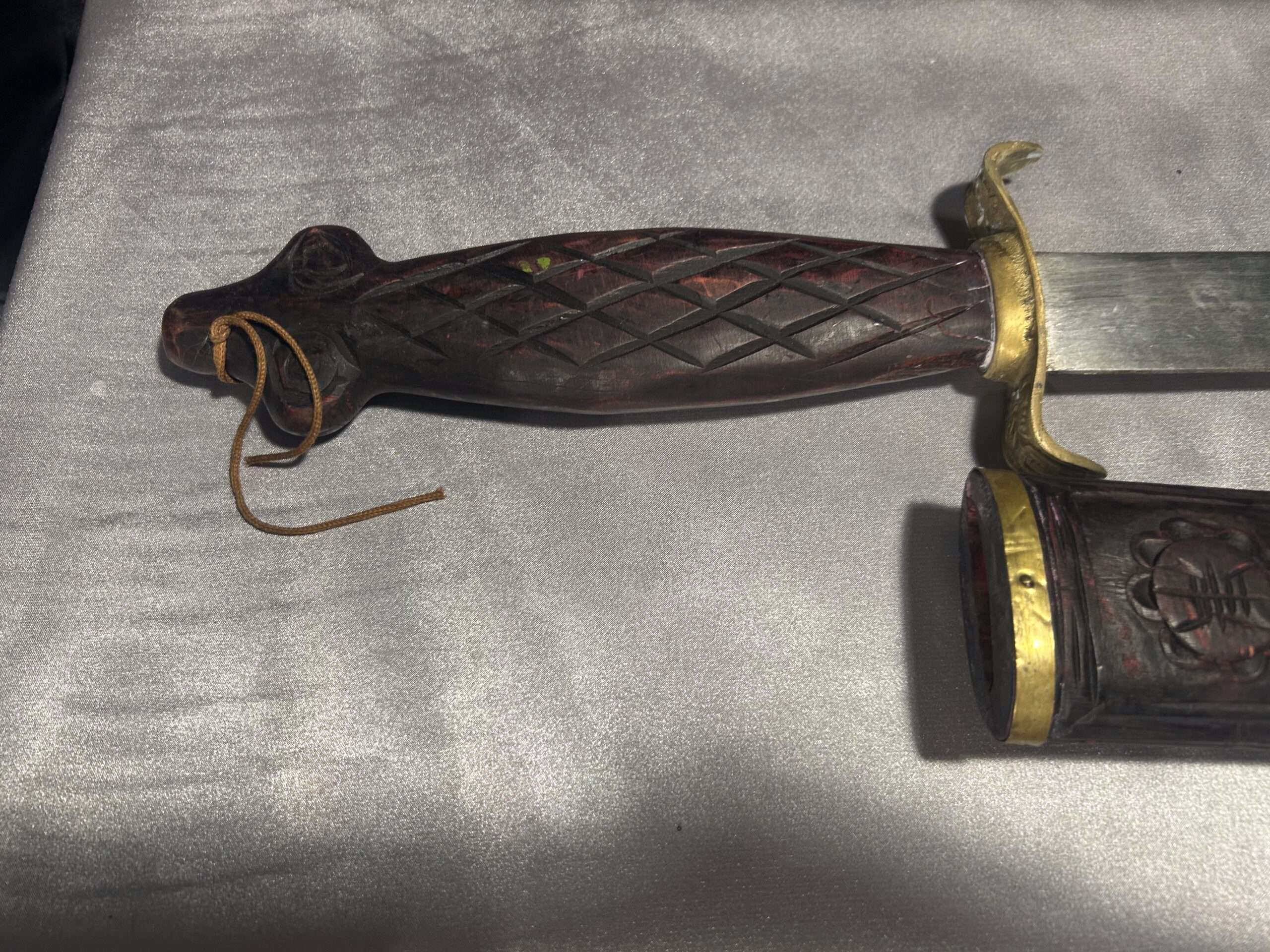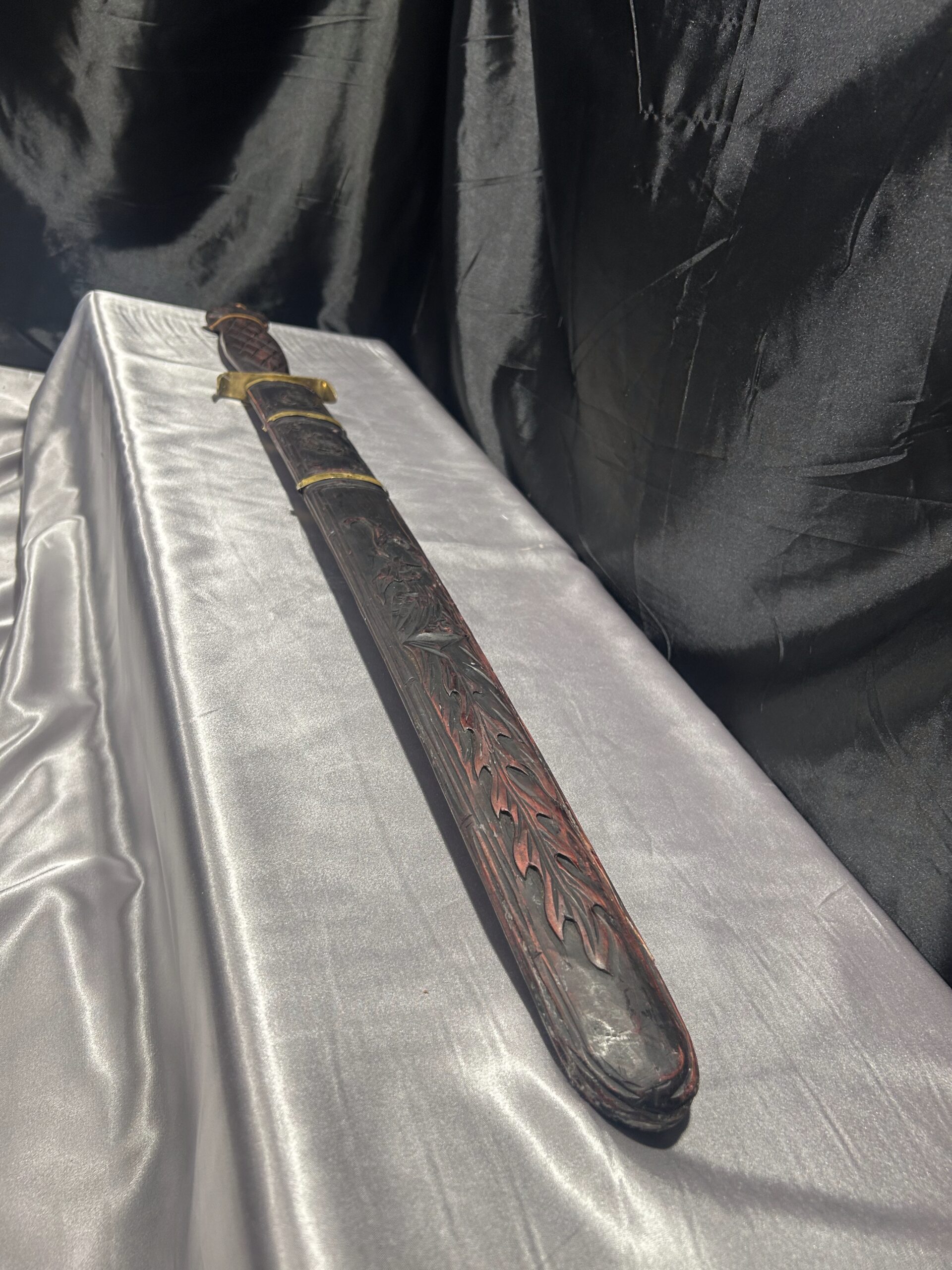 - Materiał: Ciemne drewno (rękojeść i pochwa), stal (ostrze),