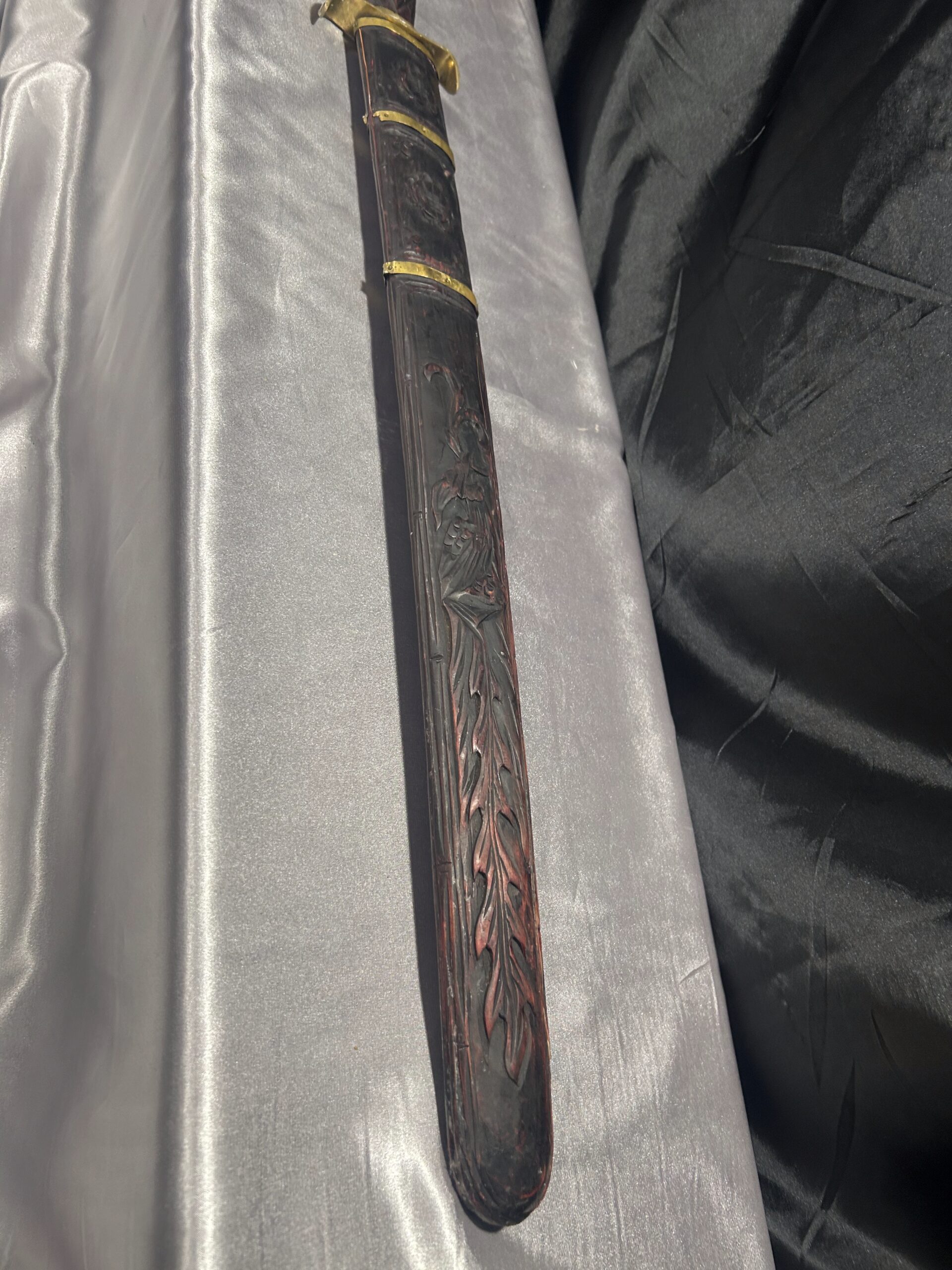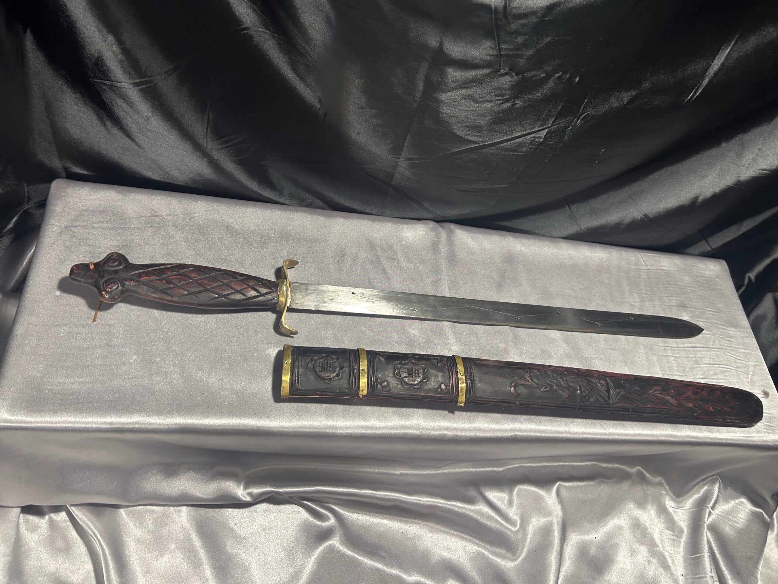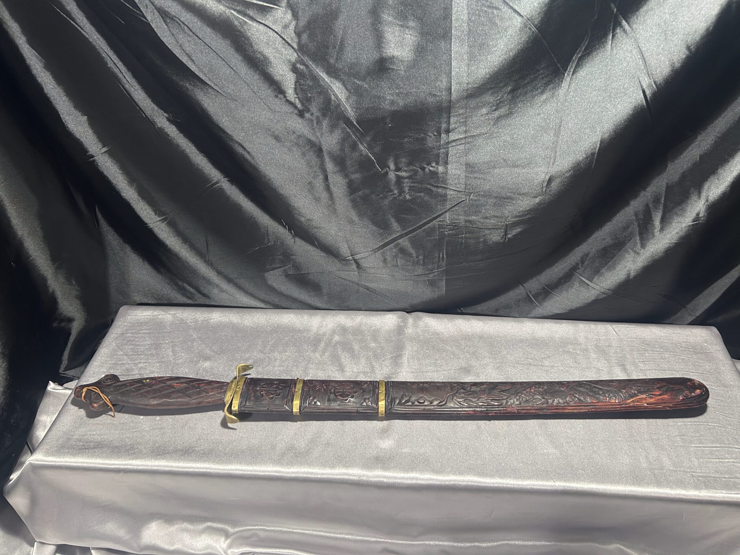 - Materiał: Ciemne drewno (rękojeść i pochwa), stal (ostrze),