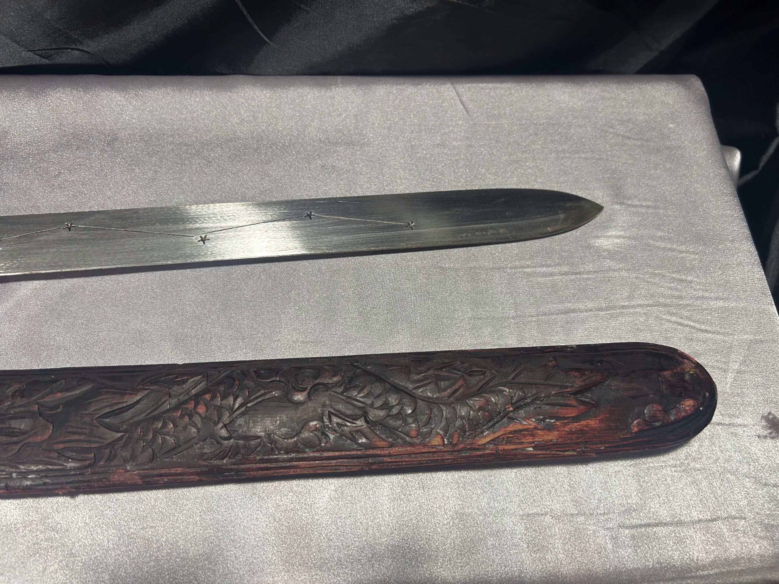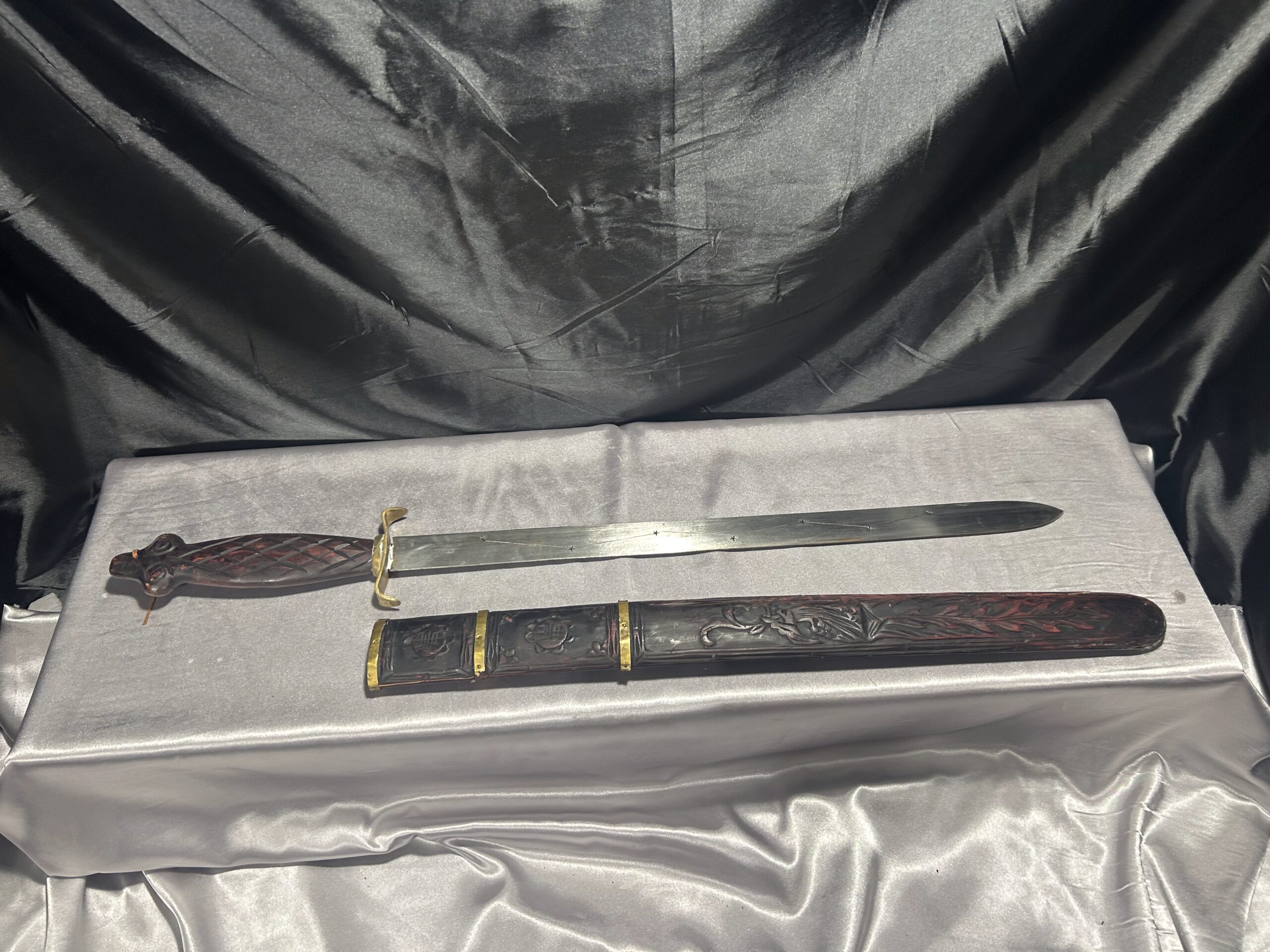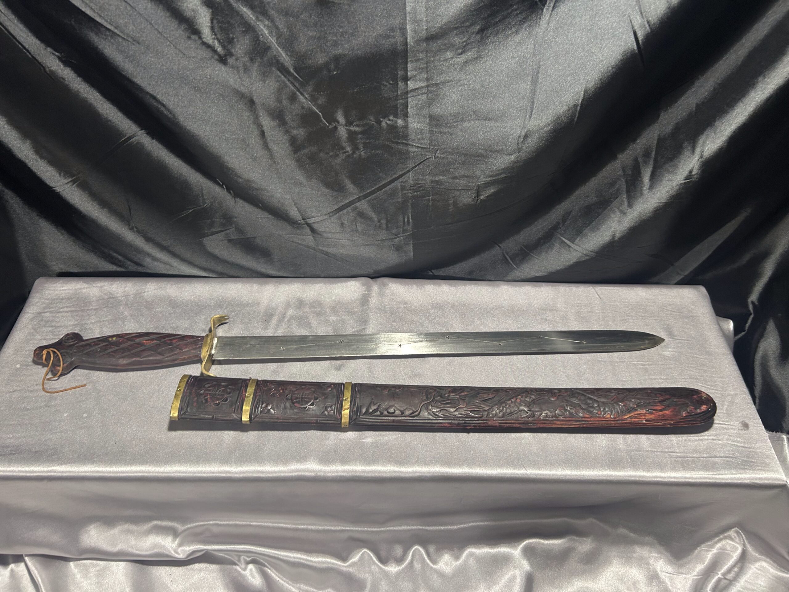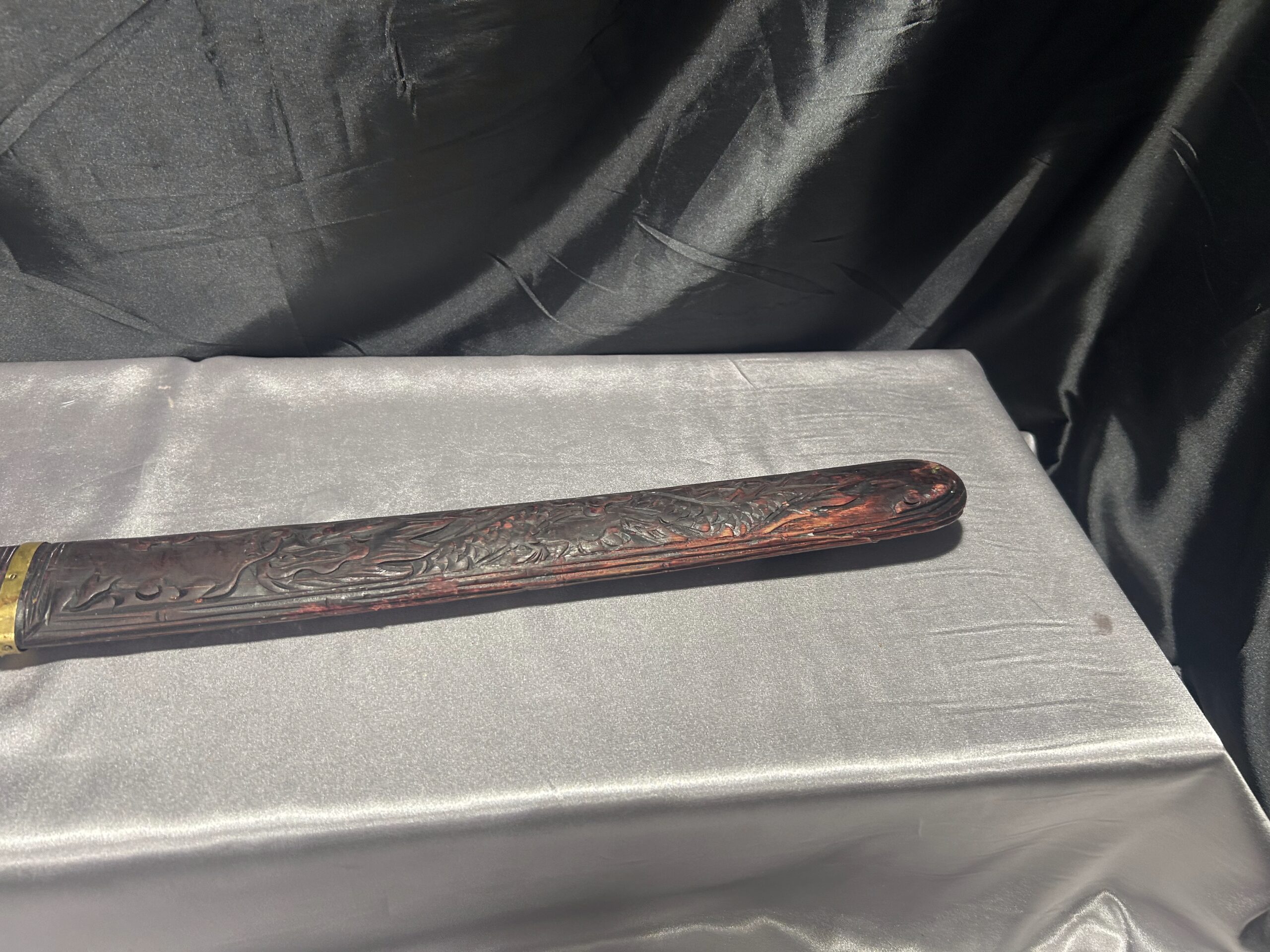 - Materiał: Ciemne drewno (rękojeść i pochwa), stal (ostrze),
