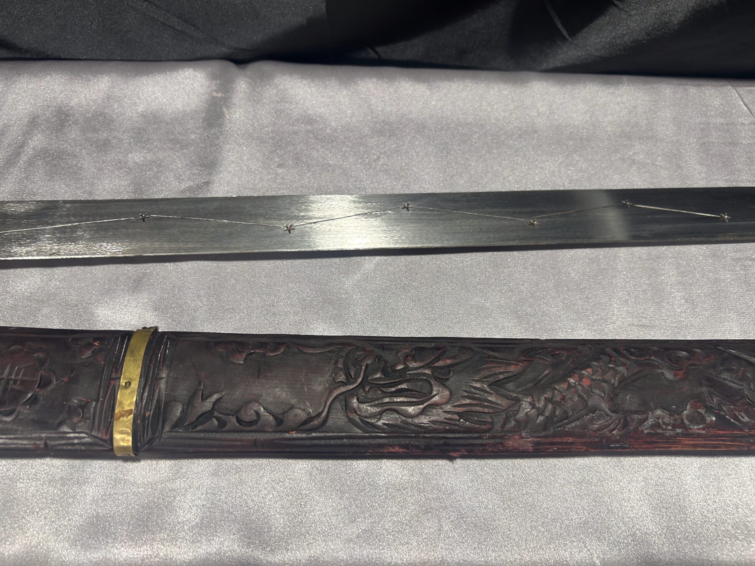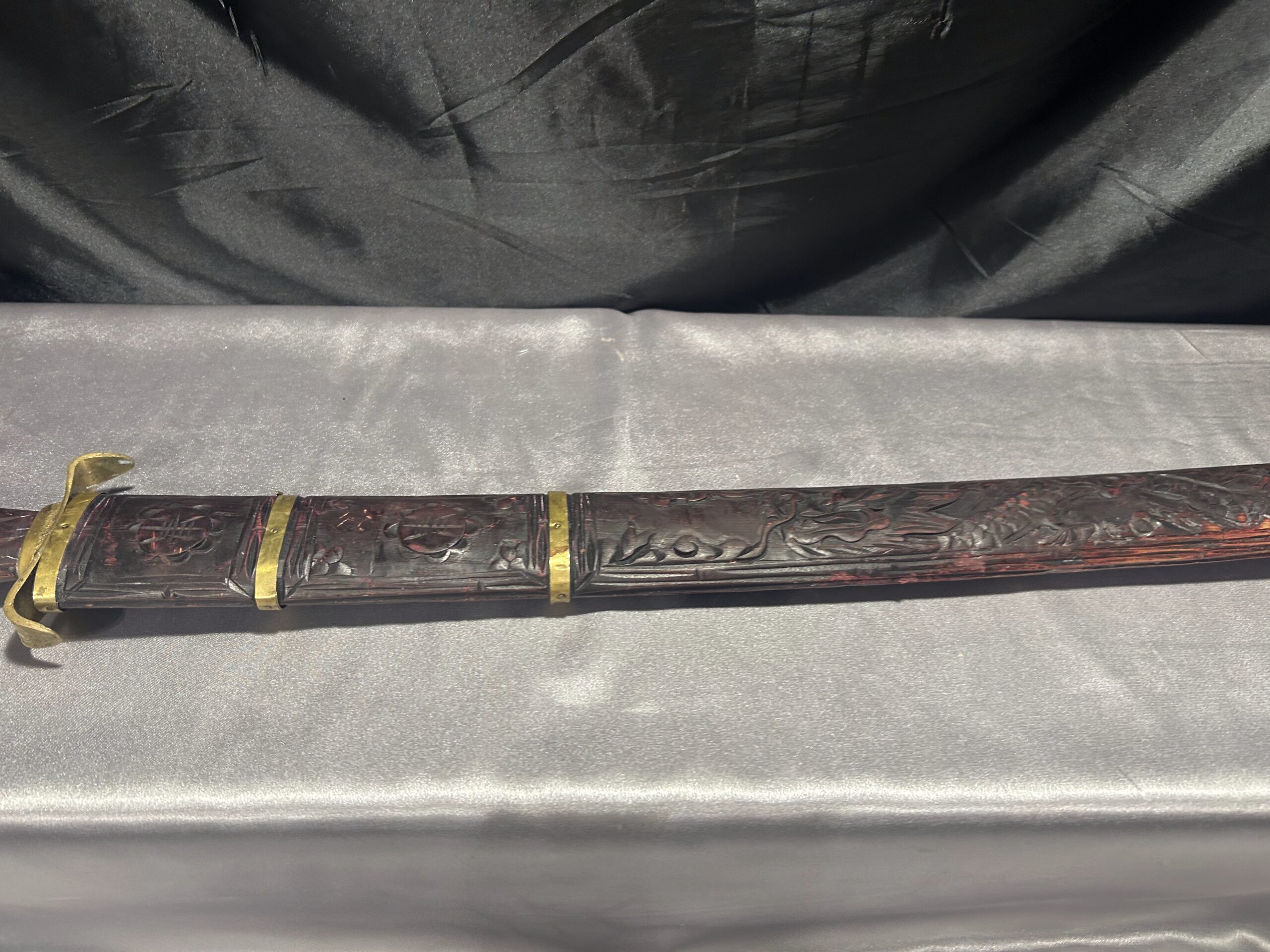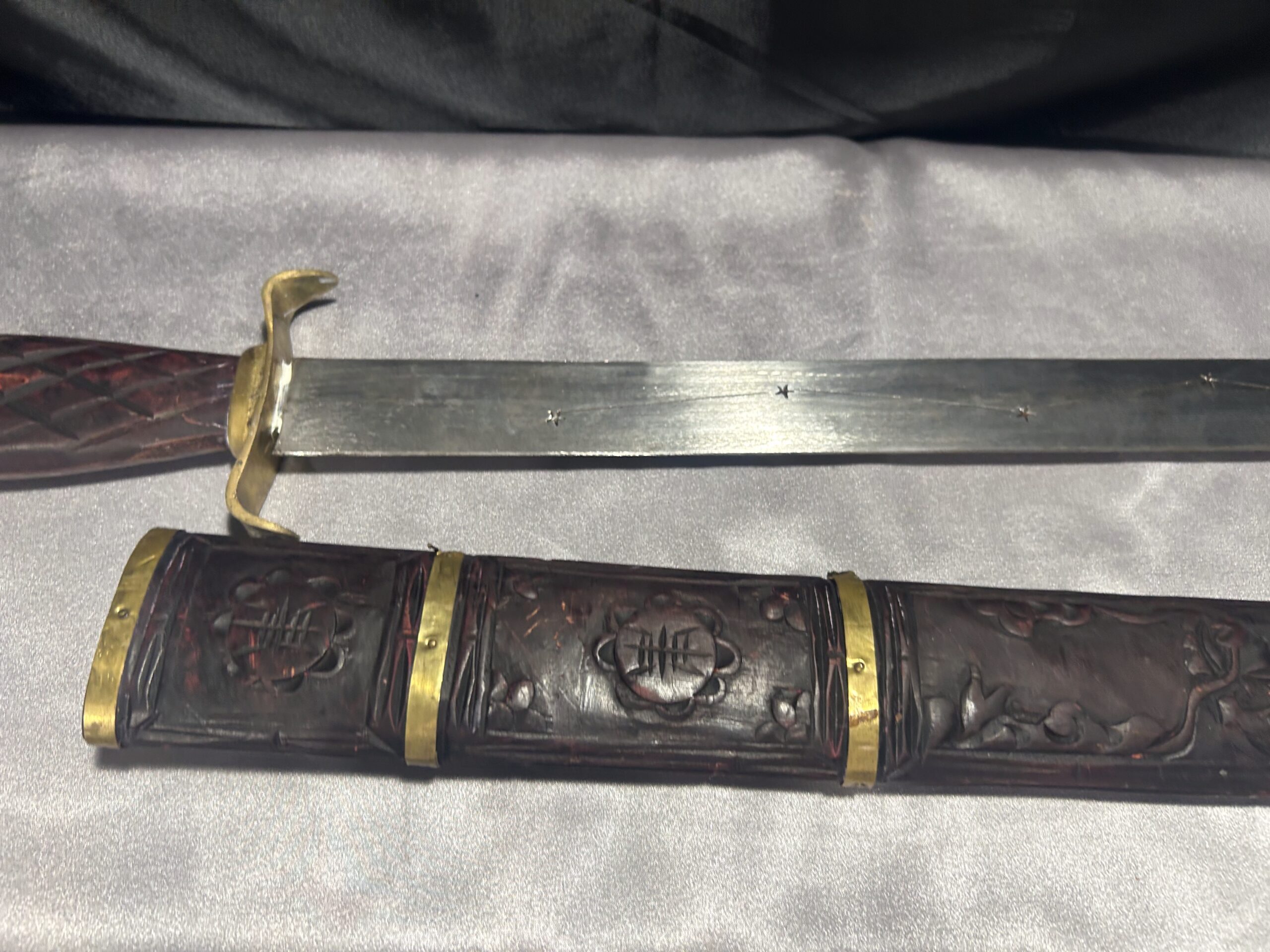 Wyjątkowa szabla z pięknie rzeźbioną, drewnianą rękojeścią oraz pochwą, idealna dla miłośników białej broni. Ostrze zdobią subtelne grawerunki w kształcie gwiazdek, co nadaje mu niepowtarzalnego charakteru. Solidne wykonanie z ciemnego drewna oraz precyzja detali czynią ten przedmiot doskonałym zarówno jako element kolekcji, jak i dekoracyjny akcent wnętrza.