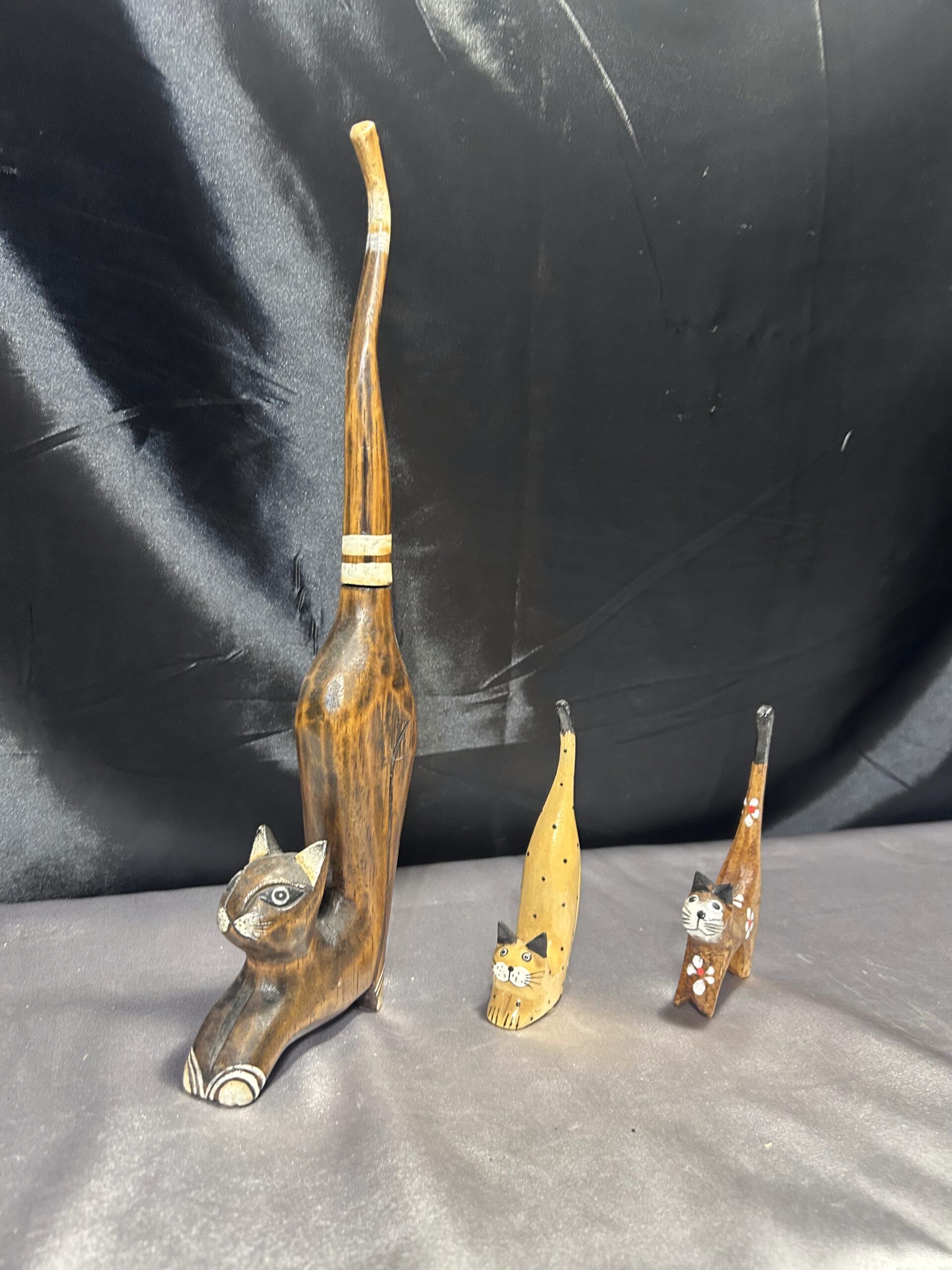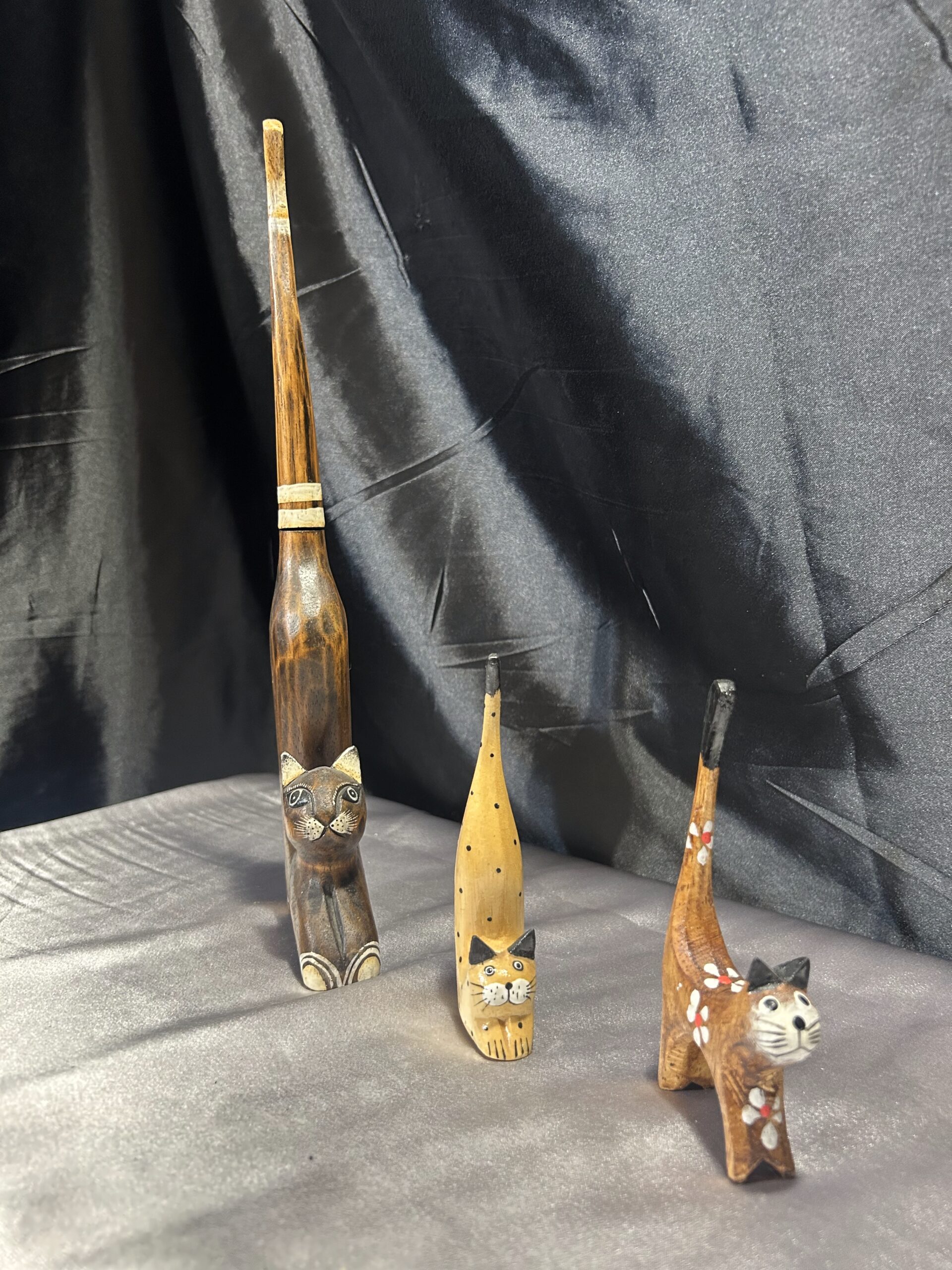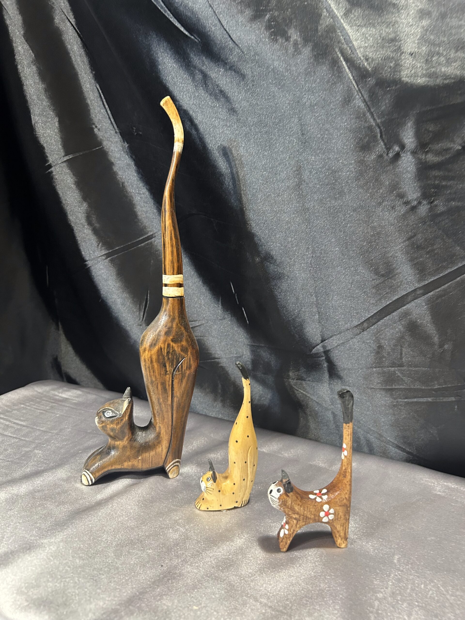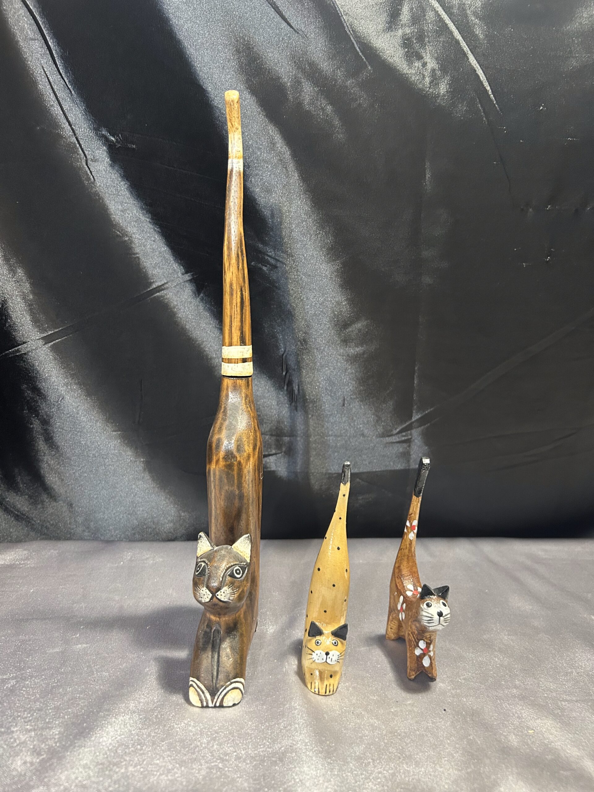 Przedstawiam zestaw trzech drewnianych kotków, wykonanych z lekkiego egzotycznego drewna, które zachwycają elegancją i subtelnym zdobieniem. Każdy z kotków ma długi ogonek skierowany do góry, co nadaje im wyjątkowego uroku i stylu.
